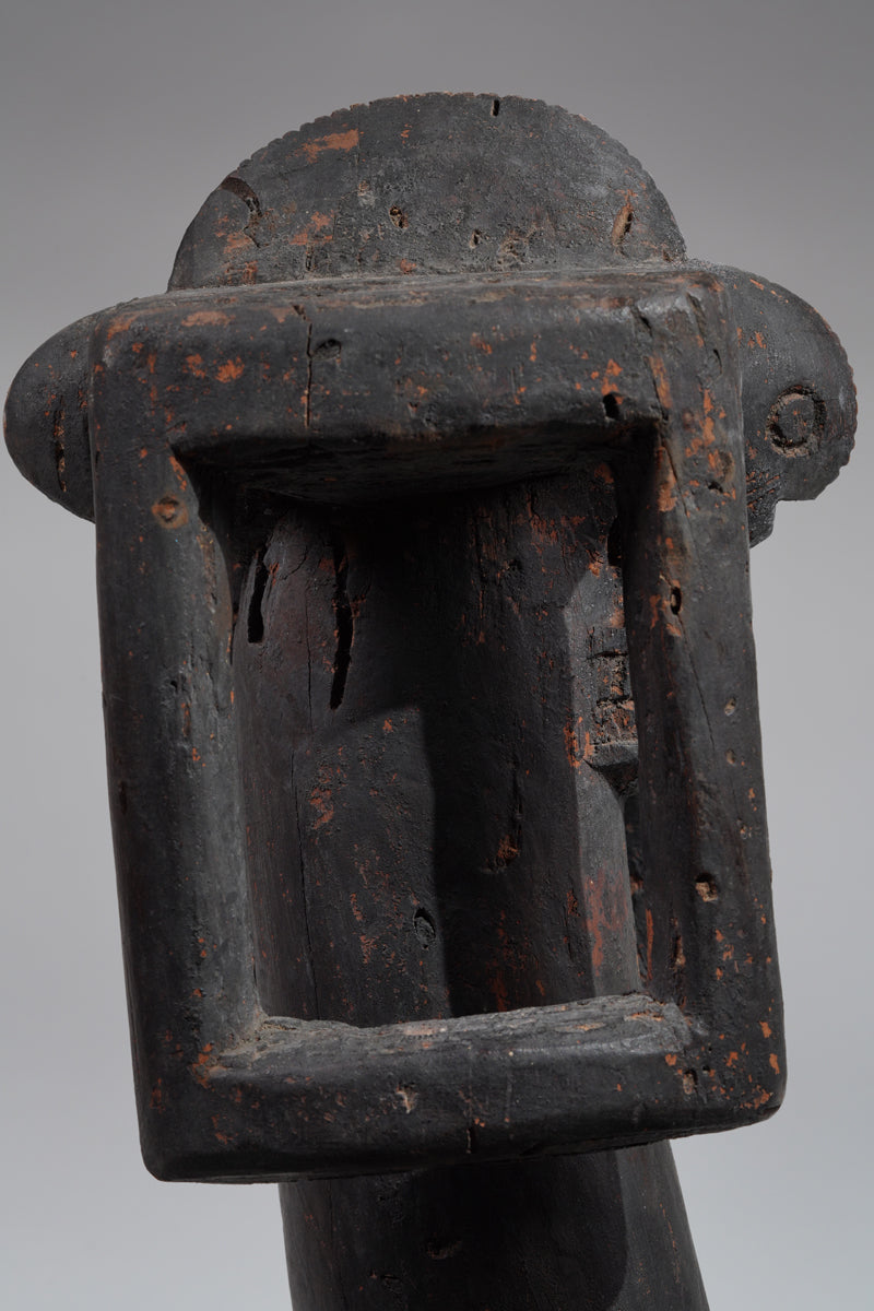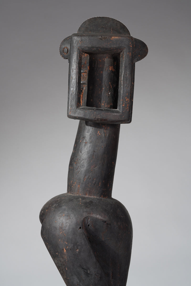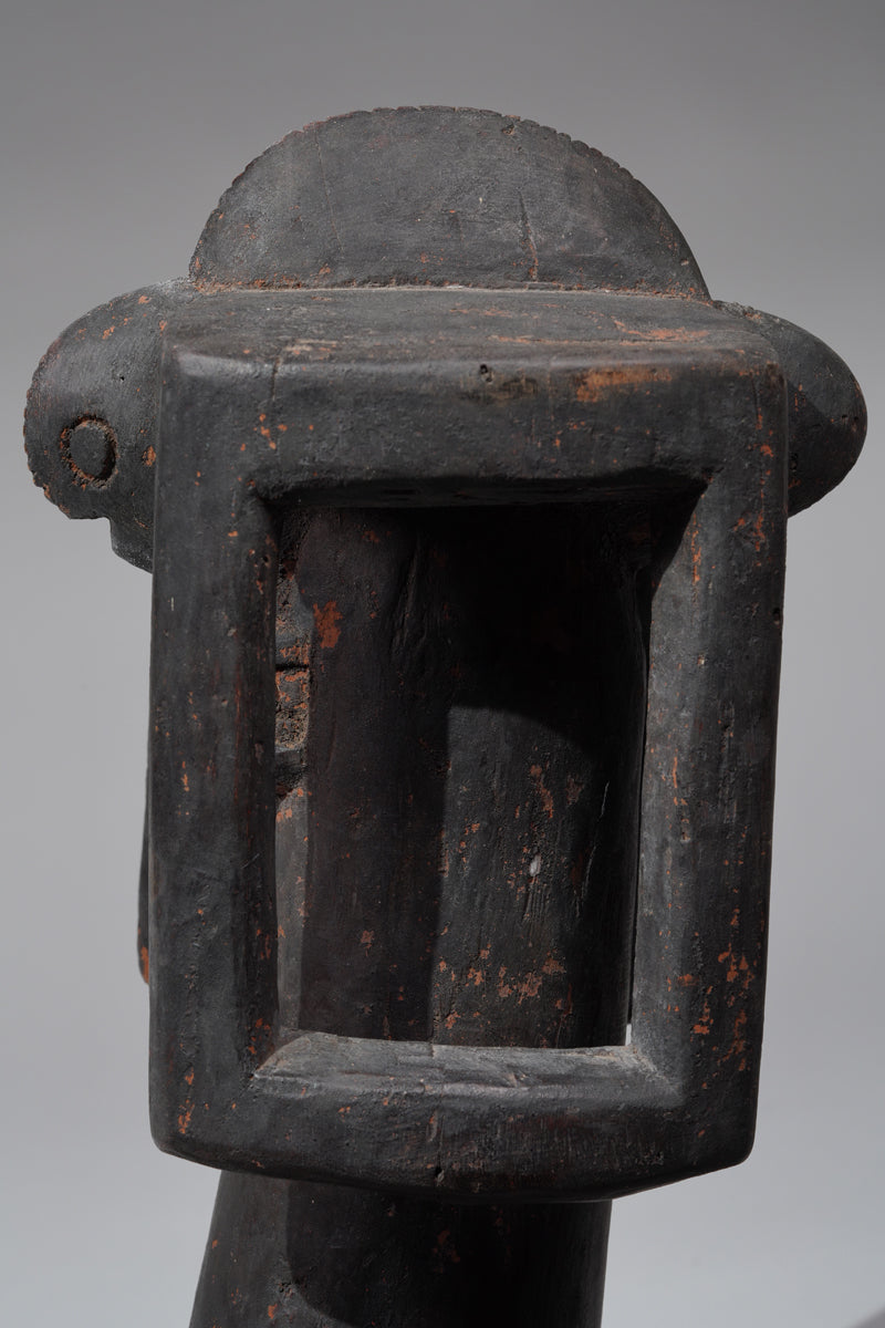 A Mumuye vertical mask, Nigeria, composed of two parts, first the rounded cavity of the helmet, the second half composed of the cylindric abdomen, protruding navel, widened chest, arms on both sides of the body, in a zigzag shape, the neck is long and thick, finishing is the head of abstract shape, composed of the two large square ears, a rectangular mouth showing teeth, a rounded element where two eyes are places; ritual patina, signs of ritual use, some damage at the base, some cracks.