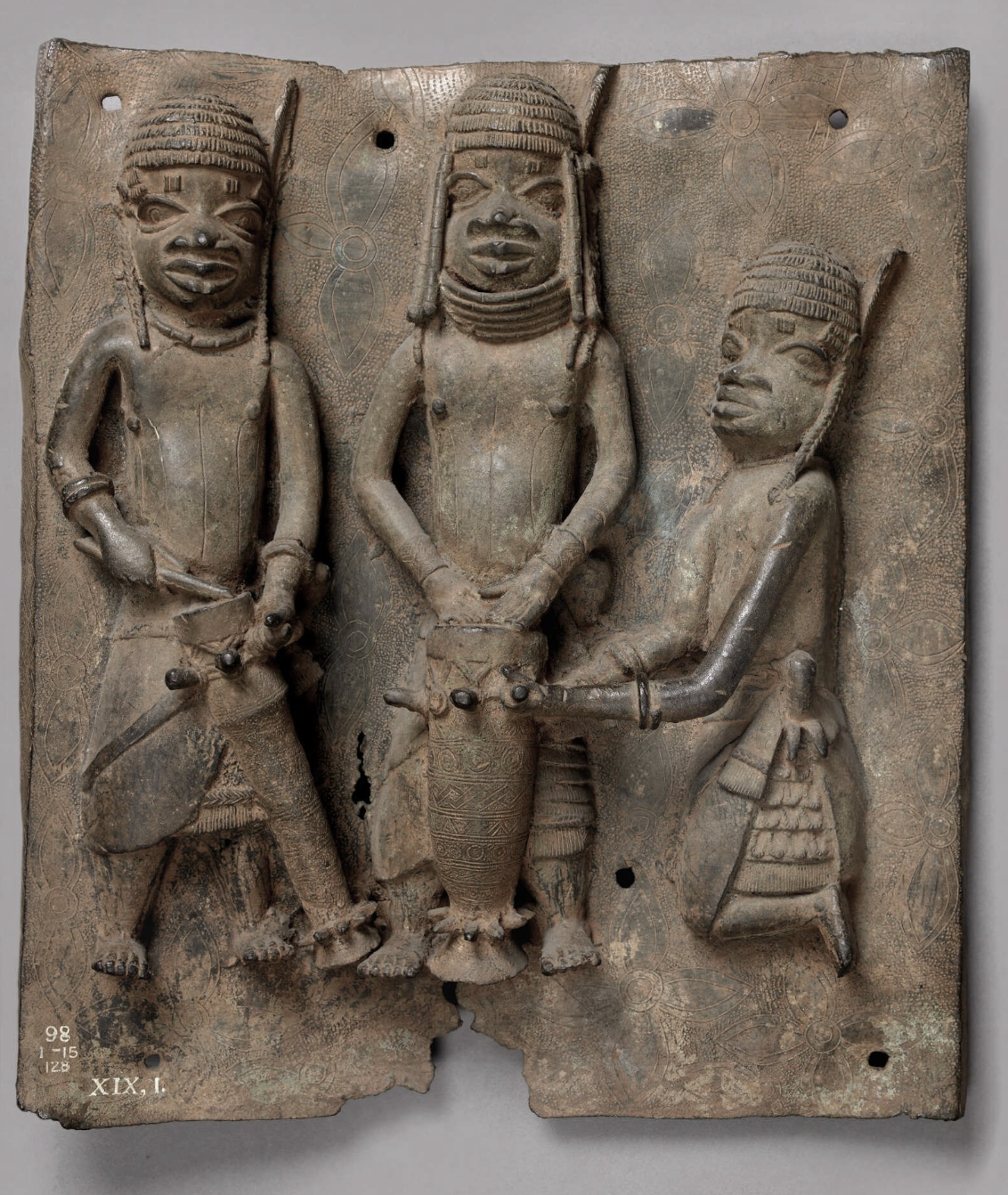 Thus: yes, there are highly comparable motifs of multiple percussionists and attendants supporting the drums in the Benin plaque corpus, though perhaps your exact combination (two musicians + one who adjusts) seems rare but not unique.