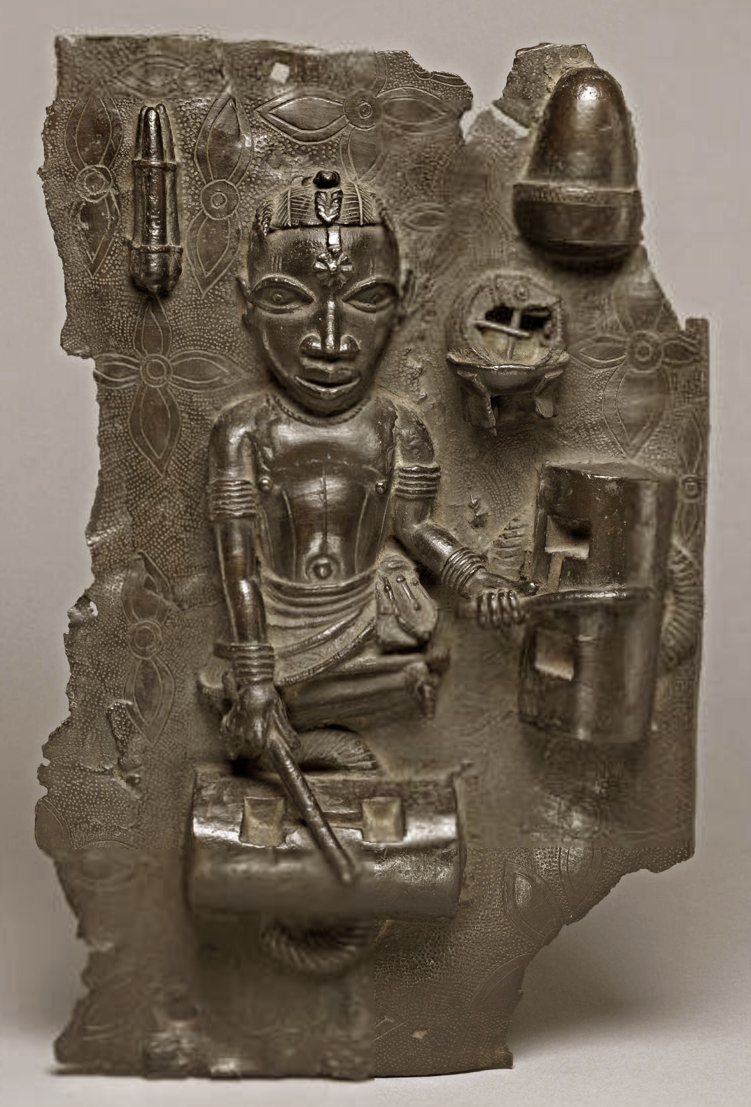 “The Benin plaques depict scenes of court life, including musical performance … horns, bells and stamped rattles seem to predominate, and drums are rare.” Roger Blech, Reconstrucing African musicv history