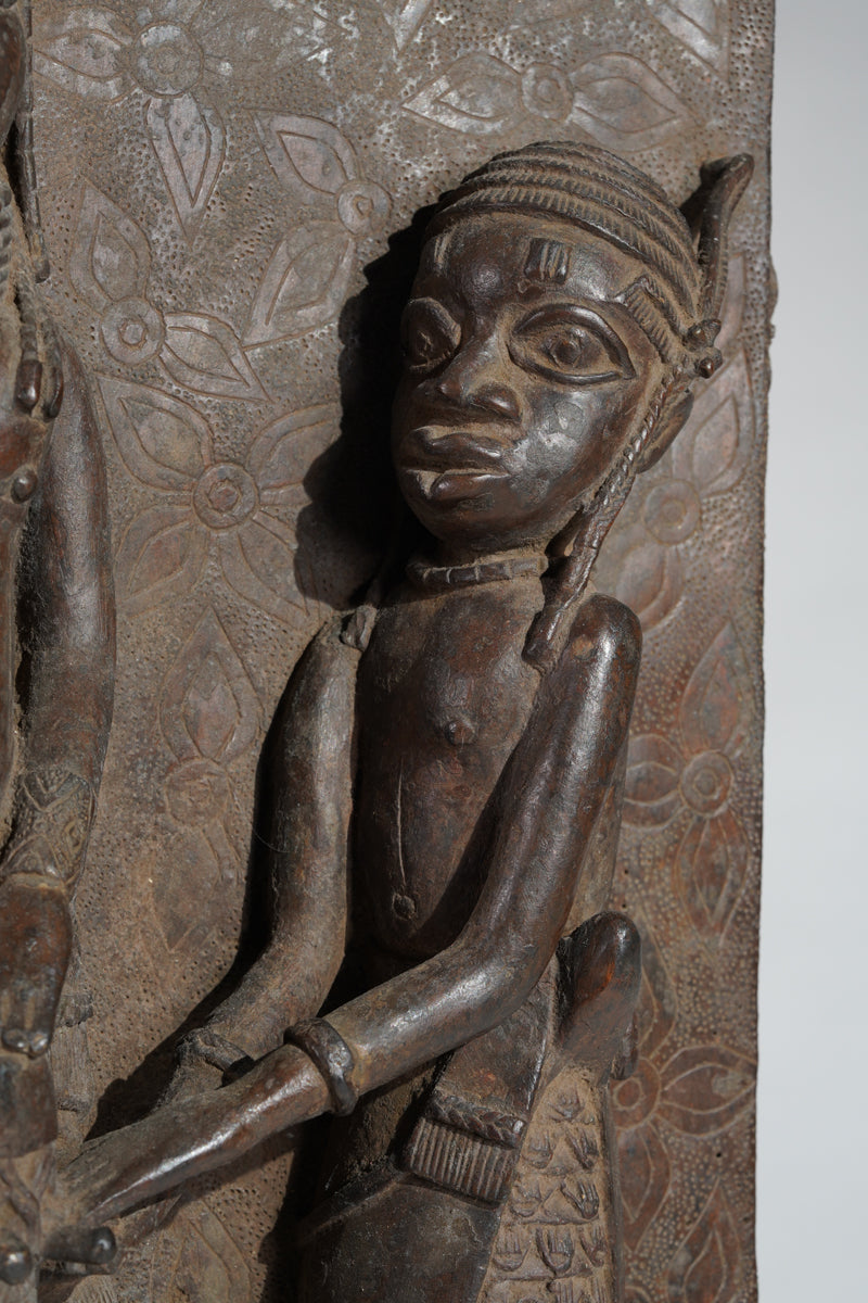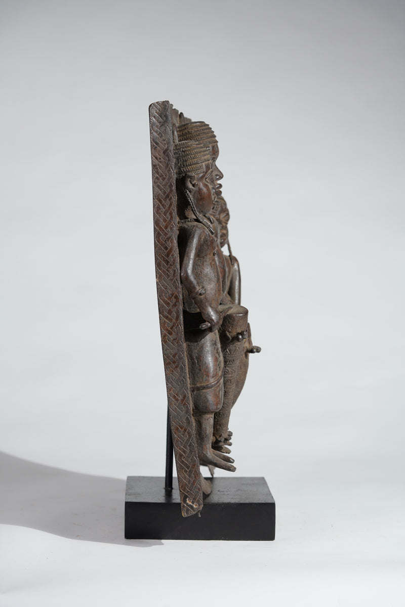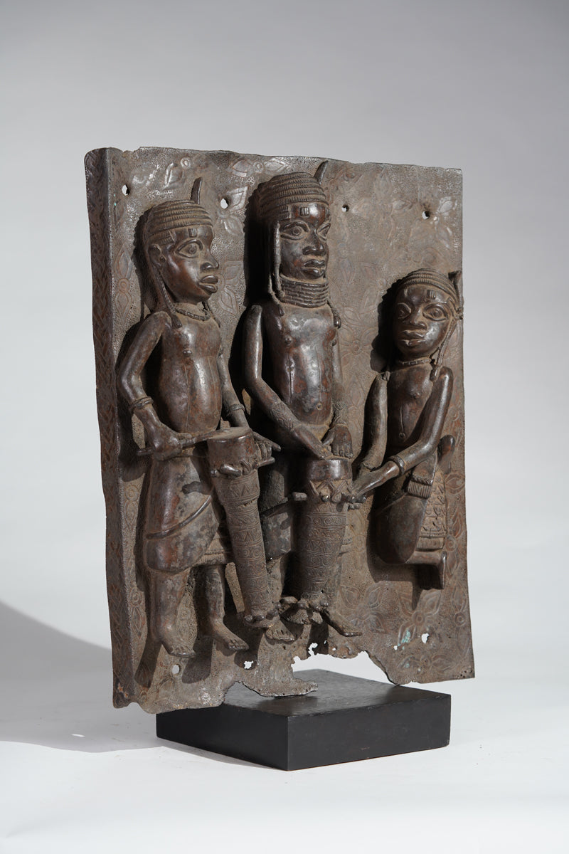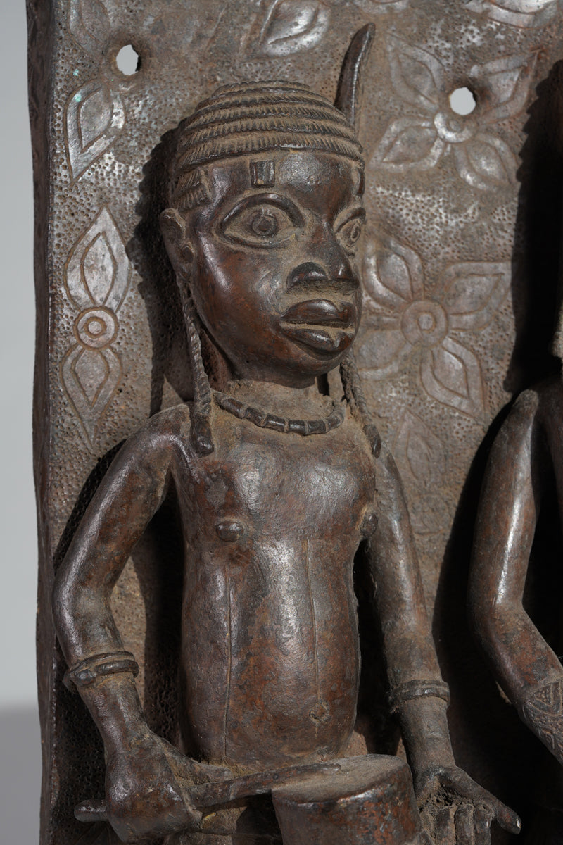 A Plaque - Ama - in the Benin style, depicting two musicians and a third peron, who adjusts the sound of one of the two drums. A rare depiction on a Benin plate; beautiful, mature patina consisting of various layers, verified by the detailed photographs at the end of this photo sequence.