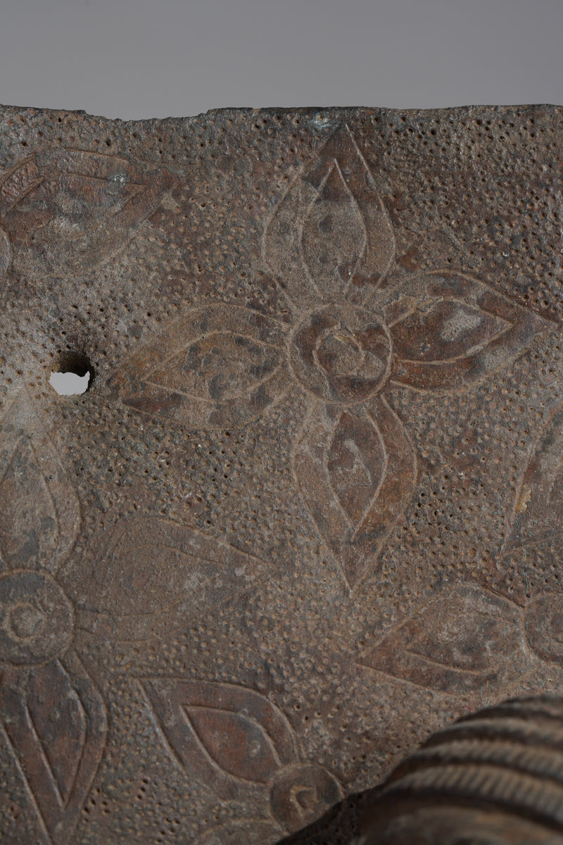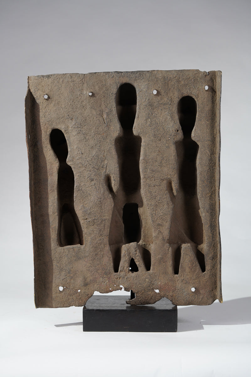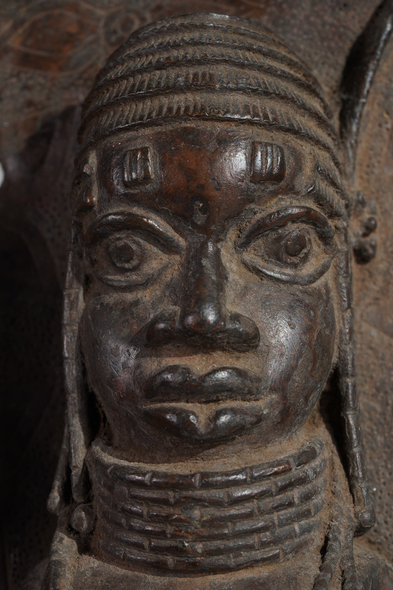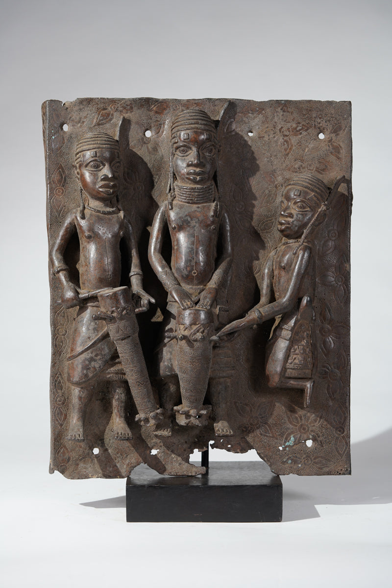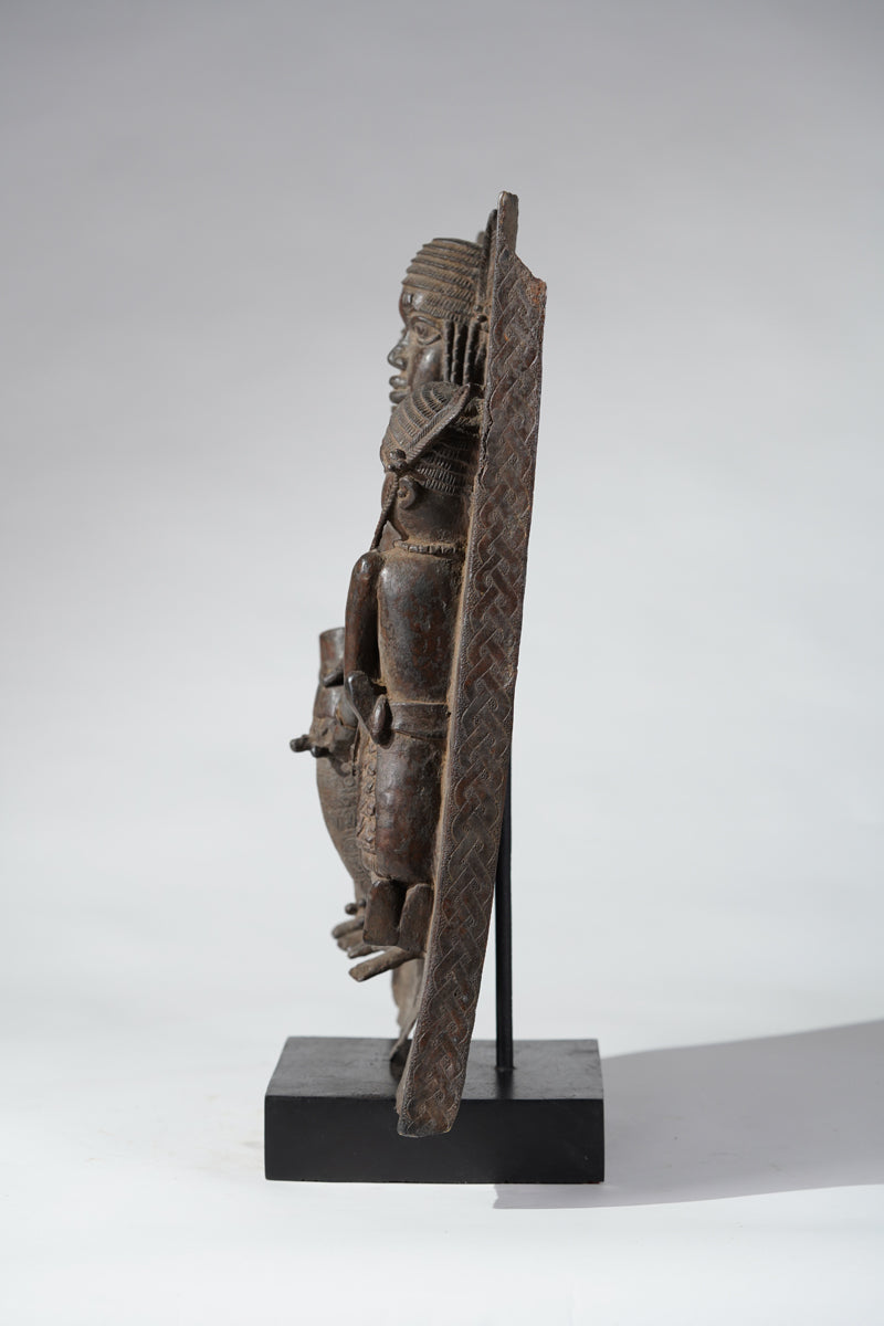 A Plaque - Ama - in the Benin style, depicting two musicians and a third peron, who adjusts the sound of one of the two drums. A rare depiction on a Benin plate; beautiful, mature patina consisting of various layers, verified by the detailed photographs at the end of this photo sequence.