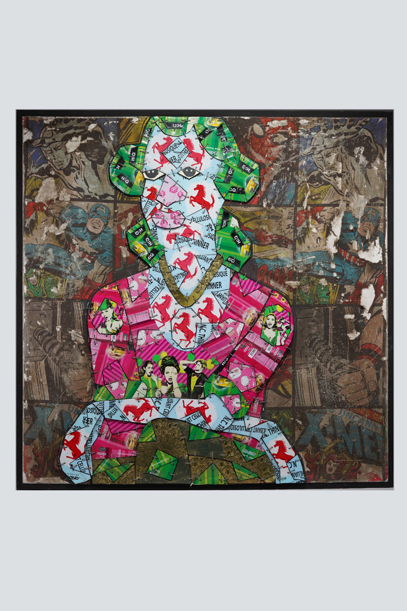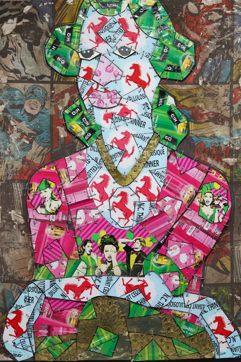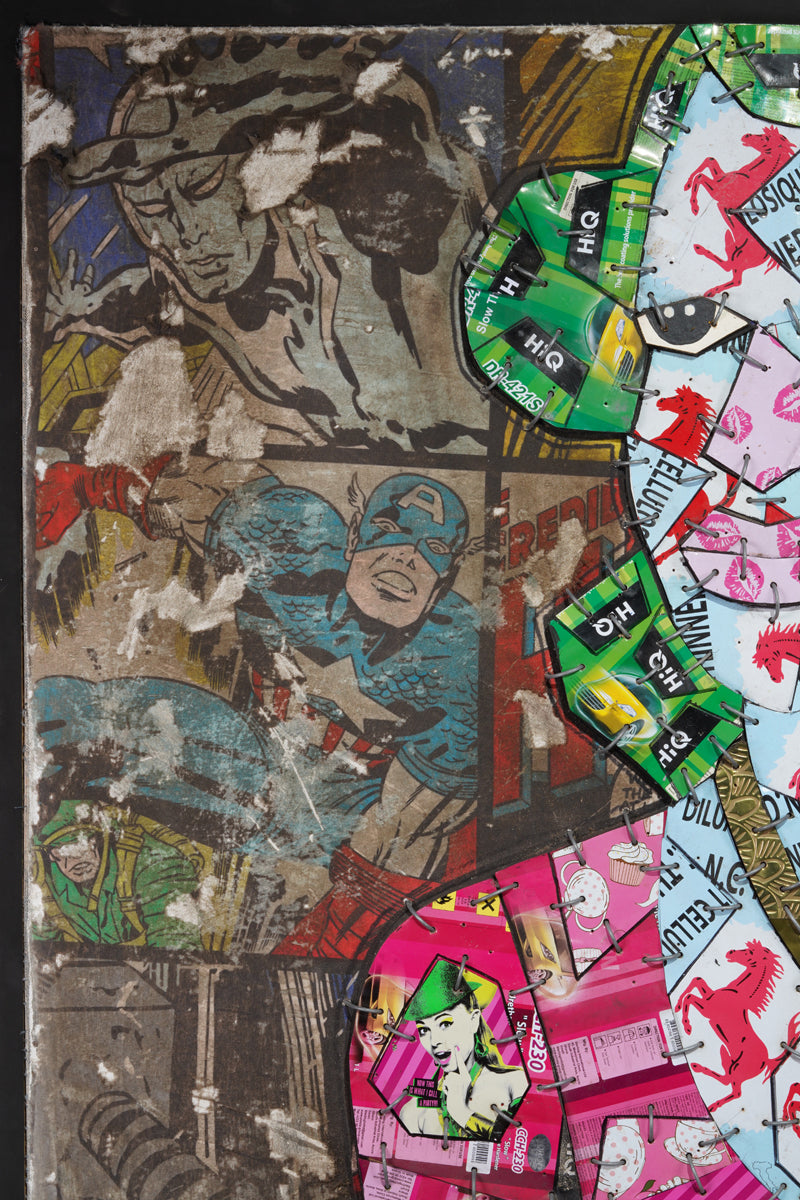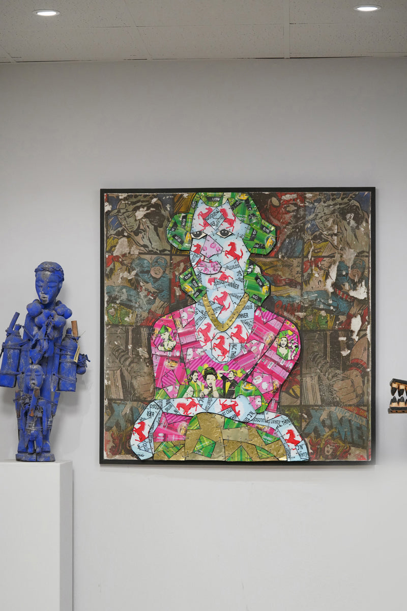 This intriguing figure is composed of numerous metallic pieces, intricately assembled like a mosaic. These metallic fragments are layered upon a more substantial backdrop, which traces the silhouette of the woman, thus creating a slight elevation that distinguishes her from the background. The backdrop reveals itself to be an enlarged fragment of an old comic book, its surface marred by tears and signs of wea. Azankpo's innovative use of materials and motifs intertwines modern pop art with a nostalgic comic book aesthetic, offering a richly textured and visually captivating artwork.