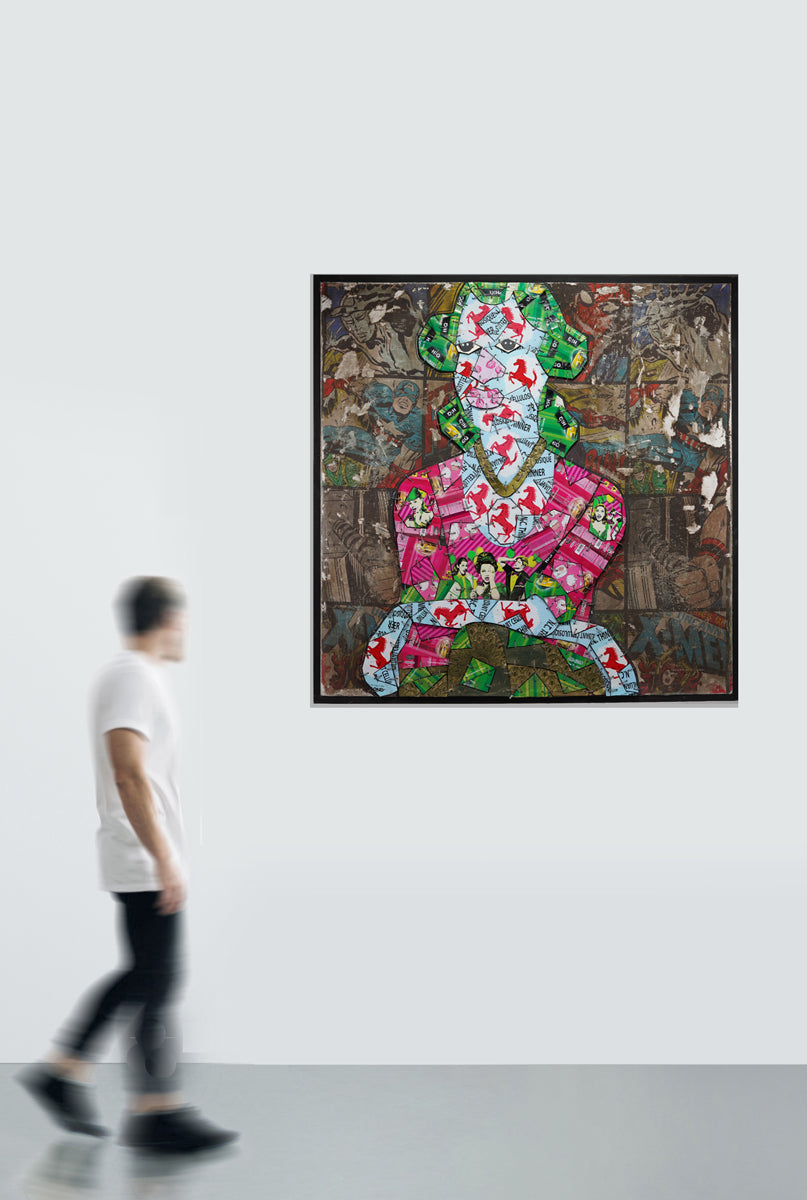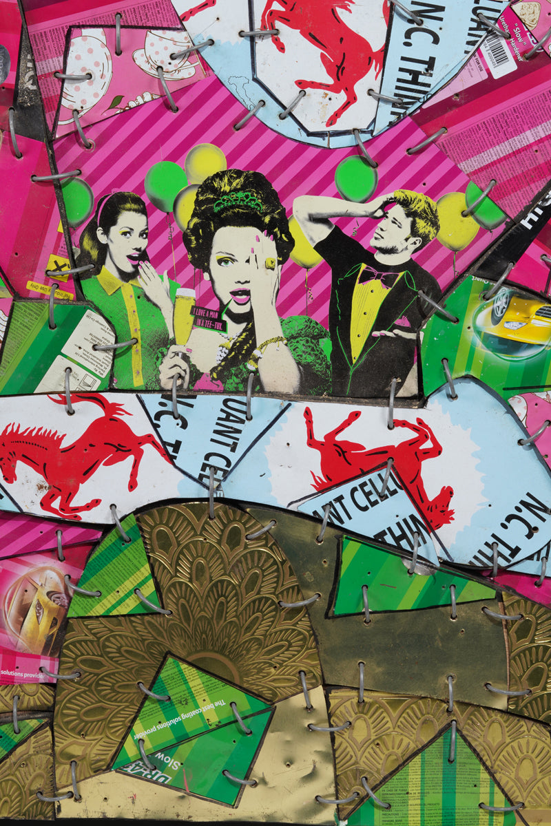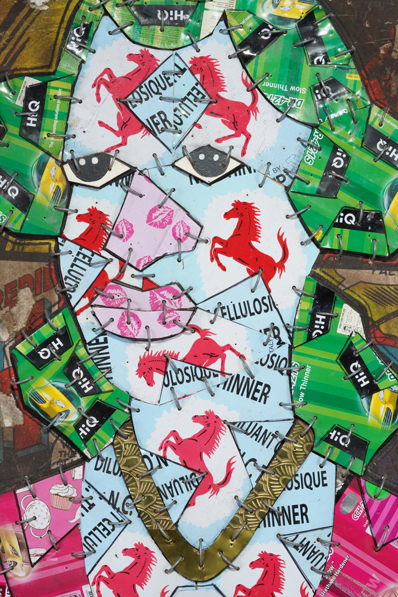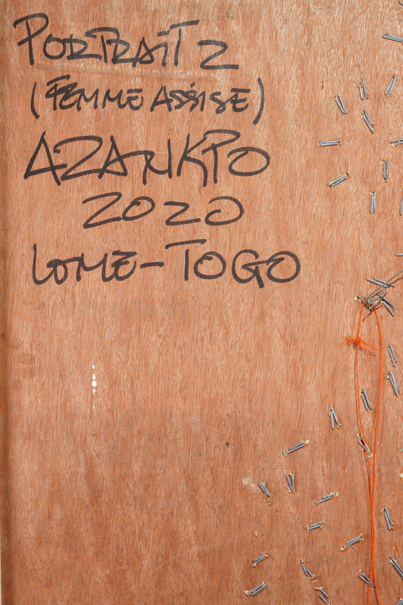 This intriguing figure is composed of numerous metallic pieces, intricately assembled like a mosaic. These metallic fragments are layered upon a more substantial backdrop, which traces the silhouette of the woman, thus creating a slight elevation that distinguishes her from the background. The backdrop reveals itself to be an enlarged fragment of an old comic book, its surface marred by tears and signs of wea. Azankpo's innovative use of materials and motifs intertwines modern pop art with a nostalgic comic book aesthetic, offering a richly textured and visually captivating artwork.