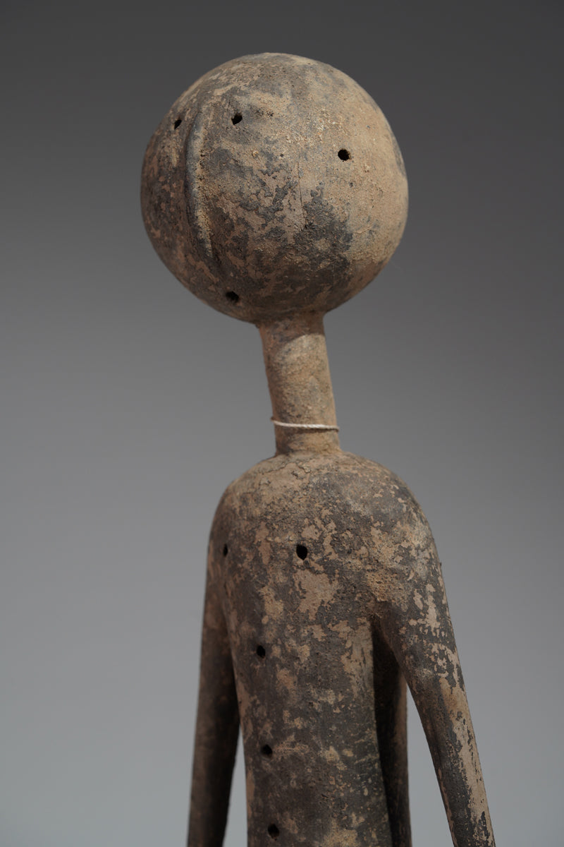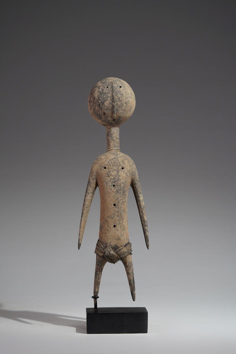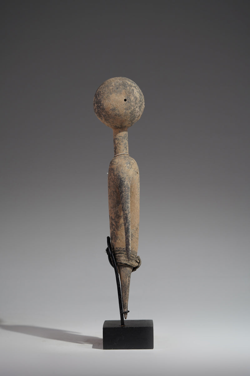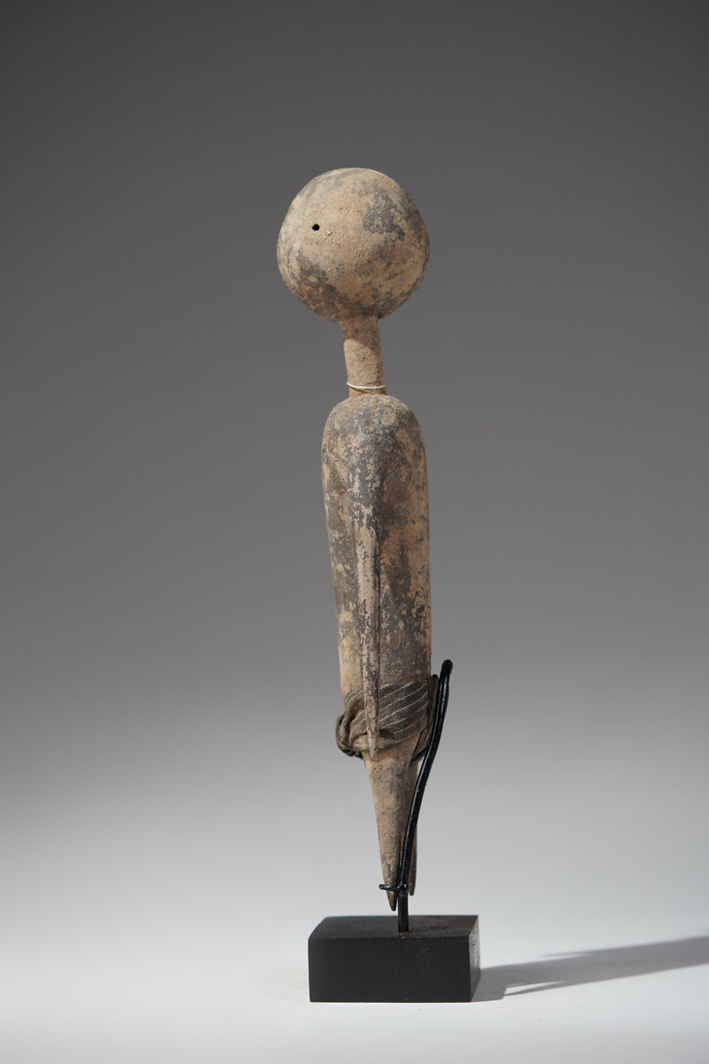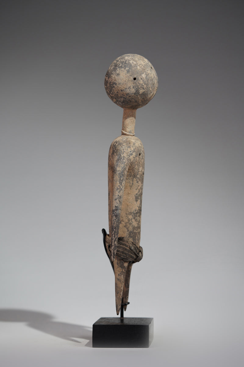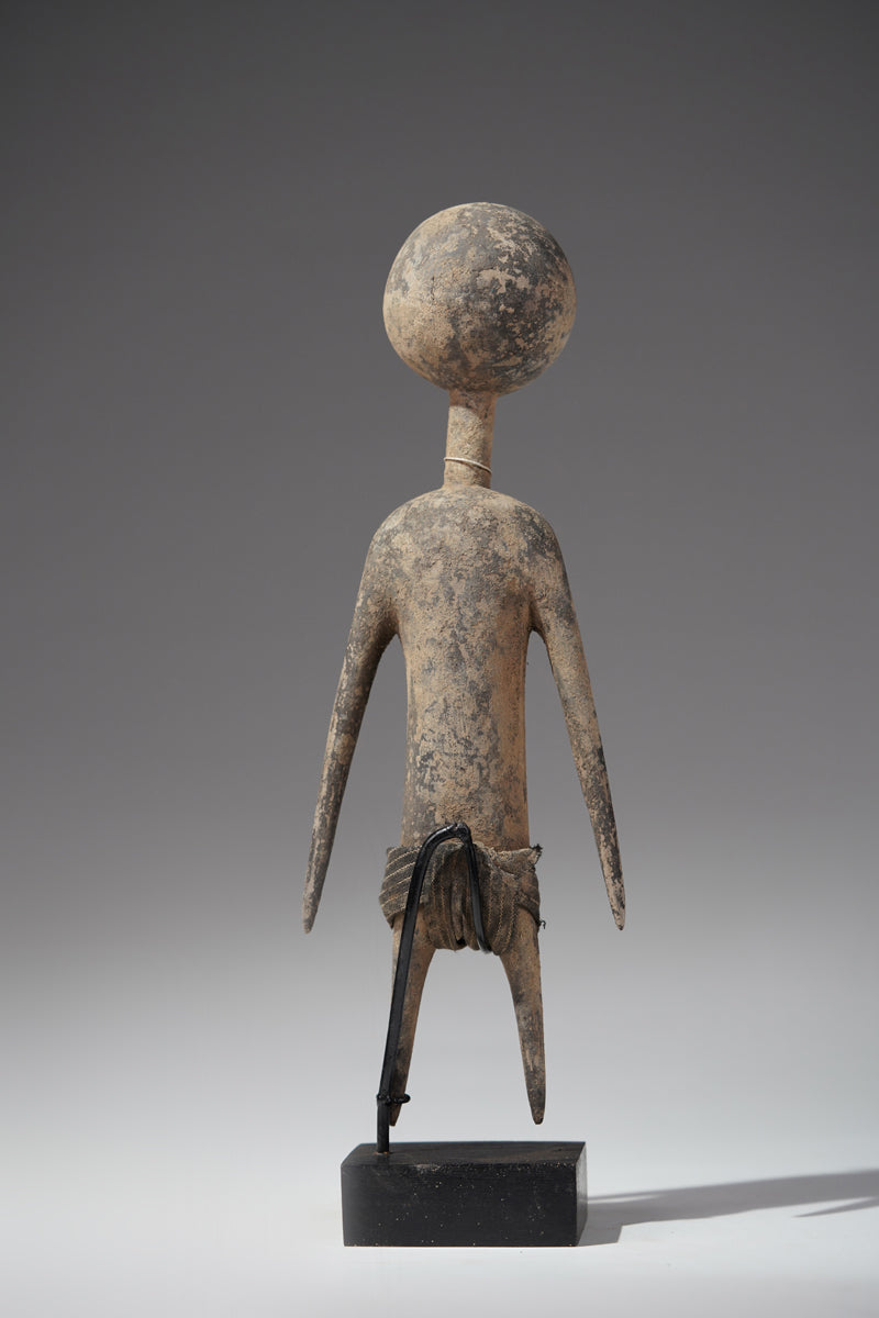 A couple of PramPram sculptures, Ghana, elongated body with tapering limbs, a spherical head, eyes, ears, navel and nipples are represented as indentations, the nose in the shape of a small ridge, the right leg is shortened, the sculpture is covered with a short shirt of brownish colour of incl. stand and certificate of origin and provenance, collected from Baba Sylla, incl. stand.