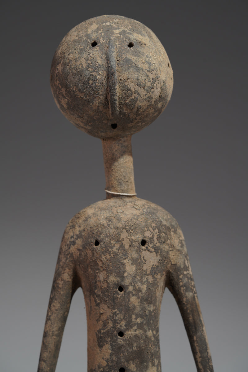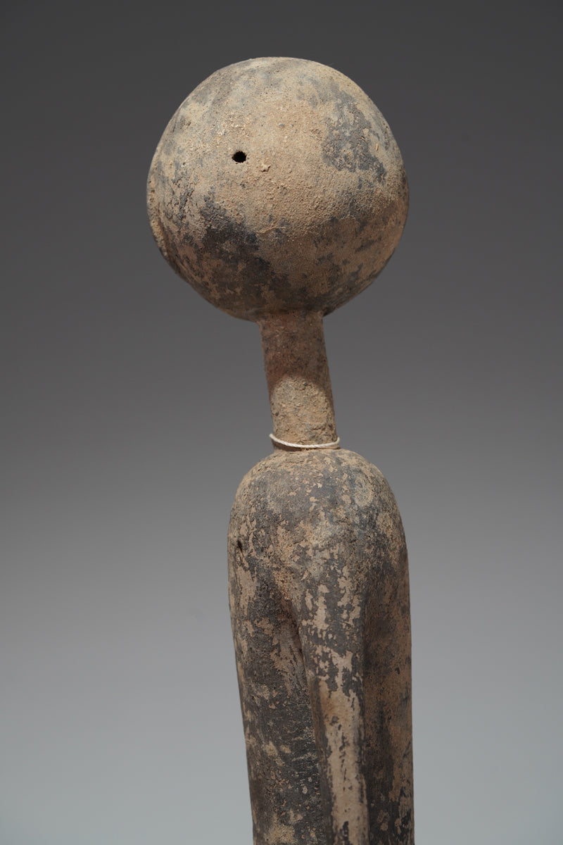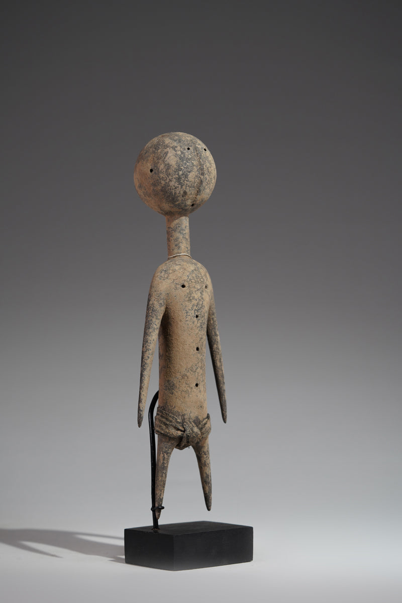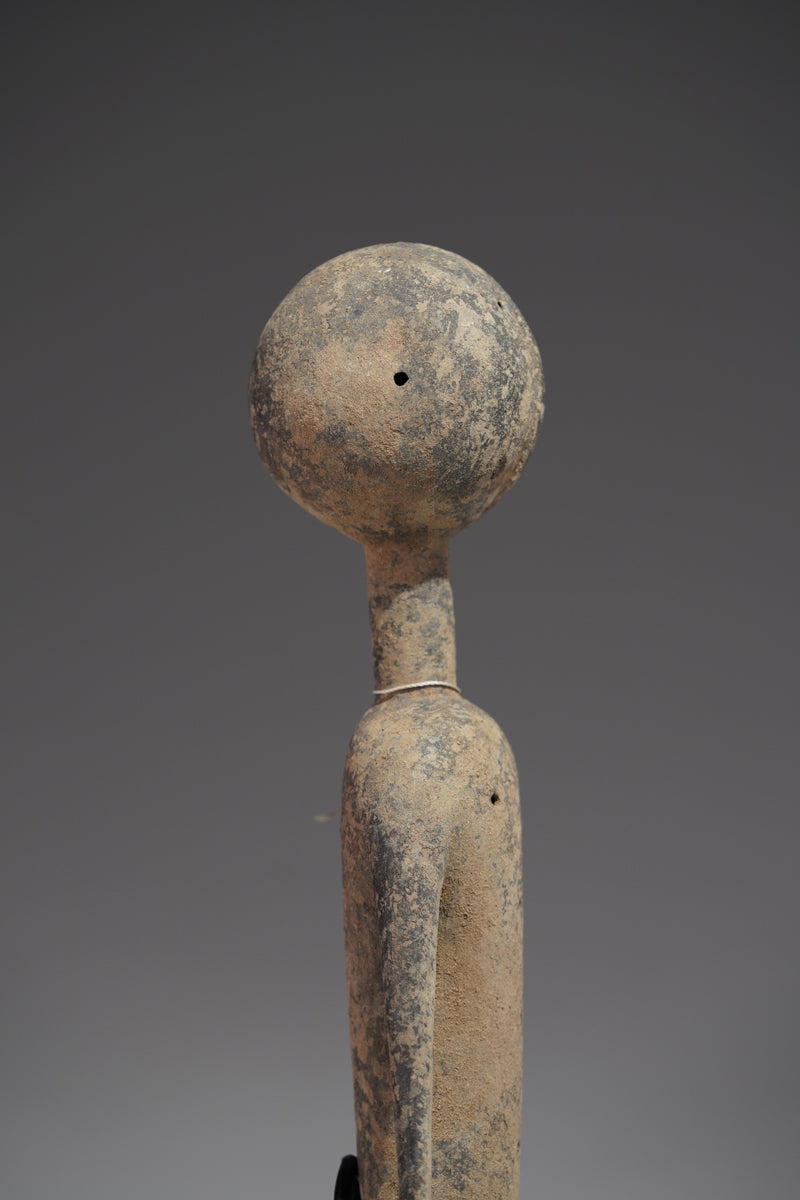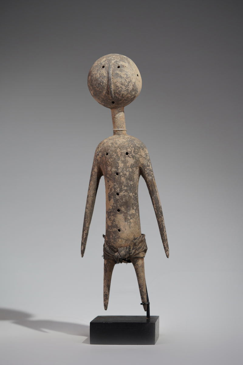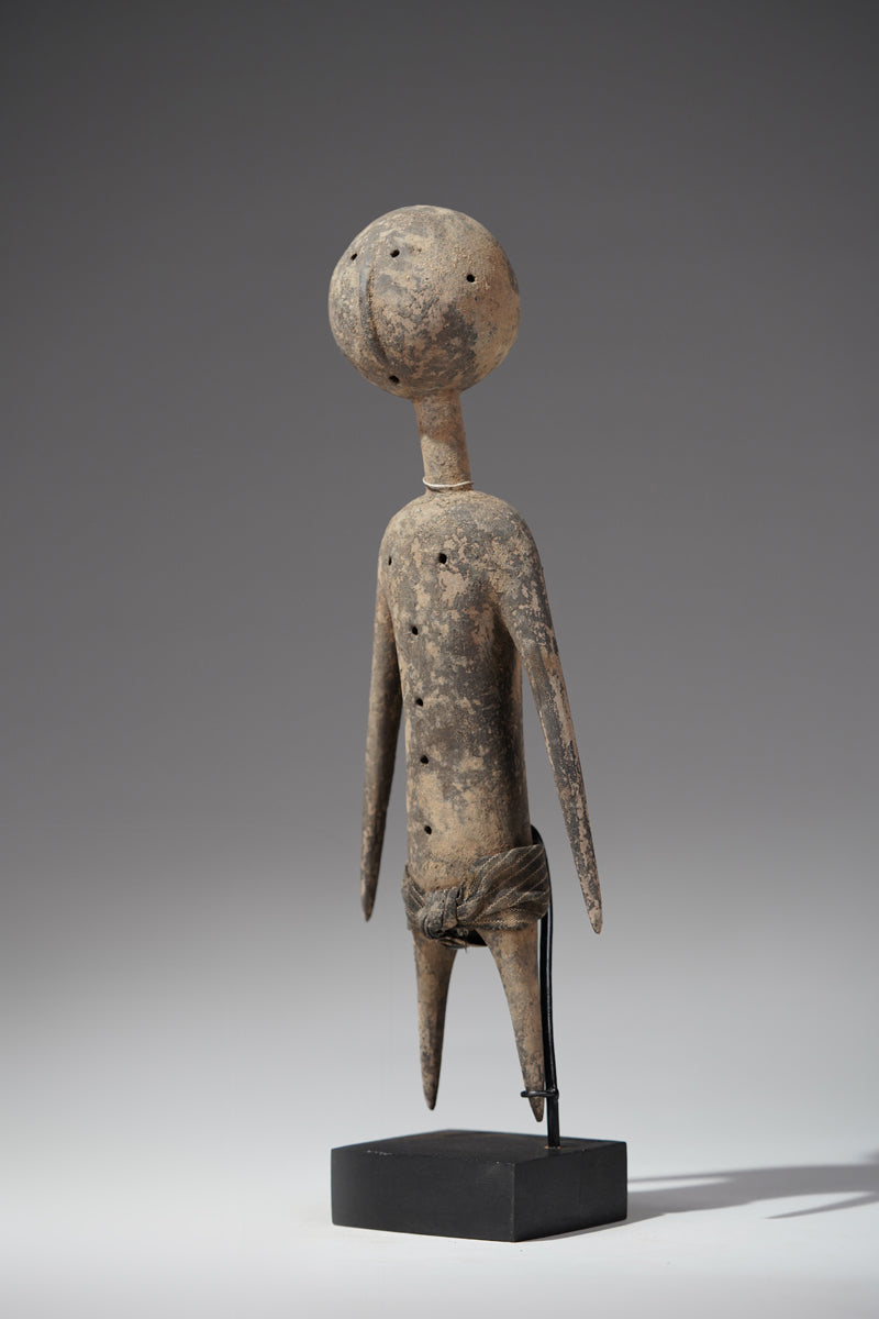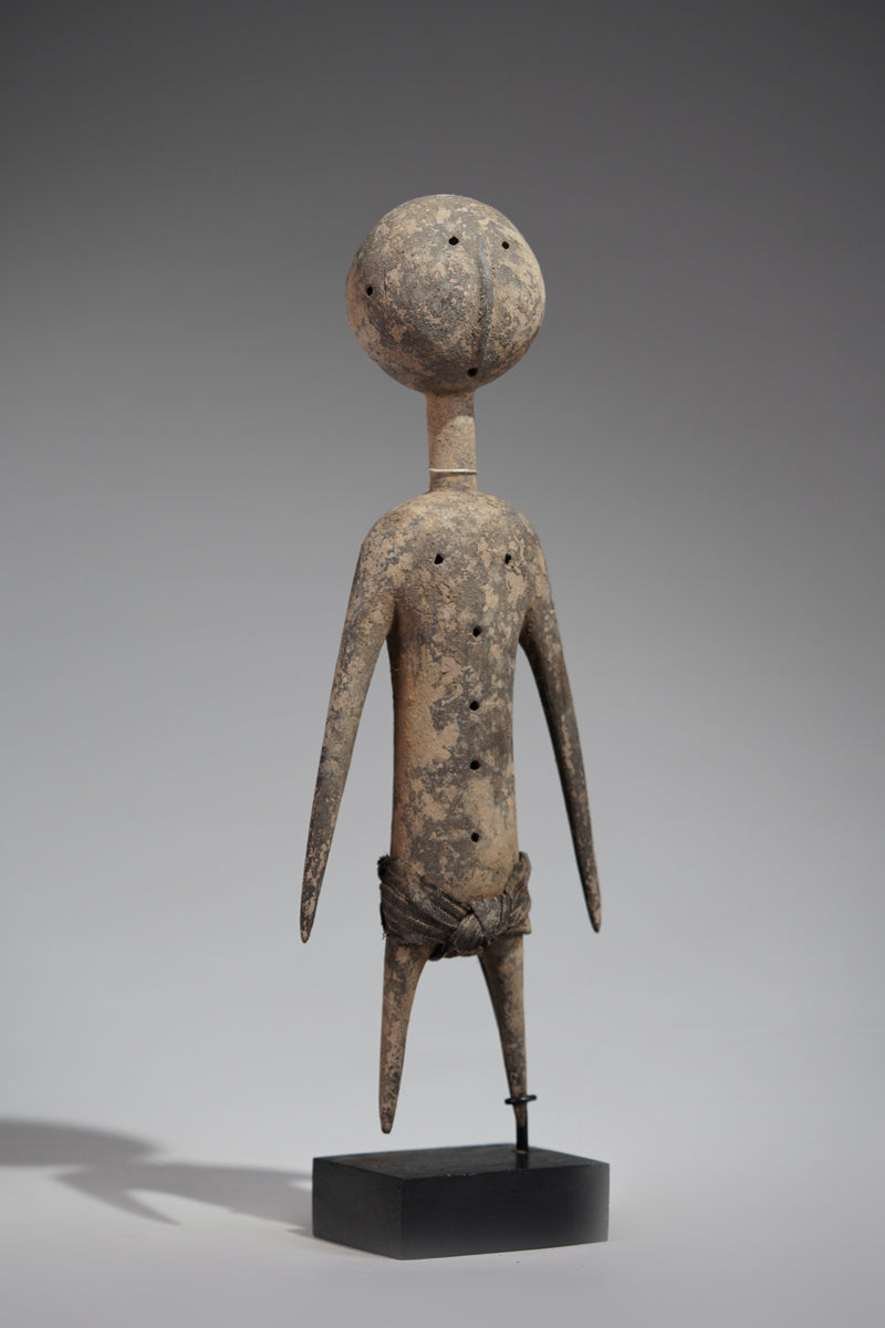 A couple of PramPram sculptures, Ghana, elongated body with tapering limbs, a spherical head, eyes, ears, navel and nipples are represented as indentations, the nose in the shape of a small ridge, the right leg is shortened, the sculpture is covered with a short shirt of brownish colour of incl. stand and certificate of origin and provenance, collected from Baba Sylla, incl. stand.