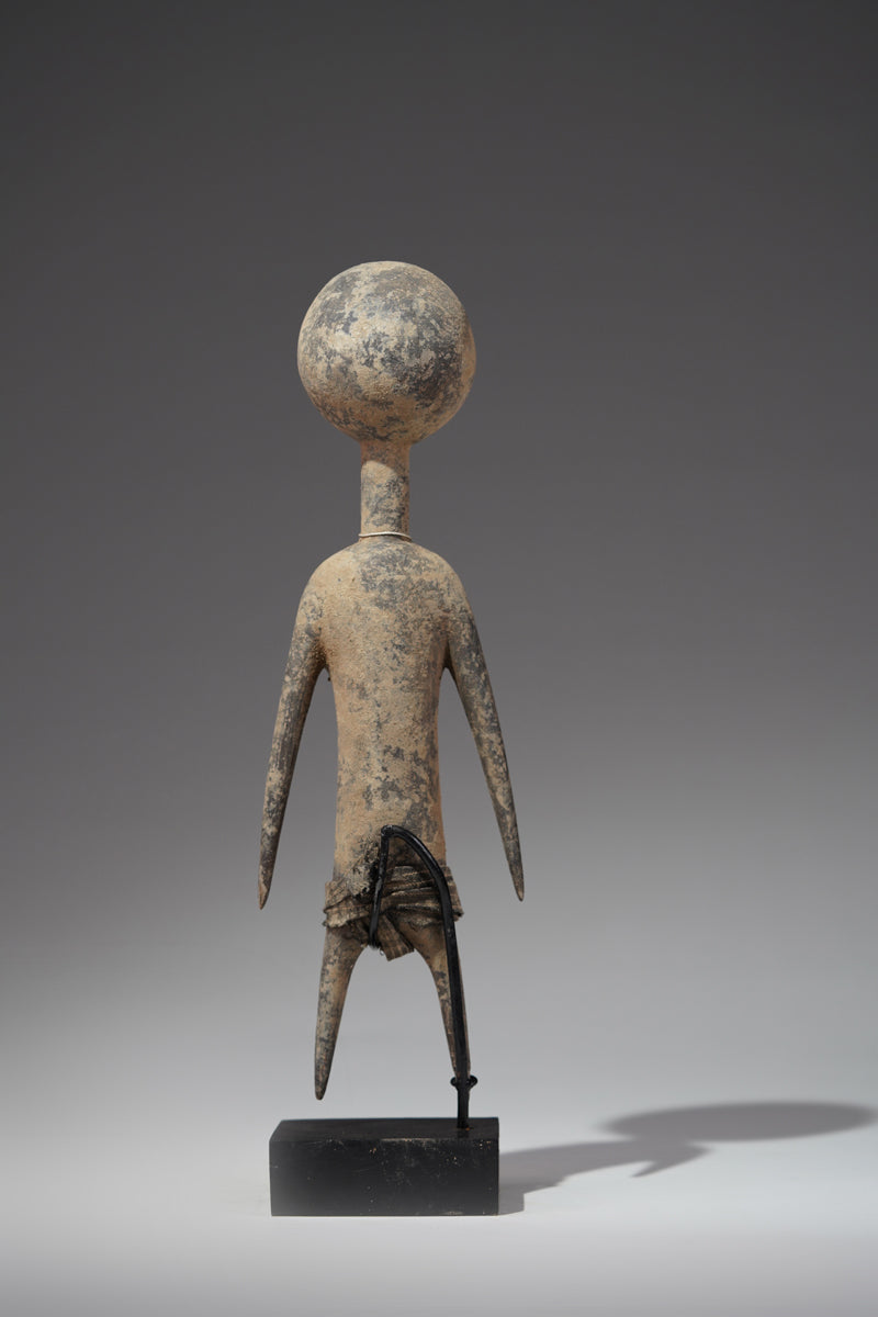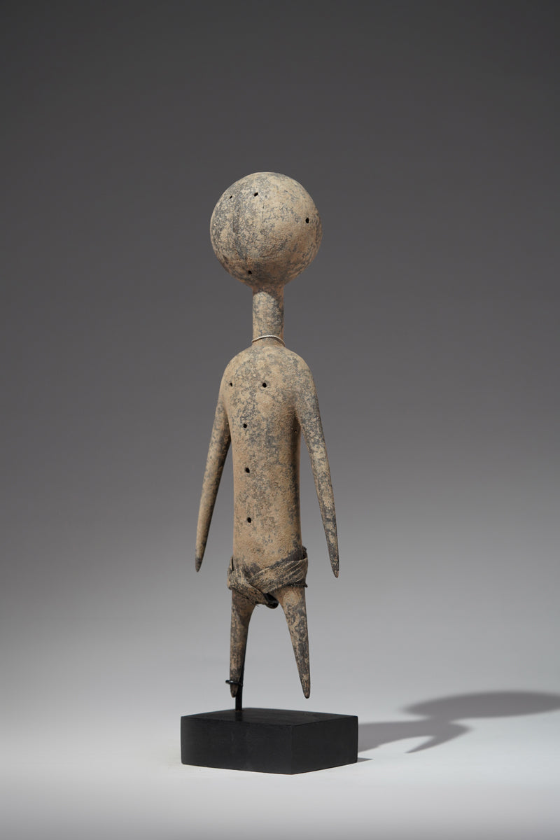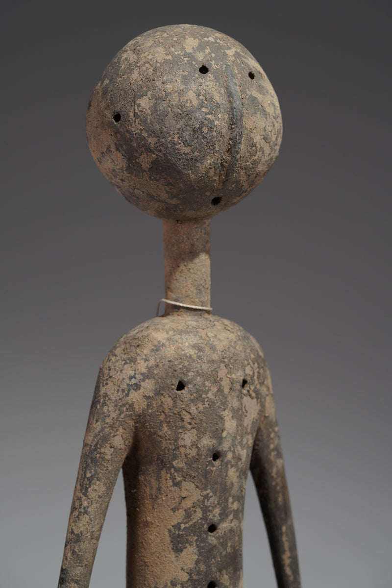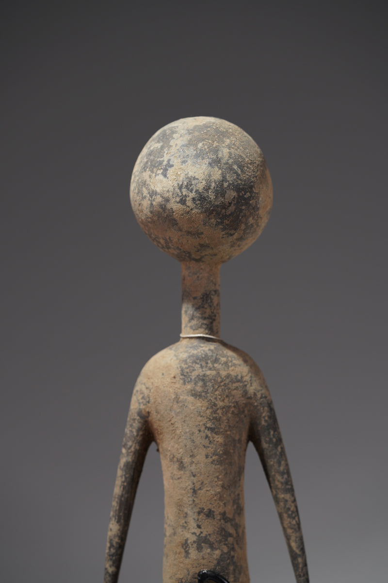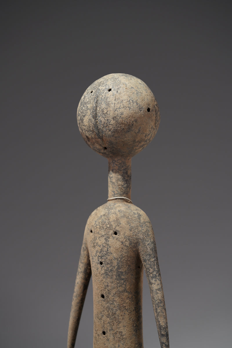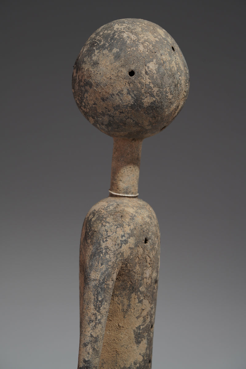 A couple of PramPram sculptures, Ghana, elongated body with tapering limbs, a spherical head, eyes, ears, navel and nipples are represented as indentations, the nose in the shape of a small ridge, the right leg is shortened, the sculpture is covered with a short shirt of brownish colour of incl. stand and certificate of origin and provenance, collected from Baba Sylla, incl. stand.