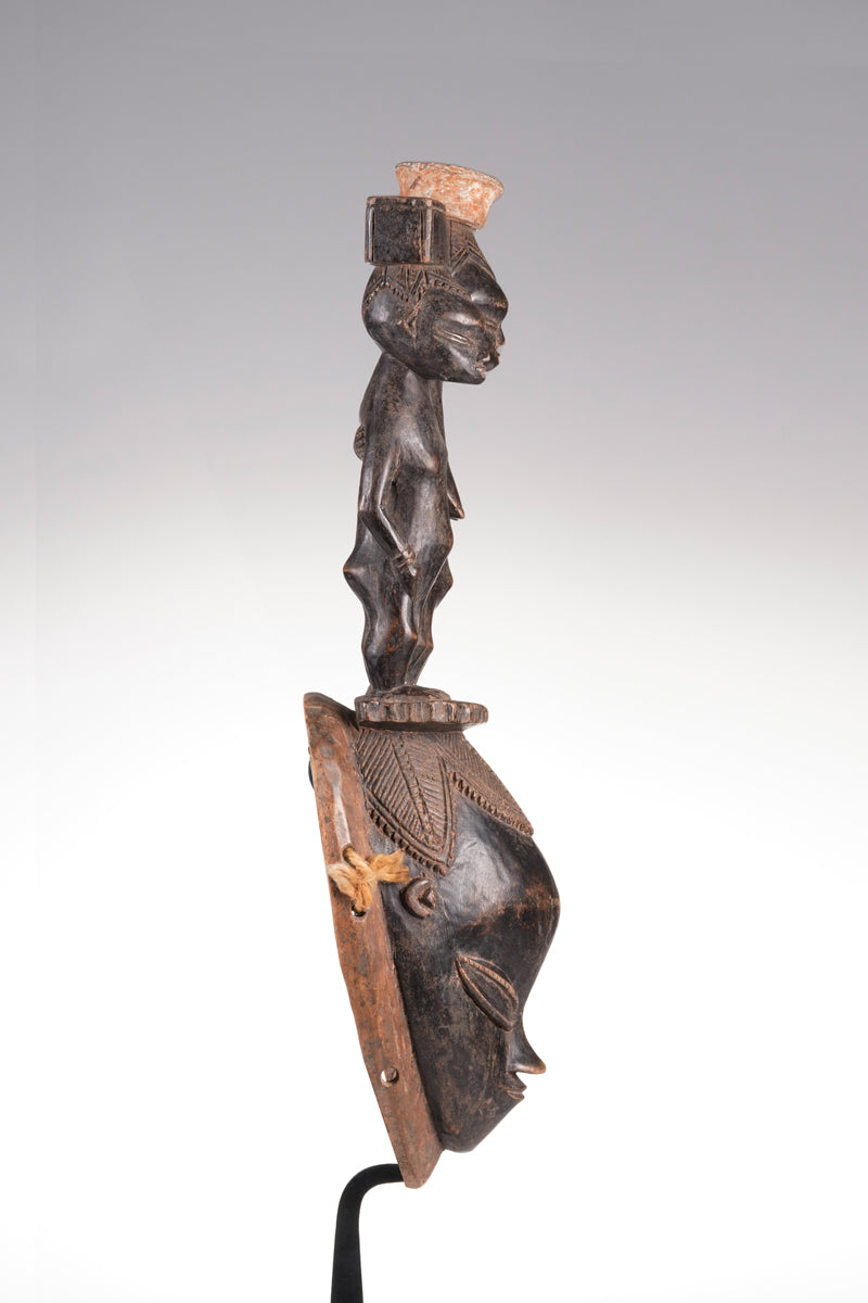 A rare and fine example of a Guro mask from the region around the town of Bouaflé, in the southeastern part of the Guro territory, near the Yaure border. The main mask appears rather small compared to the pair of figures crowning it. Slanted eyes, a small mouth, and a concave curved nose give the shape an elegant expression, additionally emphasized by the hairstyle with fine jagged lines and the ornaments on the hairline, on the edge, there are four fastening holes at the height of the ears and below. The following lovingly embracing couple above the mask part, man and woman, shows facial physiognomy similar to that of the main mask, on their heads two different objects, one of the hands is on the hips, the other goes into the mutual embrace; relatively short legs with a slim torso; dark patina with signs of age.