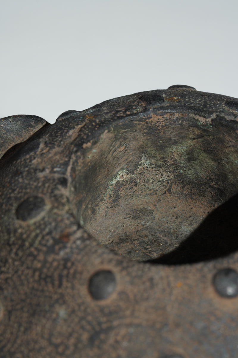 A rare Ikẹgobọ bronze sculpture in shape of a leopard-head, Nigeria. This impressive, almost spherical bronze has a cylindrical depression on its head, on which sacrificial rituals were performed. The leopard's head has a dark, worn and soft touch patina and is relatively well preserved.
