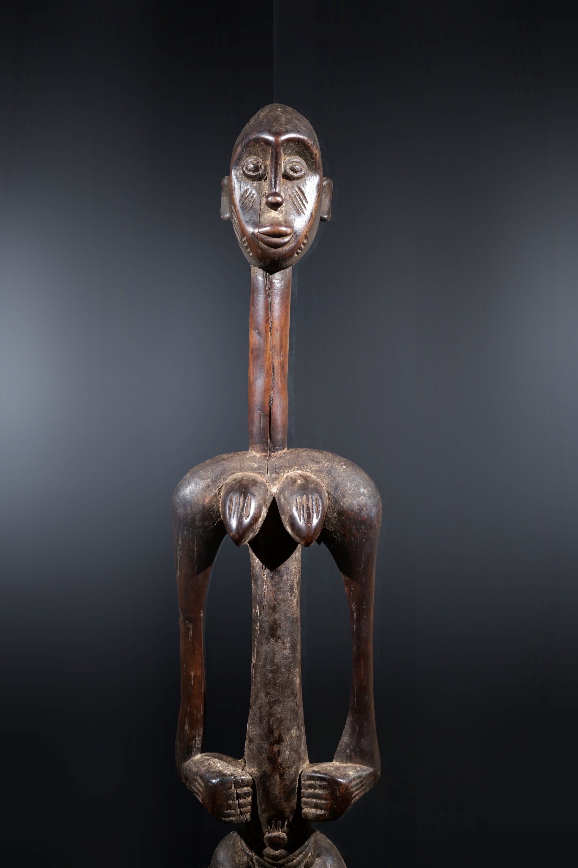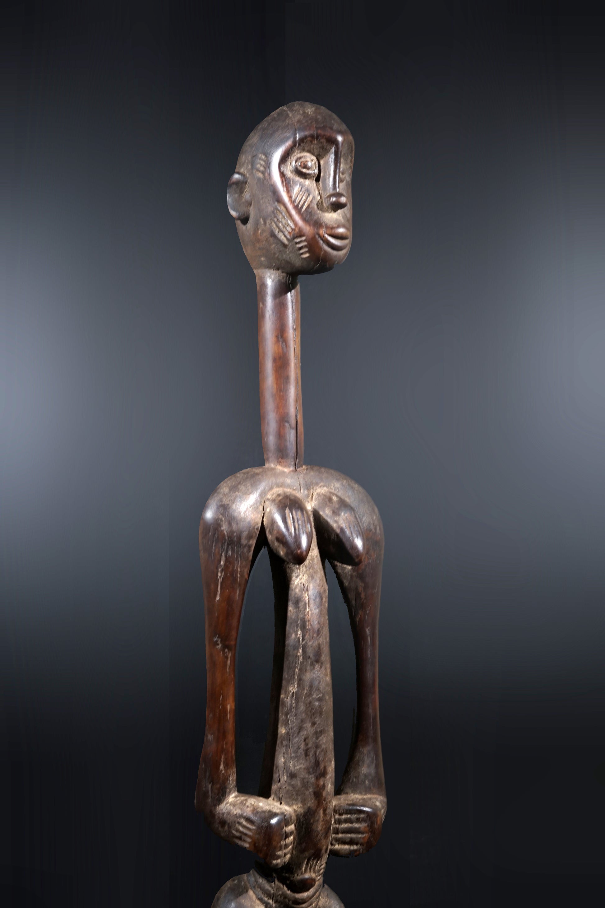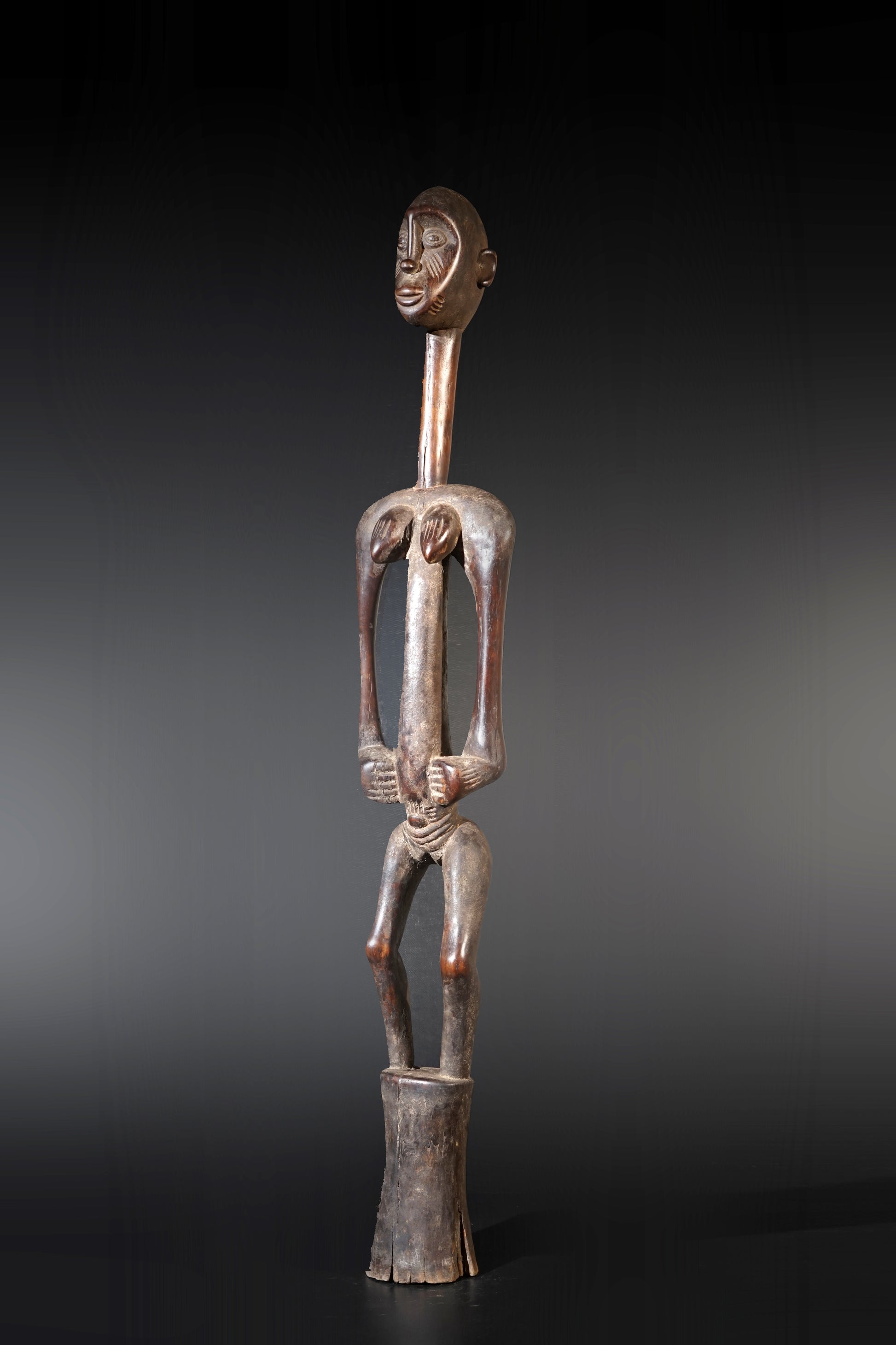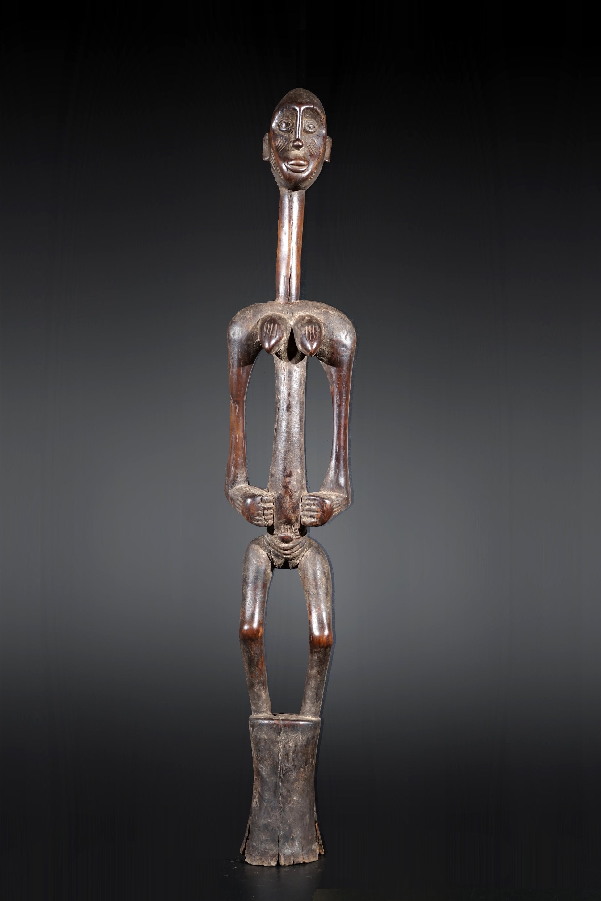 A remarkable female Rhythmpounder - called Déblé - with an extremely elongated neck, supporting an egg-like head, Ivory Coast, region of Diamtènè, standing on a columnar, slightly concave base; intensive touch patina on neck and arms is verifying a long-lasting ritual use; provenance Mohamed Belo Garba, Korhogo, Ivory Coast, incl. stand.