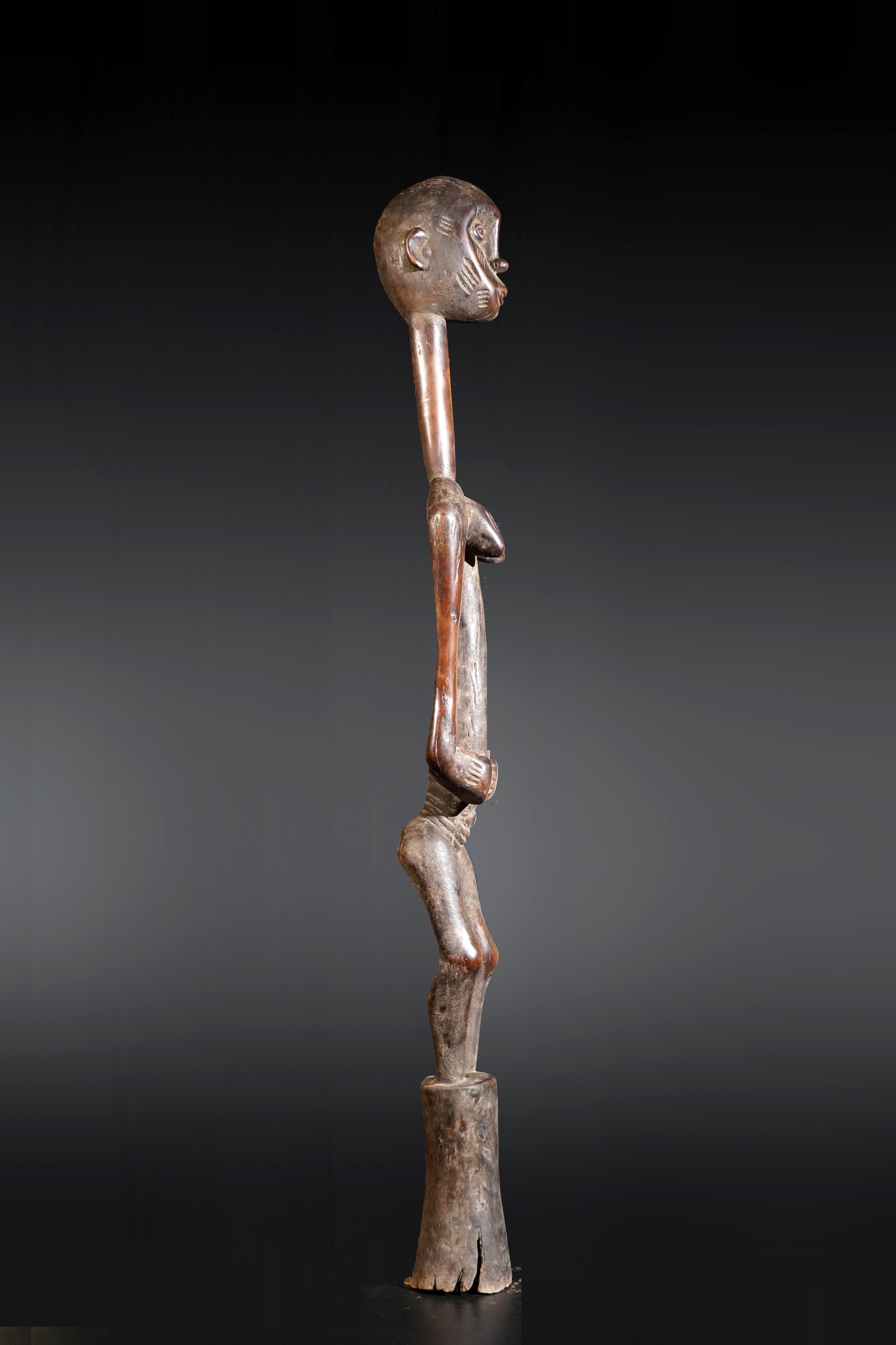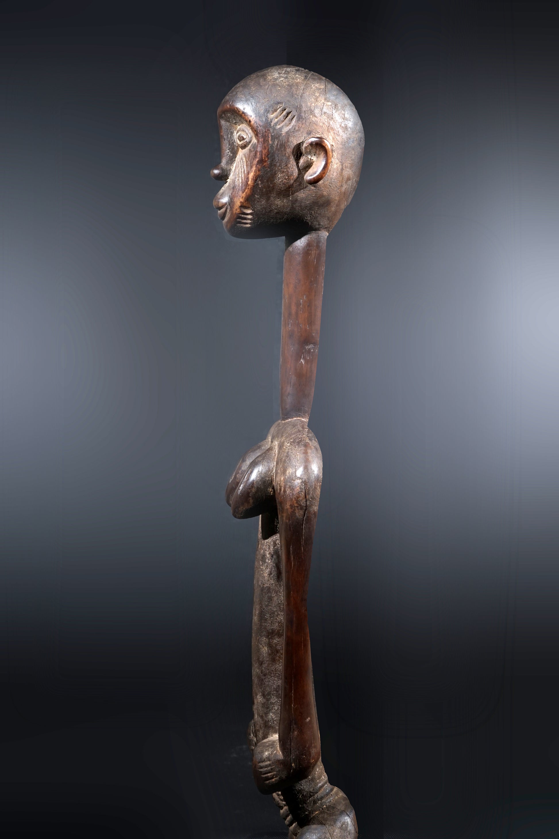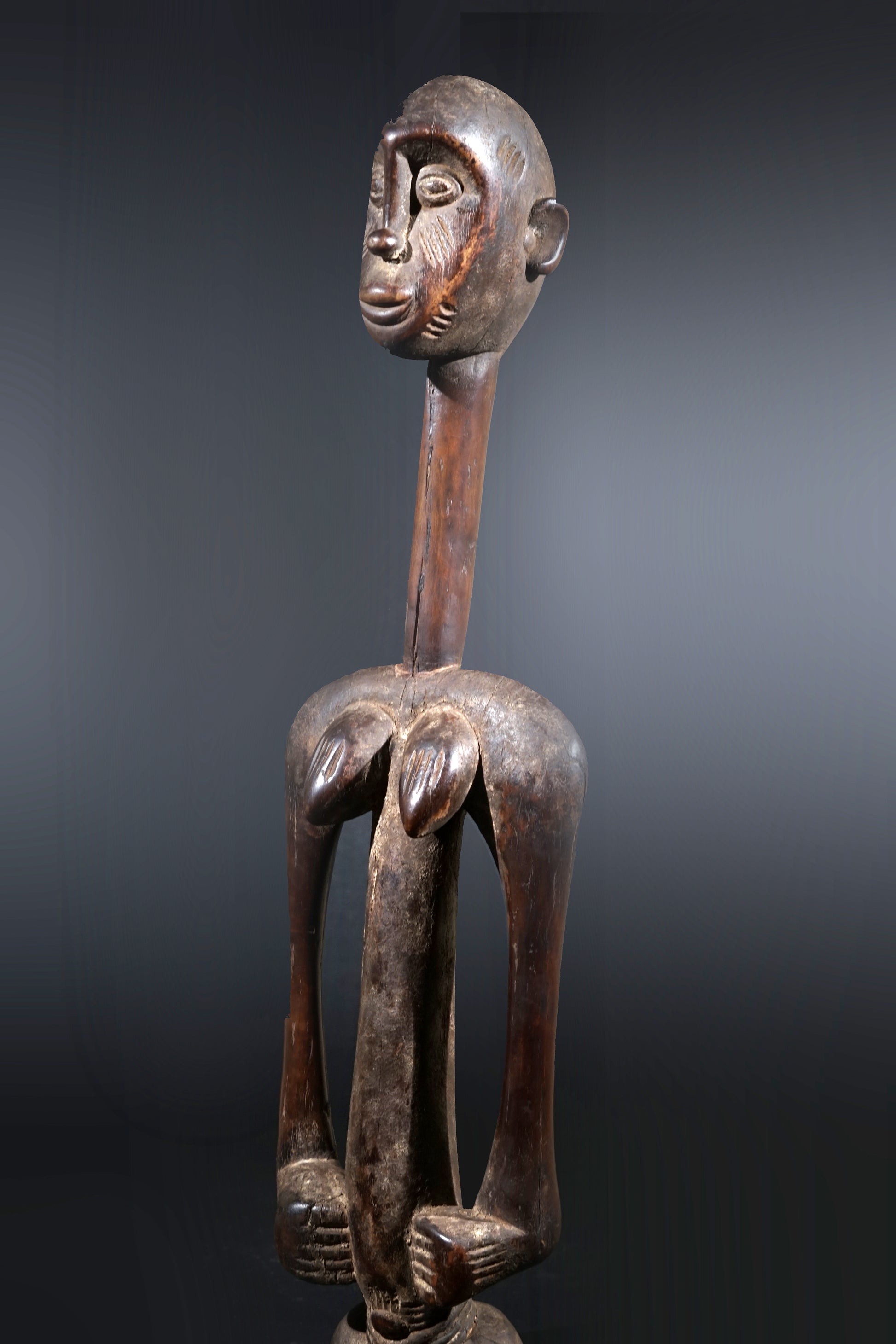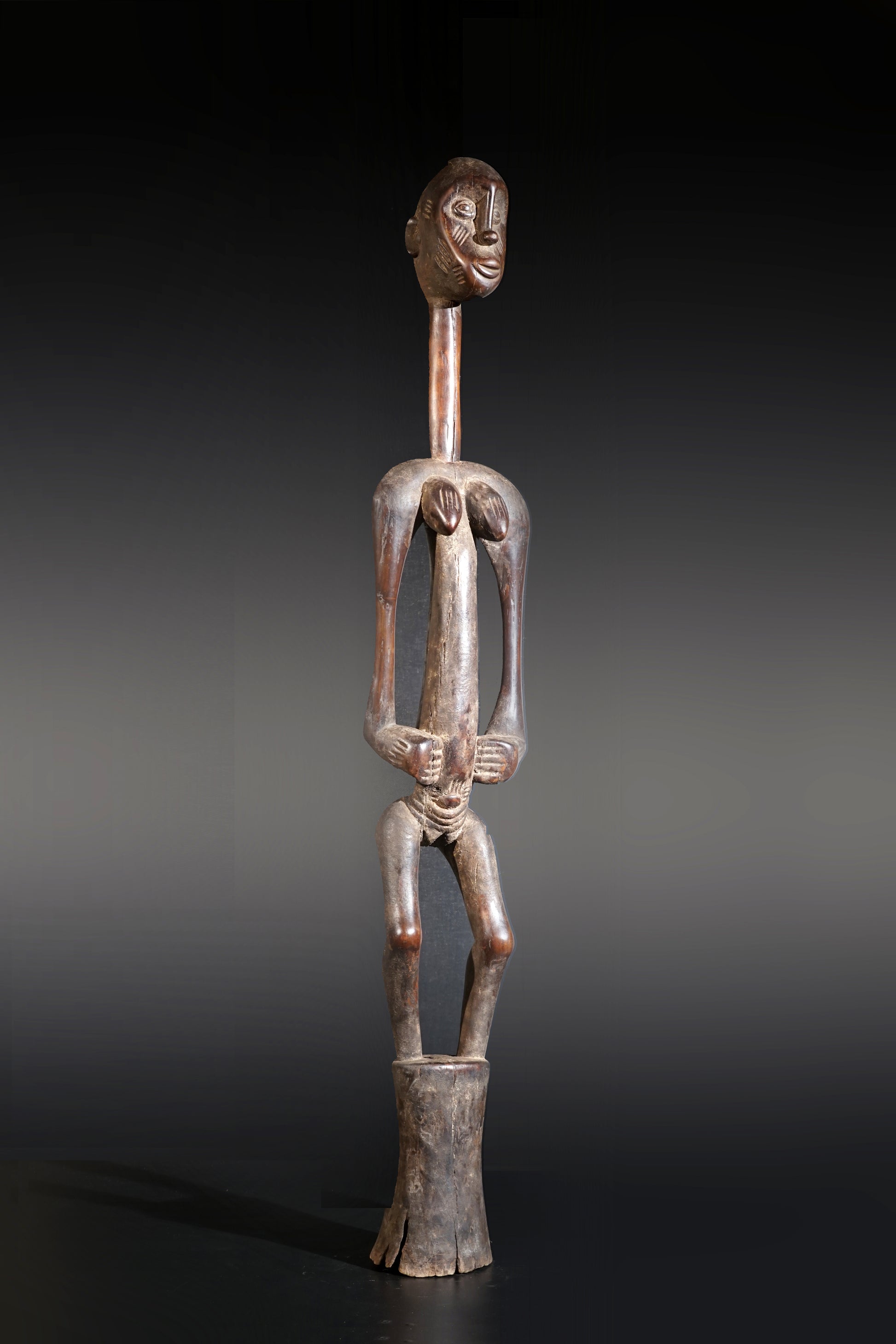 A remarkable female Rhythmpounder - called Déblé - with an extremely elongated neck, supporting an egg-like head, Ivory Coast, region of Diamtènè, standing on a columnar, slightly concave base; intensive touch patina on neck and arms is verifying a long-lasting ritual use; provenance Mohamed Belo Garba, Korhogo, Ivory Coast, incl. stand.