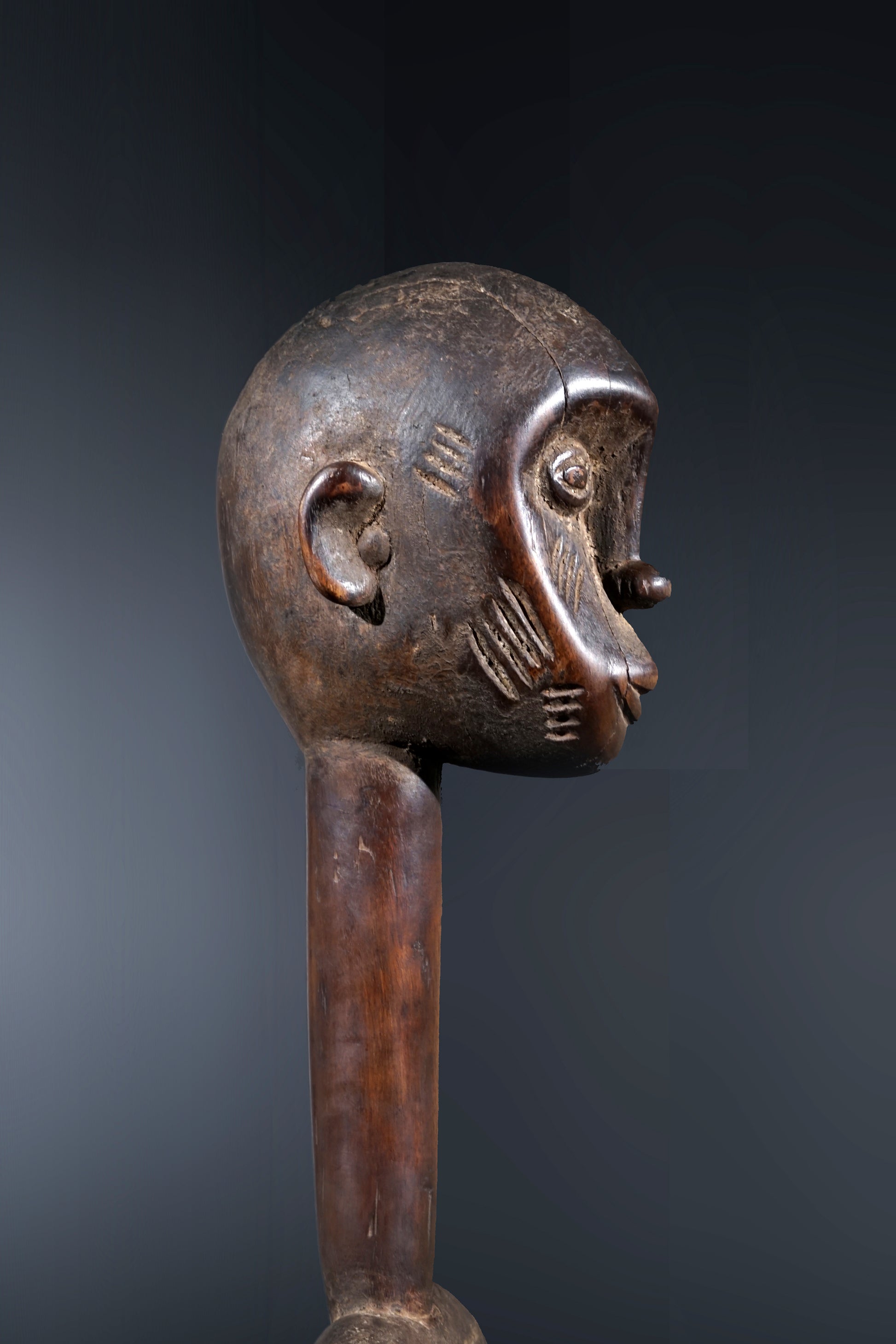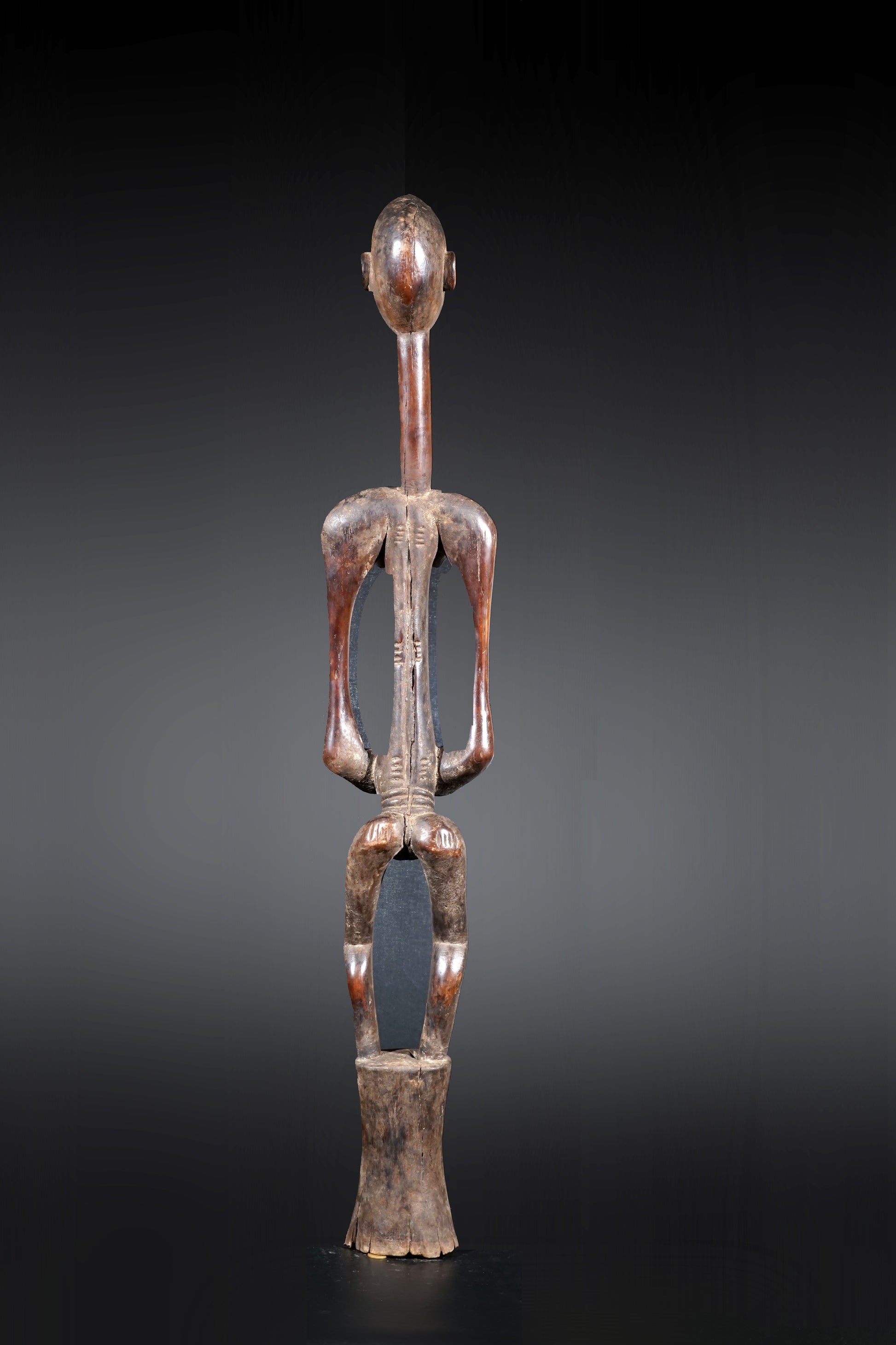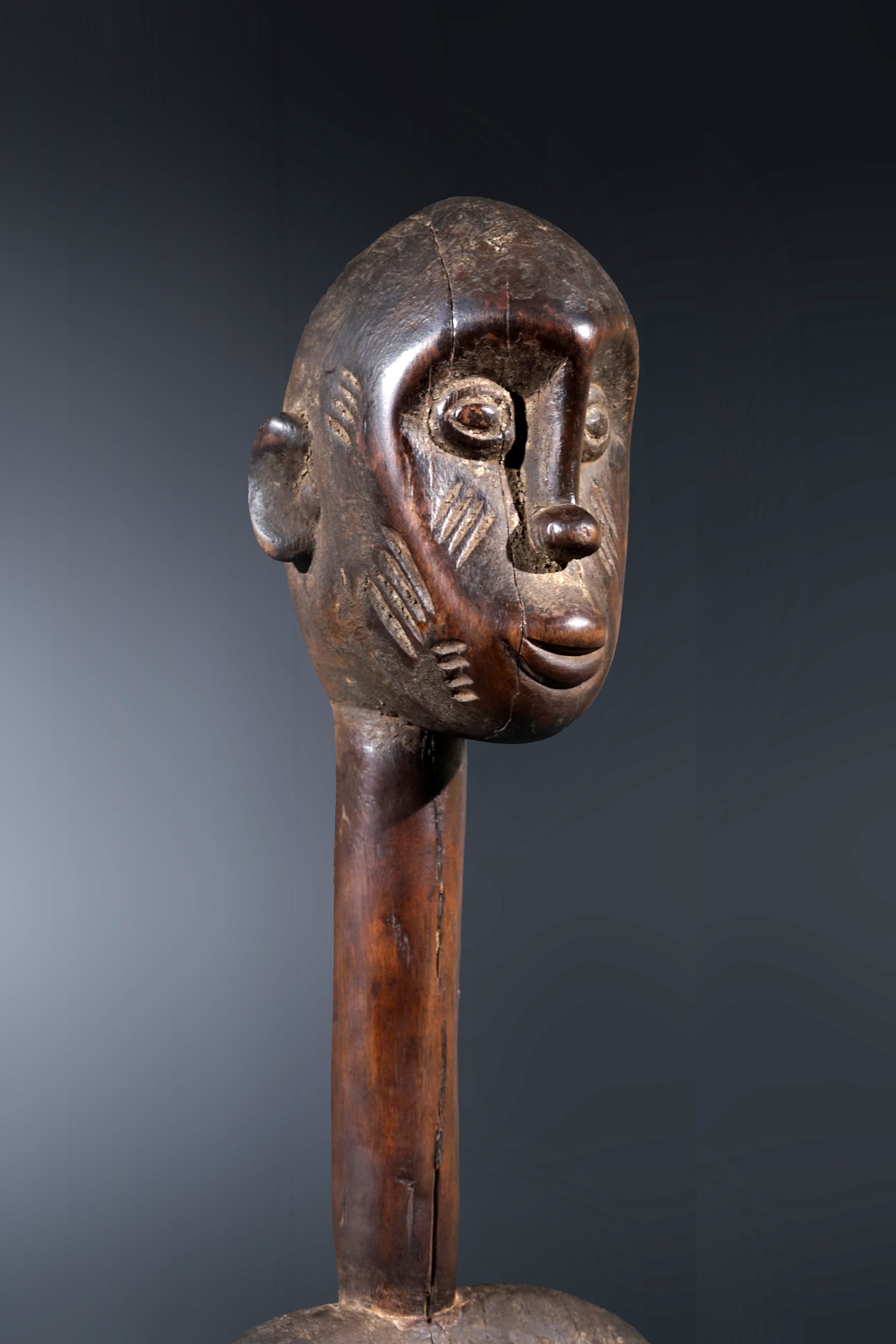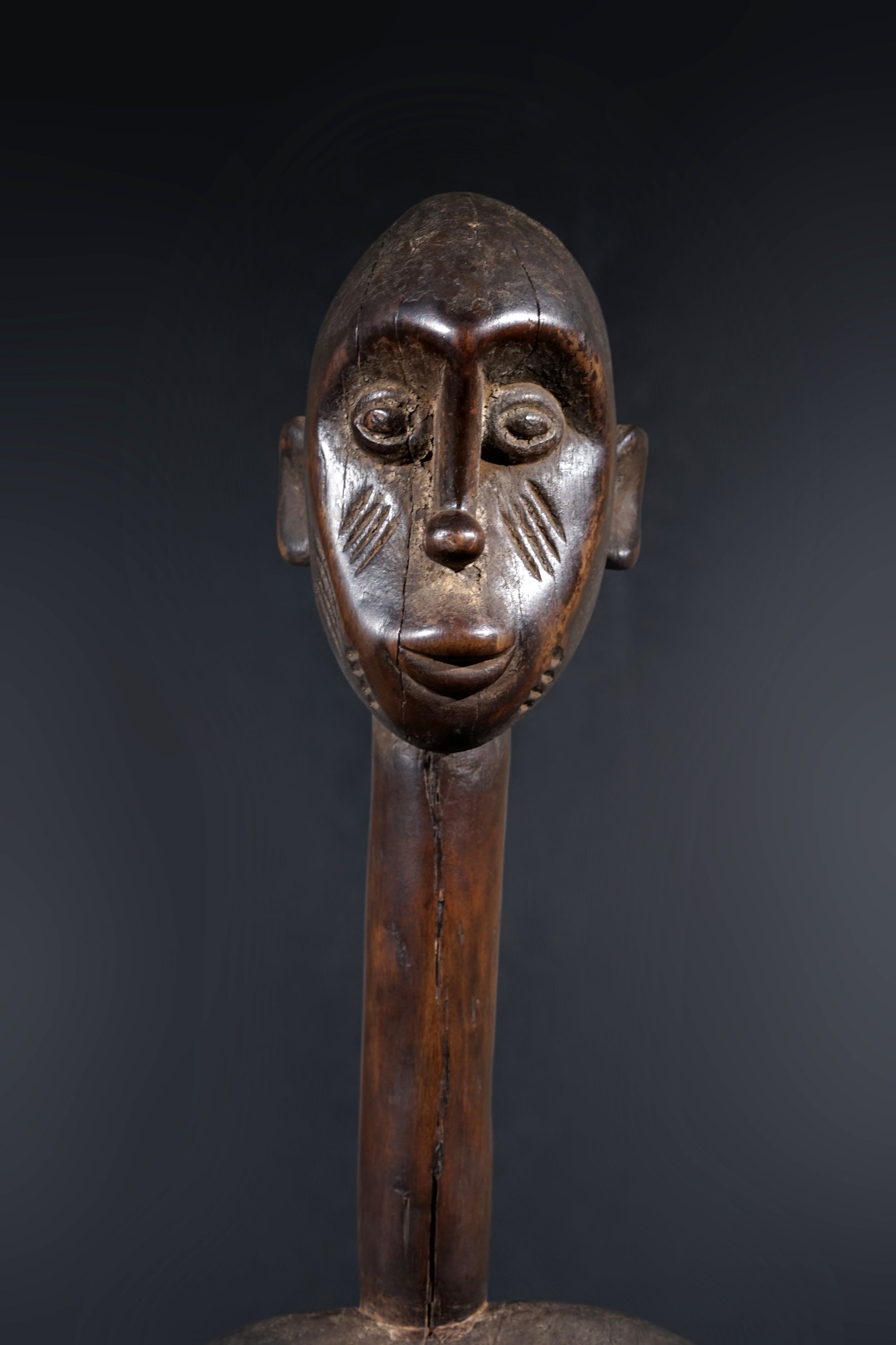 A remarkable female Rhythmpounder - called Déblé - with an extremely elongated neck, supporting an egg-like head, Ivory Coast, region of Diamtènè, standing on a columnar, slightly concave base; intensive touch patina on neck and arms is verifying a long-lasting ritual use; provenance Mohamed Belo Garba, Korhogo, Ivory Coast, incl. stand.