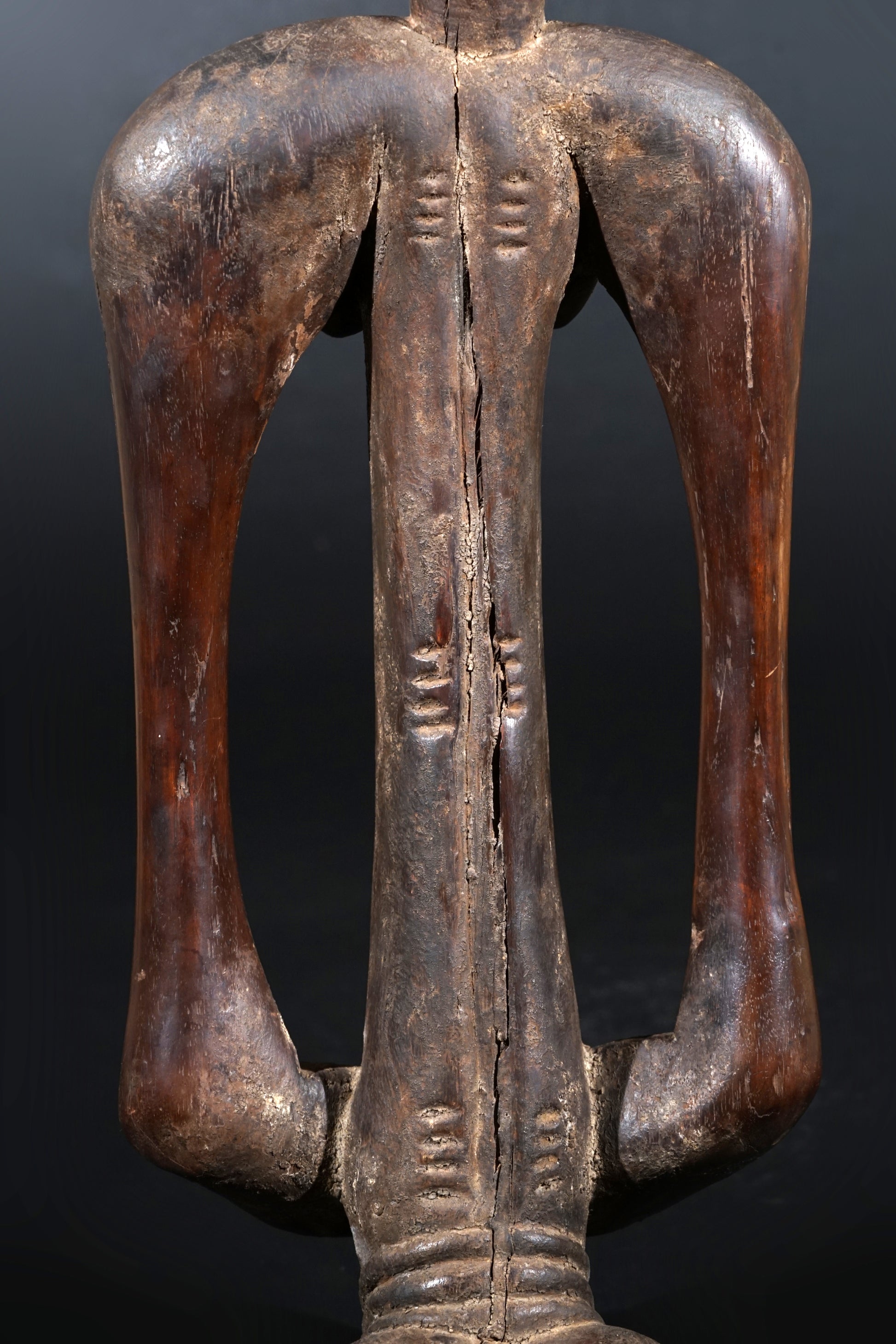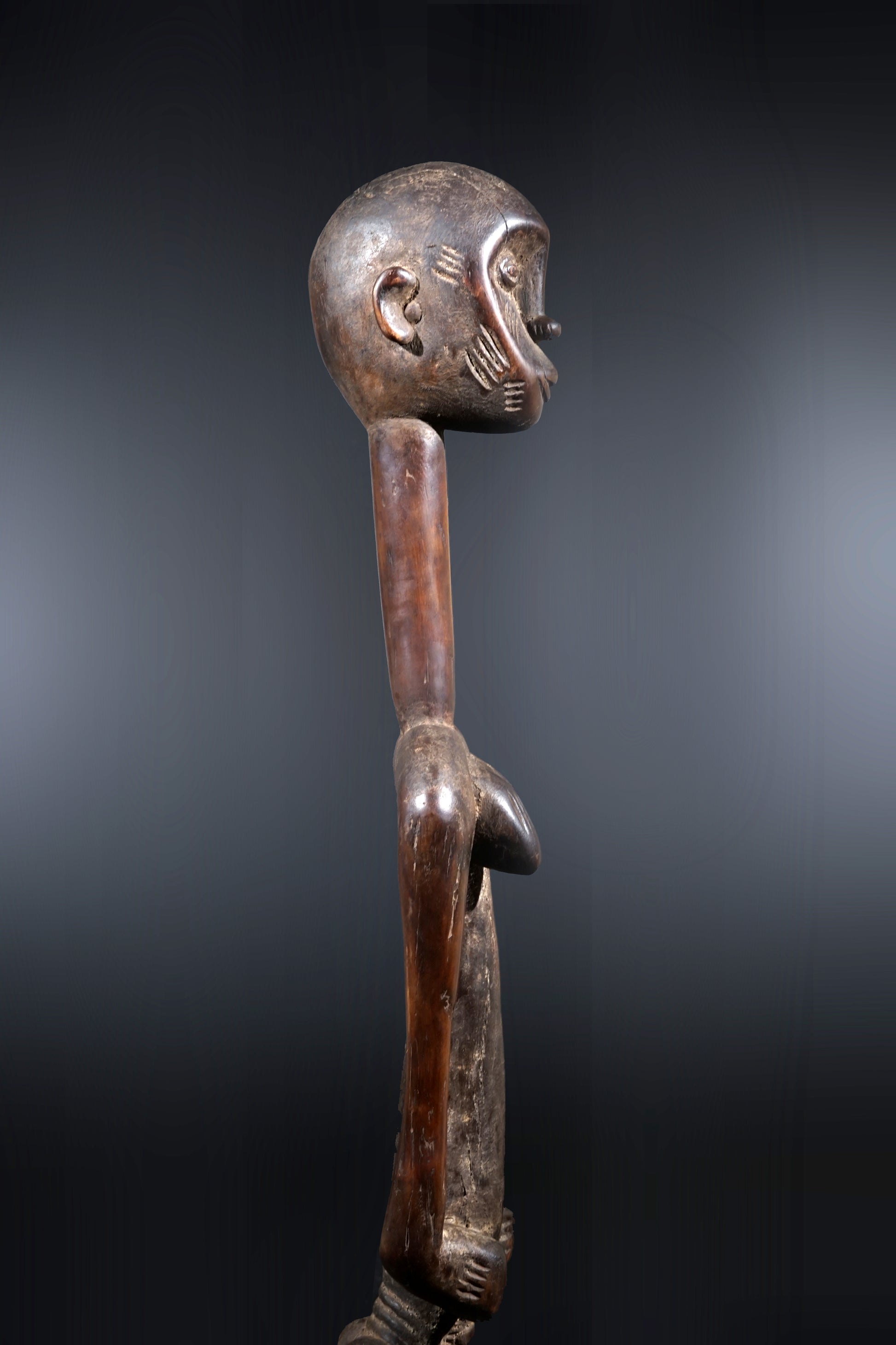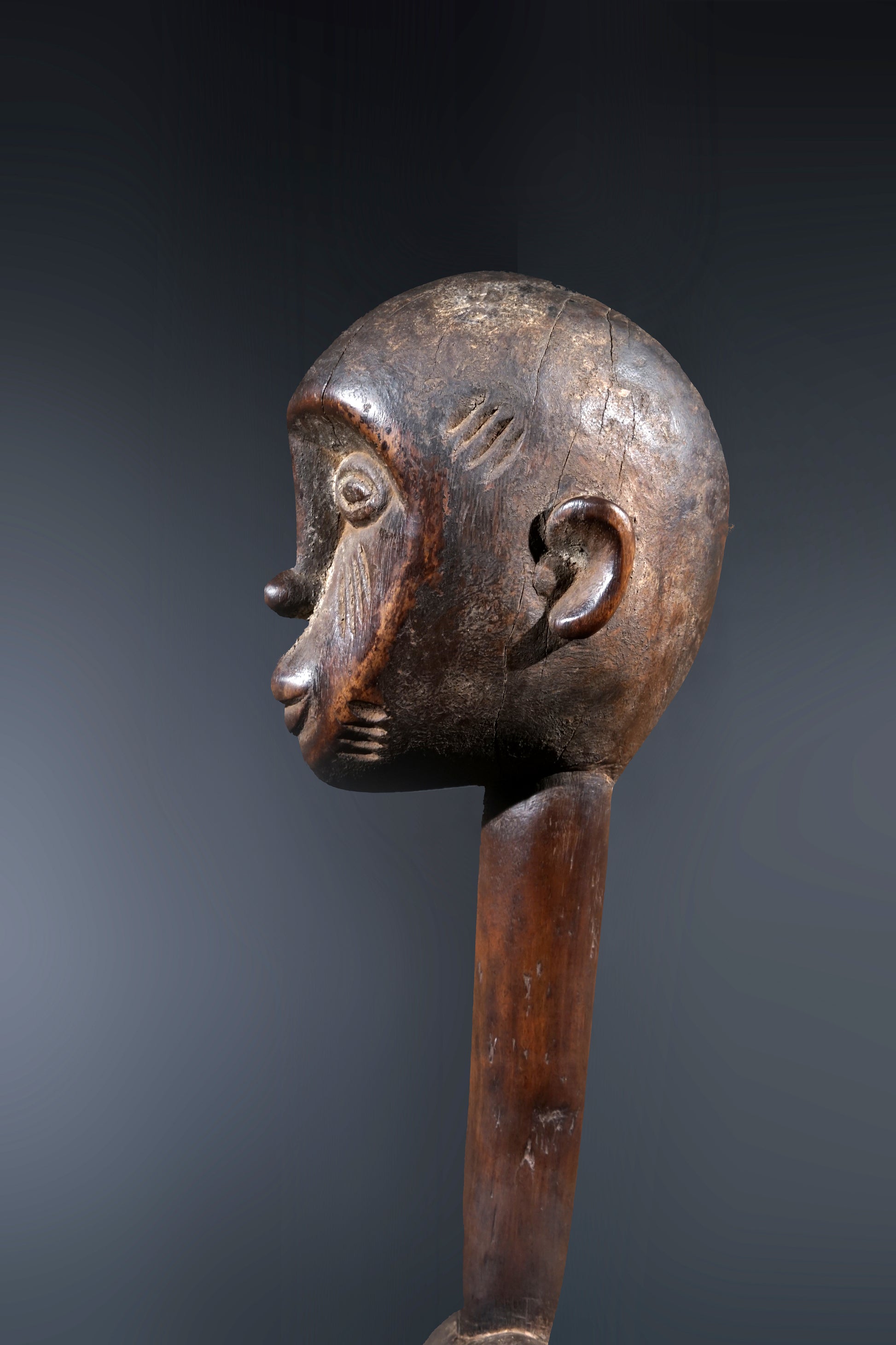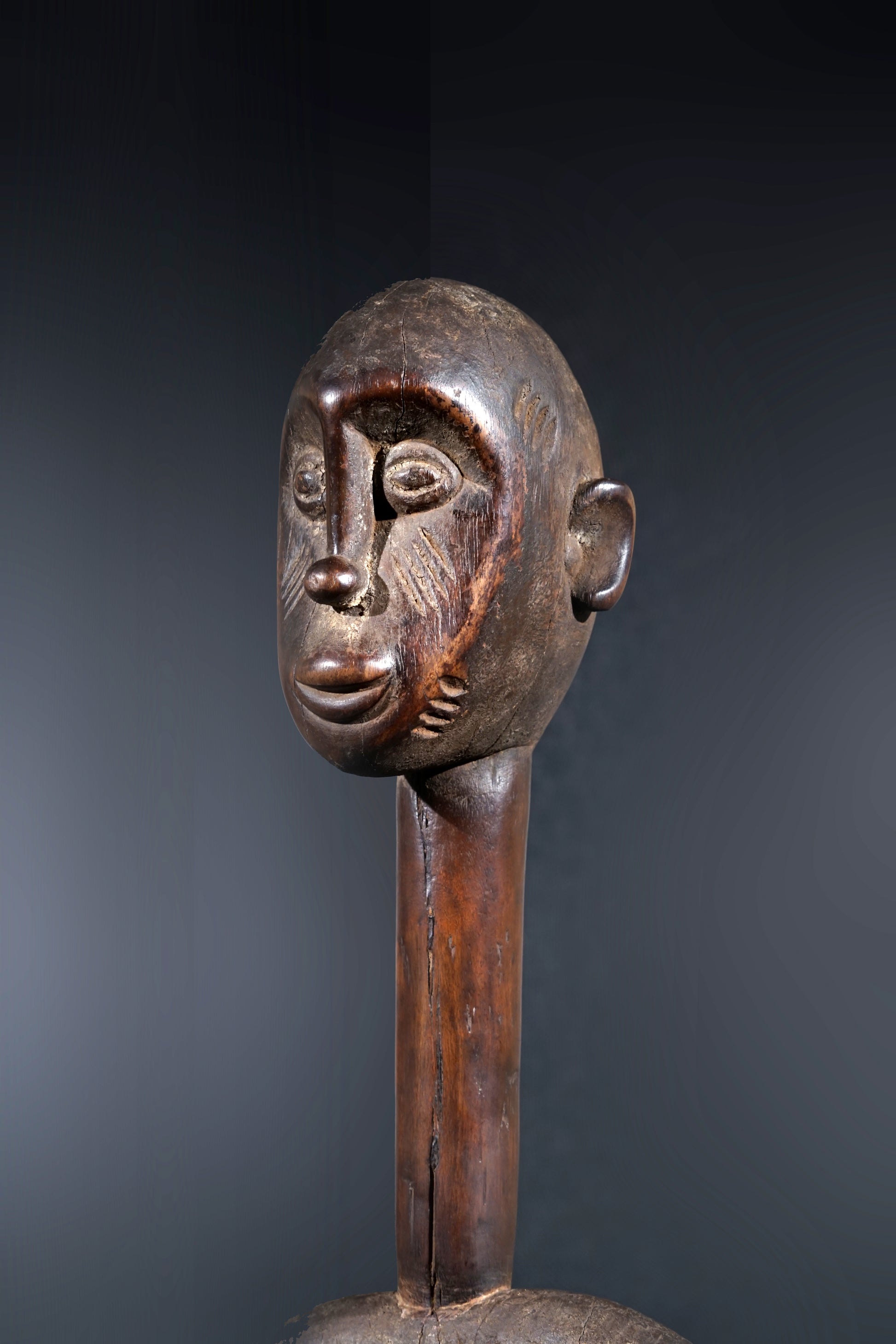 A remarkable female Rhythmpounder - called Déblé - with an extremely elongated neck, supporting an egg-like head, Ivory Coast, region of Diamtènè, standing on a columnar, slightly concave base; intensive touch patina on neck and arms is verifying a long-lasting ritual use; provenance Mohamed Belo Garba, Korhogo, Ivory Coast, incl. stand.