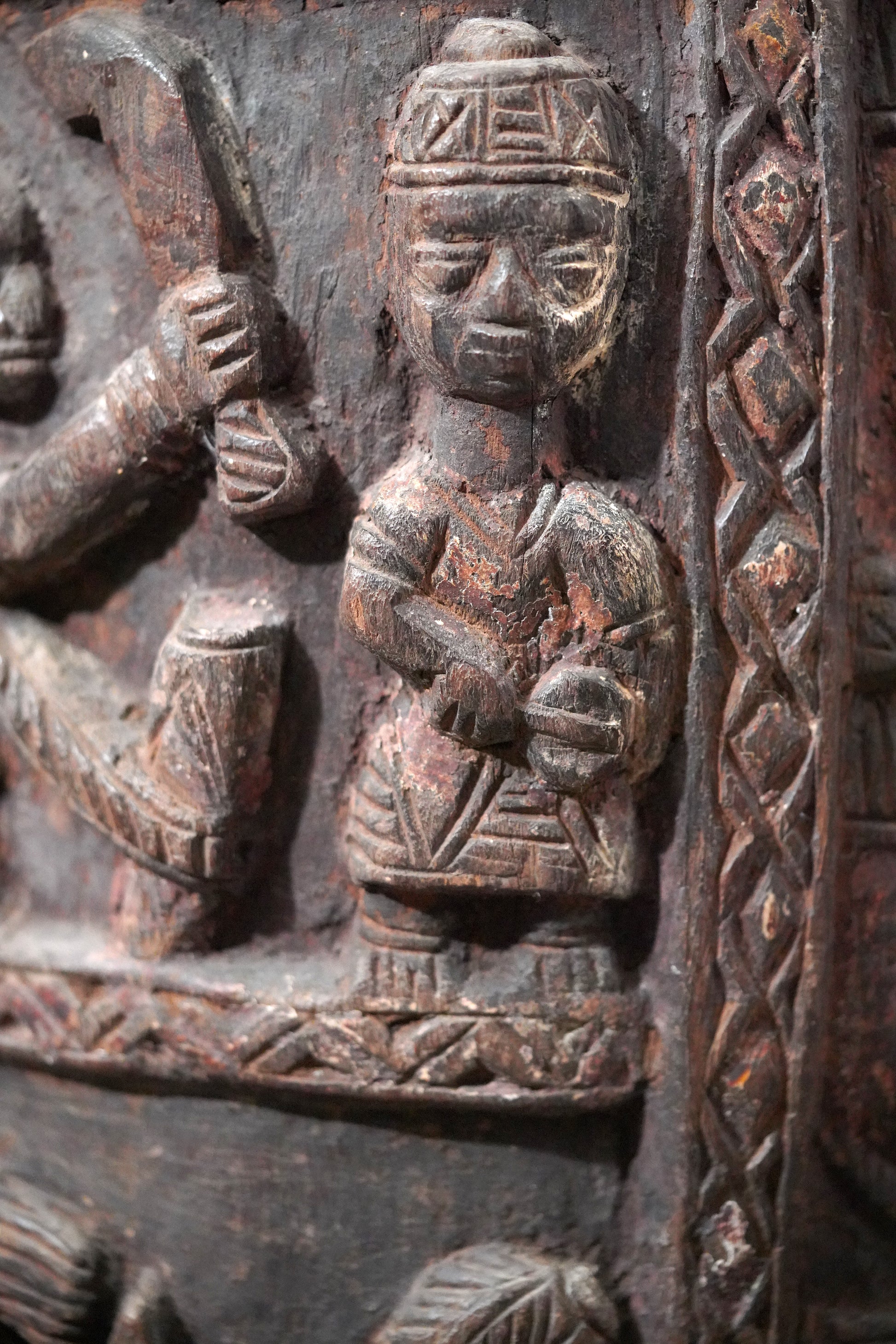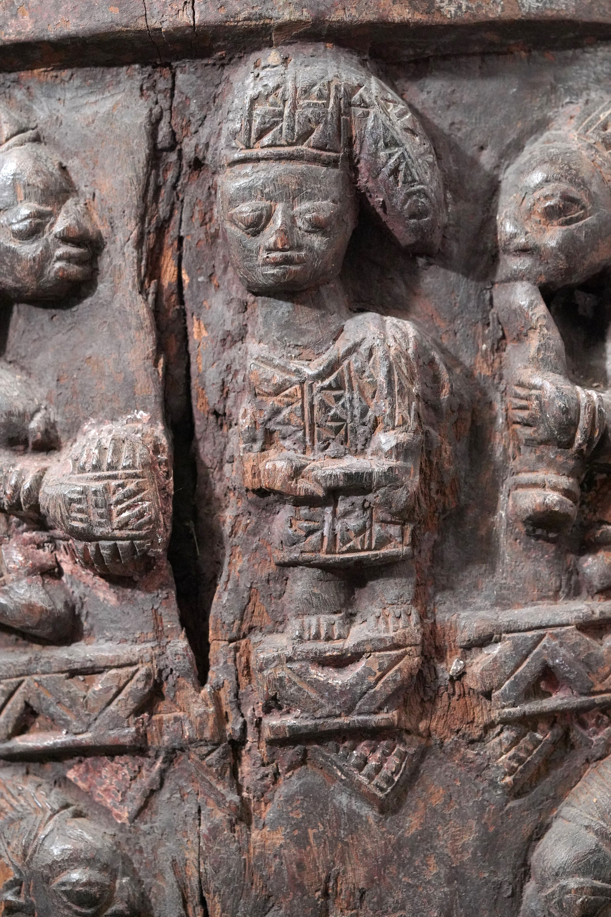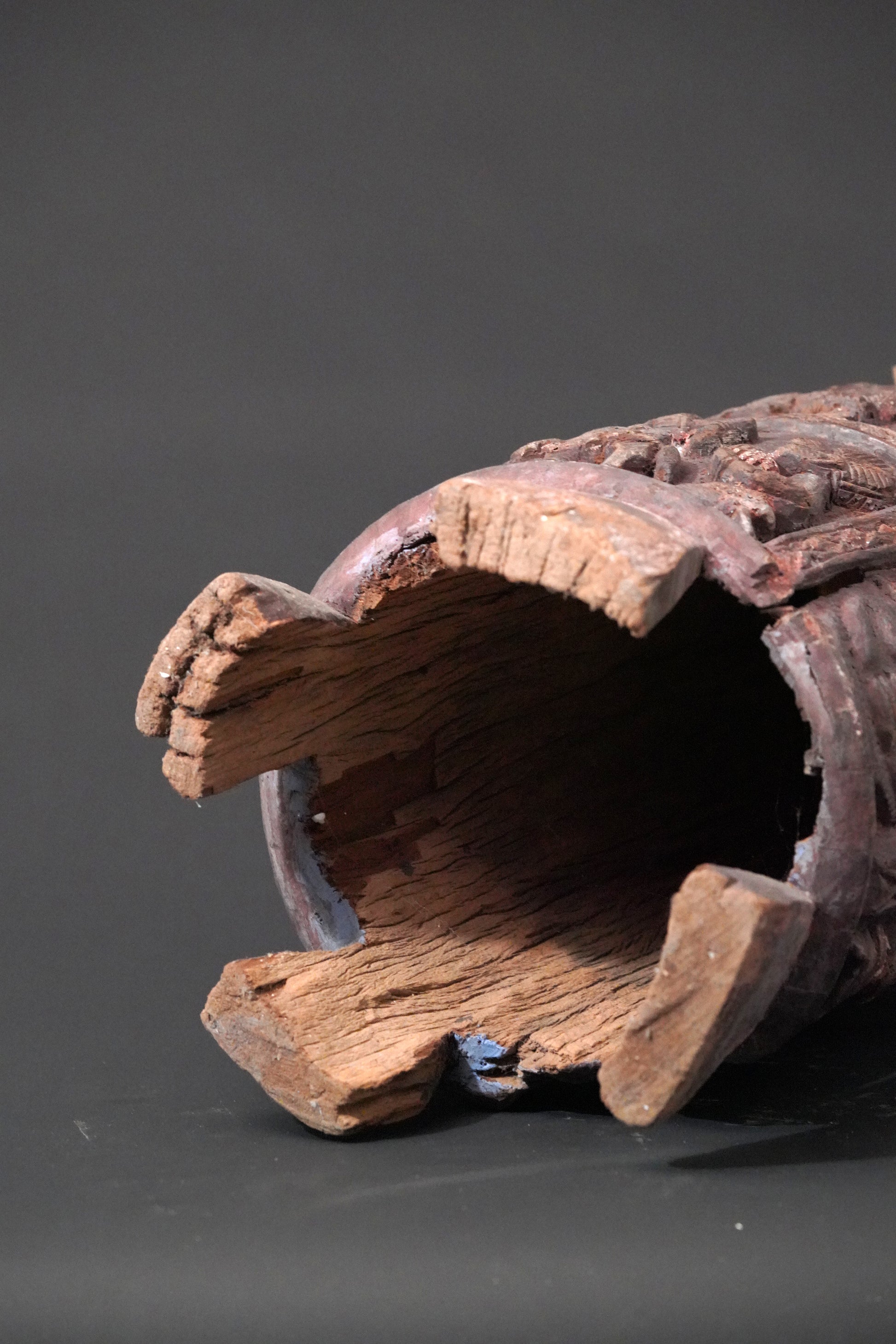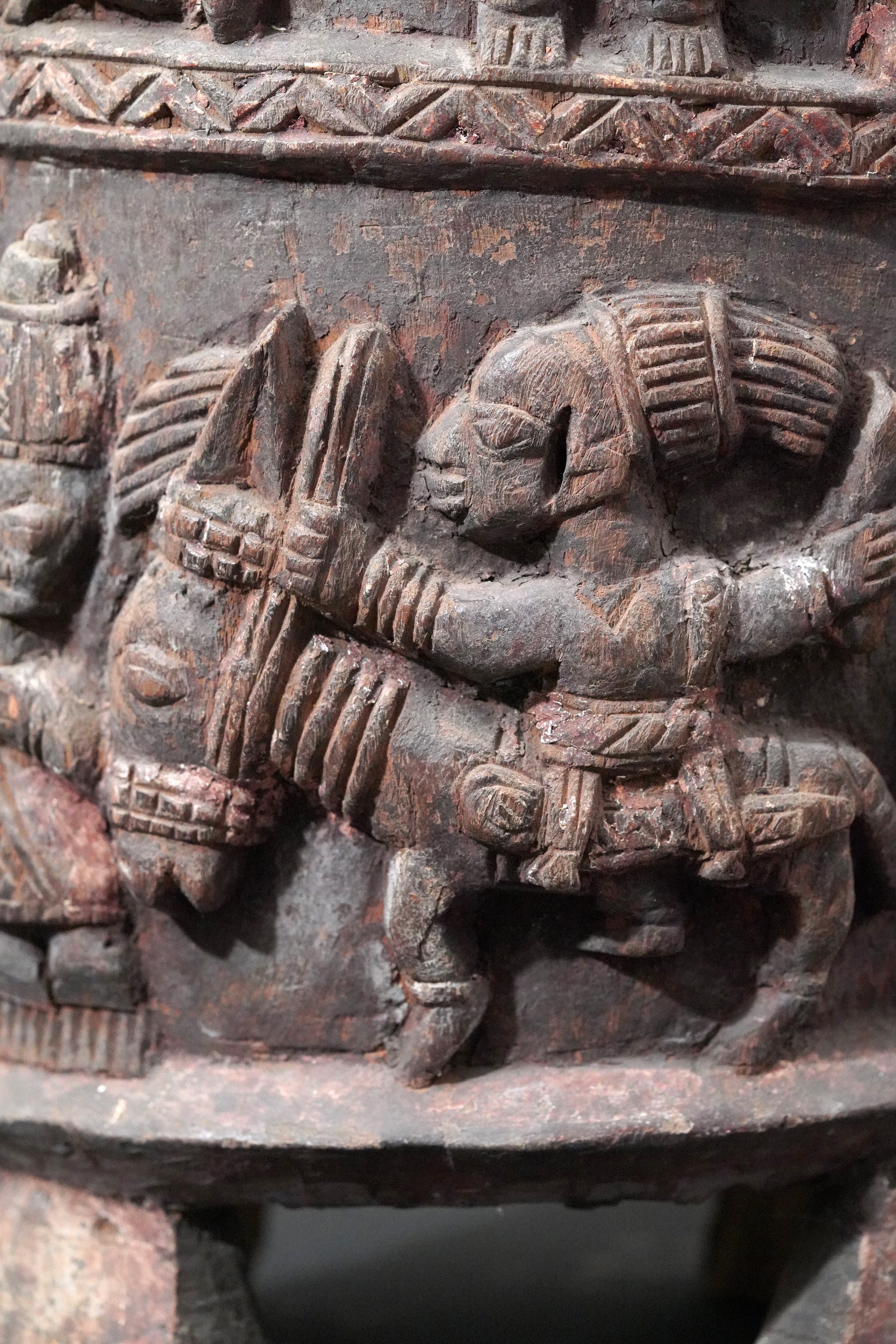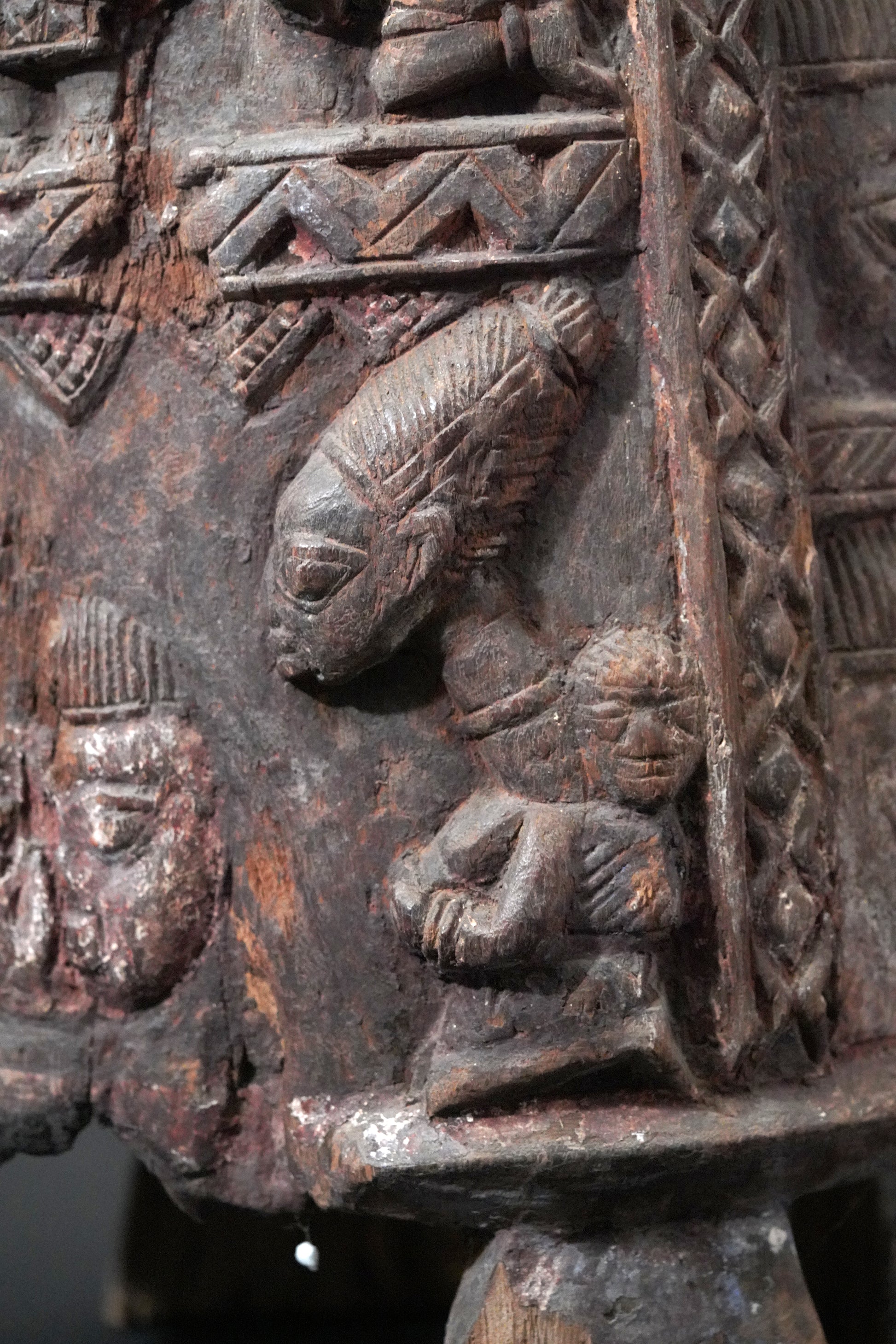 A round, one-piece standing drum on four legs, made of hard, heavy wood. The resonating body is located under the upper animal skin covering. Around the drum is a relief with abstract depictions of mythological content relating to the earth goddess "Onile". These drums, called "Agba", were considered sacred objects and were only used for ritual ceremonies. An interesting object with good use patina and some age damage.