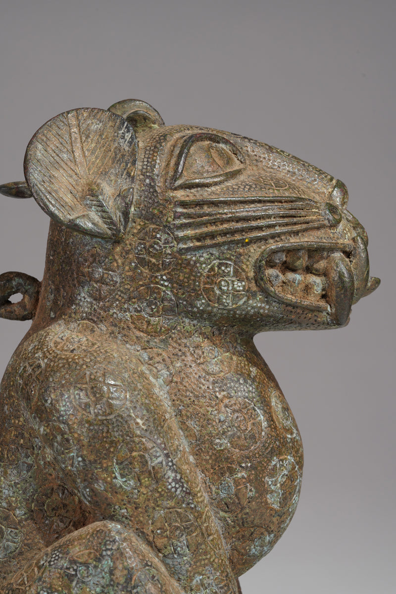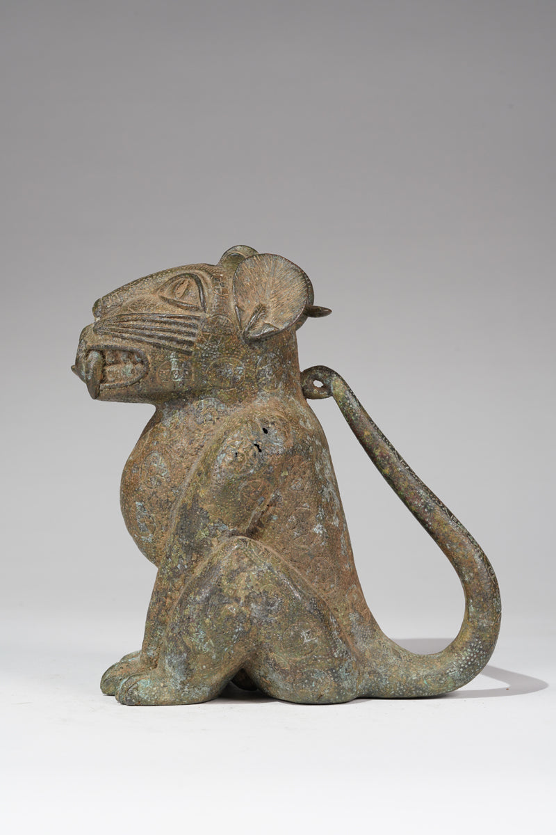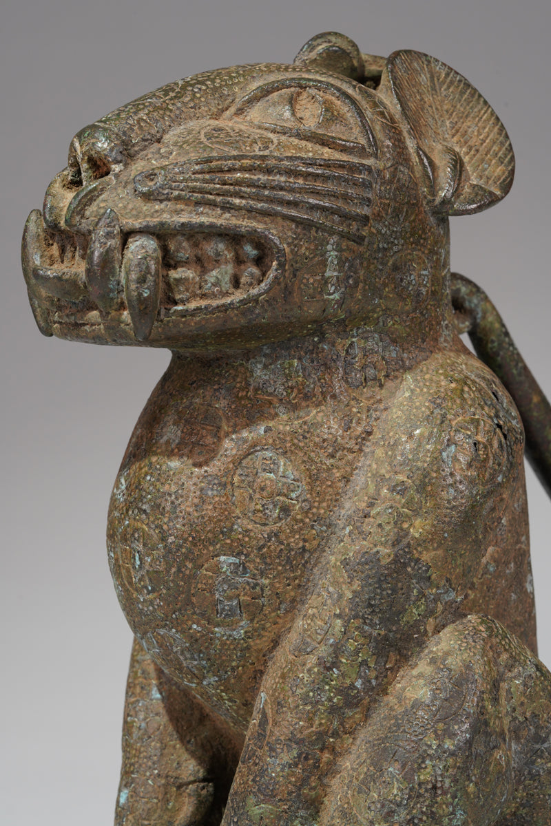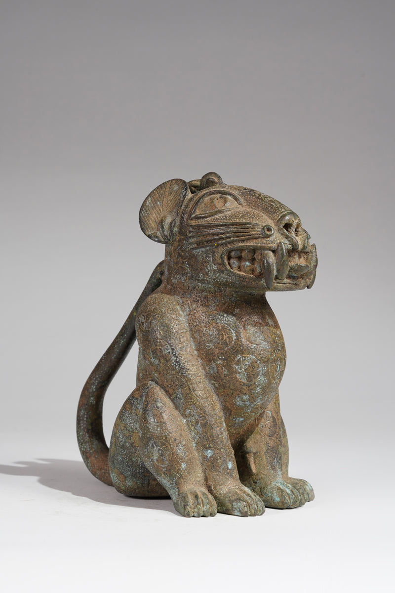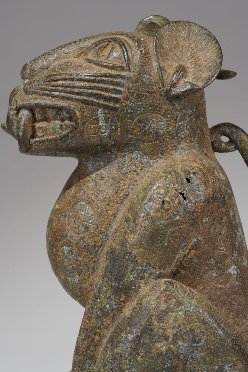 A seated bronze leopard, in the style of Benin, partly with greenish oxidised patina, Nigeria.