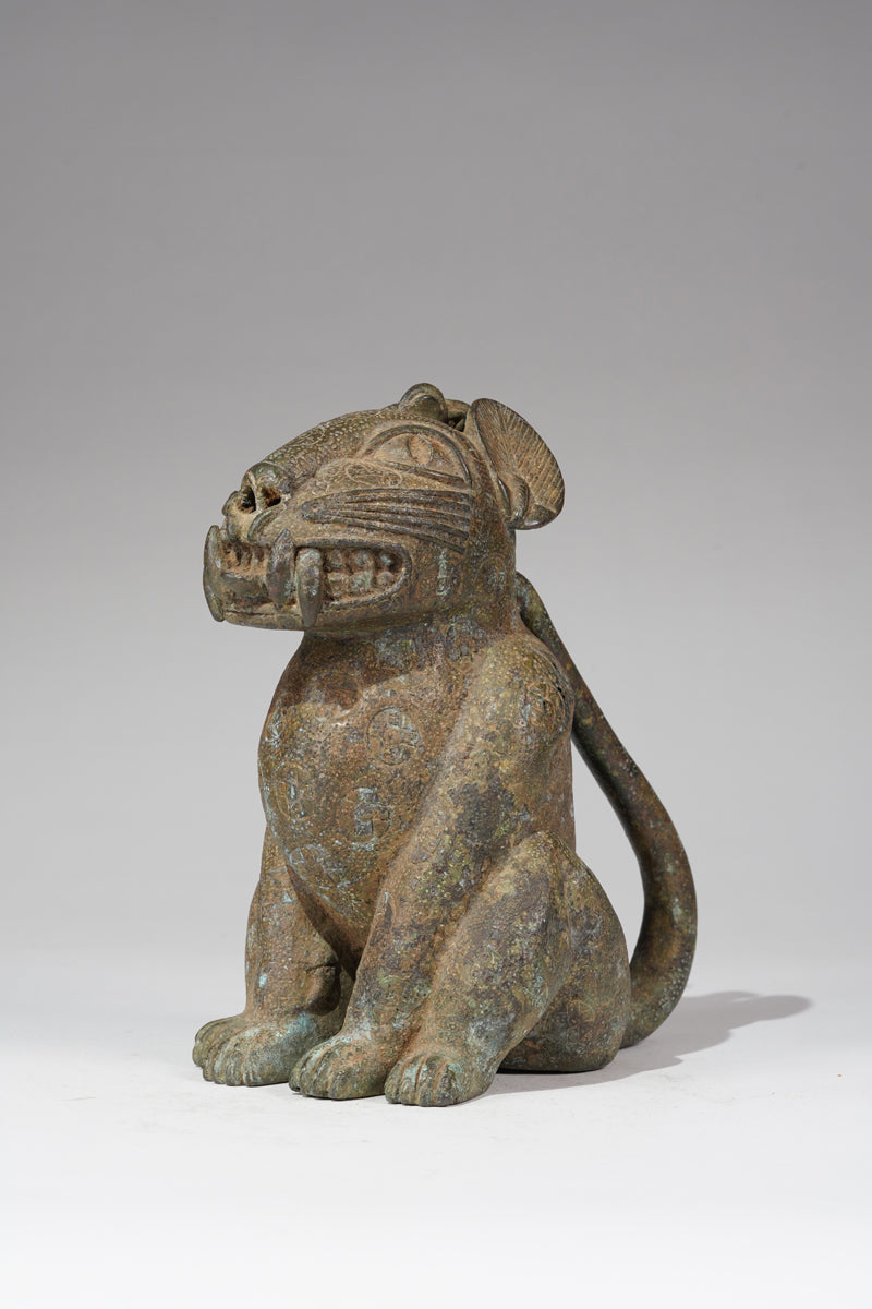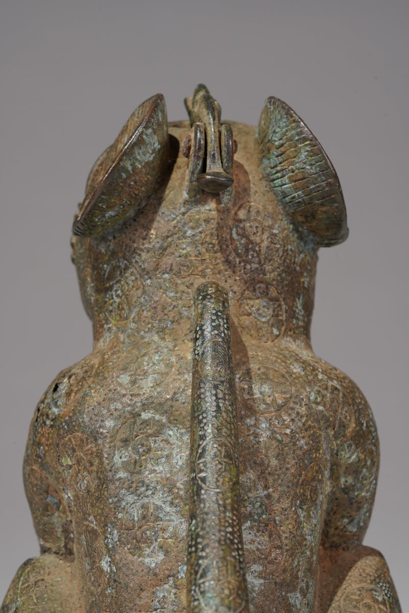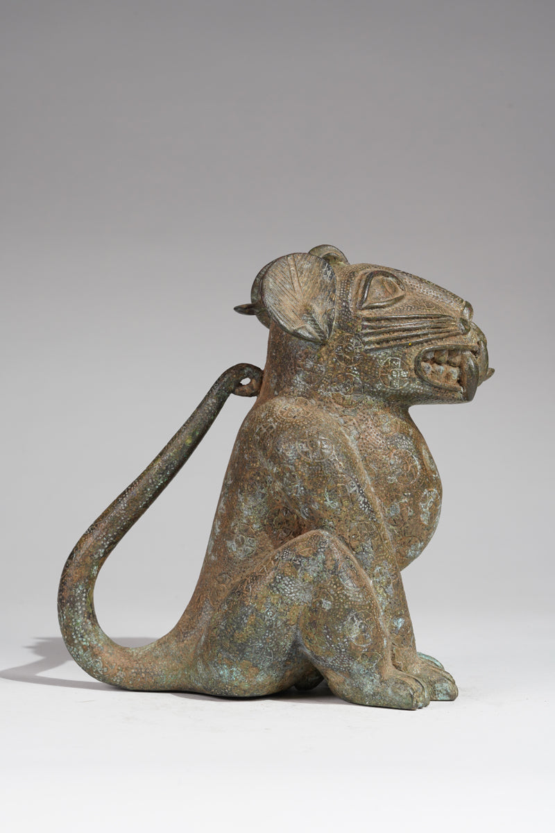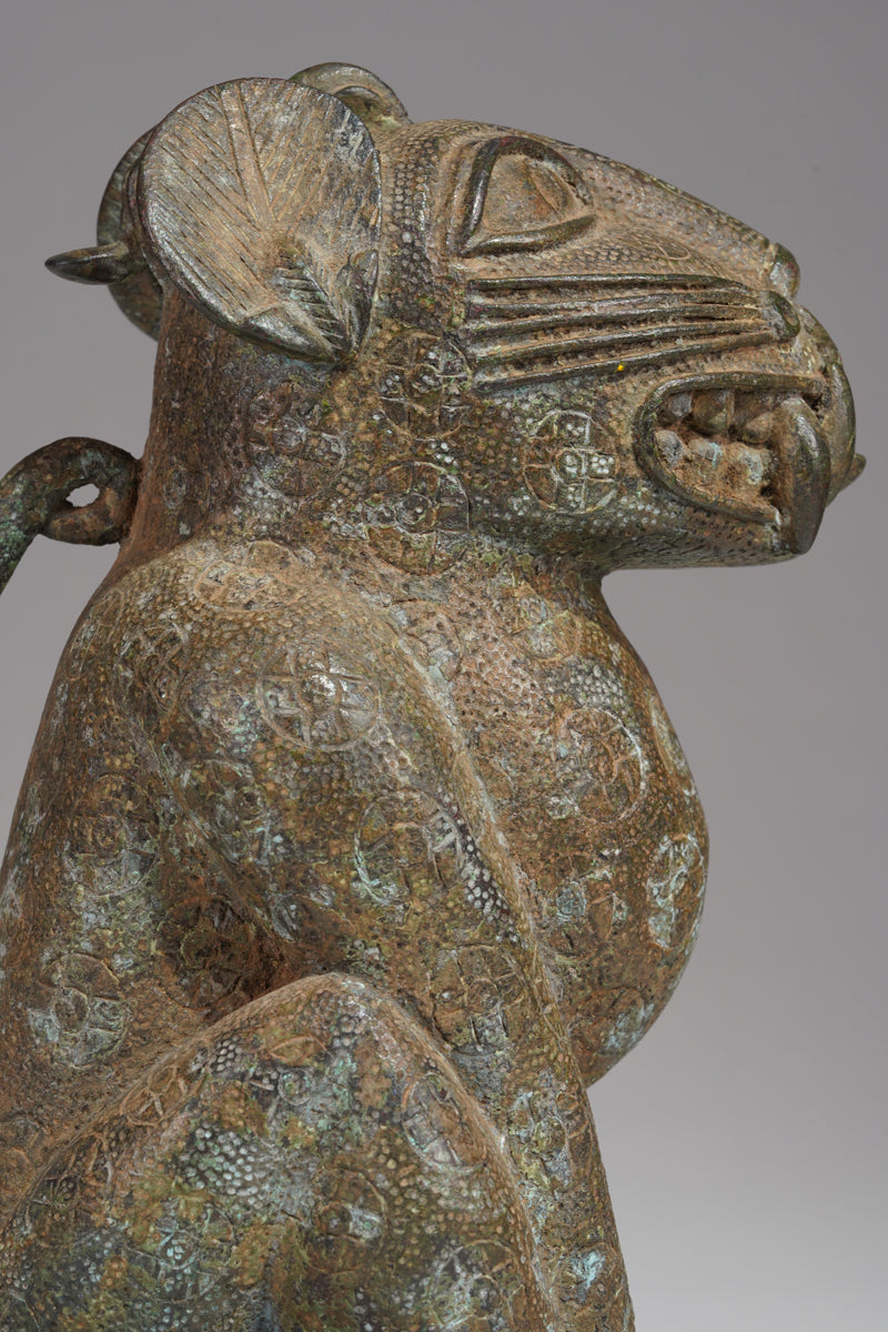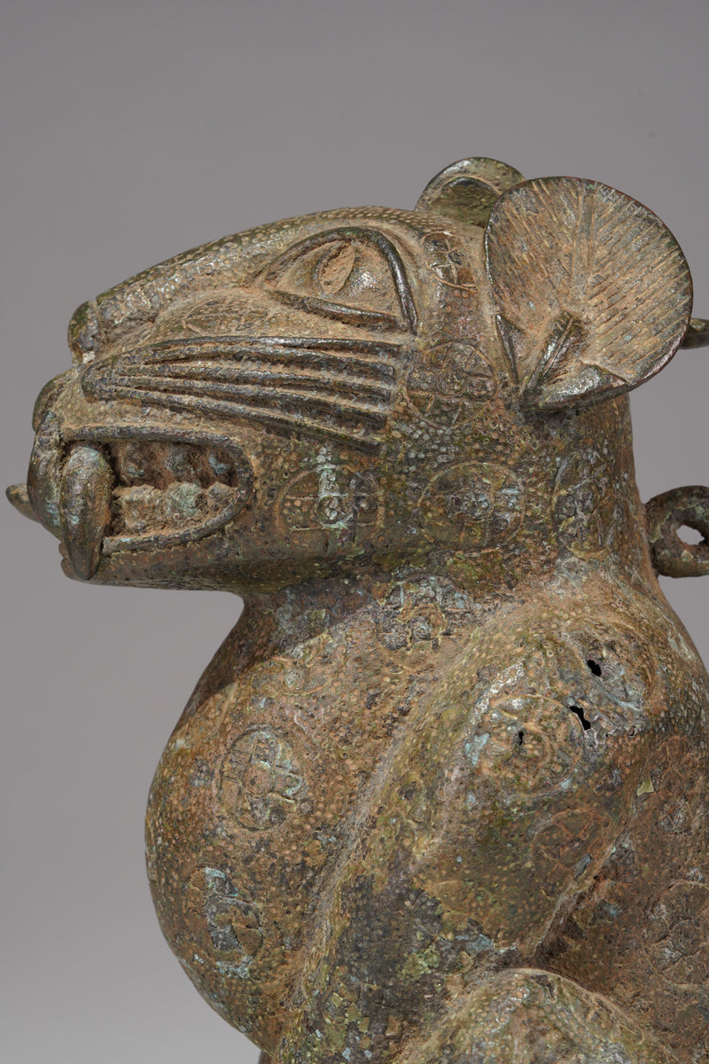 A seated bronze leopard, in the style of Benin, partly with greenish oxidised patina, Nigeria.