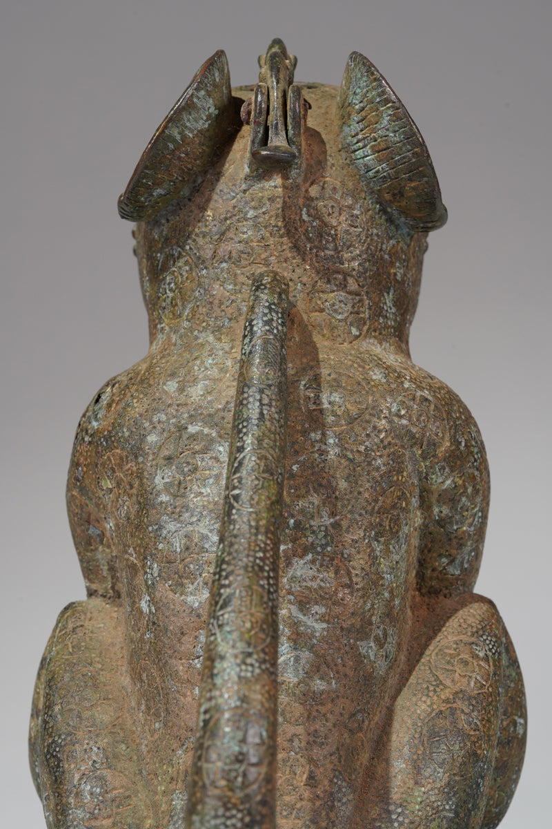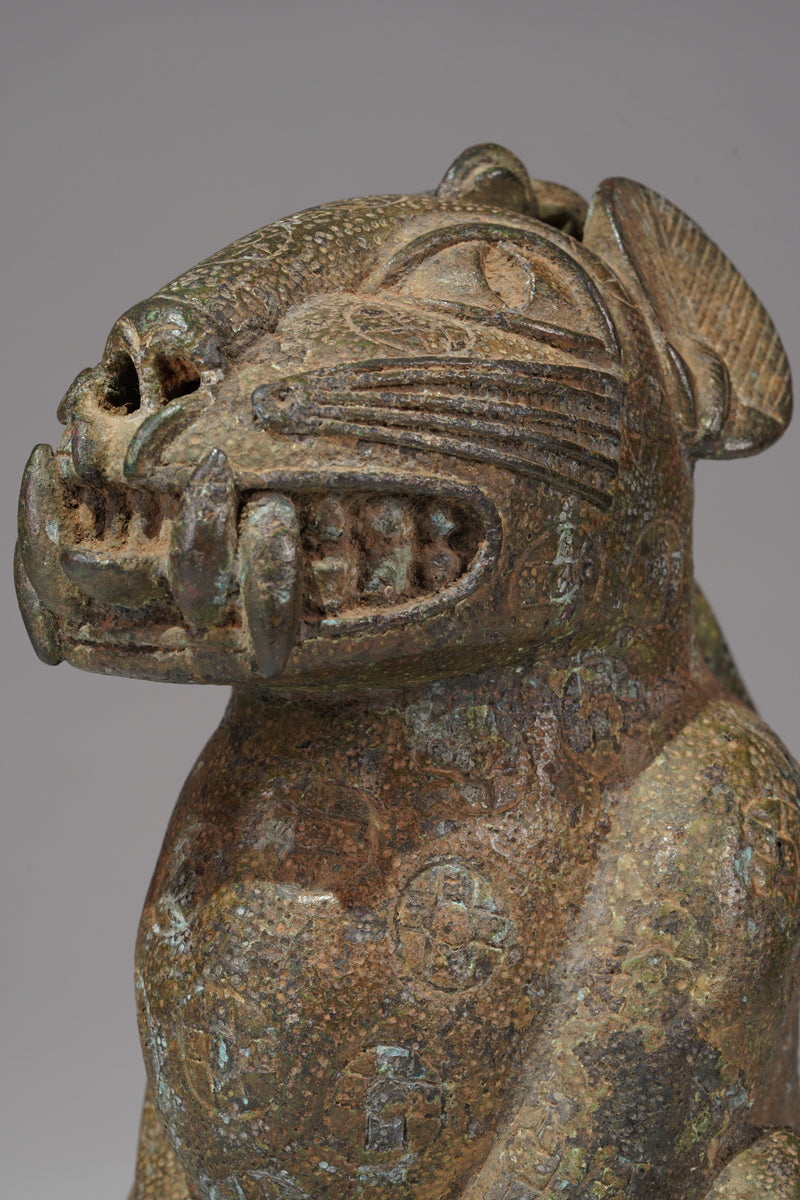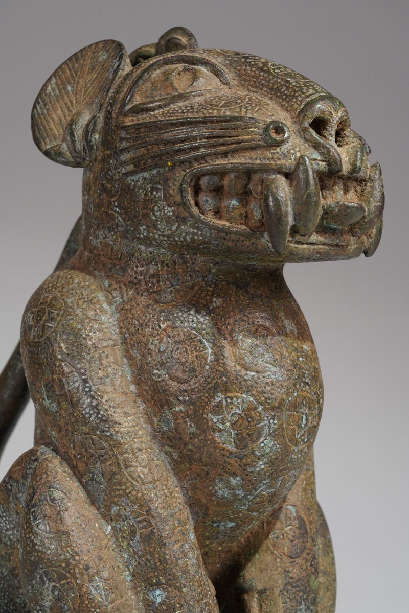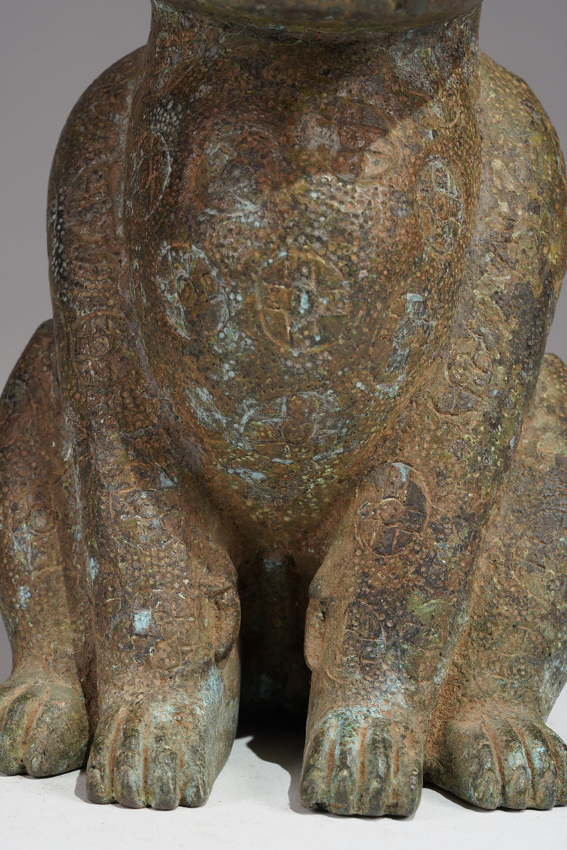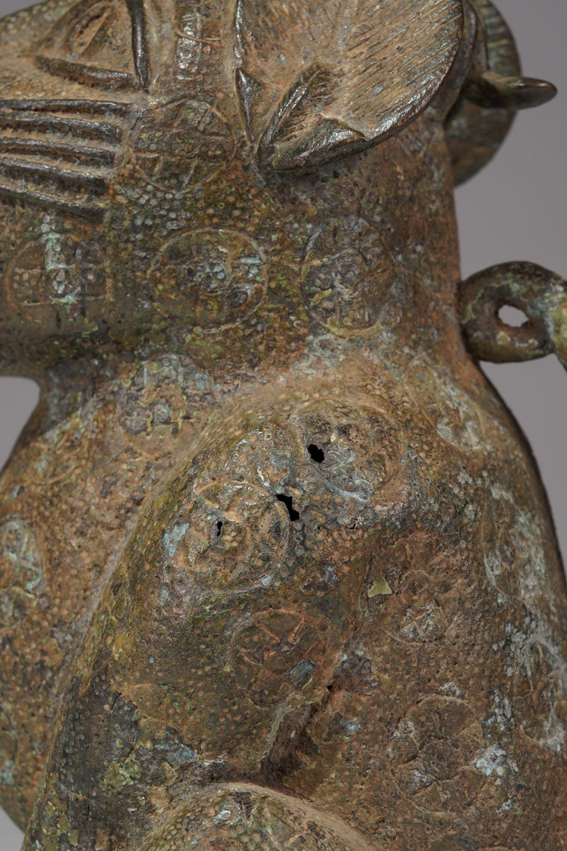 A seated bronze leopard, in the style of Benin, partly with greenish oxidised patina, Nigeria.
