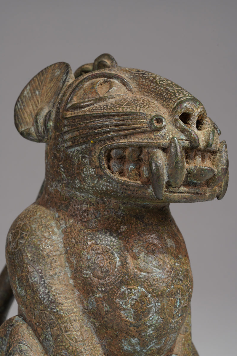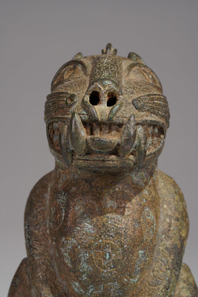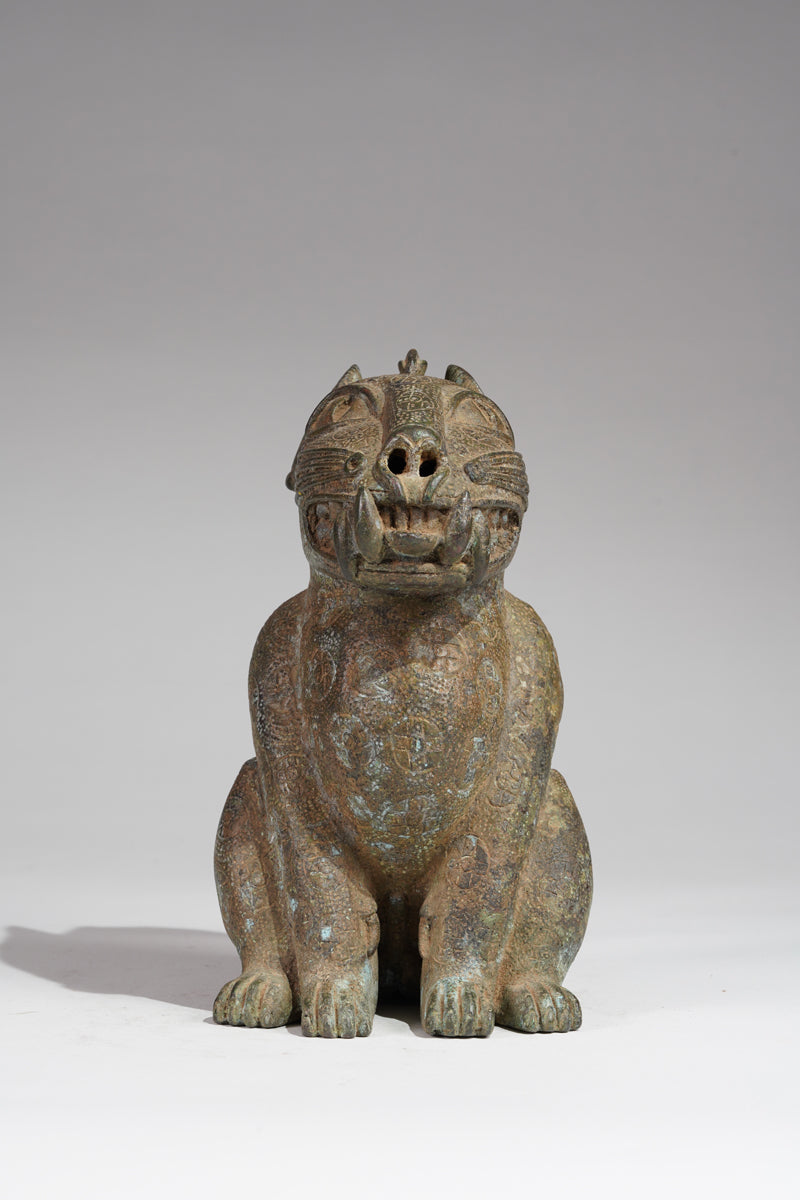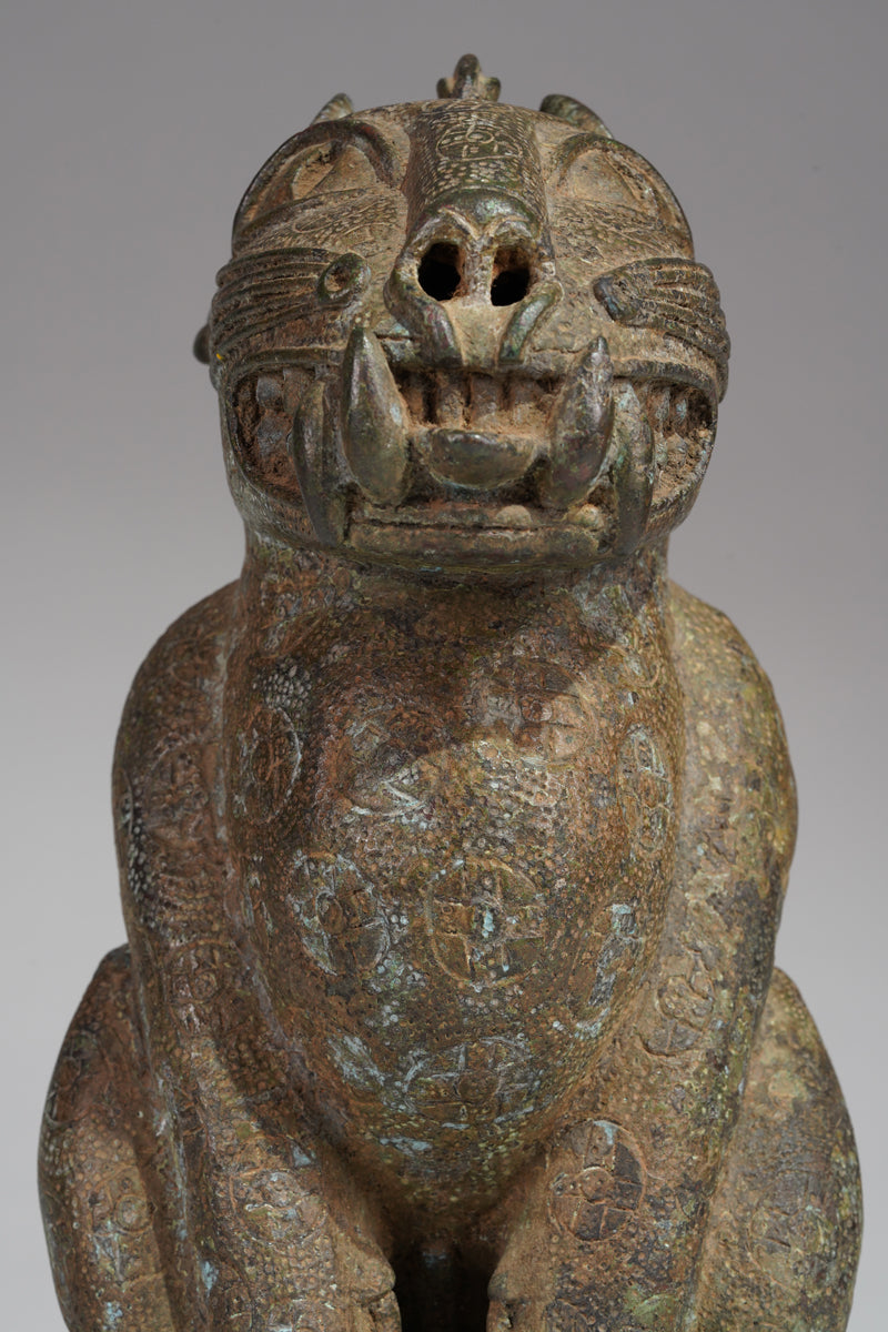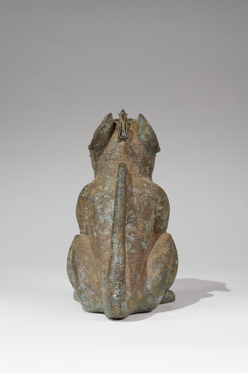 A seated bronze leopard, in the style of Benin, partly with greenish oxidised patina, Nigeria.