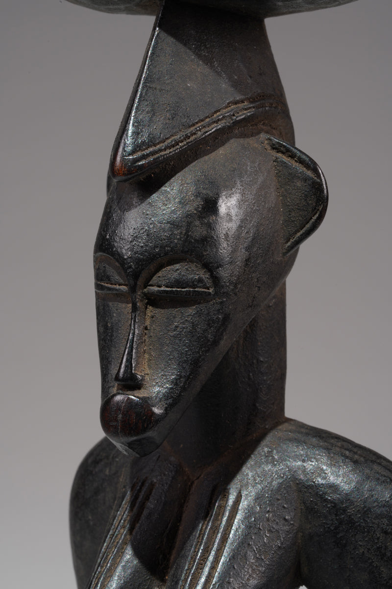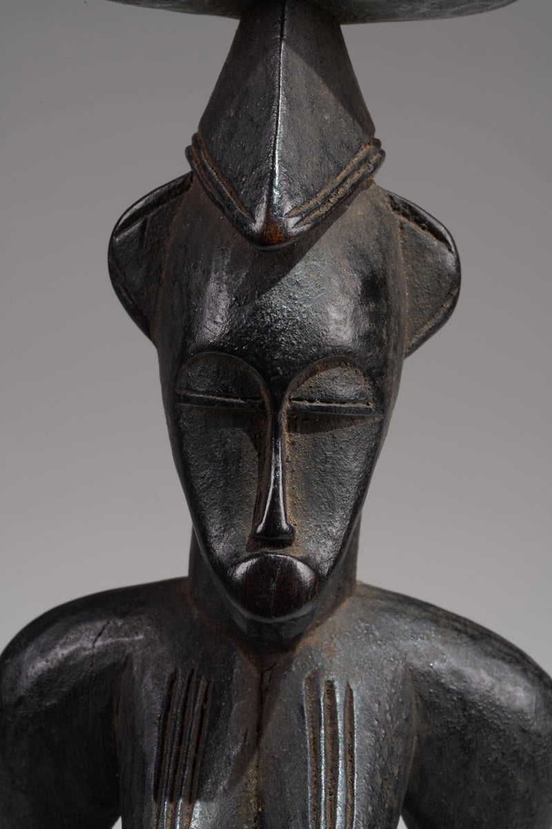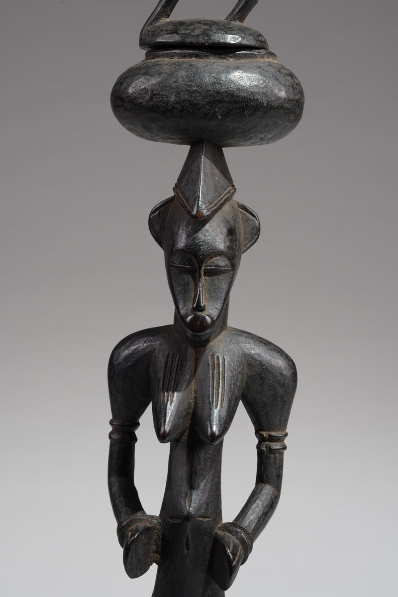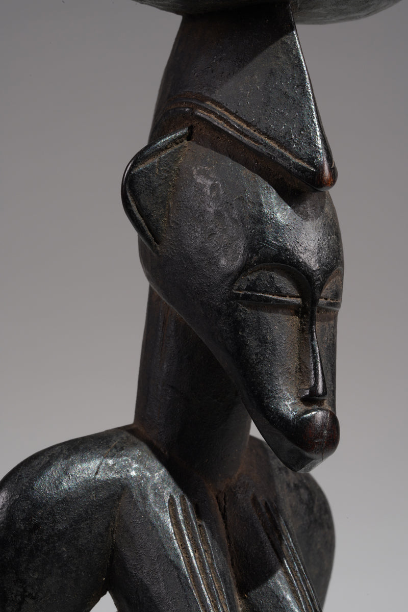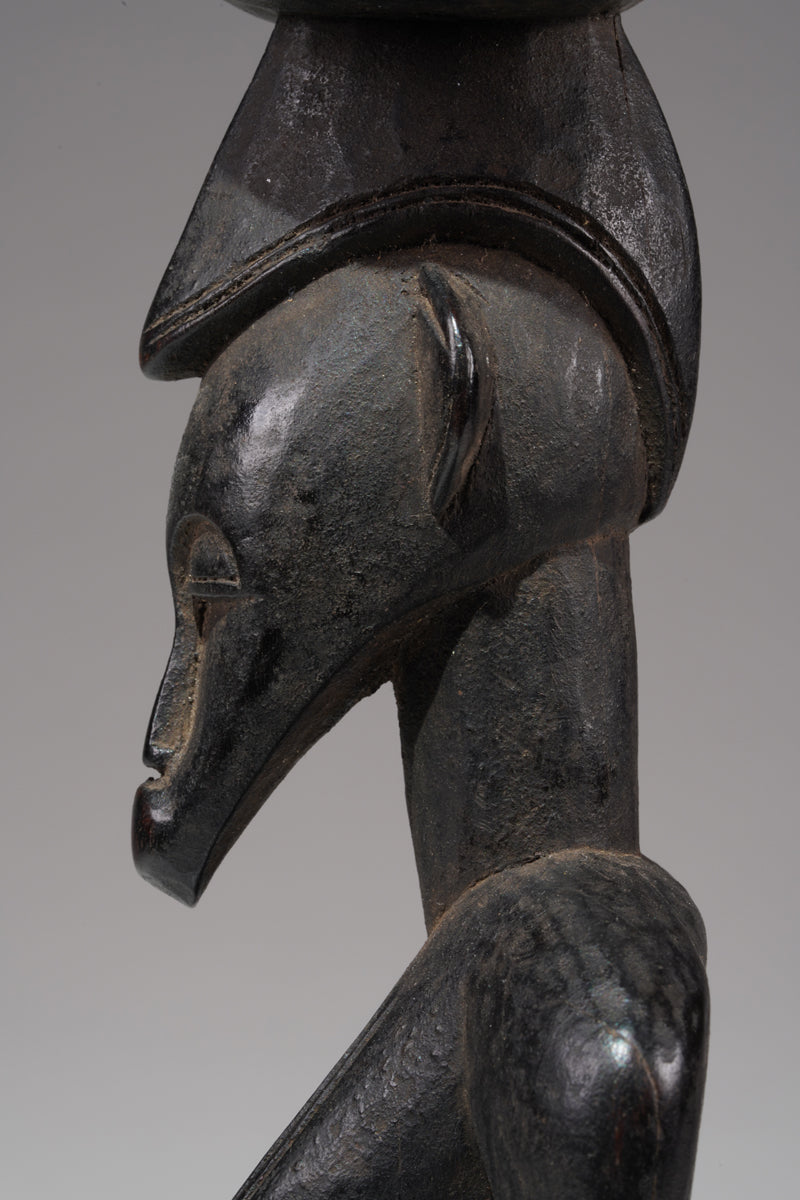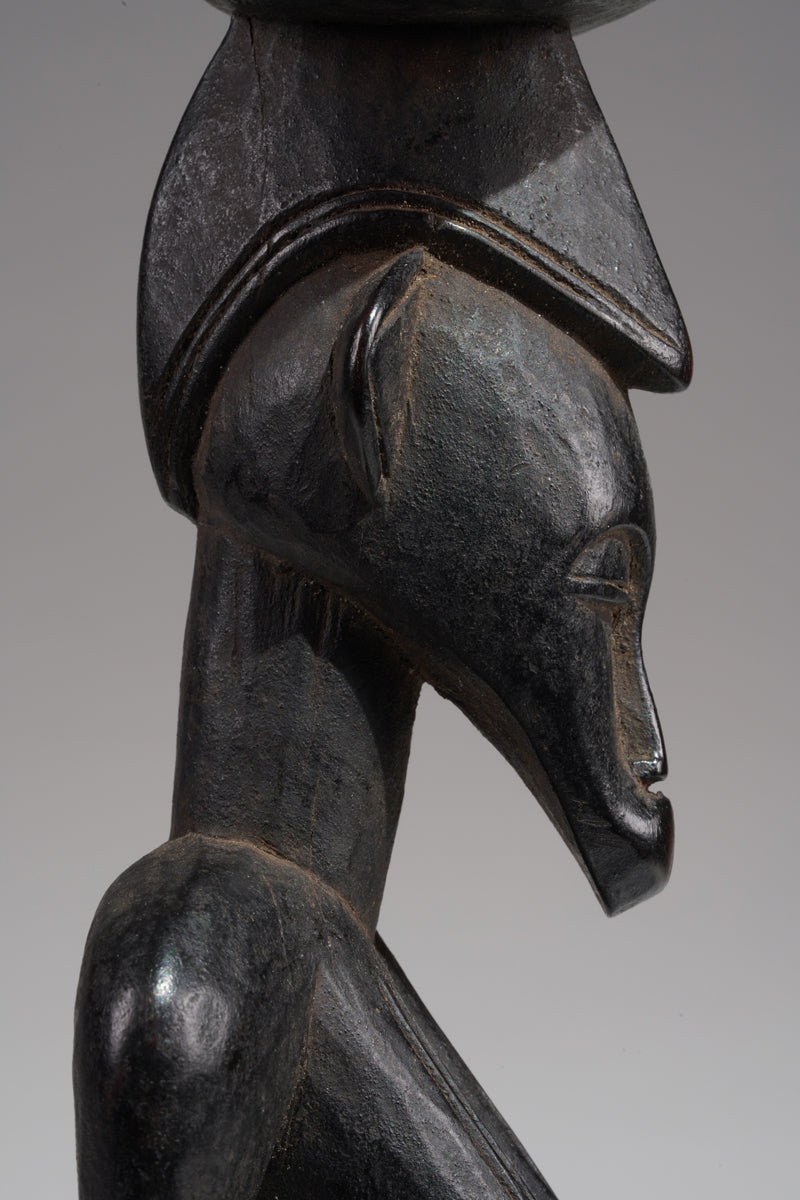 In Senufo society, bowlkeeper figures are believed to serve as intermediaries between the physical and spiritual realms. The bowls they carry are thought to hold offerings or sacred substances used in rituals associated with the Poro Society, a central institution governing initiation, education, and social order among the Senufo. These sculptures embody ideals of femininity, fertility, and the nurturing aspects of womanhood, reflecting the community's reverence for ancestral spirits and the natural world.