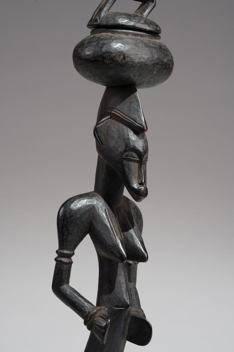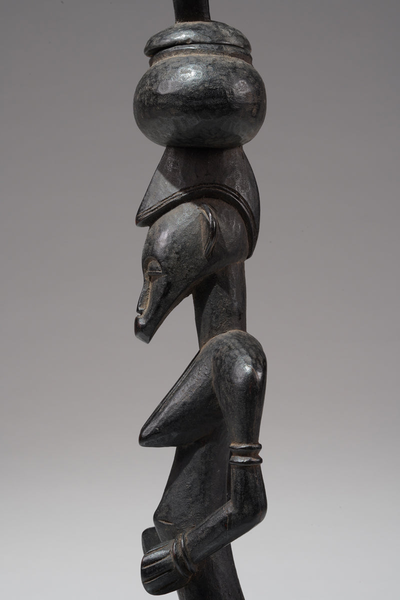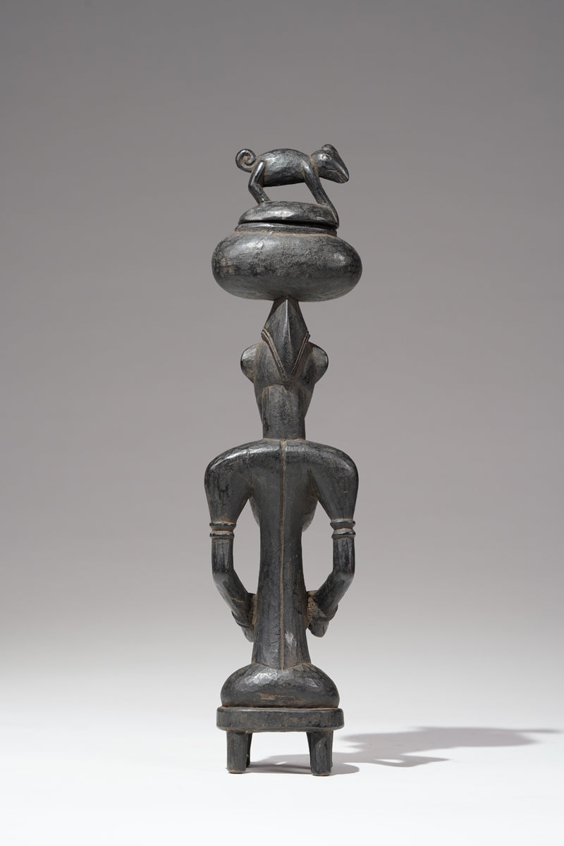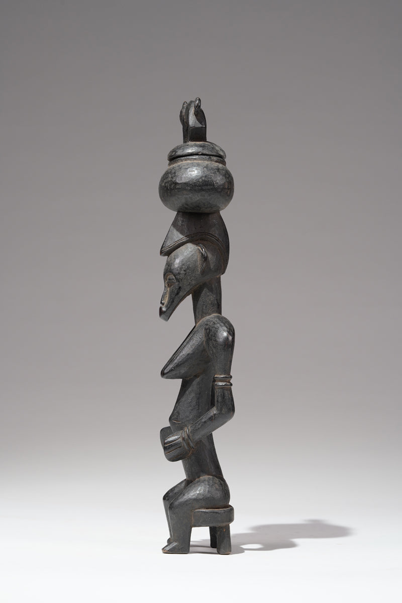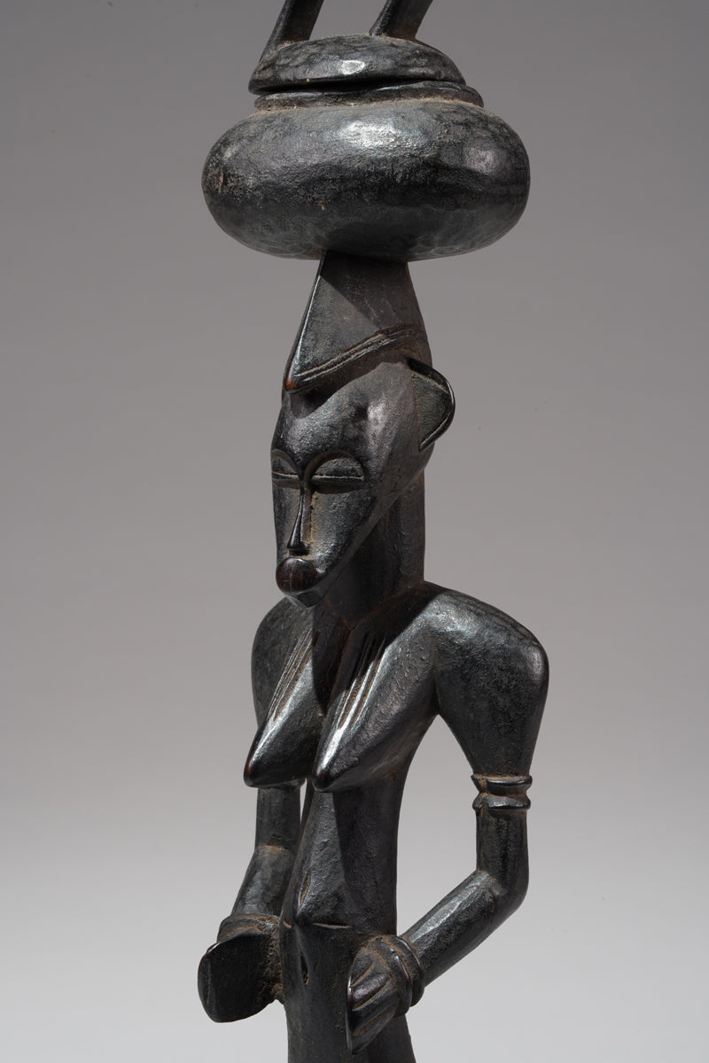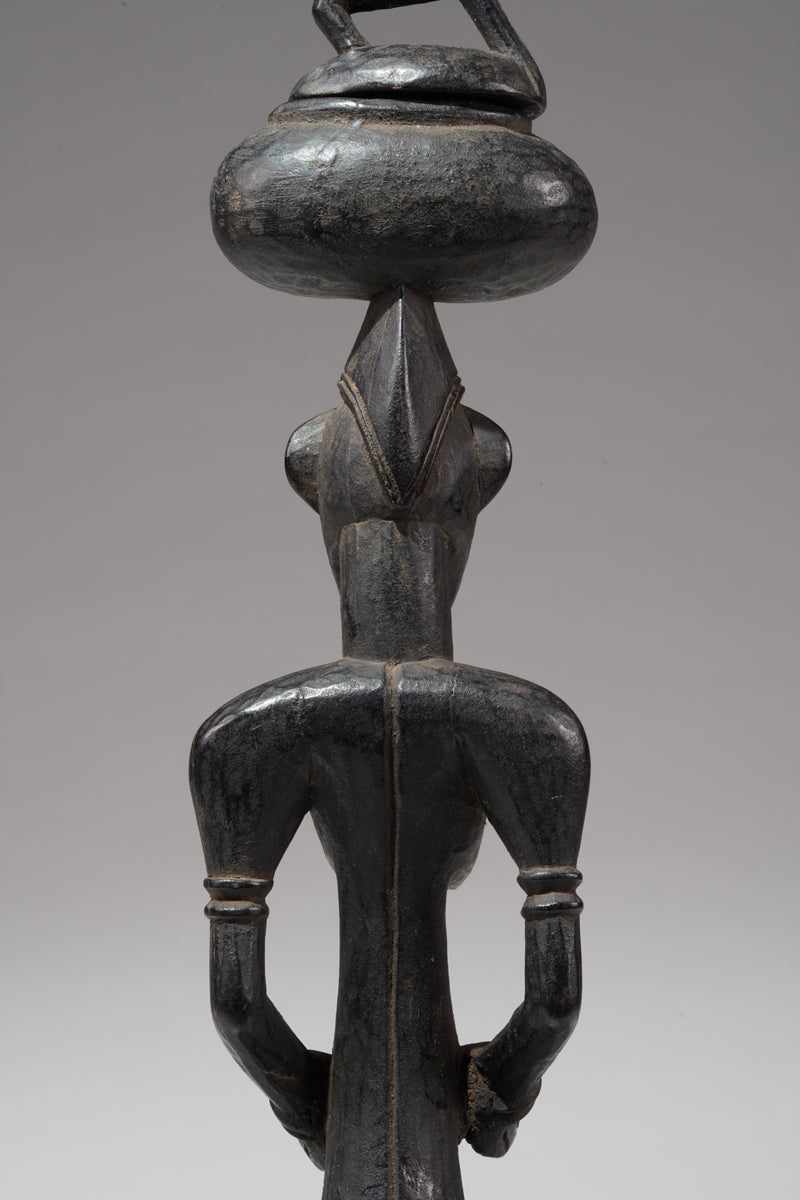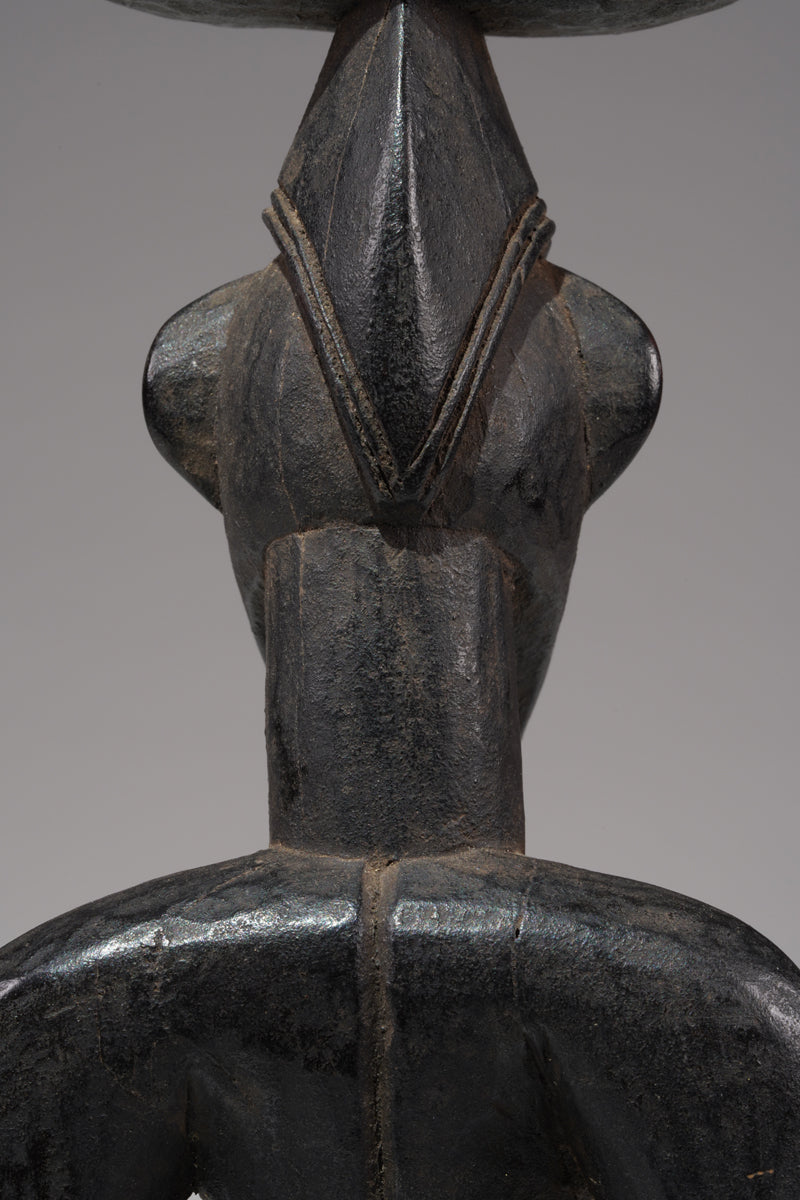 In Senufo society, bowlkeeper figures are believed to serve as intermediaries between the physical and spiritual realms. The bowls they carry are thought to hold offerings or sacred substances used in rituals associated with the Poro Society, a central institution governing initiation, education, and social order among the Senufo. These sculptures embody ideals of femininity, fertility, and the nurturing aspects of womanhood, reflecting the community's reverence for ancestral spirits and the natural world.