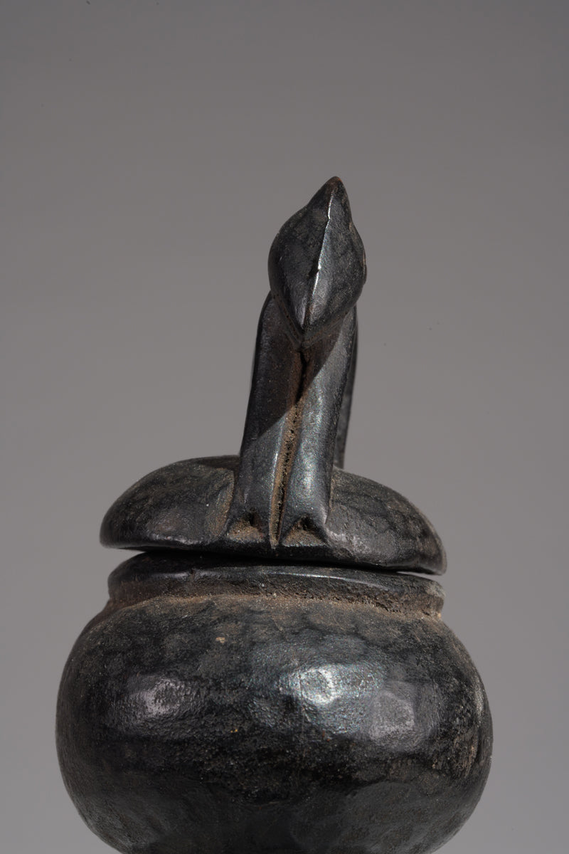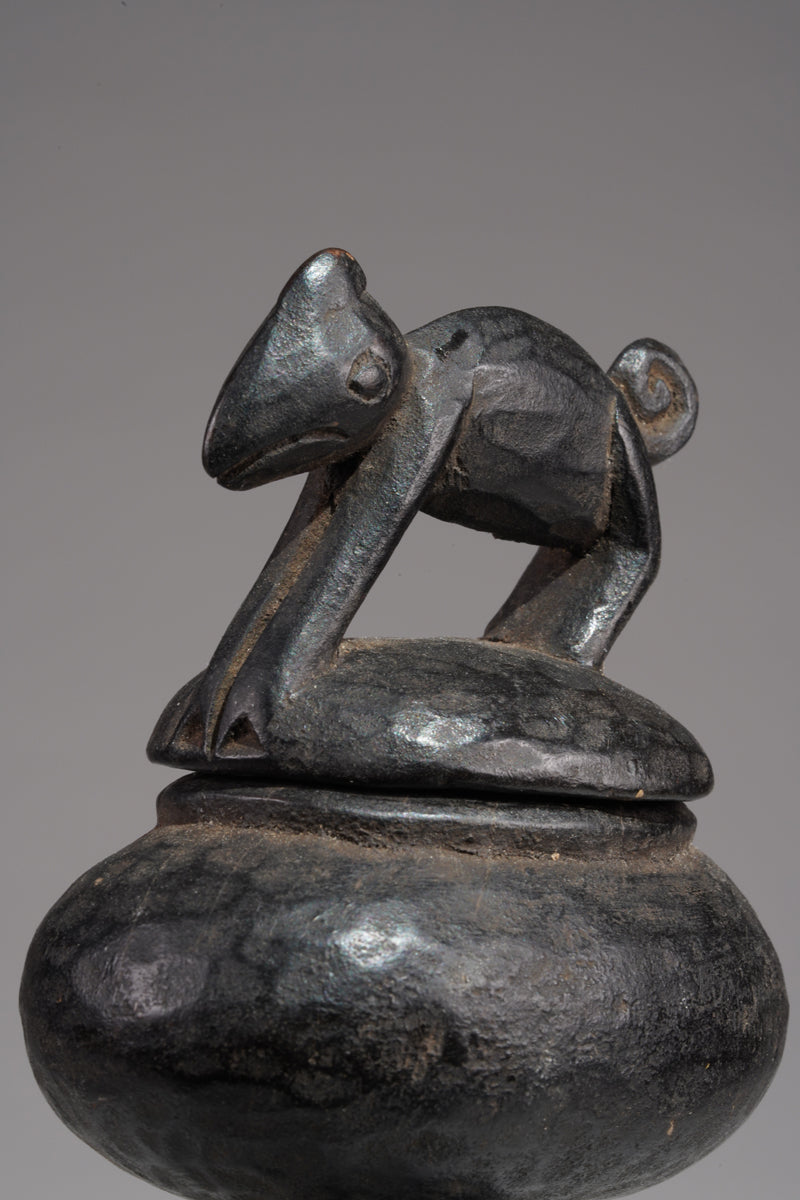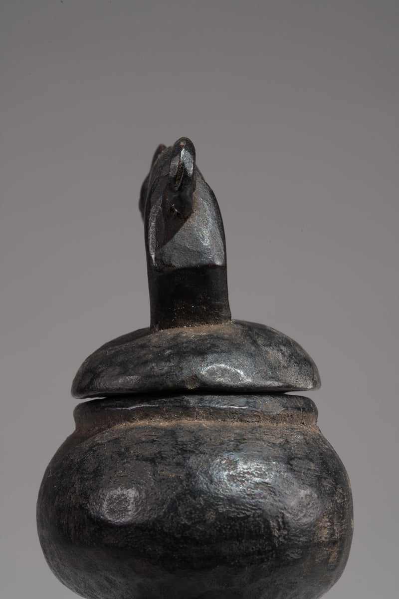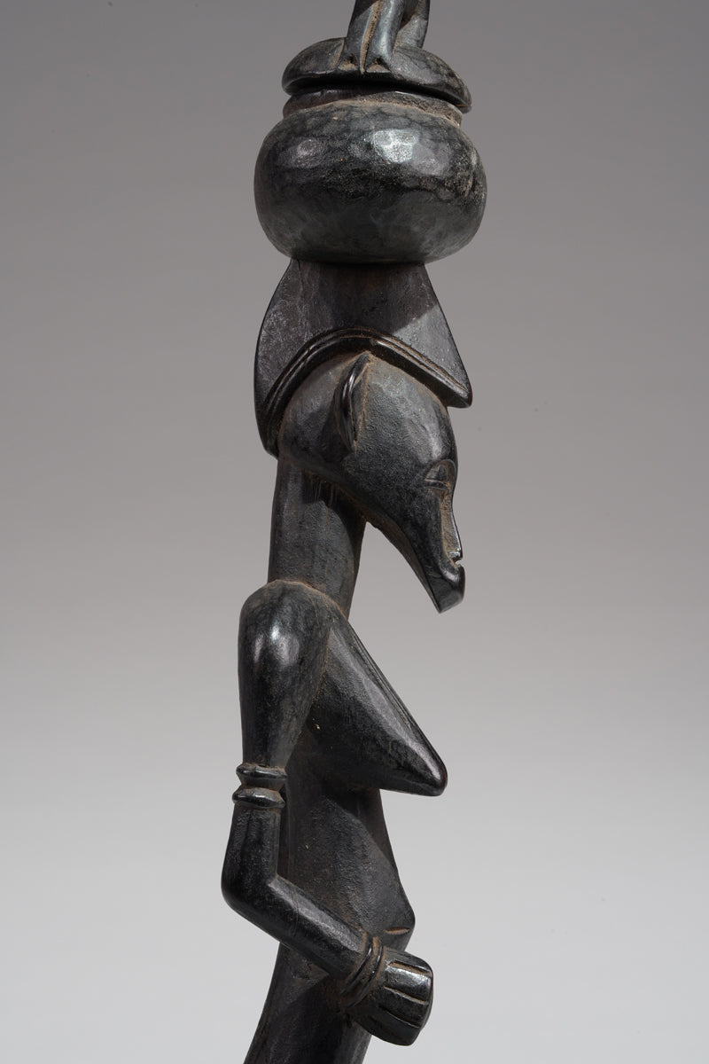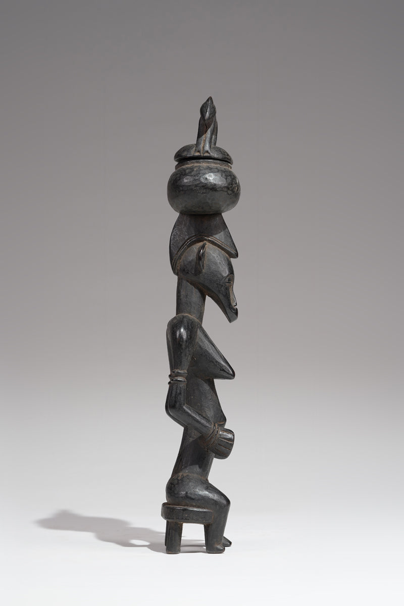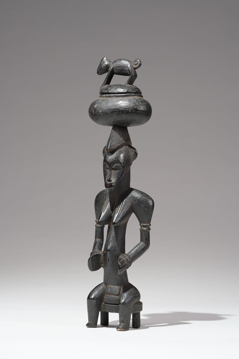 In Senufo society, bowlkeeper figures are believed to serve as intermediaries between the physical and spiritual realms. The bowls they carry are thought to hold offerings or sacred substances used in rituals associated with the Poro Society, a central institution governing initiation, education, and social order among the Senufo. These sculptures embody ideals of femininity, fertility, and the nurturing aspects of womanhood, reflecting the community's reverence for ancestral spirits and the natural world.