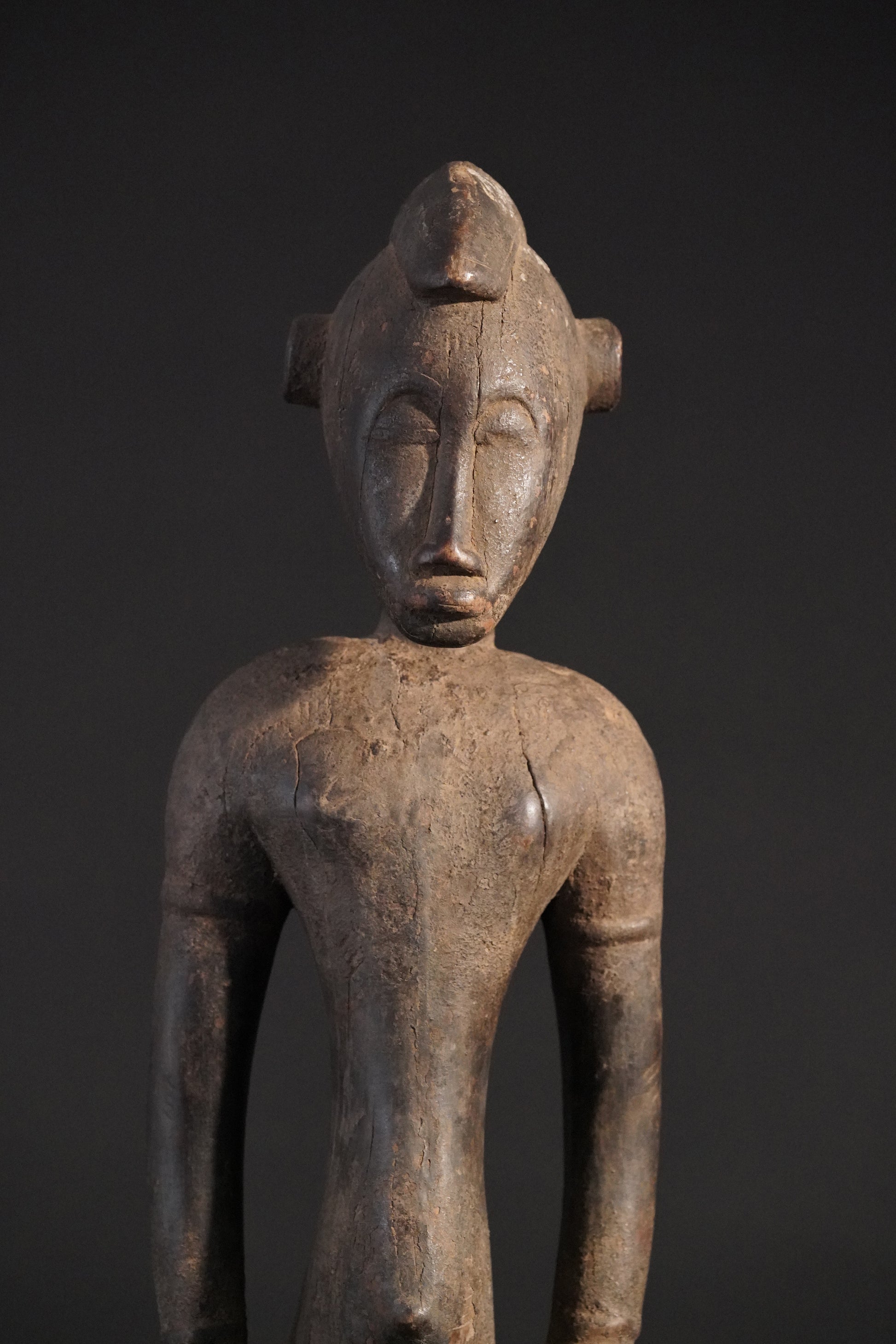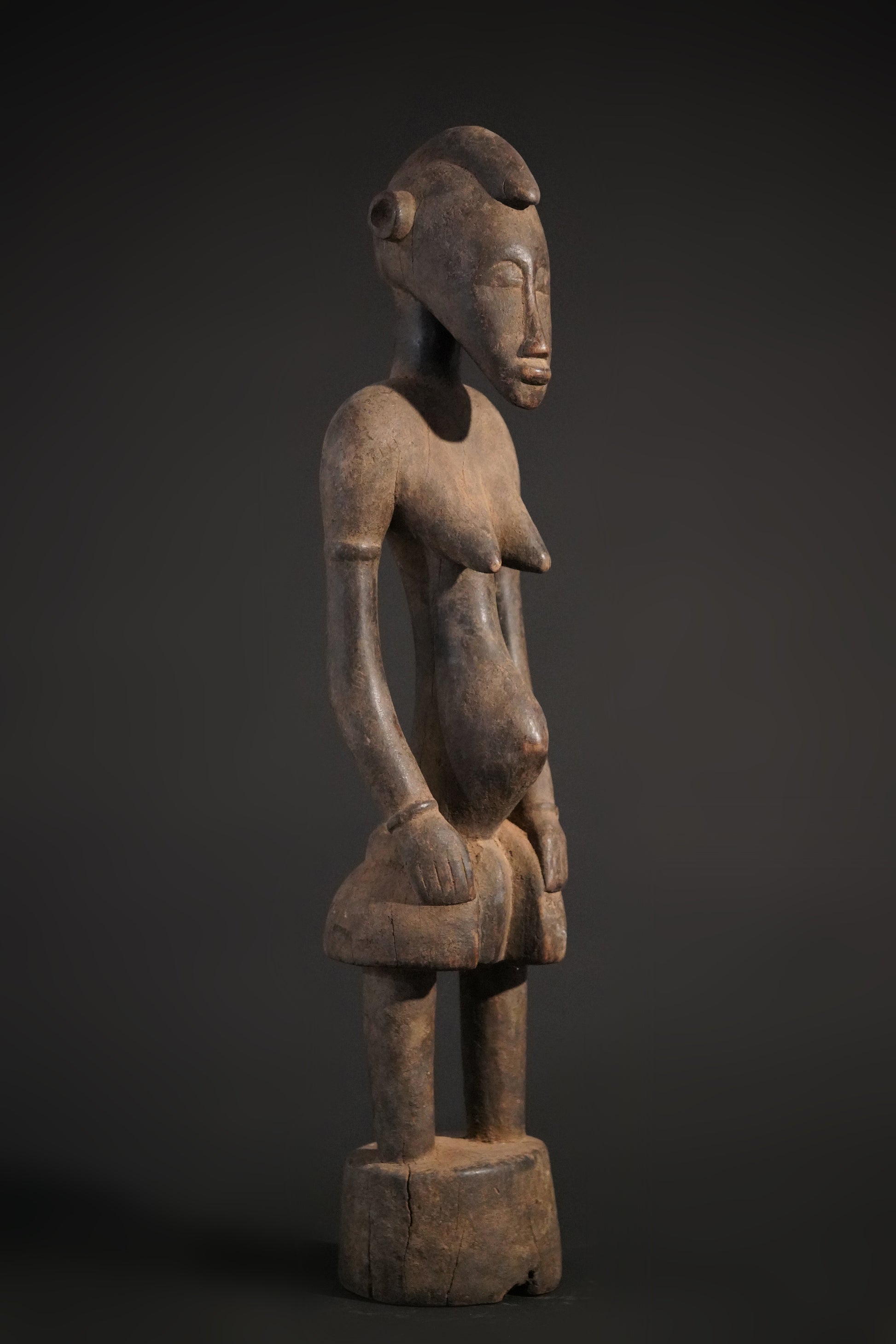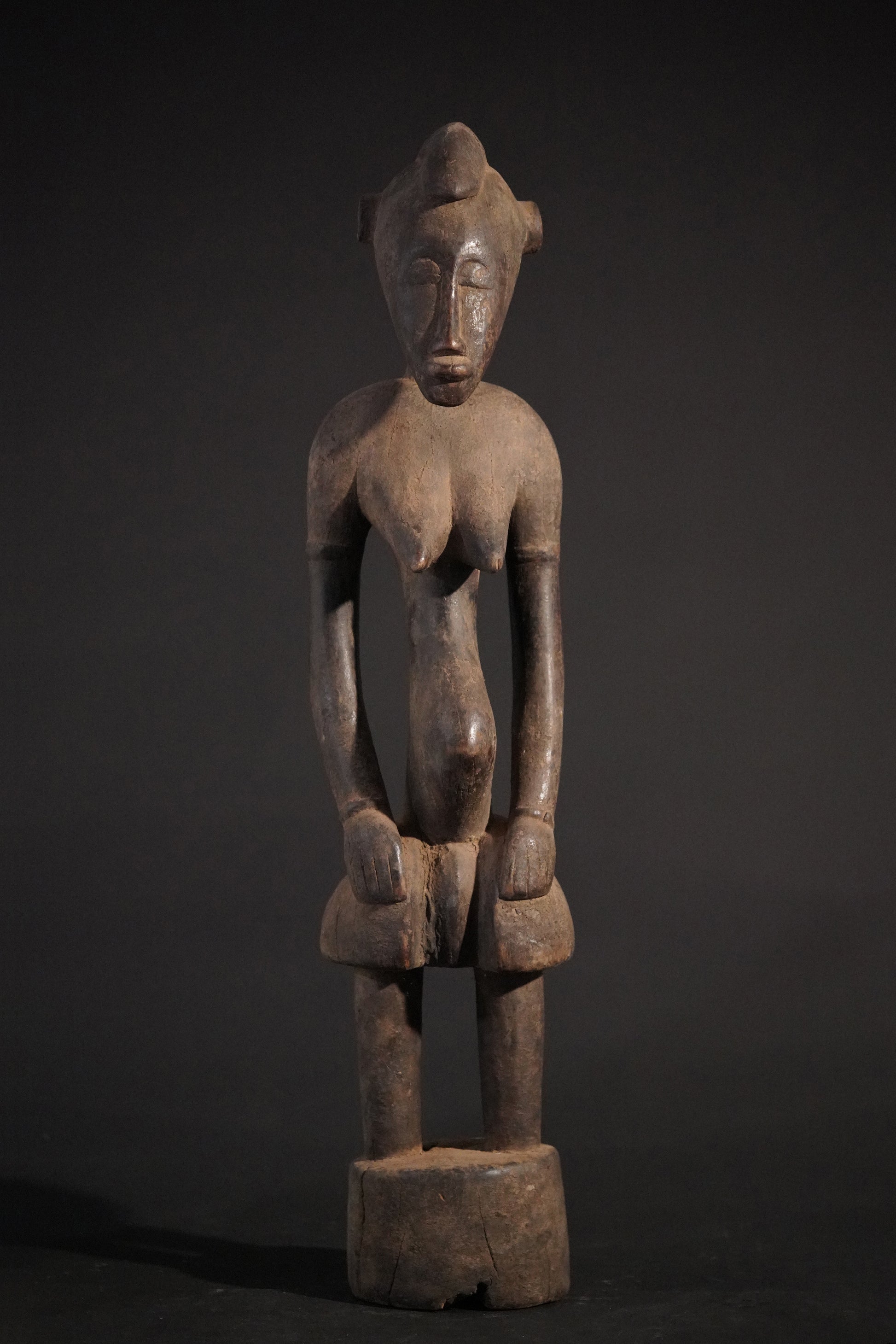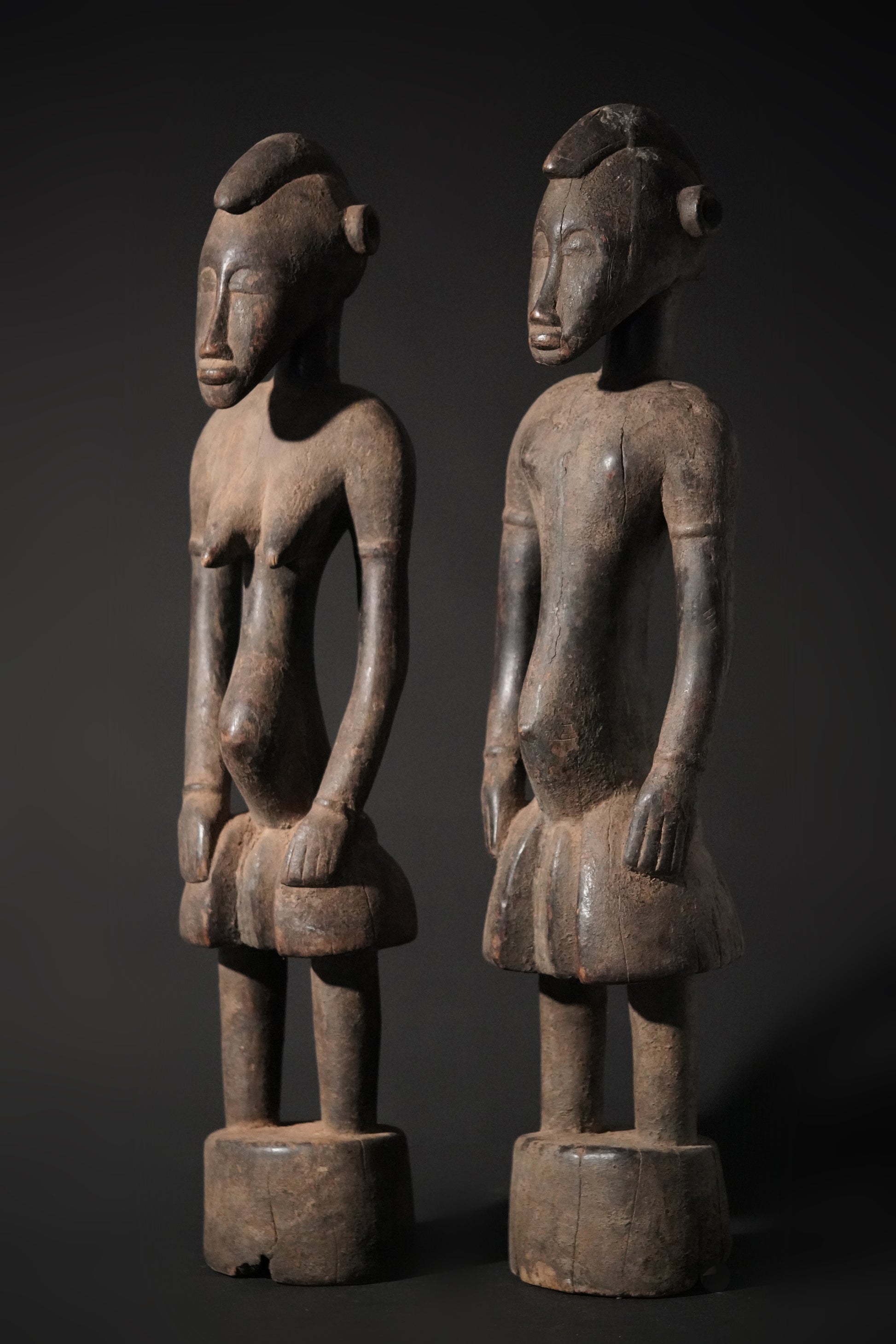 A Senufo couple, Ivory Coast, the legs uprising from a cylindrical base, each figure is wearing a short skirt, the female sculpture has sagging breasts, both have pointed navels and rounded shoulders leading to slightly angled arms, the hands resting on the skirt, both wearing one armlet on each upper arm and one bracelet on each wrist, a cylindrical neck supporting an oval head with a forward-projecting chin and a protruding mouth, an elongated nose with a broad tip, deep cut brows, the closed eyes are crescent-shaped, the ears are worked as circles, sitting far back, the head surmounted with an Iroquois-like hair cut; heavy dark brown wood, aged patina, several age cracks, a touch patina especially on the face, neck and upper arms.