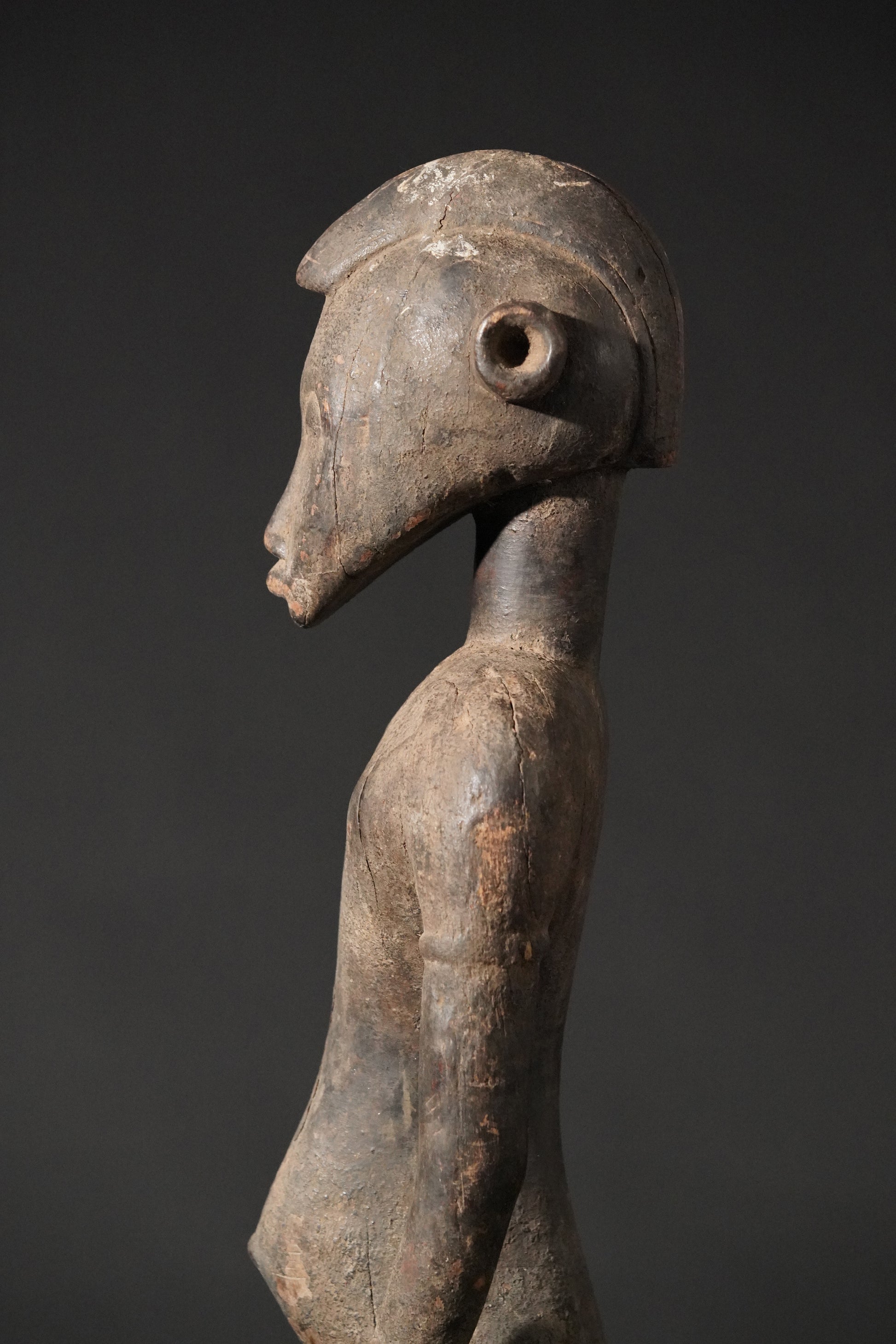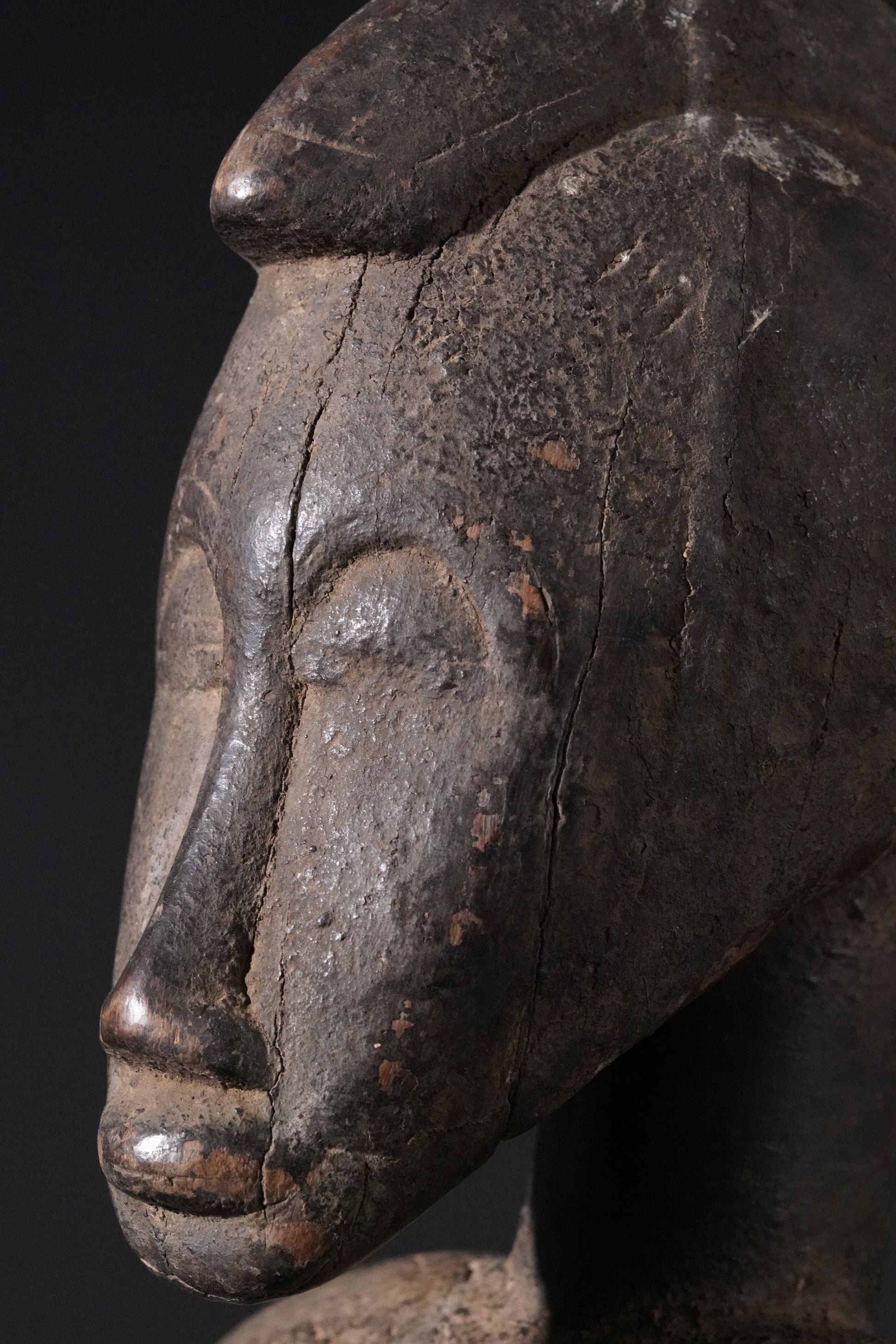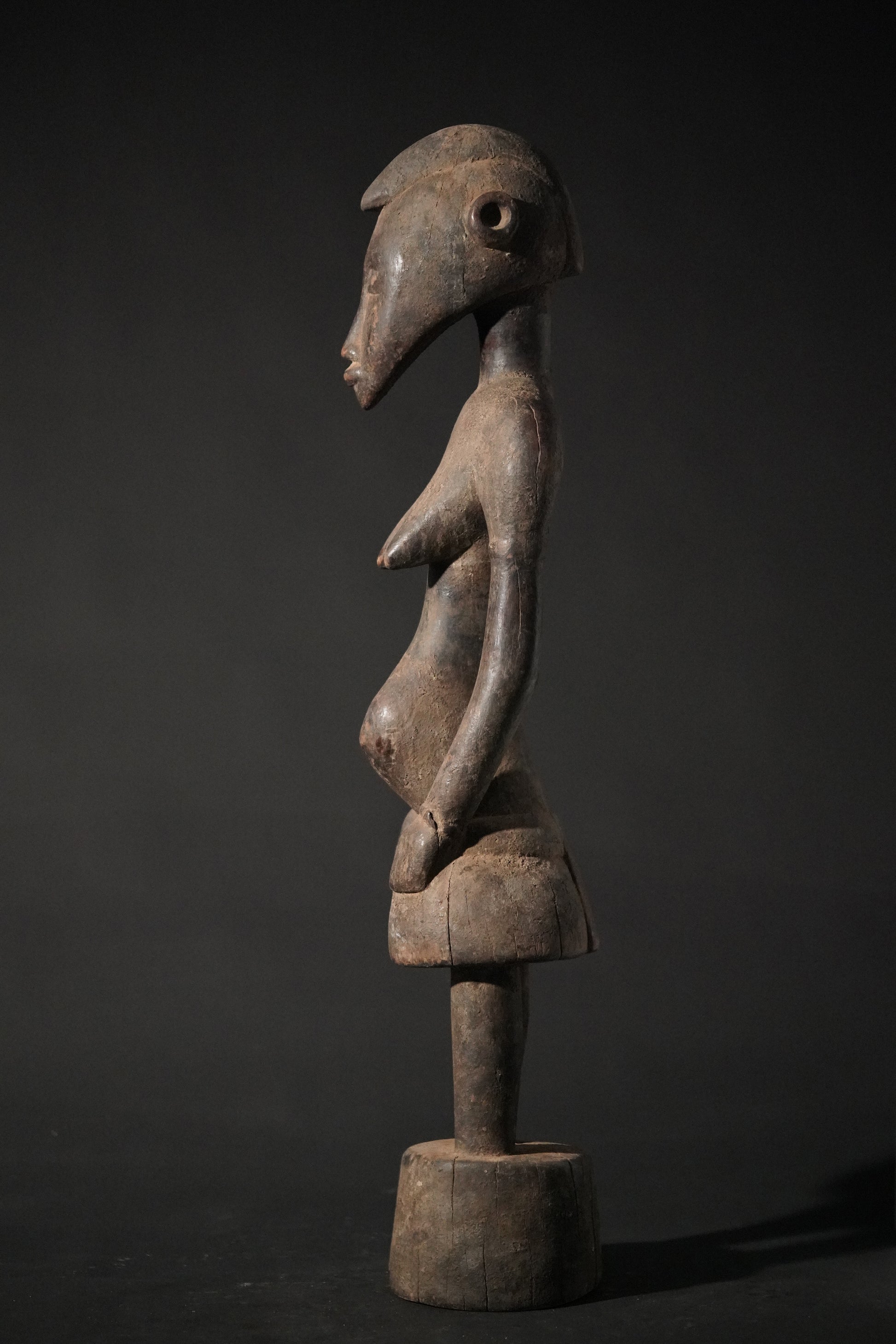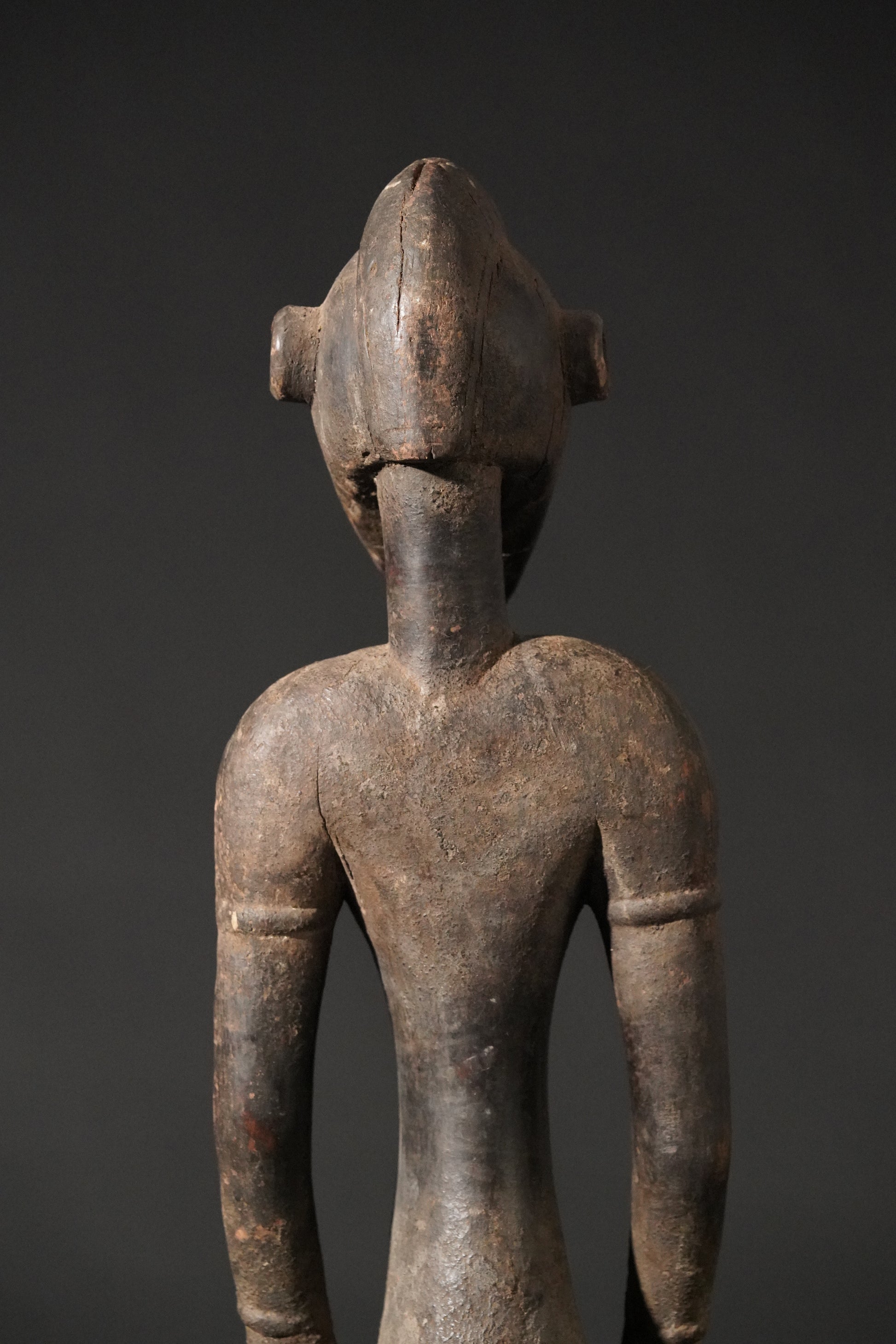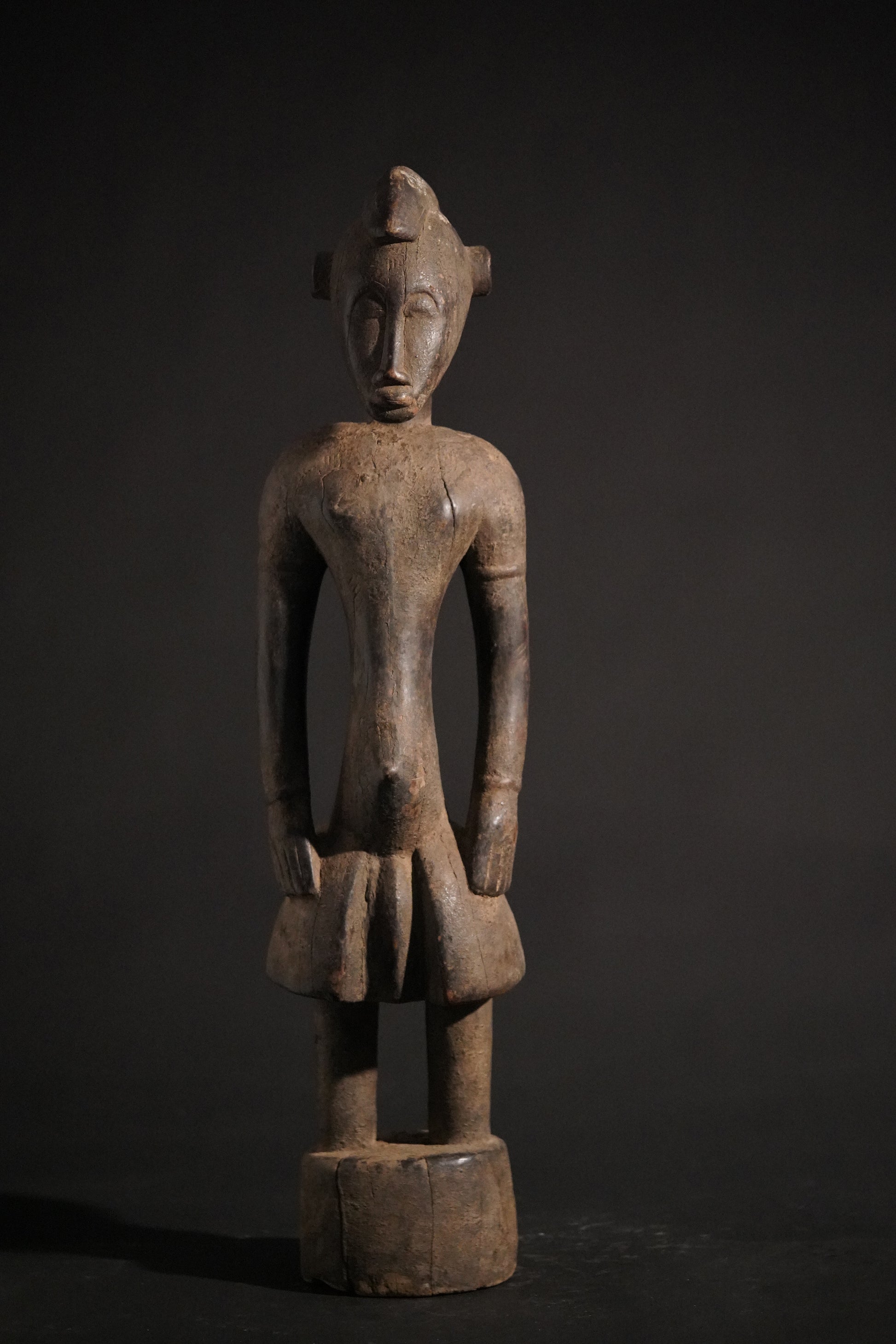 A Senufo couple, Ivory Coast, the legs uprising from a cylindrical base, each figure is wearing a short skirt, the female sculpture has sagging breasts, both have pointed navels and rounded shoulders leading to slightly angled arms, the hands resting on the skirt, both wearing one armlet on each upper arm and one bracelet on each wrist, a cylindrical neck supporting an oval head with a forward-projecting chin and a protruding mouth, an elongated nose with a broad tip, deep cut brows, the closed eyes are crescent-shaped, the ears are worked as circles, sitting far back, the head surmounted with an Iroquois-like hair cut; heavy dark brown wood, aged patina, several age cracks, a touch patina especially on the face, neck and upper arms.