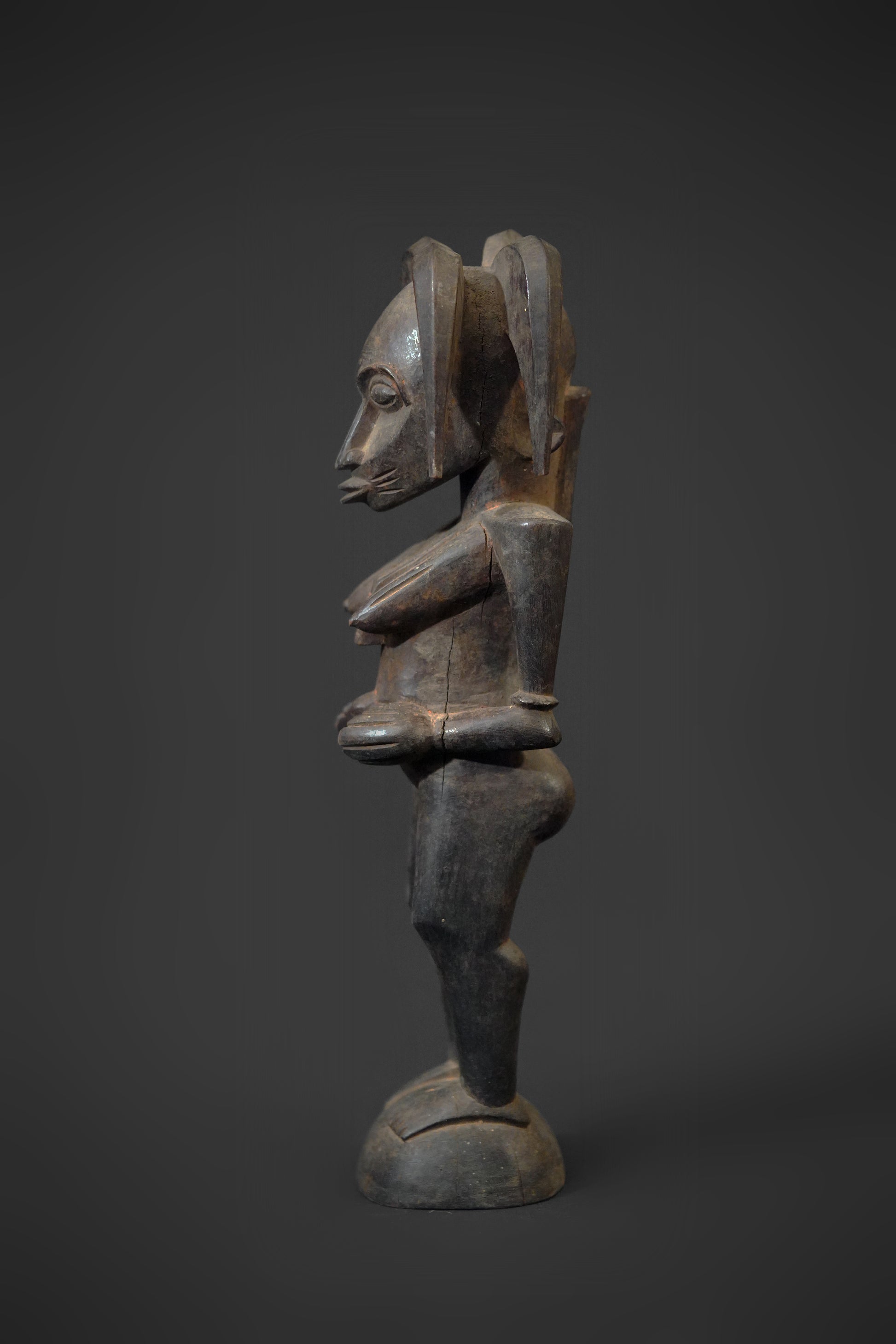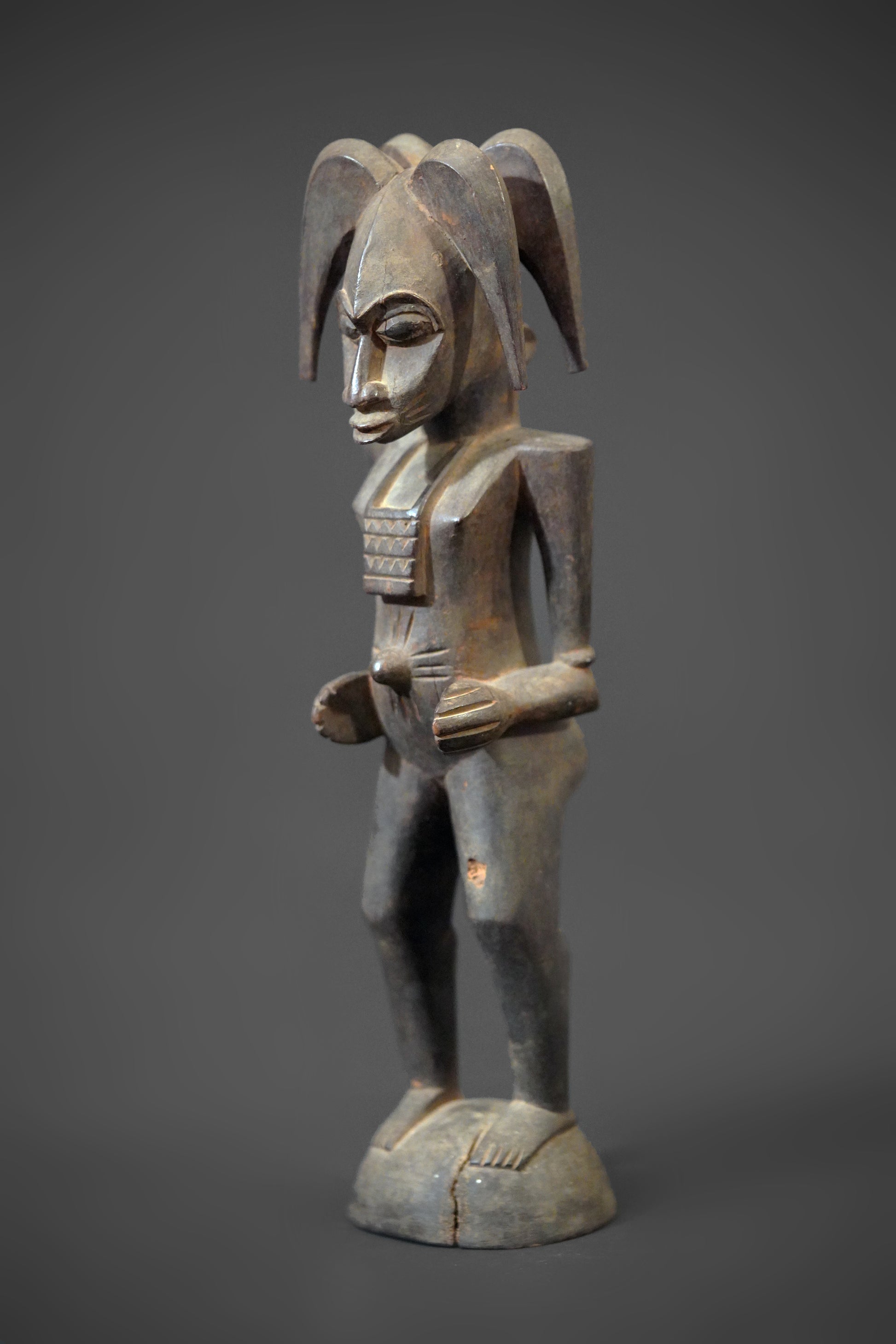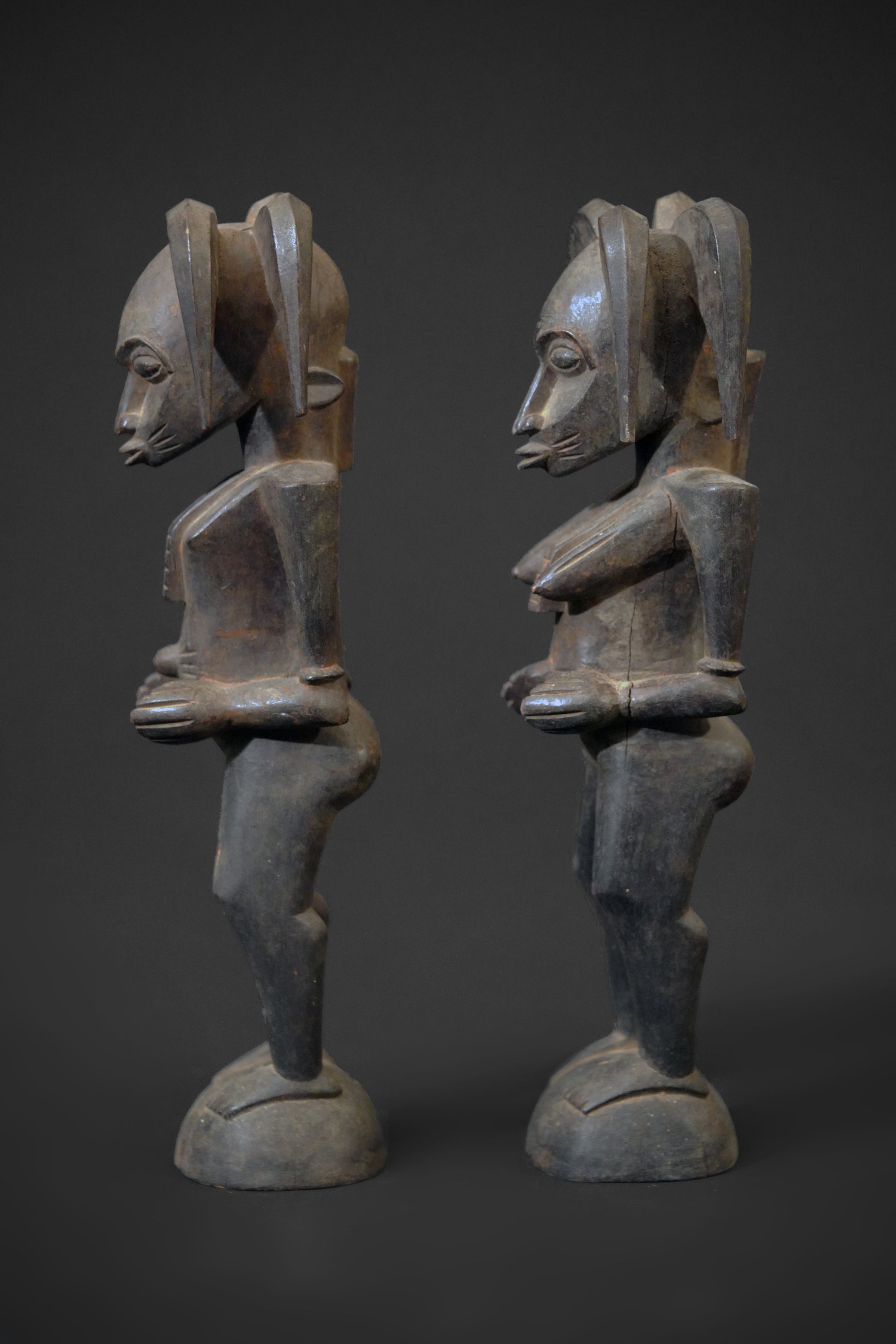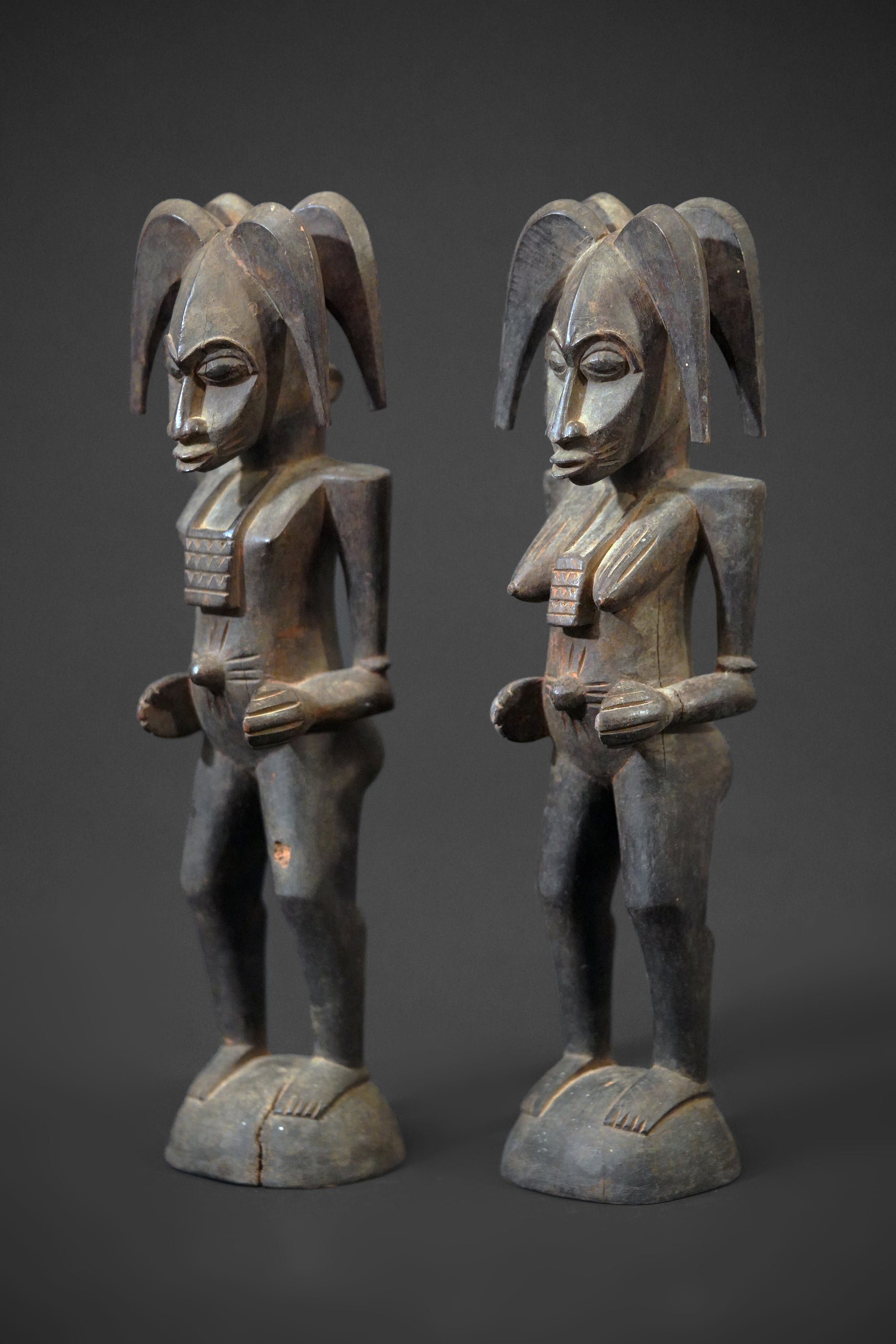 Each figure standing on a semicircular base, flat feet, well-formed legs, a pointed navel with scarifications, square shoulders, arms bent with bangles above the elbow and hands stretched out to the front, the breasts of the female statue are long and pointed decorated with scarifications, both statues wear an amulet, the mouth is protruding and slightly open, the nose long and broad at the tip, the almond-shaped eyes arched by long brows which are connected in the middle, the coiffure in four long braids and a small one hangs down the neck; dark brown patina, a few small age cracks on both statues, the base of the male statue has a little bit wider crack in the front and on the left leg is an insect damage, otherwise in fine condition.
