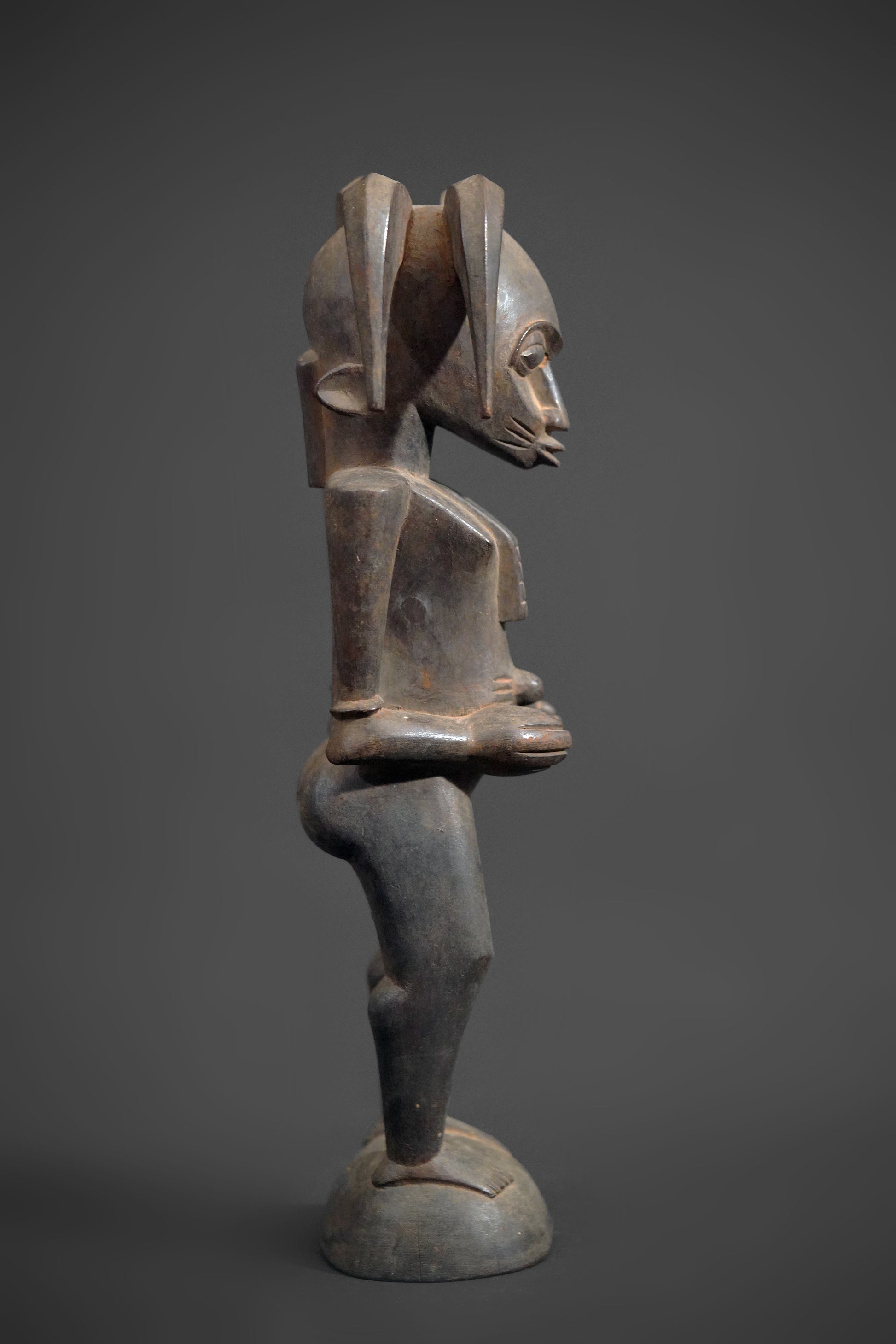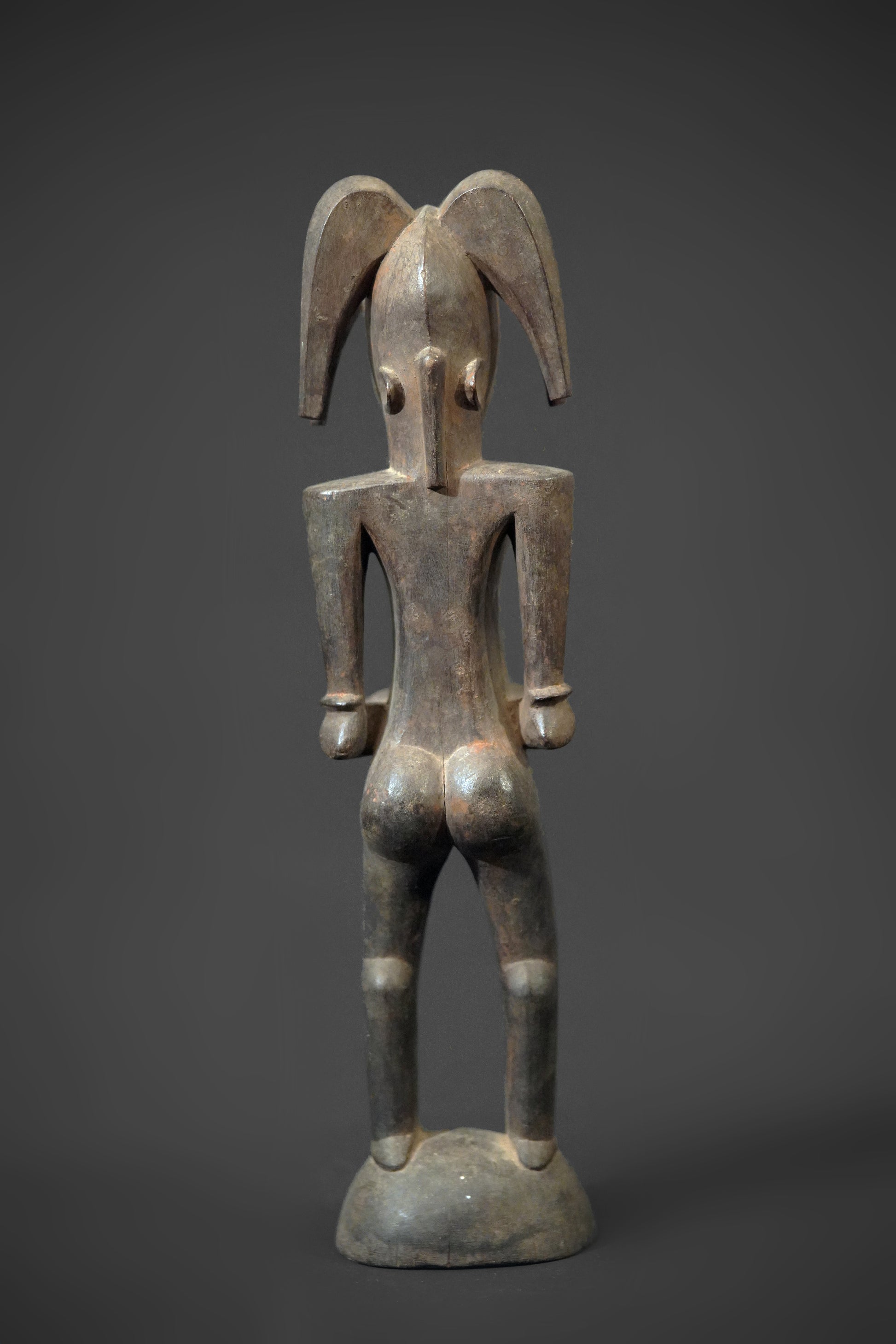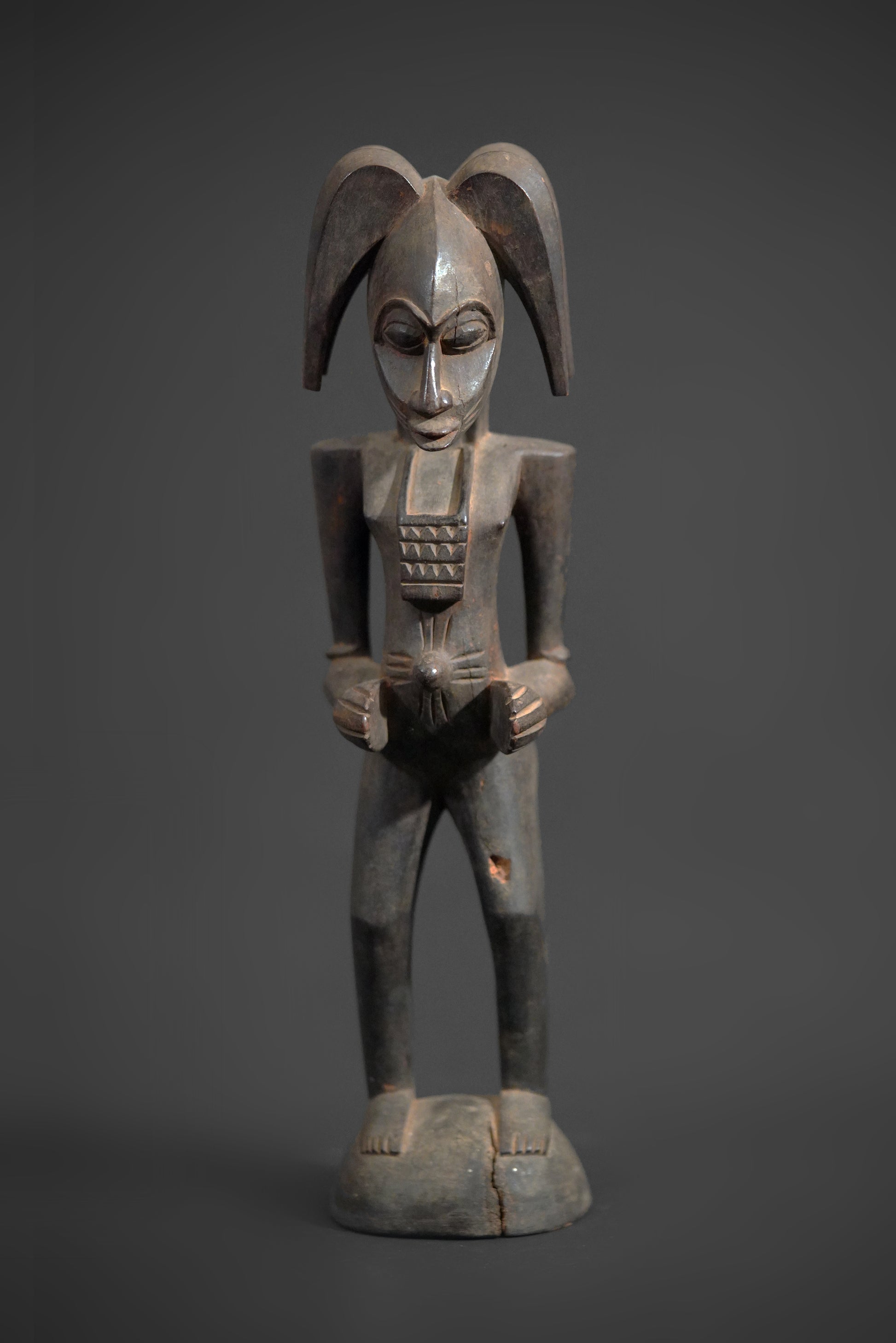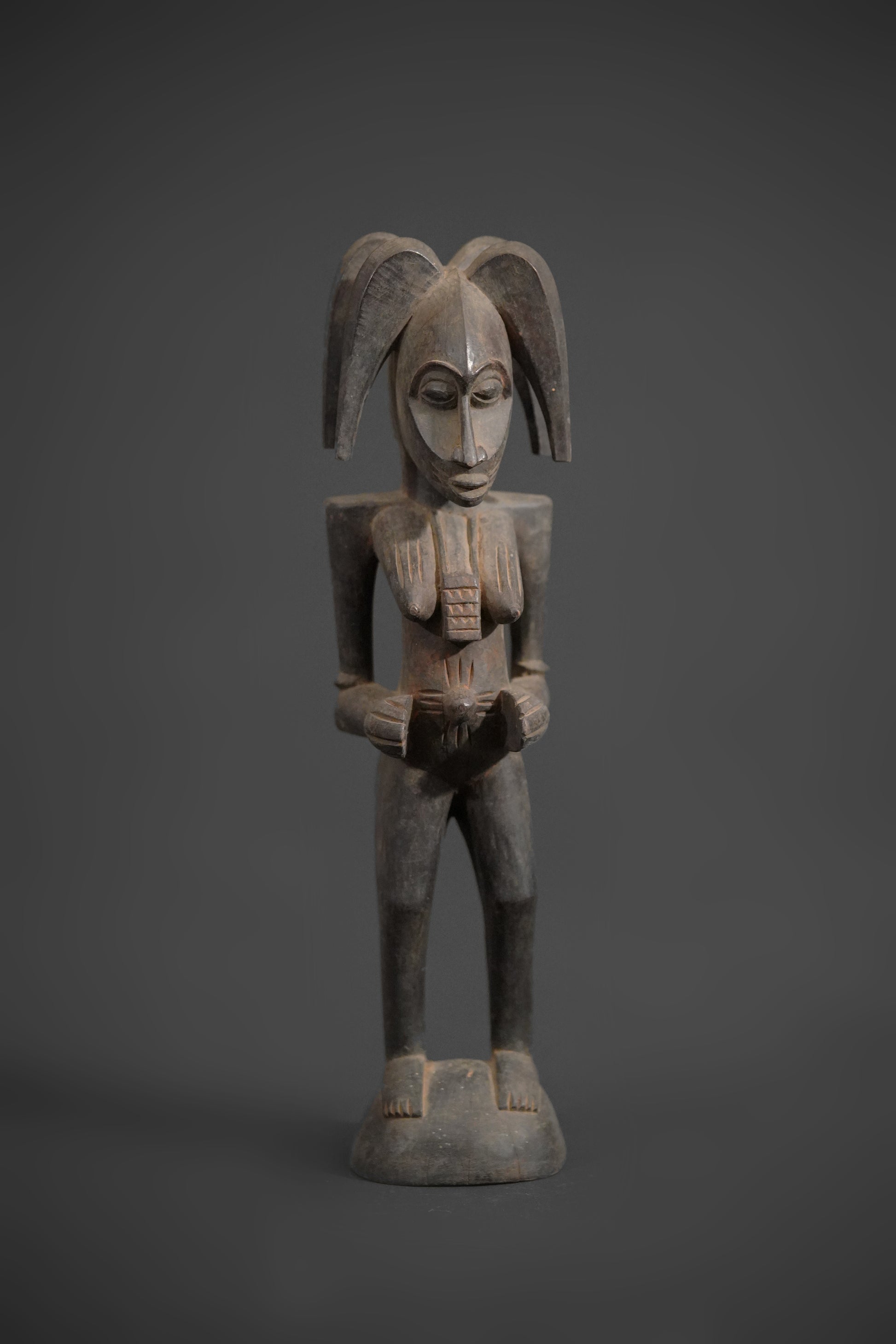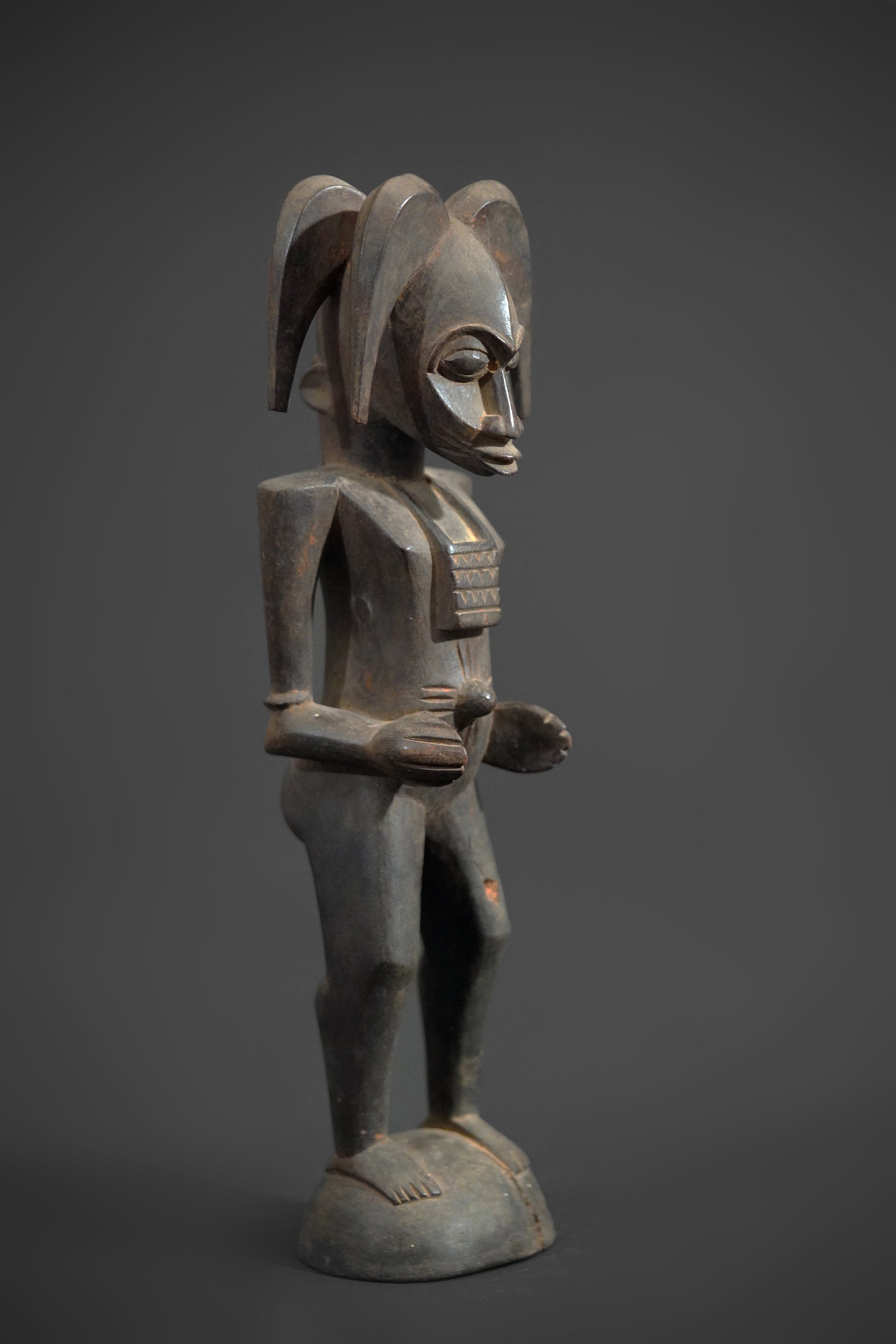 Each figure standing on a semicircular base, flat feet, well-formed legs, a pointed navel with scarifications, square shoulders, arms bent with bangles above the elbow and hands stretched out to the front, the breasts of the female statue are long and pointed decorated with scarifications, both statues wear an amulet, the mouth is protruding and slightly open, the nose long and broad at the tip, the almond-shaped eyes arched by long brows which are connected in the middle, the coiffure in four long braids and a small one hangs down the neck; dark brown patina, a few small age cracks on both statues, the base of the male statue has a little bit wider crack in the front and on the left leg is an insect damage, otherwise in fine condition.