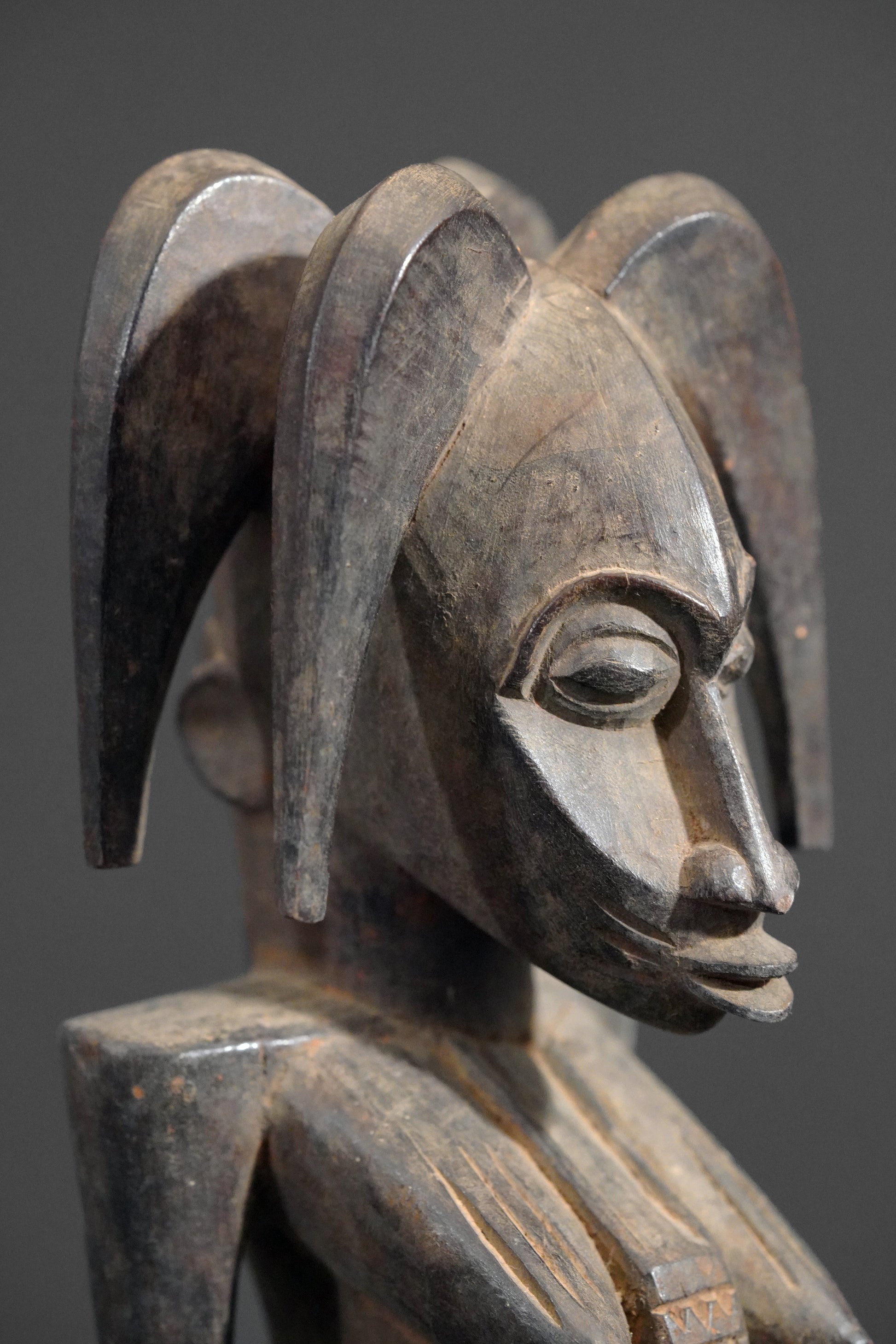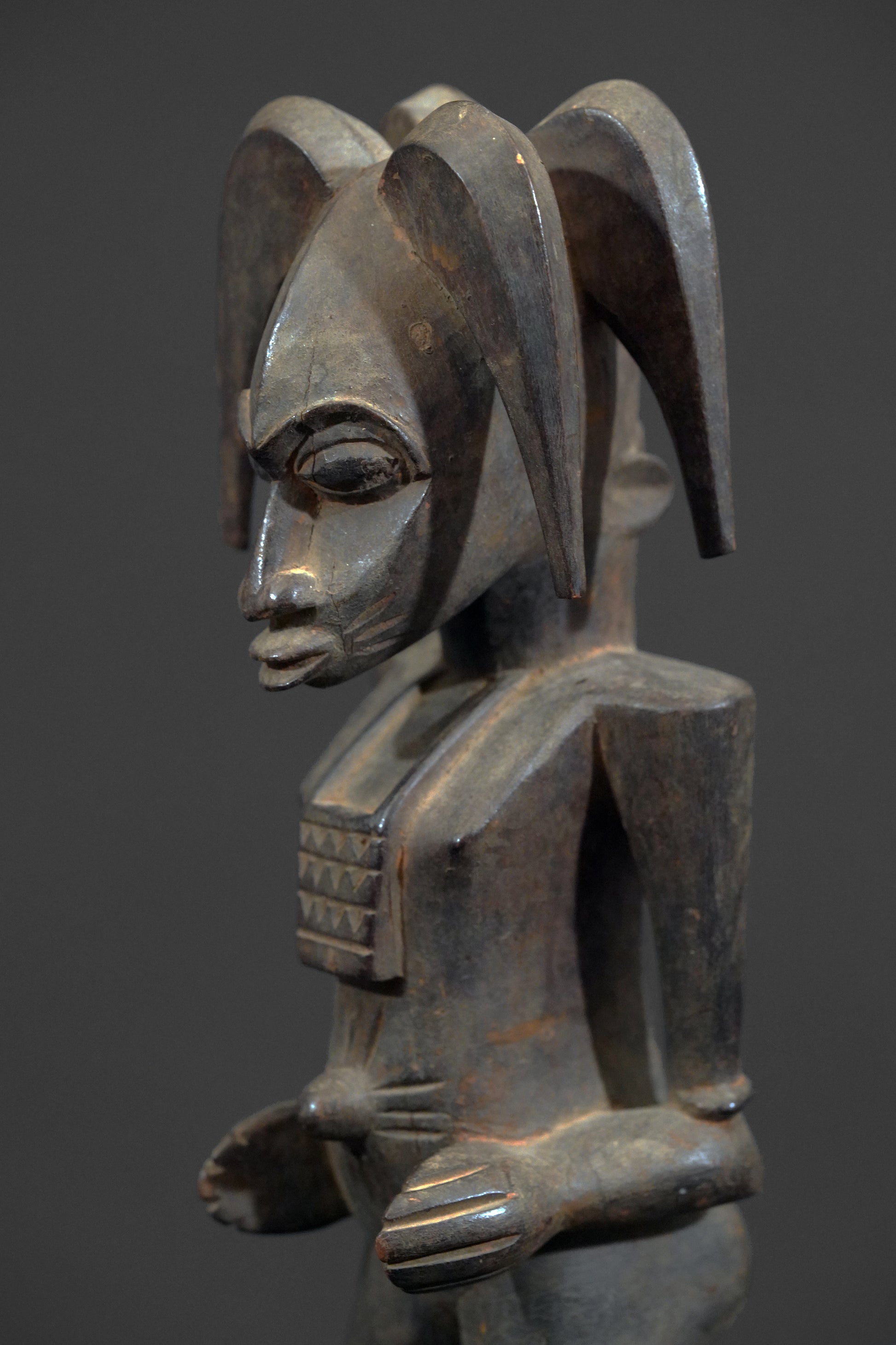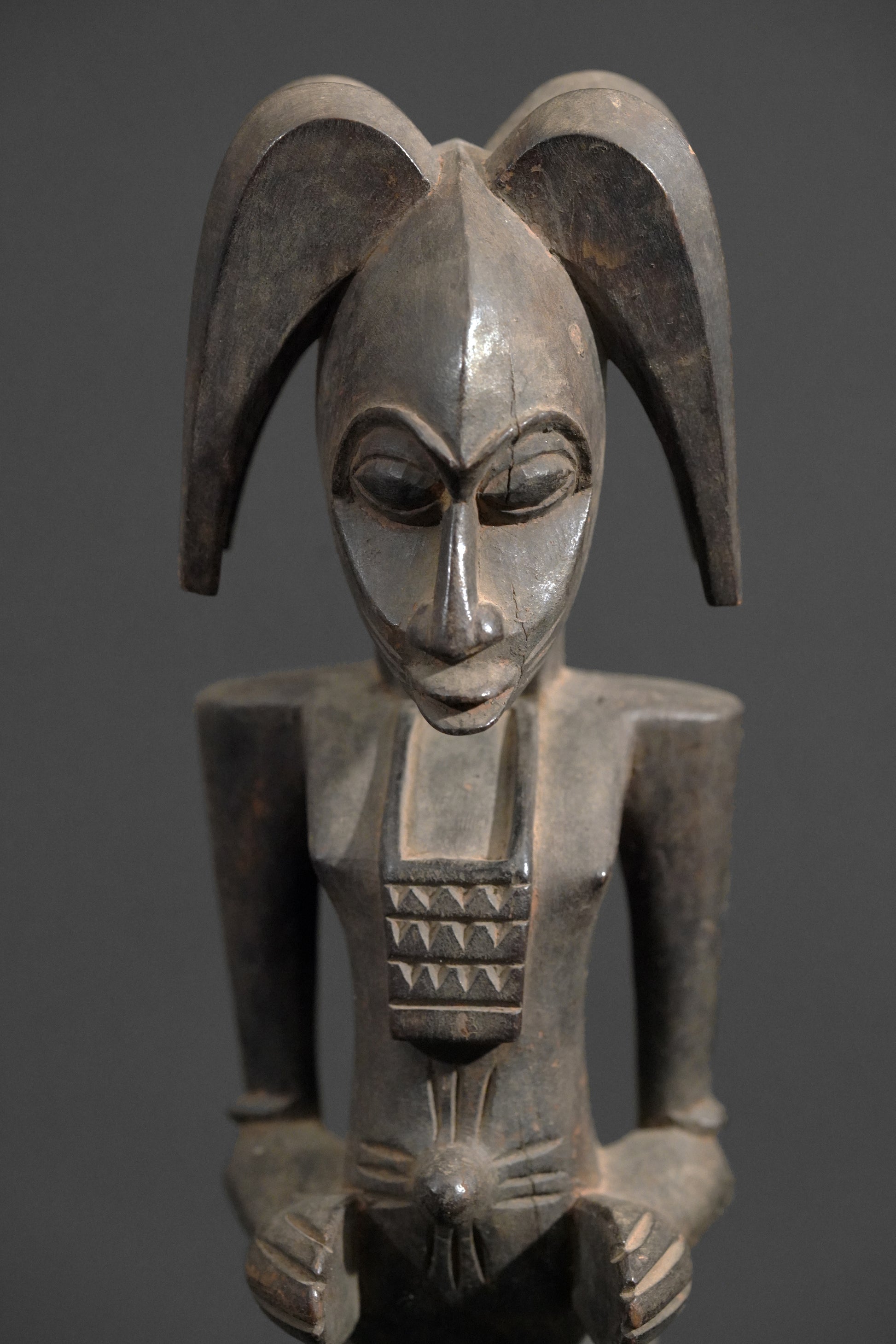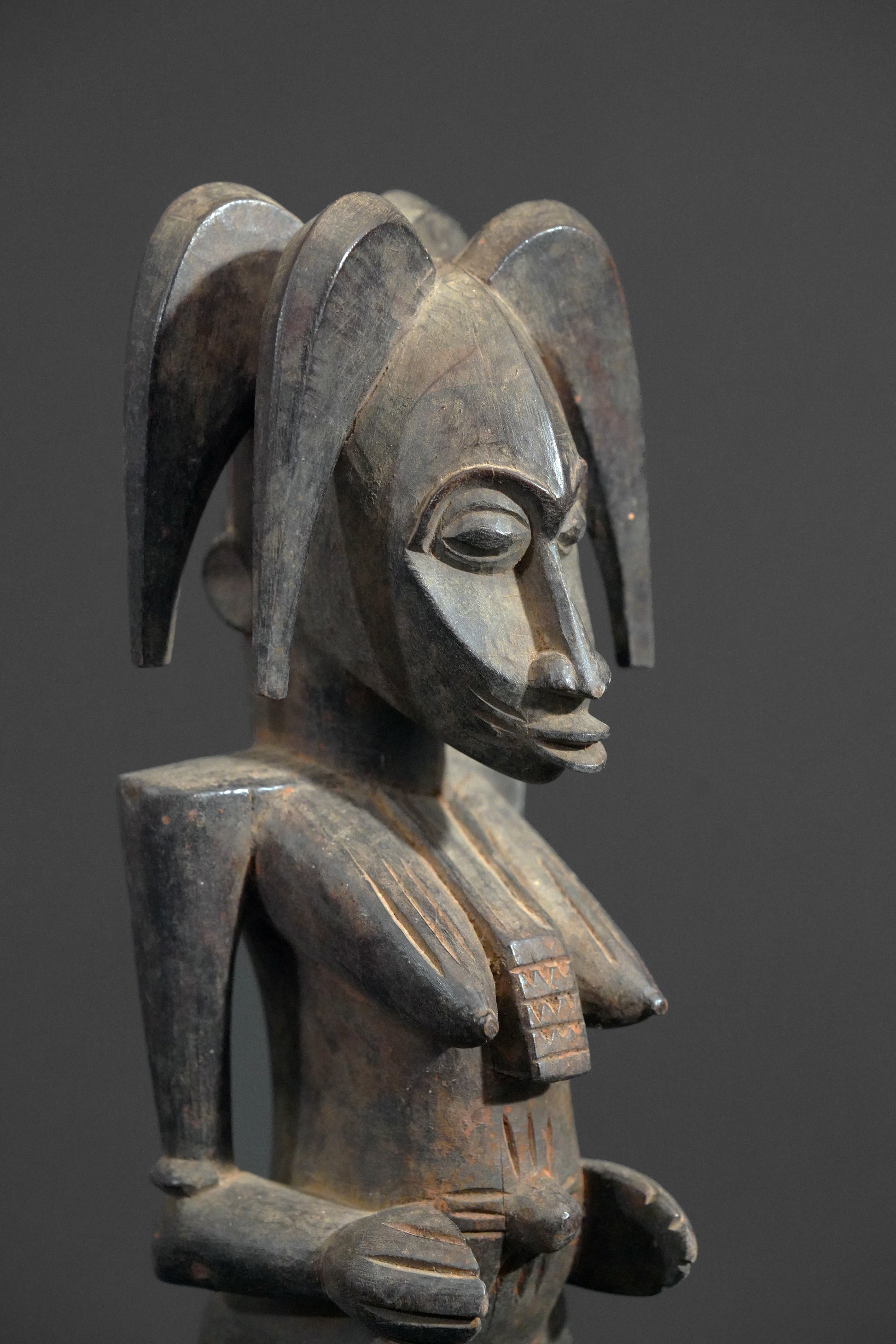 Each figure standing on a semicircular base, flat feet, well-formed legs, a pointed navel with scarifications, square shoulders, arms bent with bangles above the elbow and hands stretched out to the front, the breasts of the female statue are long and pointed decorated with scarifications, both statues wear an amulet, the mouth is protruding and slightly open, the nose long and broad at the tip, the almond-shaped eyes arched by long brows which are connected in the middle, the coiffure in four long braids and a small one hangs down the neck; dark brown patina, a few small age cracks on both statues, the base of the male statue has a little bit wider crack in the front and on the left leg is an insect damage, otherwise in fine condition.