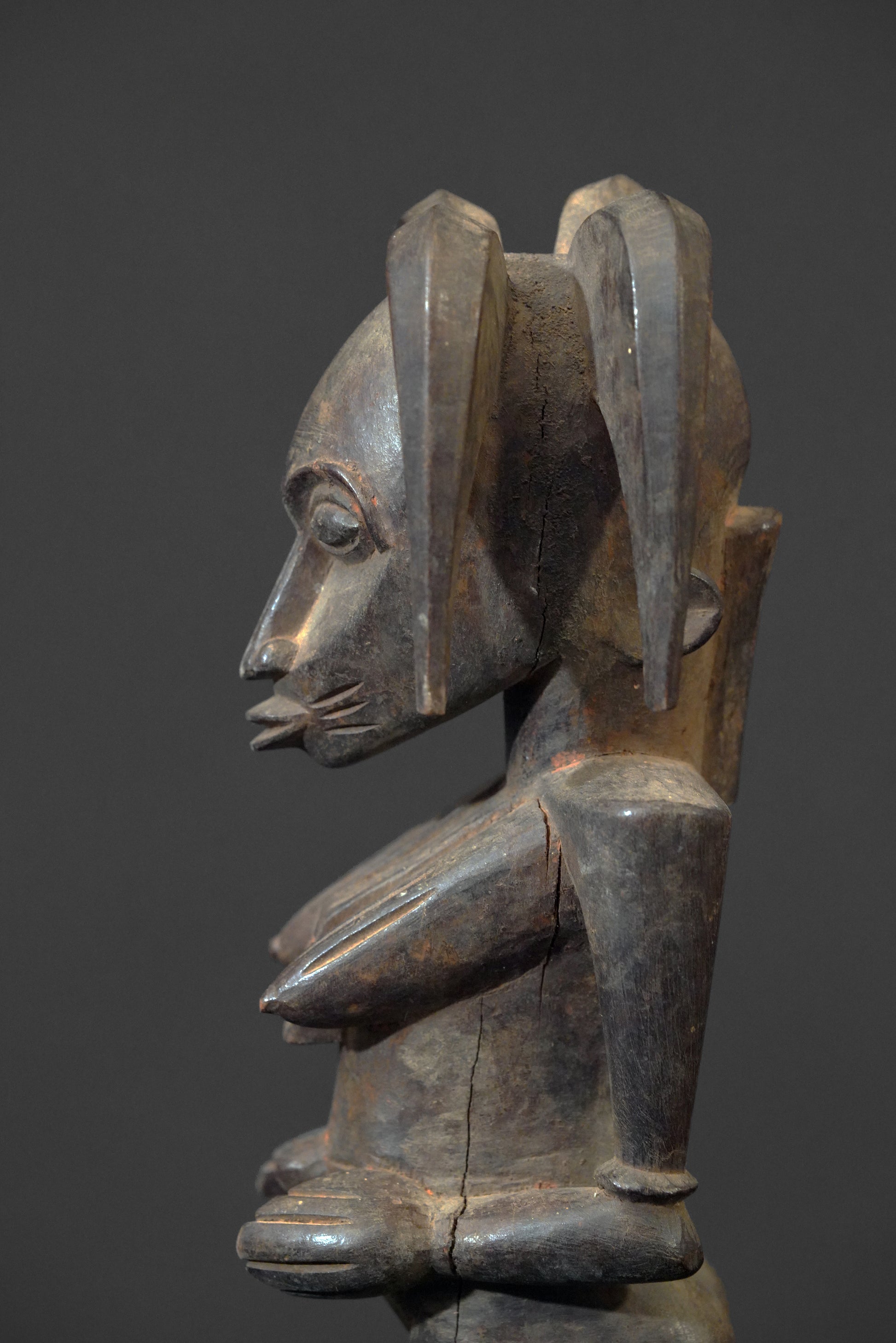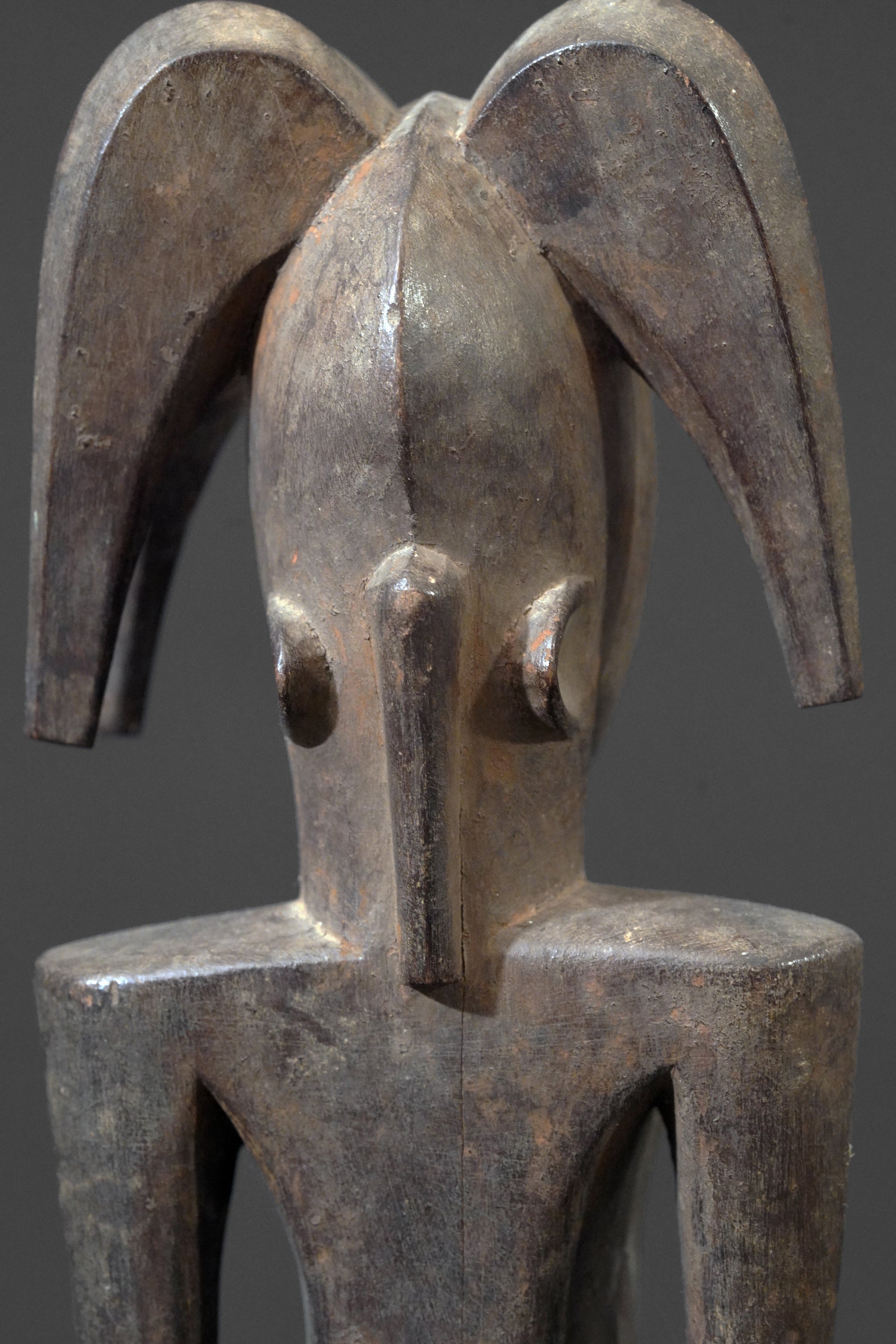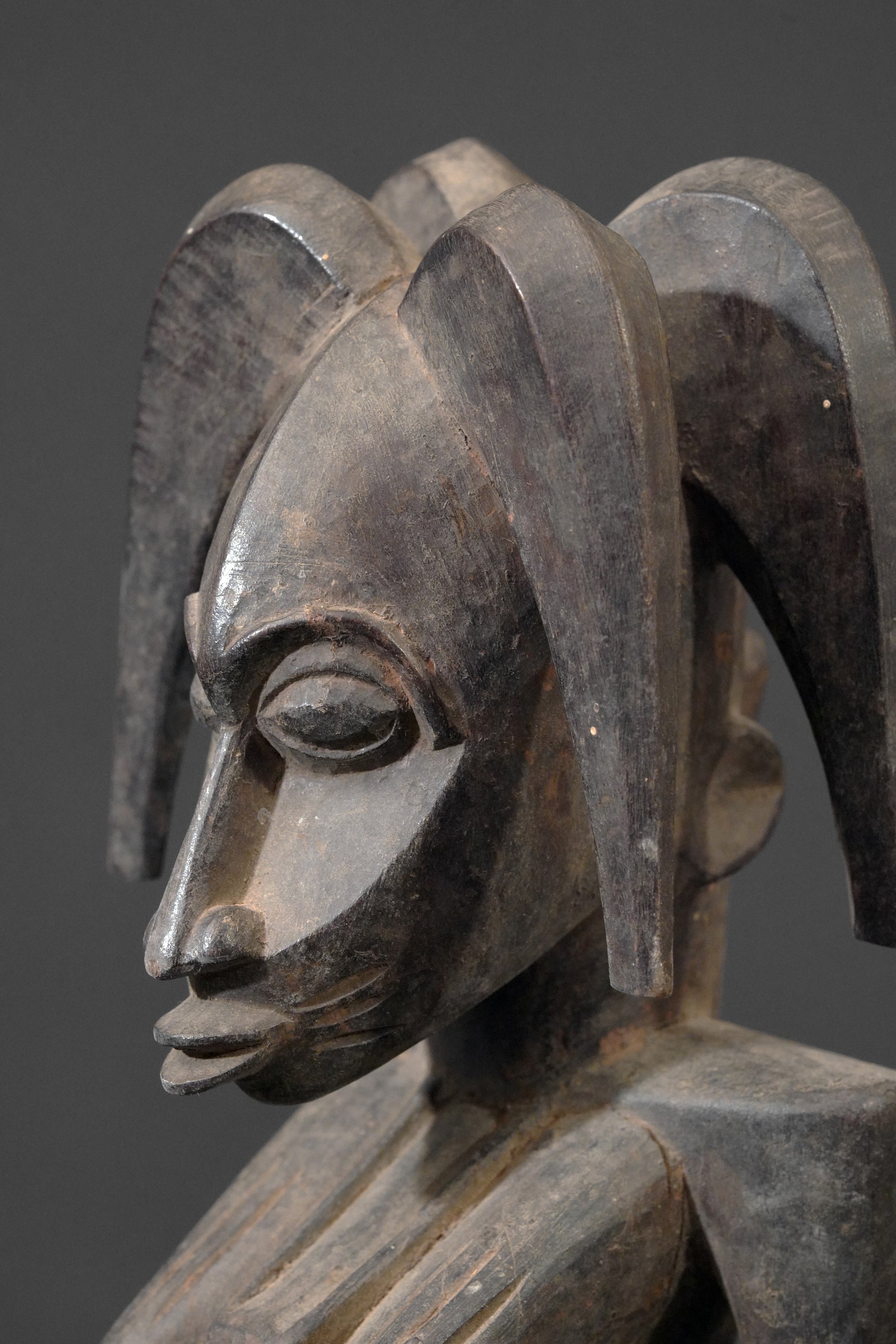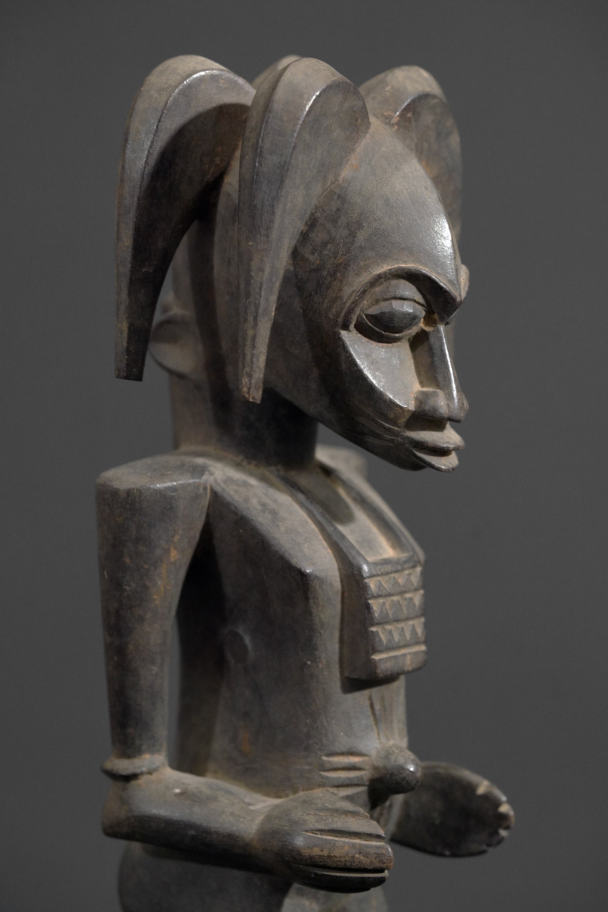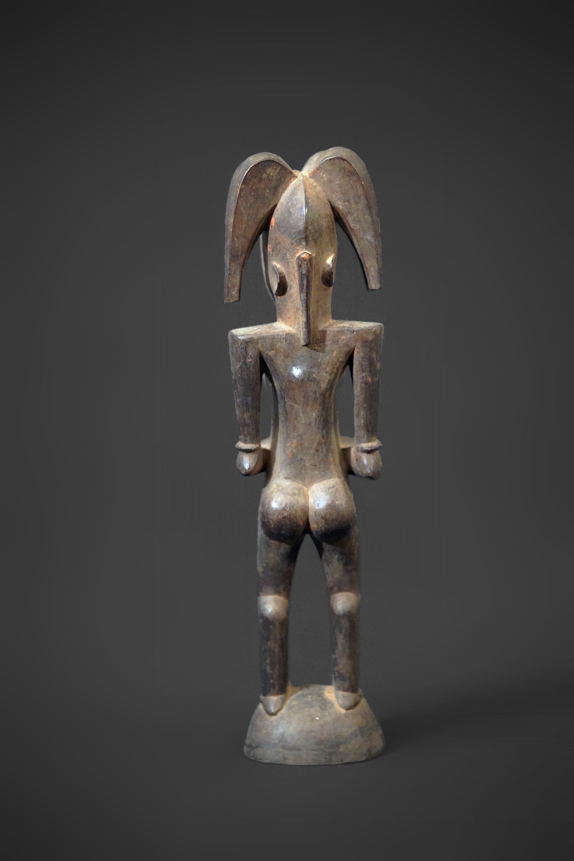 Each figure standing on a semicircular base, flat feet, well-formed legs, a pointed navel with scarifications, square shoulders, arms bent with bangles above the elbow and hands stretched out to the front, the breasts of the female statue are long and pointed decorated with scarifications, both statues wear an amulet, the mouth is protruding and slightly open, the nose long and broad at the tip, the almond-shaped eyes arched by long brows which are connected in the middle, the coiffure in four long braids and a small one hangs down the neck; dark brown patina, a few small age cracks on both statues, the base of the male statue has a little bit wider crack in the front and on the left leg is an insect damage, otherwise in fine condition.