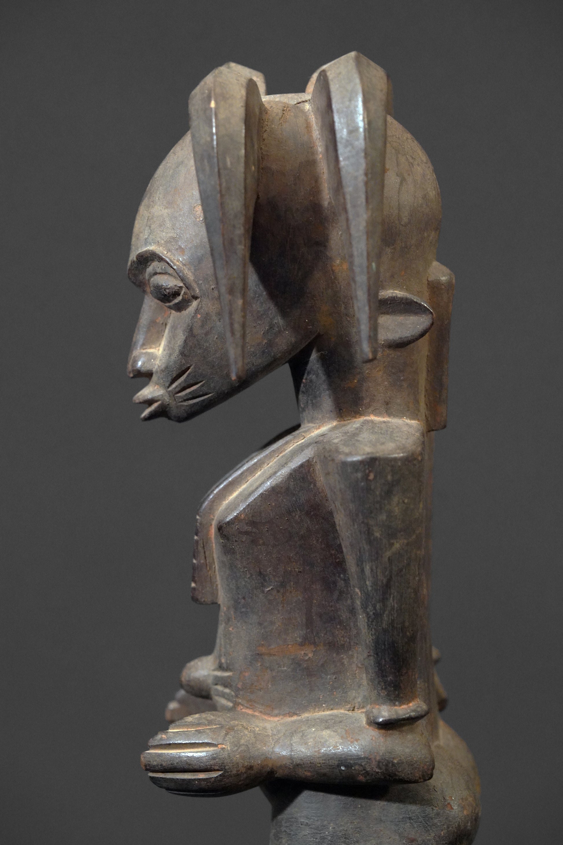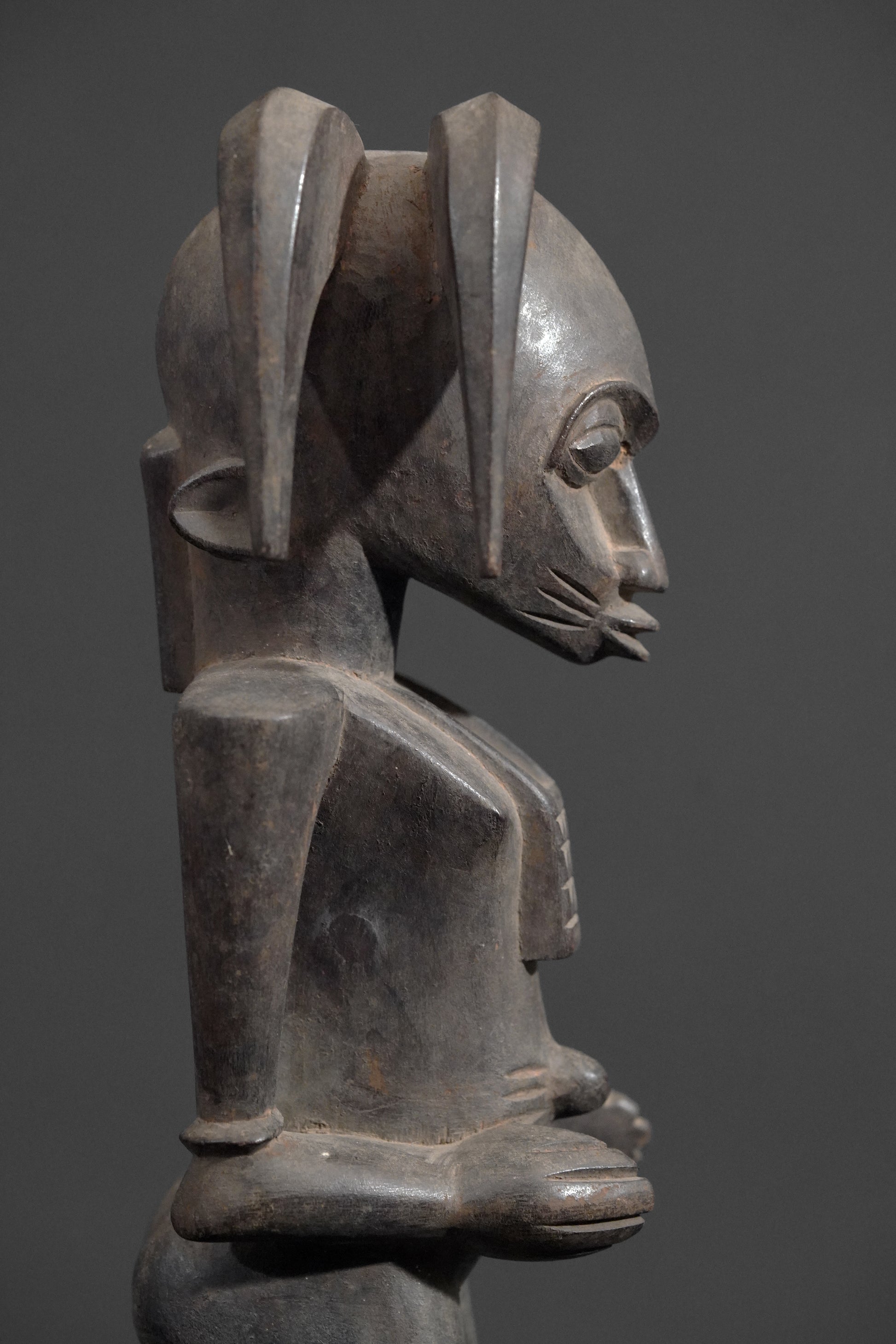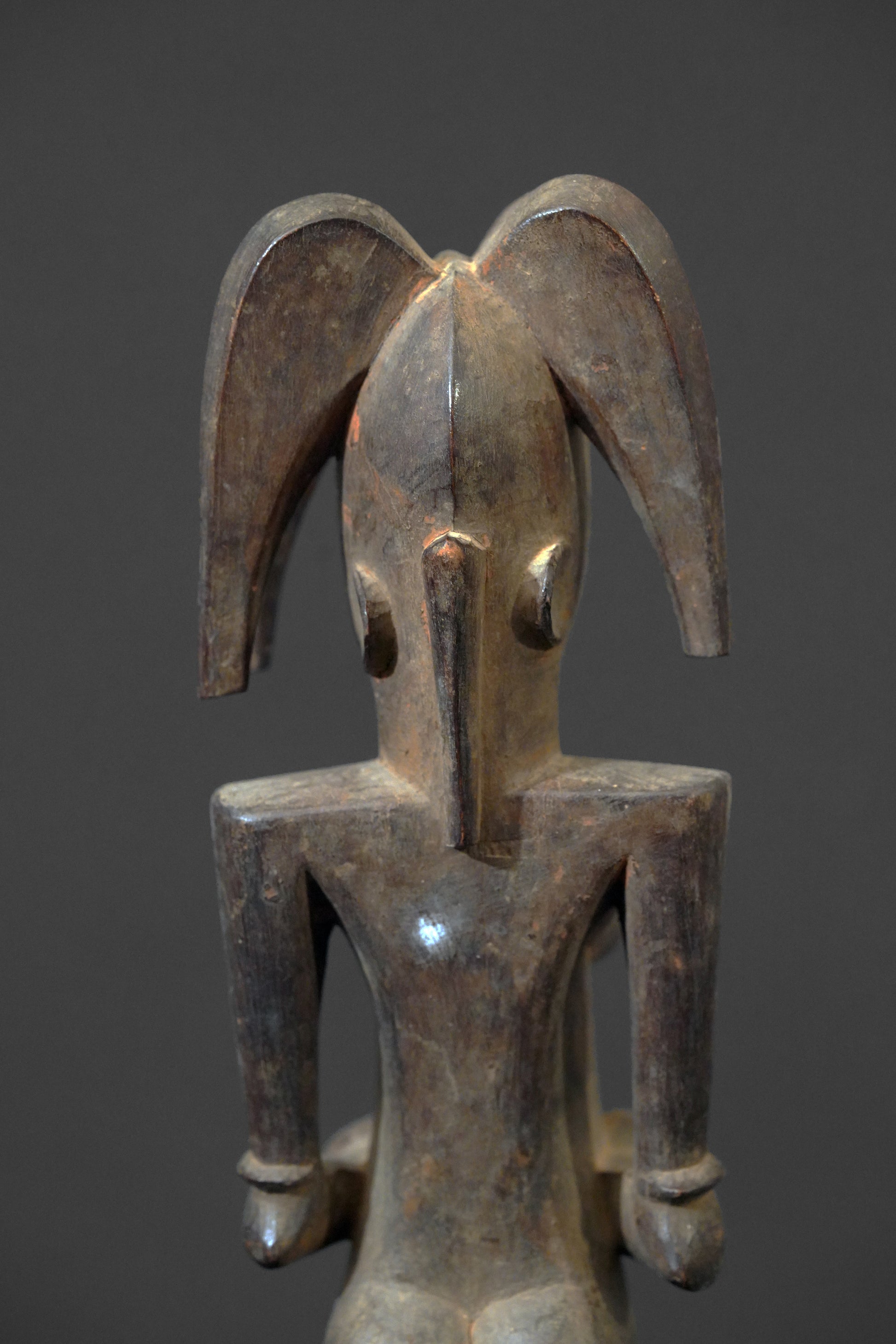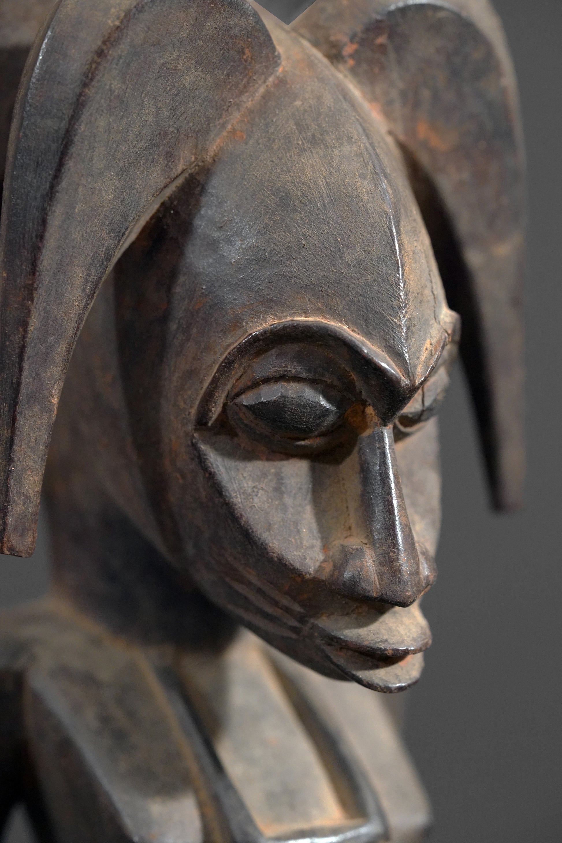 Each figure standing on a semicircular base, flat feet, well-formed legs, a pointed navel with scarifications, square shoulders, arms bent with bangles above the elbow and hands stretched out to the front, the breasts of the female statue are long and pointed decorated with scarifications, both statues wear an amulet, the mouth is protruding and slightly open, the nose long and broad at the tip, the almond-shaped eyes arched by long brows which are connected in the middle, the coiffure in four long braids and a small one hangs down the neck; dark brown patina, a few small age cracks on both statues, the base of the male statue has a little bit wider crack in the front and on the left leg is an insect damage, otherwise in fine condition.