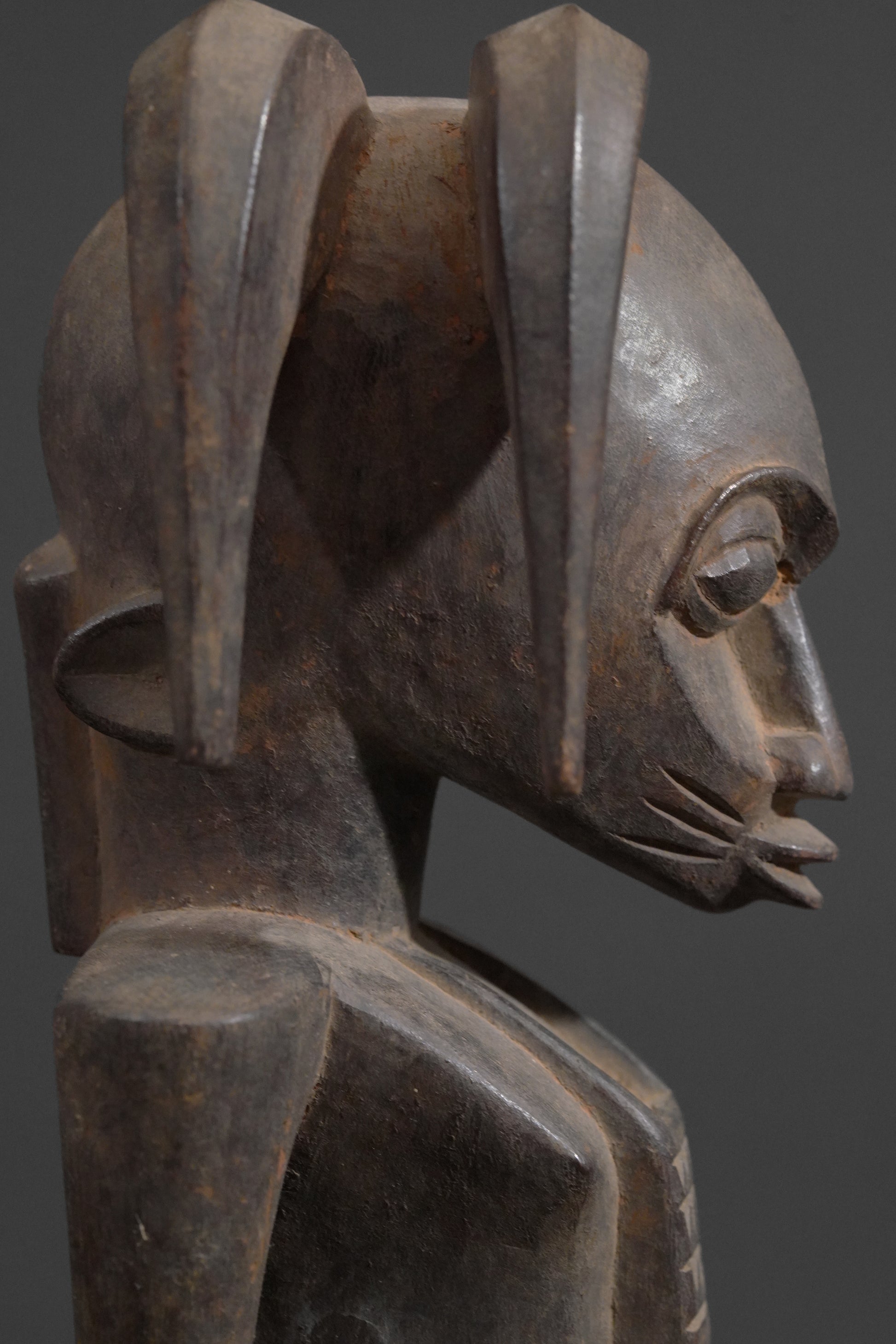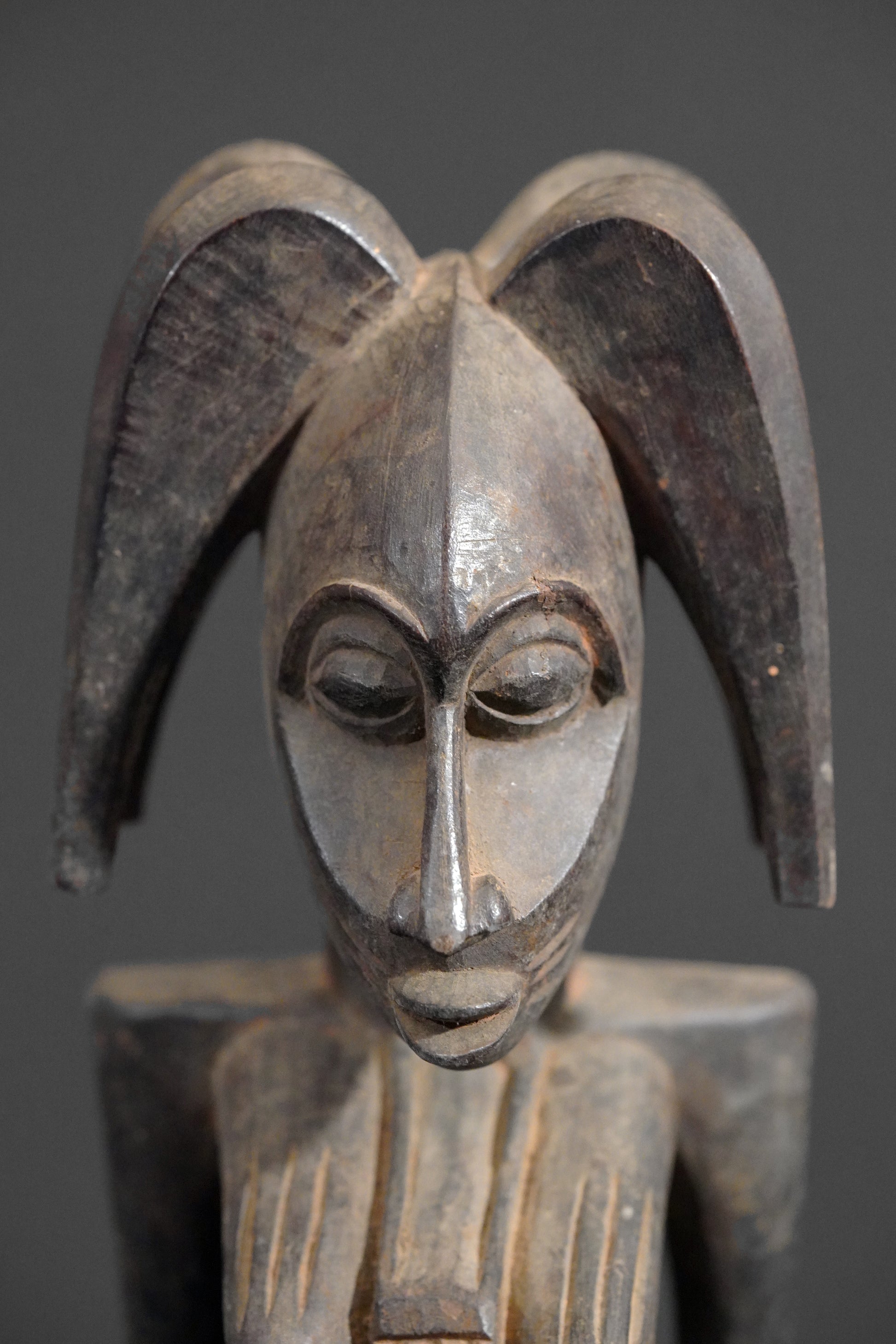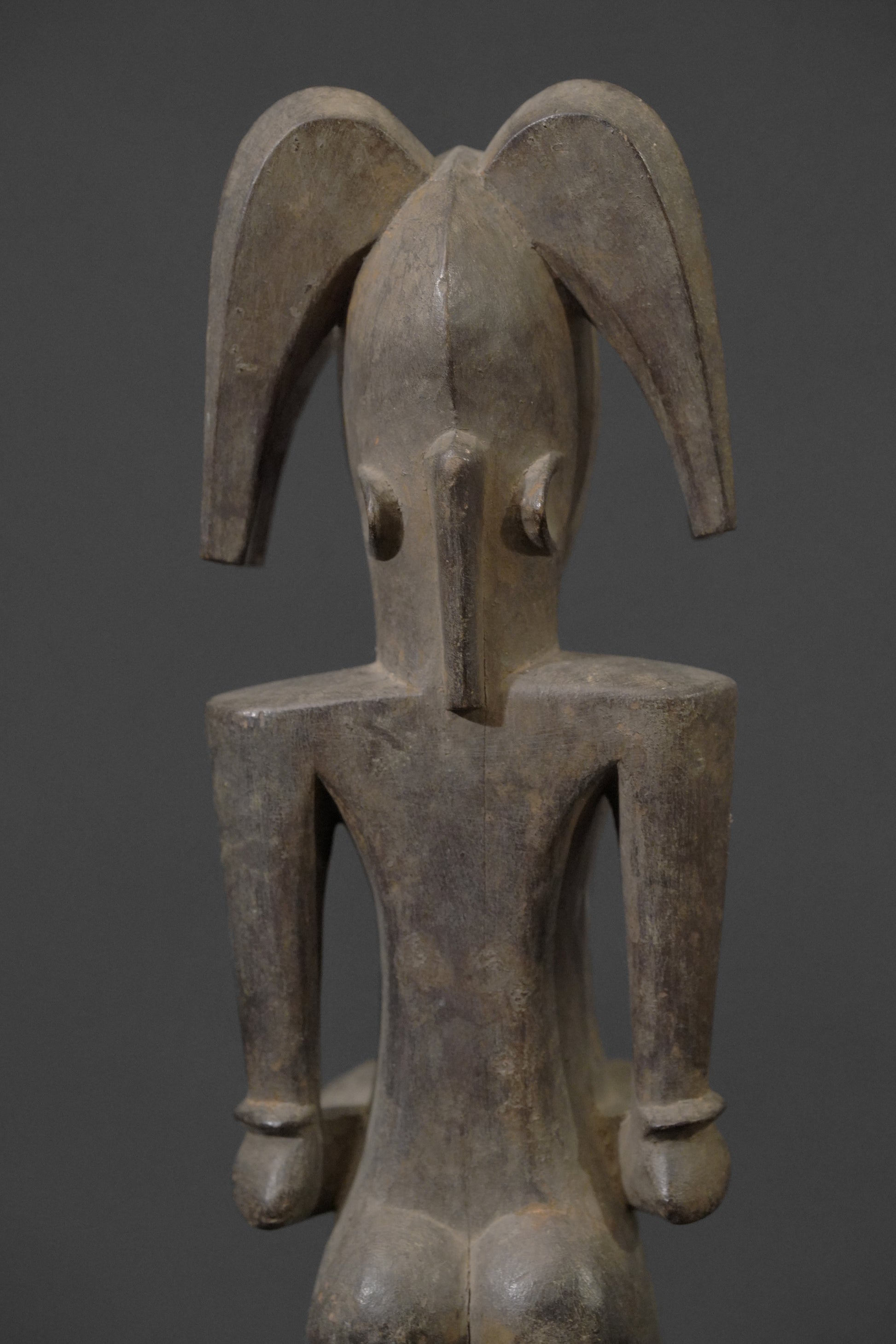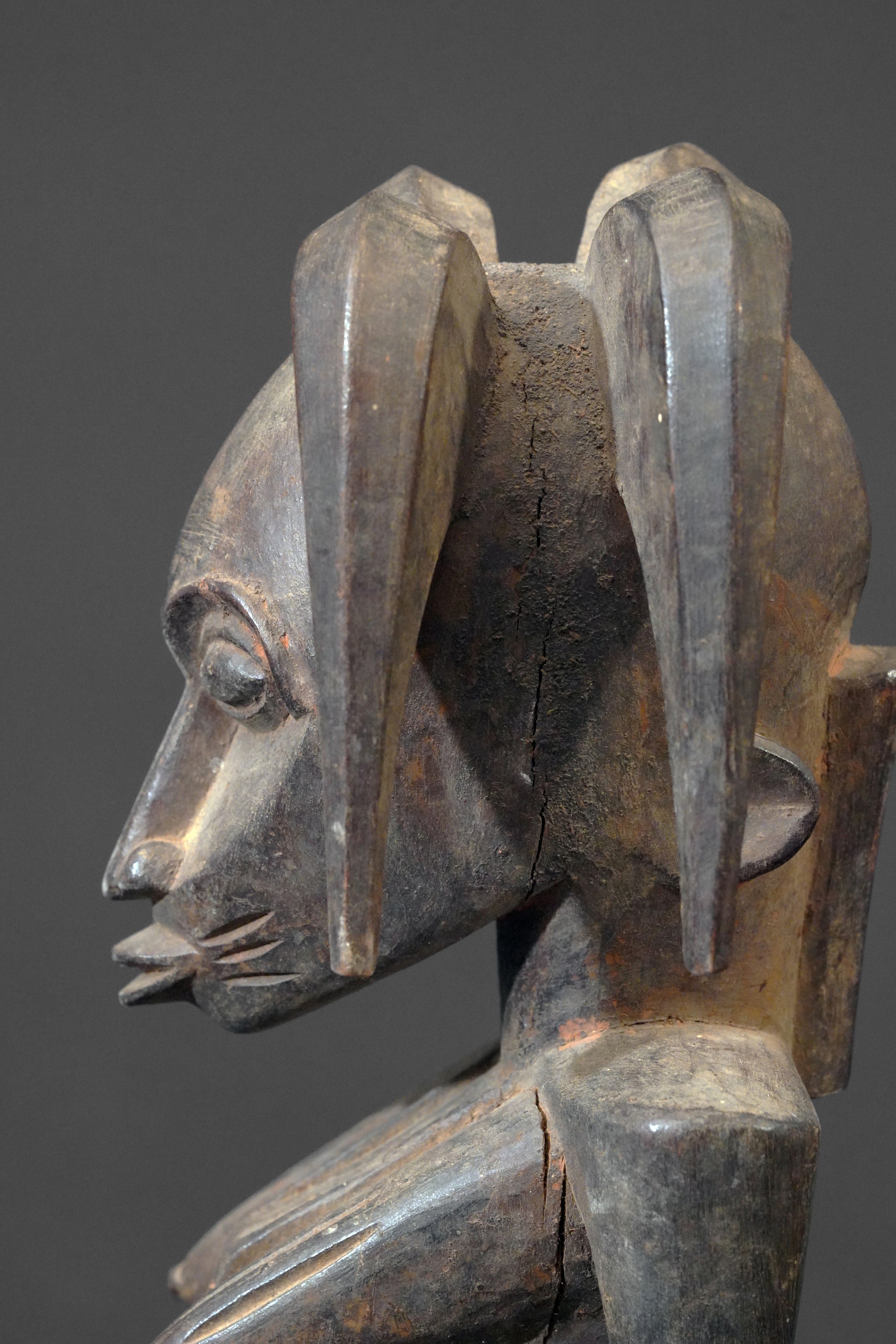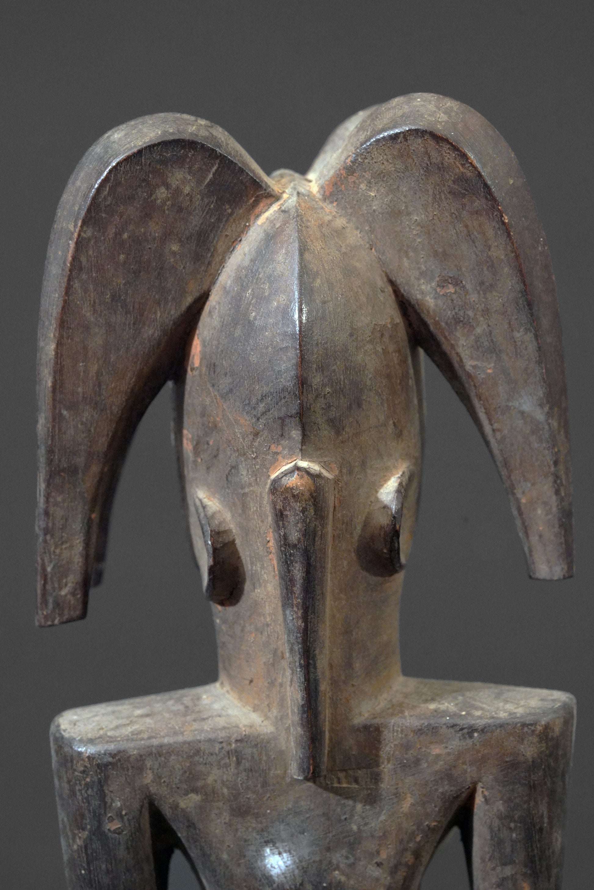 Each figure standing on a semicircular base, flat feet, well-formed legs, a pointed navel with scarifications, square shoulders, arms bent with bangles above the elbow and hands stretched out to the front, the breasts of the female statue are long and pointed decorated with scarifications, both statues wear an amulet, the mouth is protruding and slightly open, the nose long and broad at the tip, the almond-shaped eyes arched by long brows which are connected in the middle, the coiffure in four long braids and a small one hangs down the neck; dark brown patina, a few small age cracks on both statues, the base of the male statue has a little bit wider crack in the front and on the left leg is an insect damage, otherwise in fine condition.