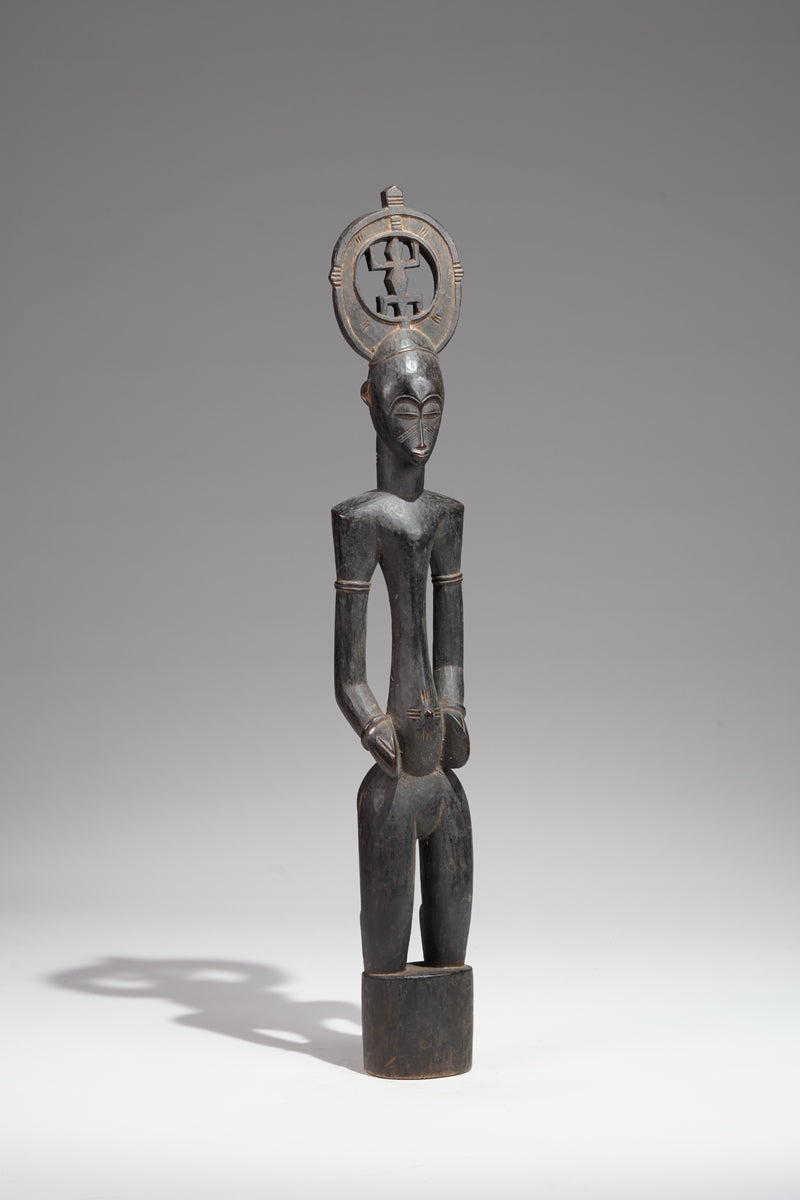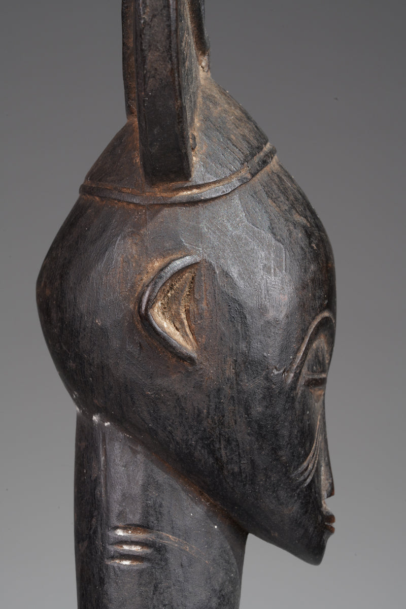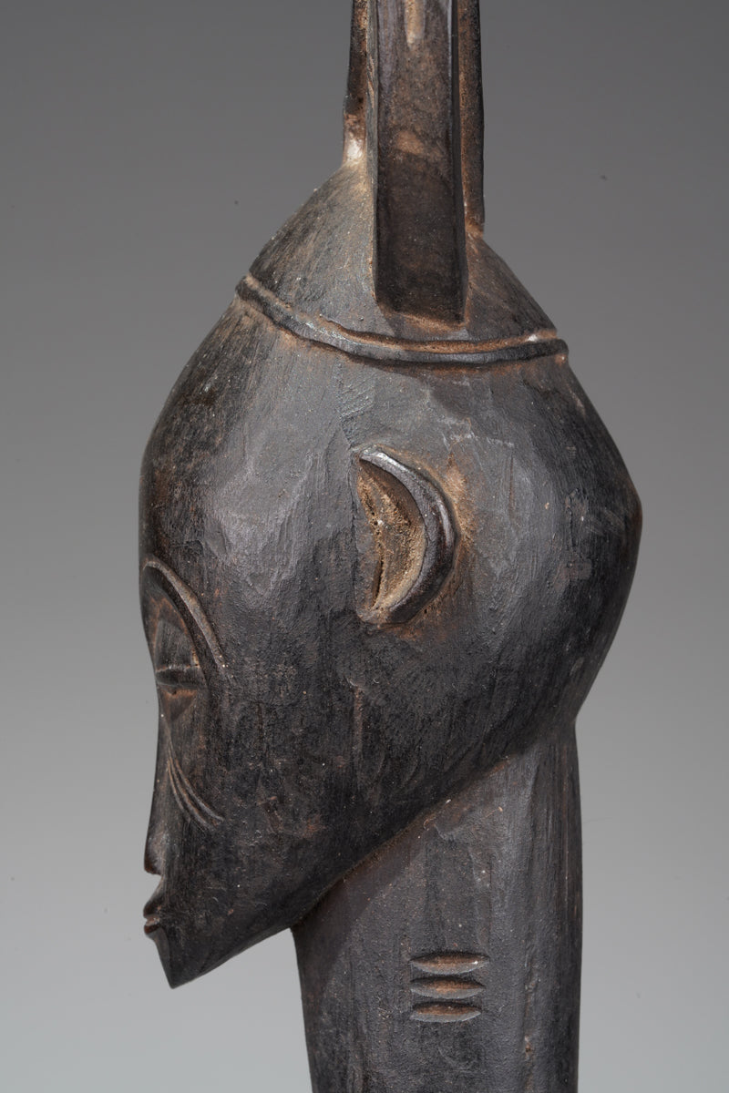 Close to the border to Mali, uprising from a cylindrical, slightly conical base, the slightly bent legs without feet, which suggests a more archaic type of this figure, the slender torso with a slightly arched belly and a pointed navel, the arms carved close to the torso, the shoulders rounded, a thick columnar neck supports an oval head with a protruding mouth and almond-shaped eyes, the cap-shaped hairstyle seems to represent a stylized bird head; the figure is characterized by an old touch patina, which suggests a longlasting ritual use, we are not quite sure whether it is a guardian figure or a rhythm pounder (Déblé). The size of the base allows both options. But usually Déblé are bigger and their purpose for funeral- ceremonies is different. According of Gottschalk Guardian sculptures are more rare than Rhythm-Pounders.
