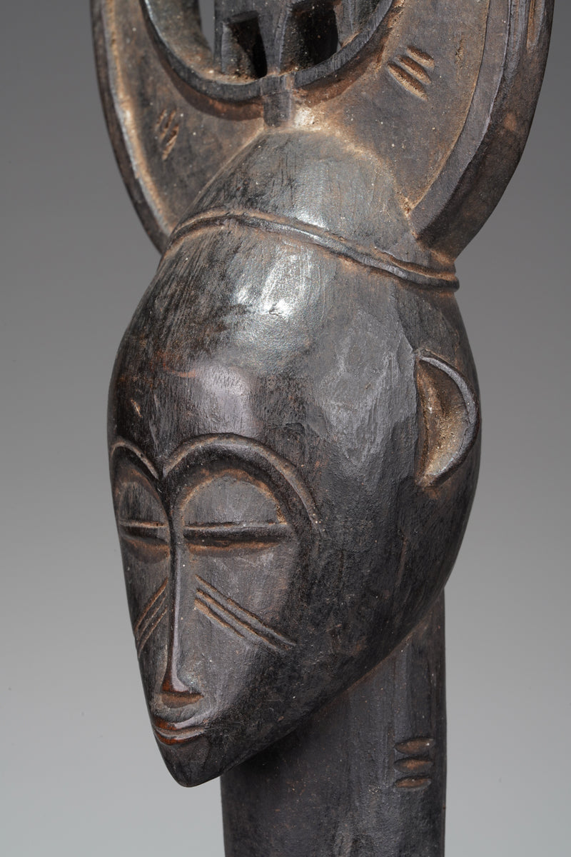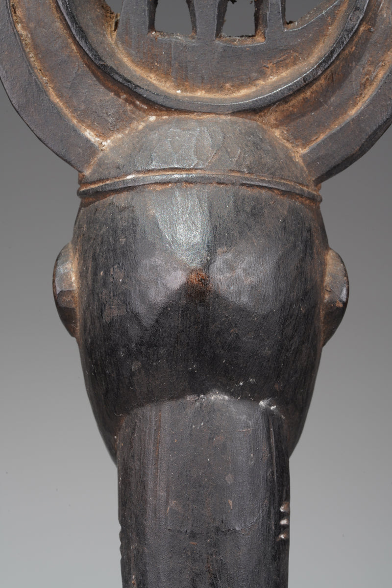 A Senufo guardian figure, Ivory Coast, surmounted with a panel, in the center a stylized lizzard, collected in the Tingrela region, close to the border of Mali, fine blackened patina, partly shiny, traces of ritual use and age; provenance Belo Mohamed Garba, Korhogo.