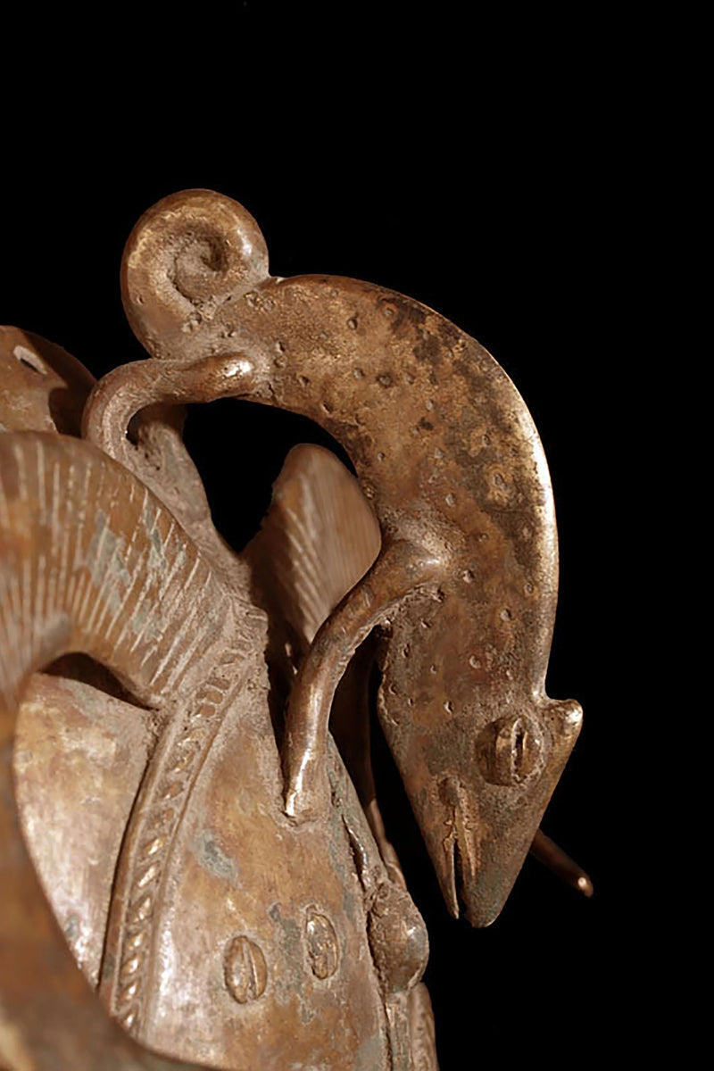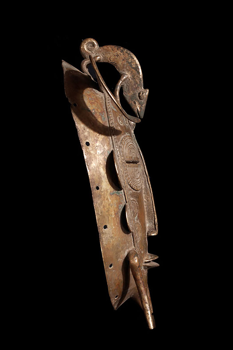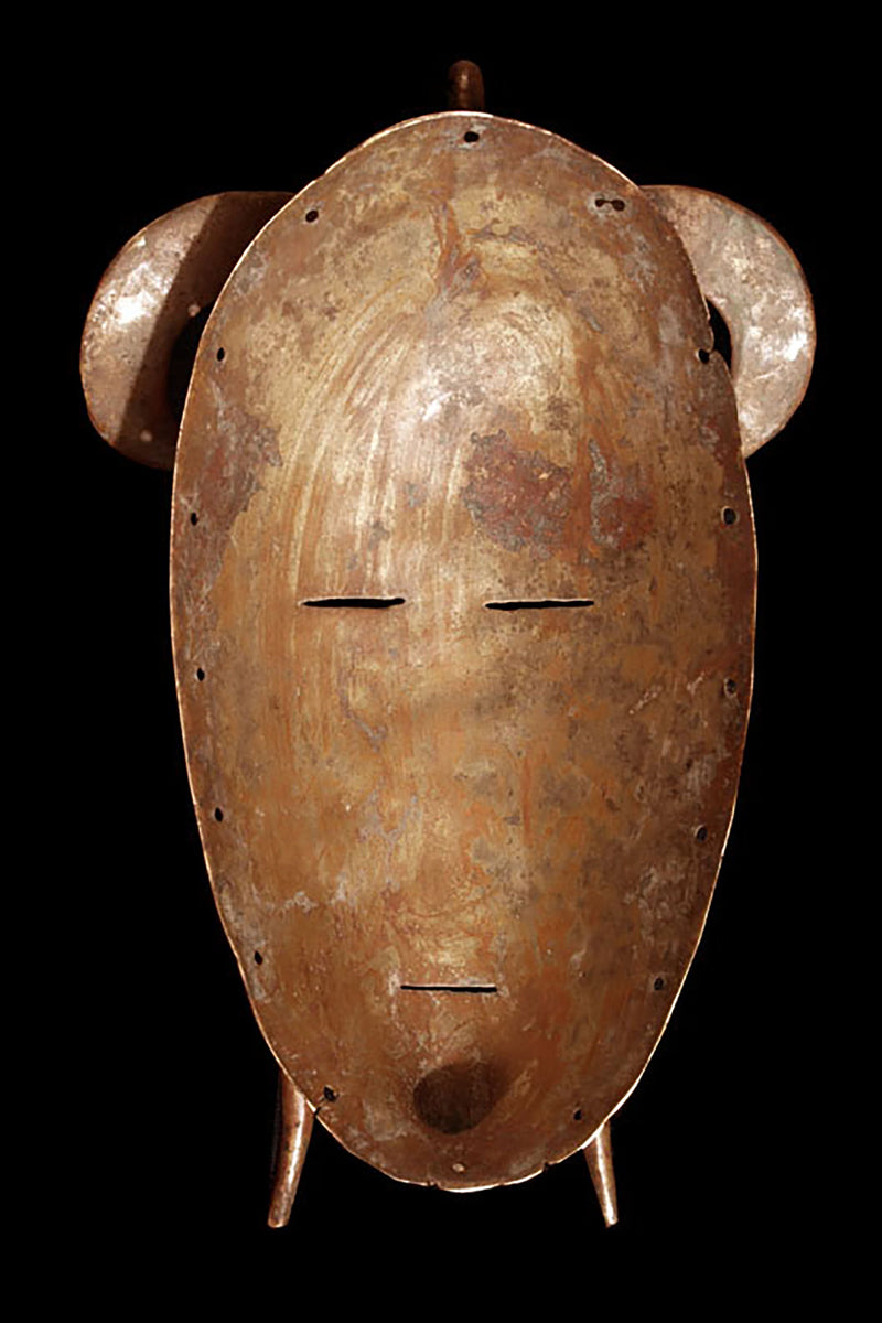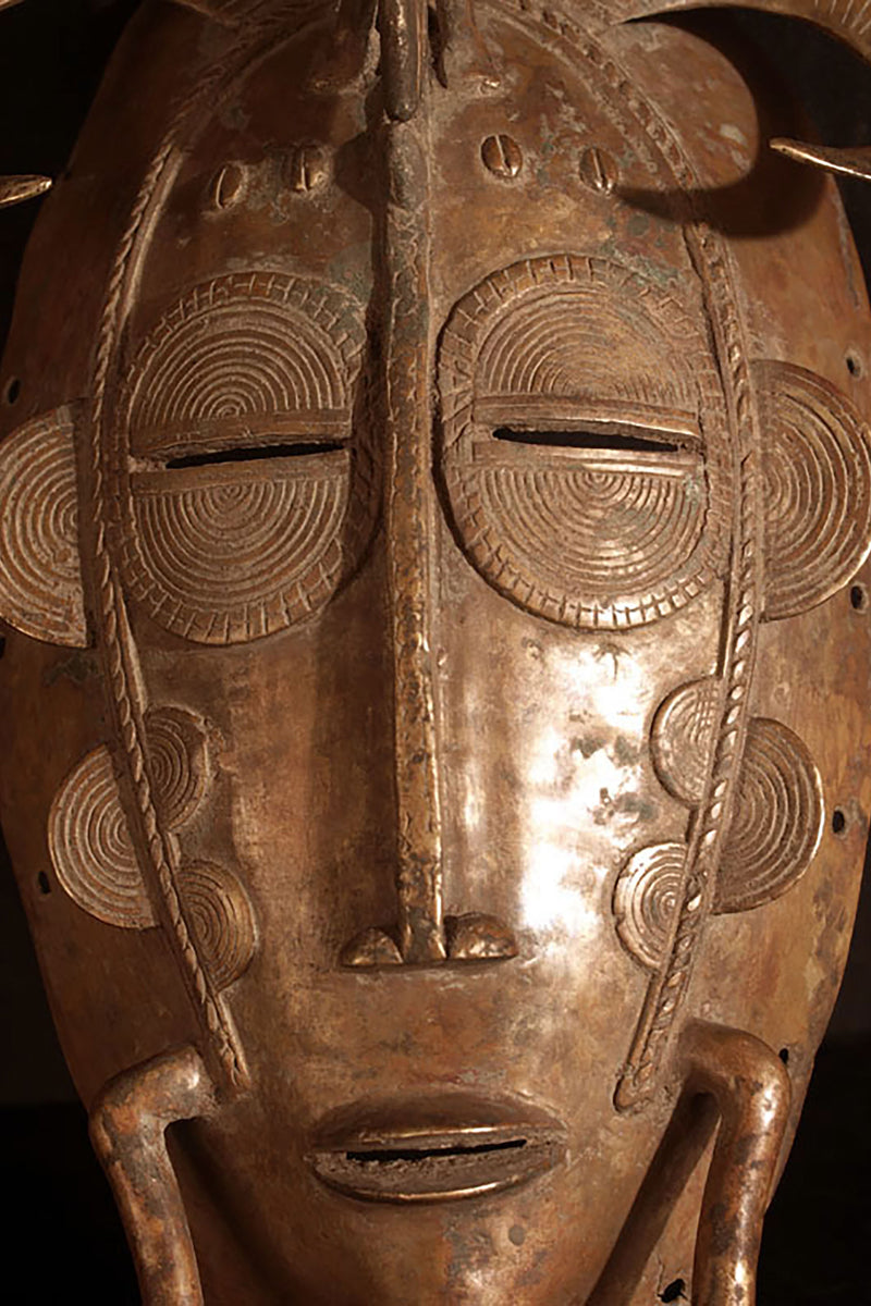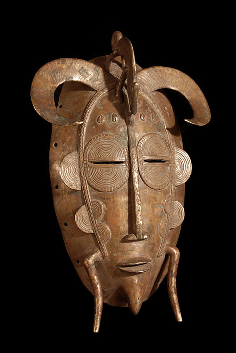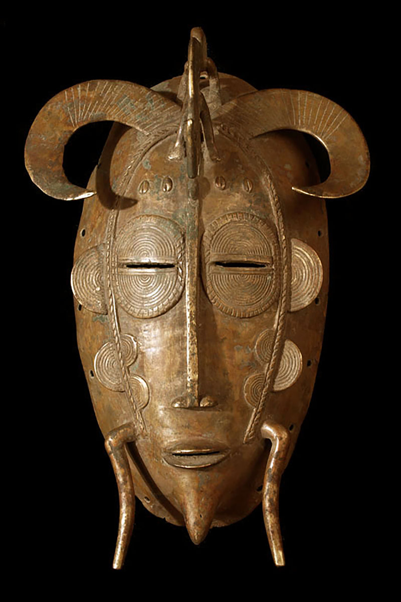 A Senufo Kpelié Bronze-Mask, the oval face with crescent scarifications around the mouth and the cheeks, a domed forehead beneath the sculpture of a woman, pierced through at the rim for attachments; dark to shiny patina, partly blackened oxidised, collected in the vicinity of Korhogo, Ivory Coast.