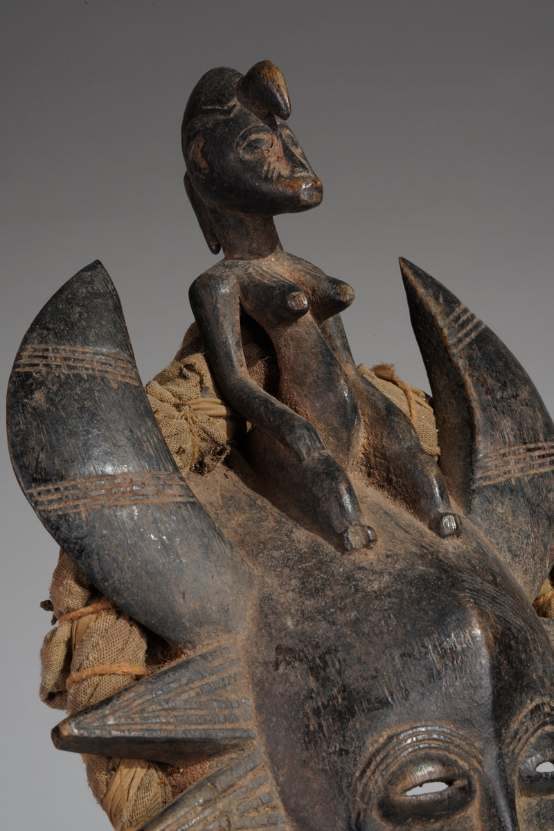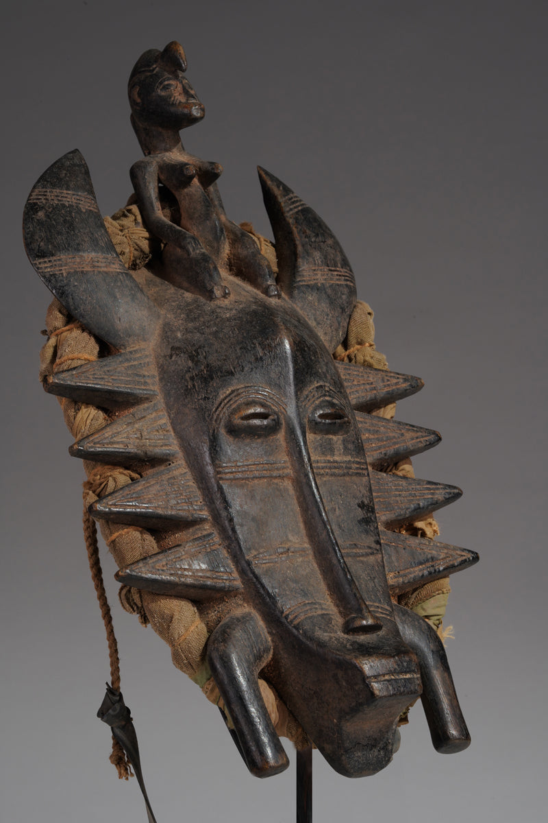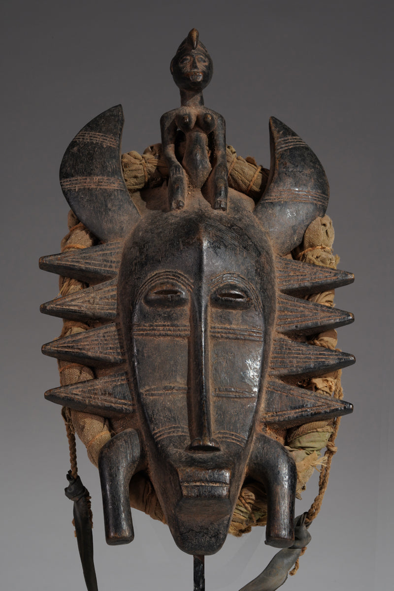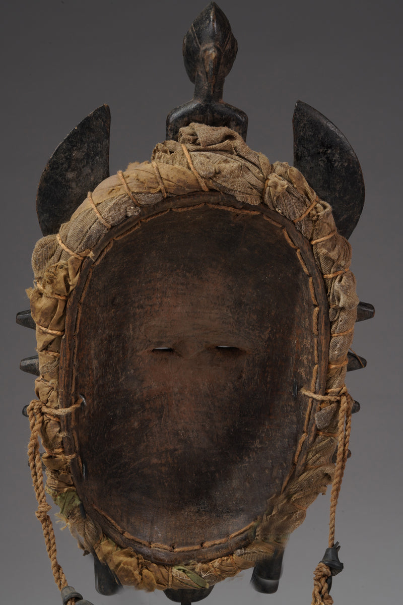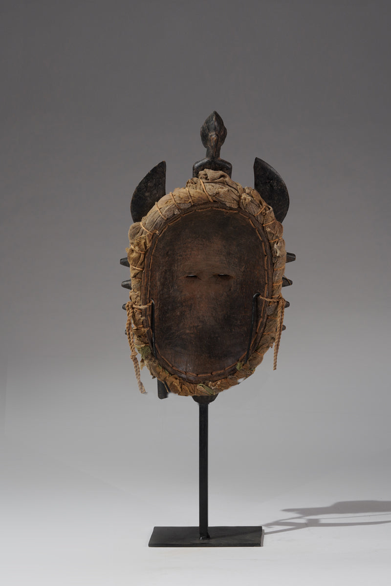 "Throughout the twentieth century, members of poro, a Senufo initiation association, wore small, finely carved face masks as insignia. The masks, known as kpeliye'e, feature delicate oval faces with geometric projections at the sides. Raised and incised scarification patterns ornament their smooth, glossy surfaces. Considered feminine, the masks honor deceased Senufo elders with their grace and beauty. They provide a complement to the aggressive Senufo helmet masks also sponsored by fraternal organizations in the region. The feathers and animal horns attached to this example are unusual, and may have reflected its owner's power to counteract negative forces in the community."
