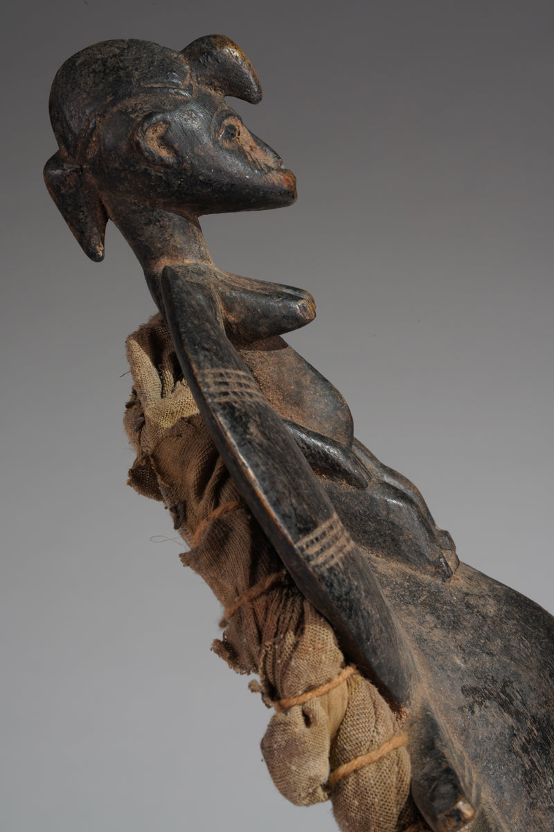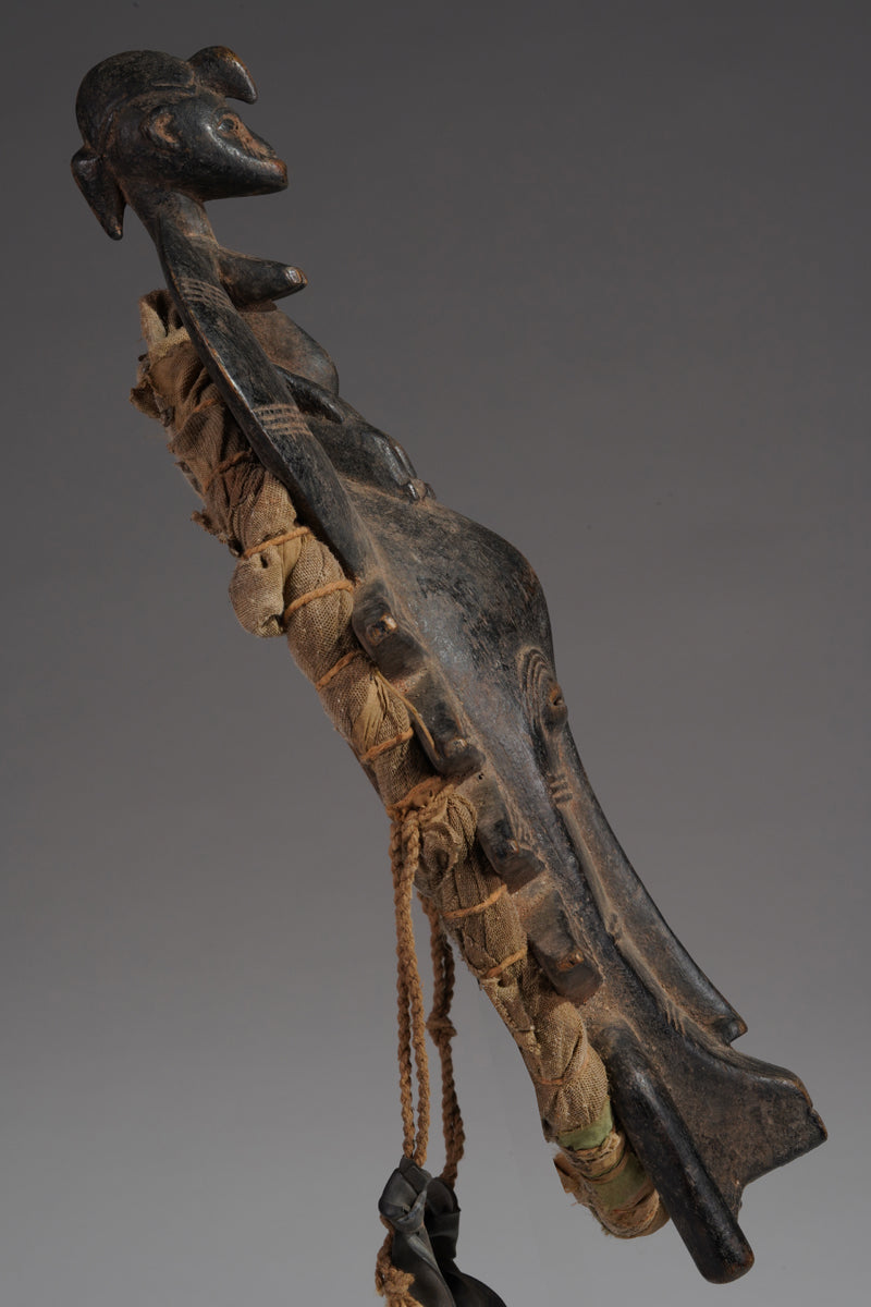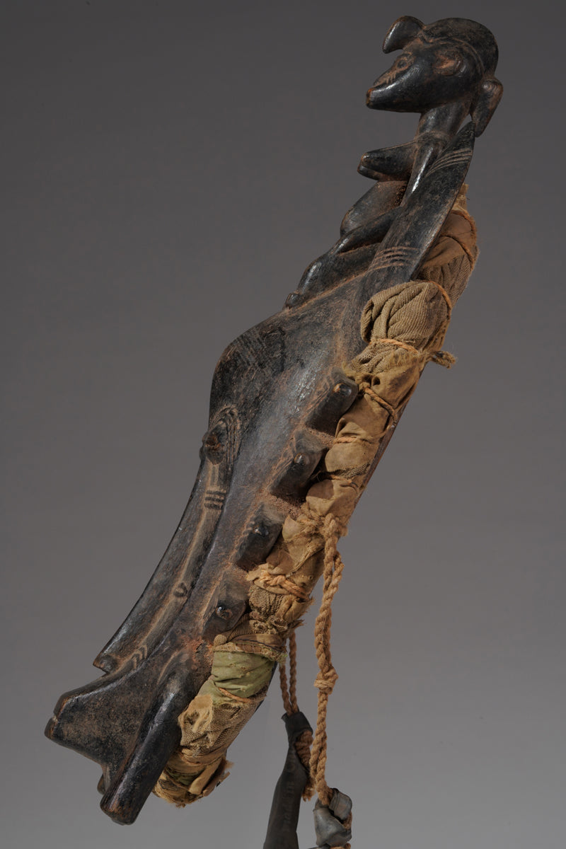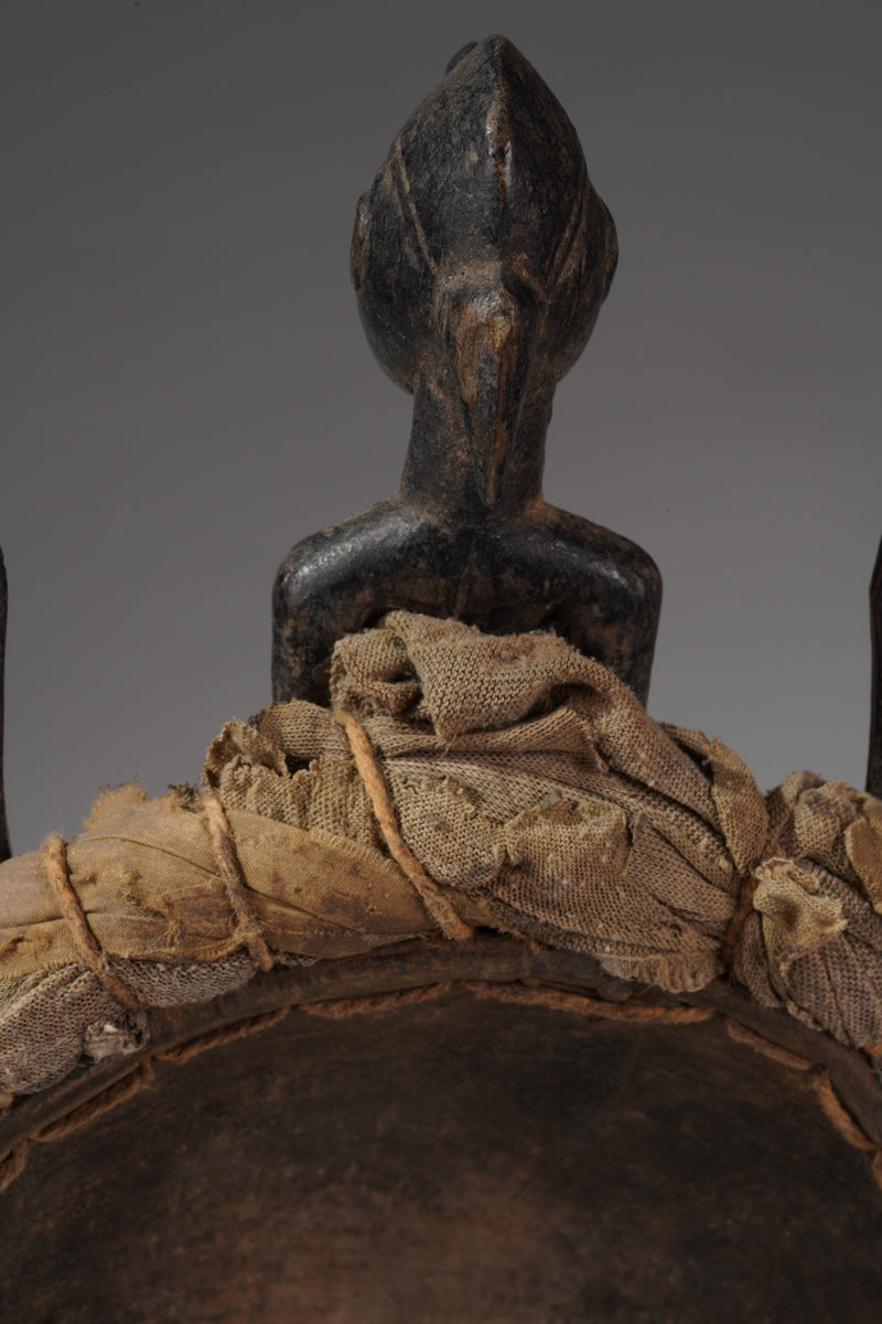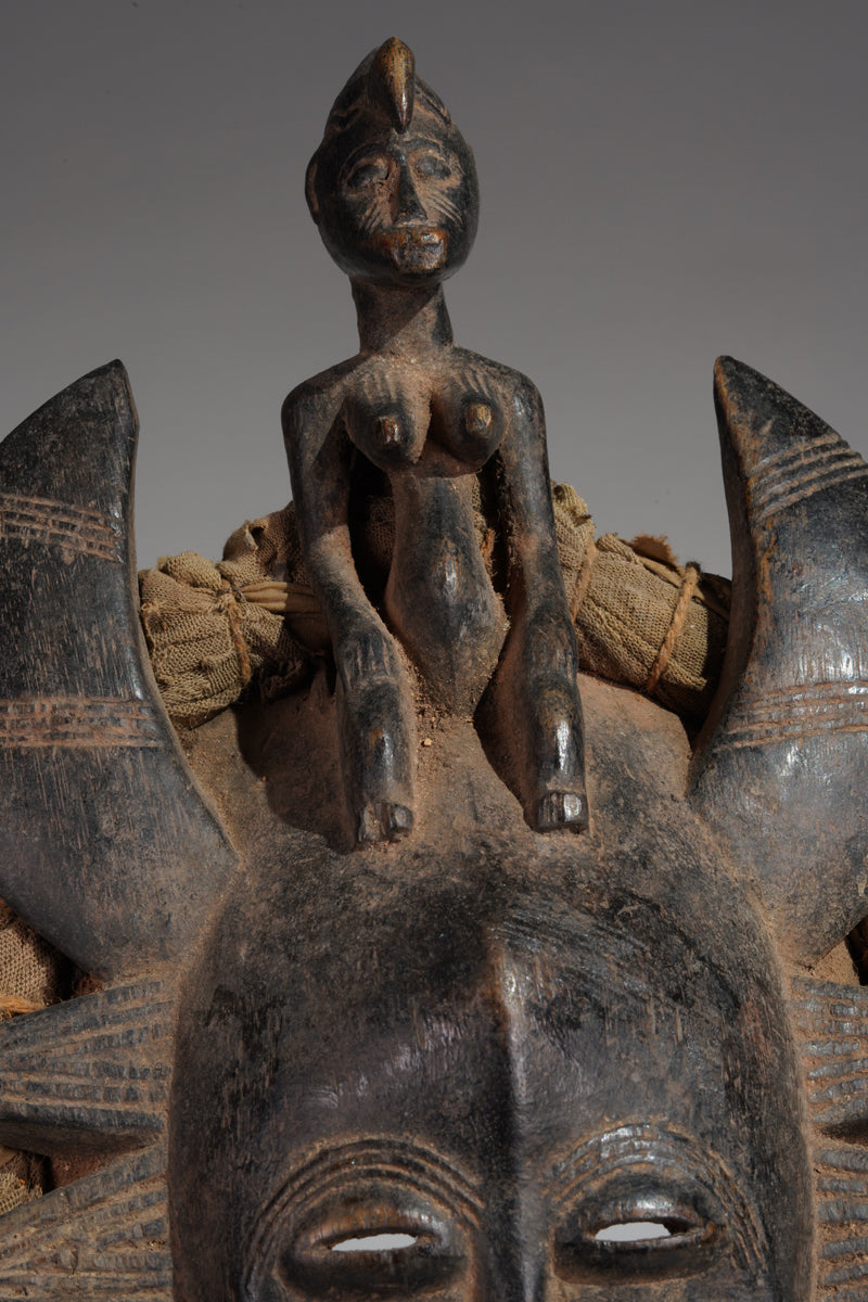 "Throughout the twentieth century, members of poro, a Senufo initiation association, wore small, finely carved face masks as insignia. The masks, known as kpeliye'e, feature delicate oval faces with geometric projections at the sides. Raised and incised scarification patterns ornament their smooth, glossy surfaces. Considered feminine, the masks honor deceased Senufo elders with their grace and beauty. They provide a complement to the aggressive Senufo helmet masks also sponsored by fraternal organizations in the region. The feathers and animal horns attached to this example are unusual, and may have reflected its owner's power to counteract negative forces in the community."