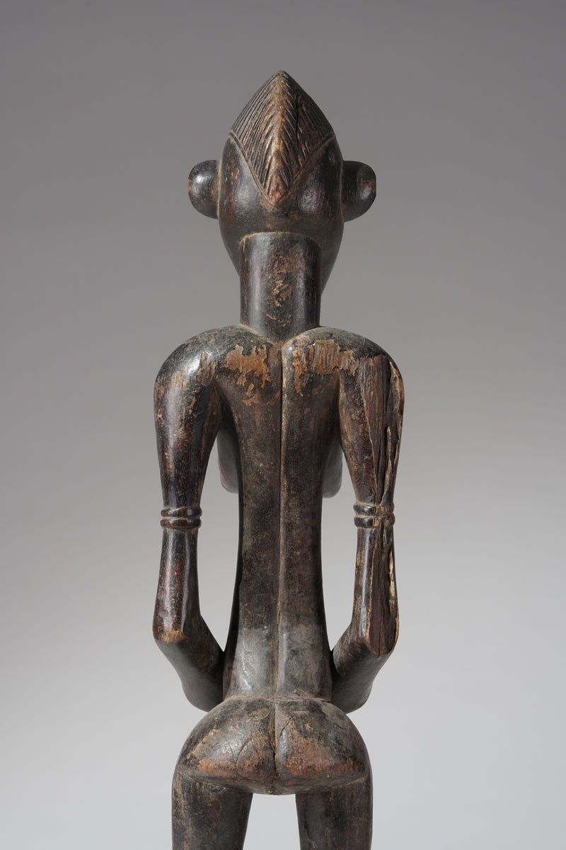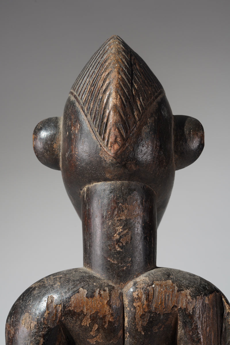 These sculptures - kown under the name deble -is one of the most famous works of West African Art. After the early 1960th, when the Massa-movement destroyed most of the important Senufo objects, only a few old, authentic Rhythm Pounder were saved and came to Western world. There are no sculptures from the time before 1960 existing anymore in the Senufo region of Ivory Coast, Burkina and Mali. But in some rural regions the old animistic tradition is still existing and also the funeral ceremonies, in which the deble rhythm pounder has it´s ritual function. There are differences in the ceremonies in comparison to the years before 1960. In particular the holy groves, doesn´t exist anymore or arn´t known by Western ethnologists. It were secret fields, where the Senufo placed their ritual sculptures in the forest.These precious objects would probably be stolen immediately, because in nearly every village the Islamic influence becomes stronger and there are more people, who are against the old animistic tradion than decades before. Now these objects are protected in huts close to the village. The patina is different than the old sculptures, because they aren´t exposed the weather anymore, even the traces of use are the same. According of the last owner this sculpture comes from the Northern part of the Senufo region, around Koutiala and was a "replacement" sculpture, which were used several years during funeral ceremonies before it was sold to an antique-dealer near Sikasso. To carve a sculpture like this requires a skilled craftman with a high degree of the old traditional knowledge. The statics is perfect (at the photo from the frontside the statue is a little bit bent, because of the camera-focus), but not in reality, no considerable age-crack, extremly hard wood, an incredibile technical skill must be the base for the purpose of this statue: to pound this fragile but heavy sculpture rhythmically on the ground.