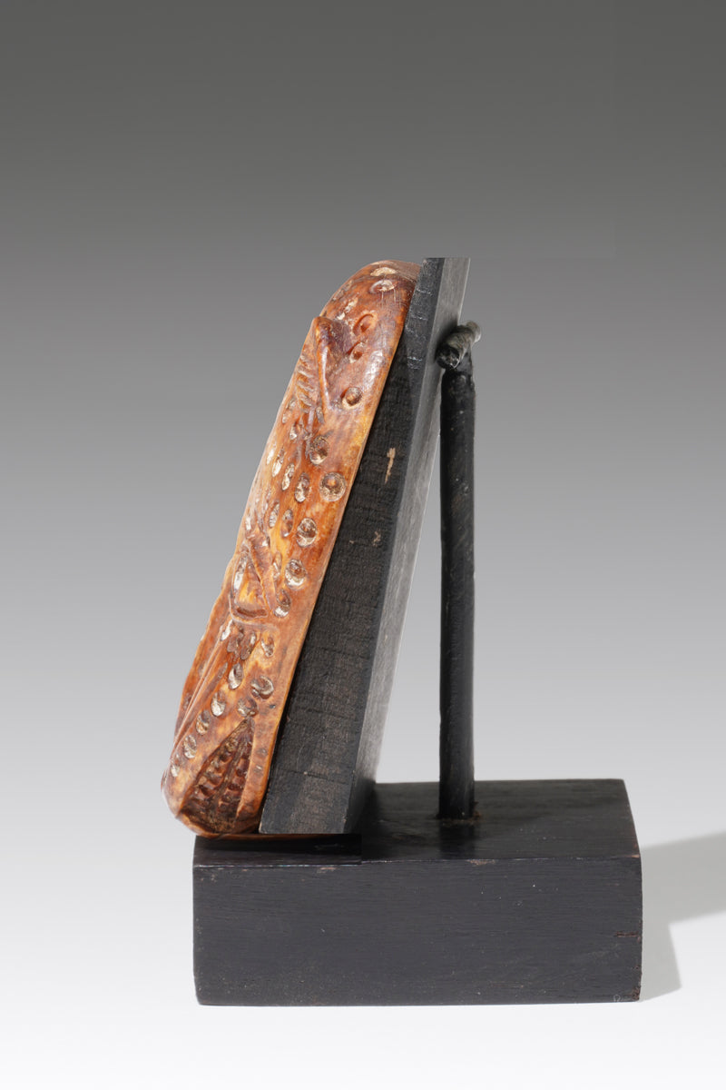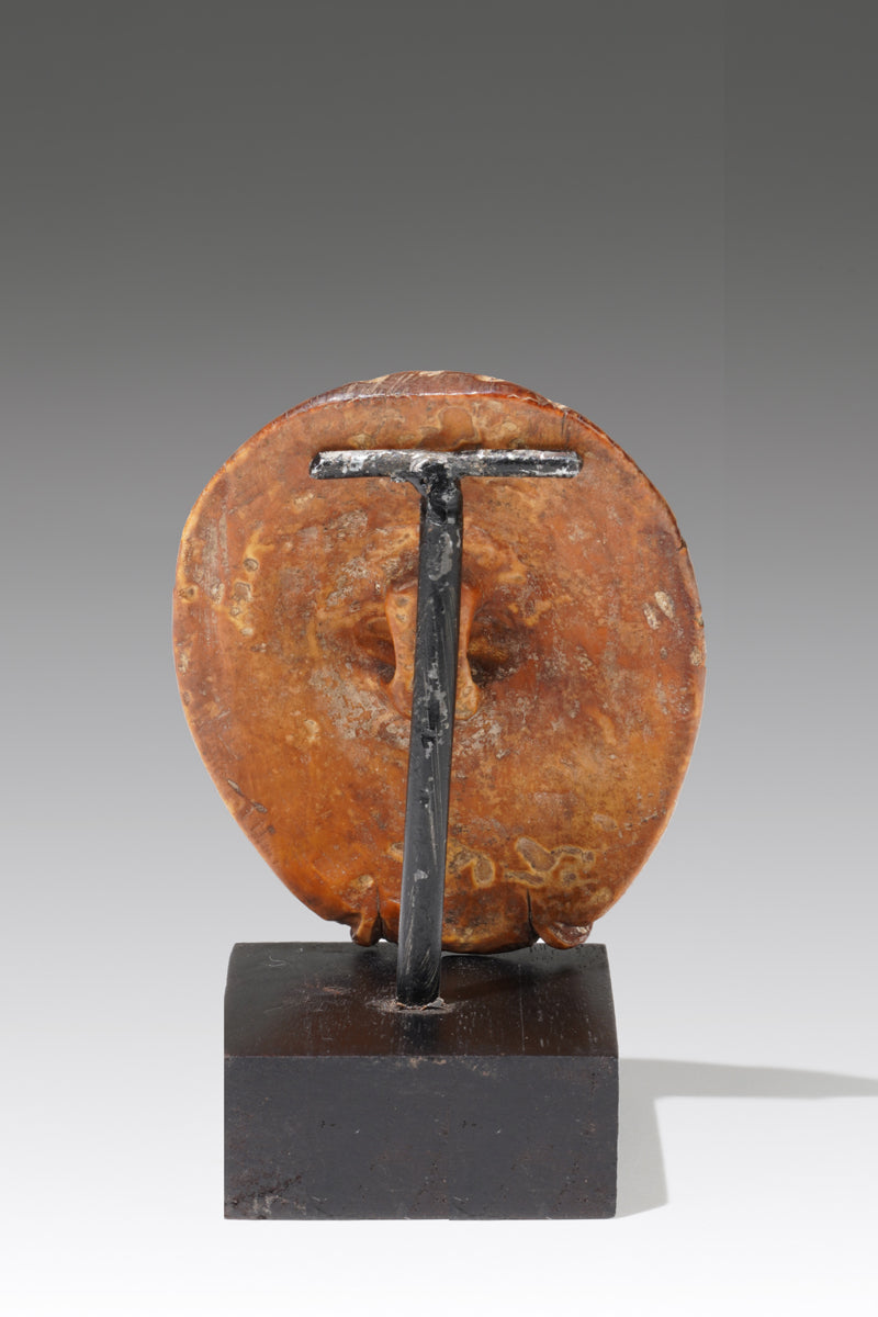 A small leopard head carved of bone in the style of Benin, with an attachmen eyelet on the back. These small leopard carvings were sewn onto the garments of high-ranking nobles and, in their multitude, expressed symbols of special power. They are rare and almost impossible to find.