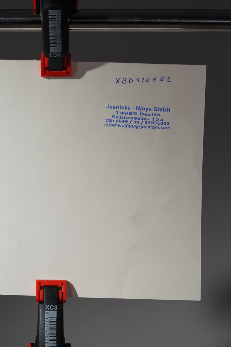 A small-scale aquarelle and chalk sketch by Irena Klonek, showcasing an abstract composition on a piece of paper from an old book. The unique canvas, with gothic font words subtly transpiring through the paint, adds an extra layer of character to the artwork.