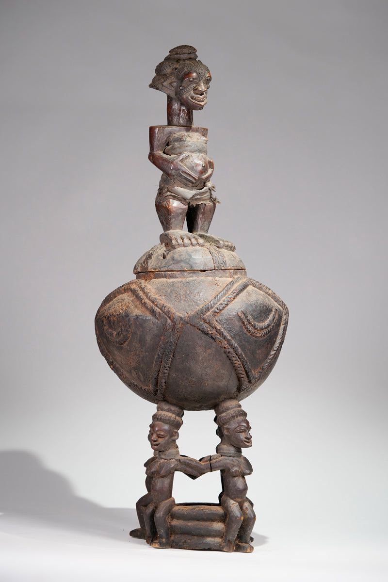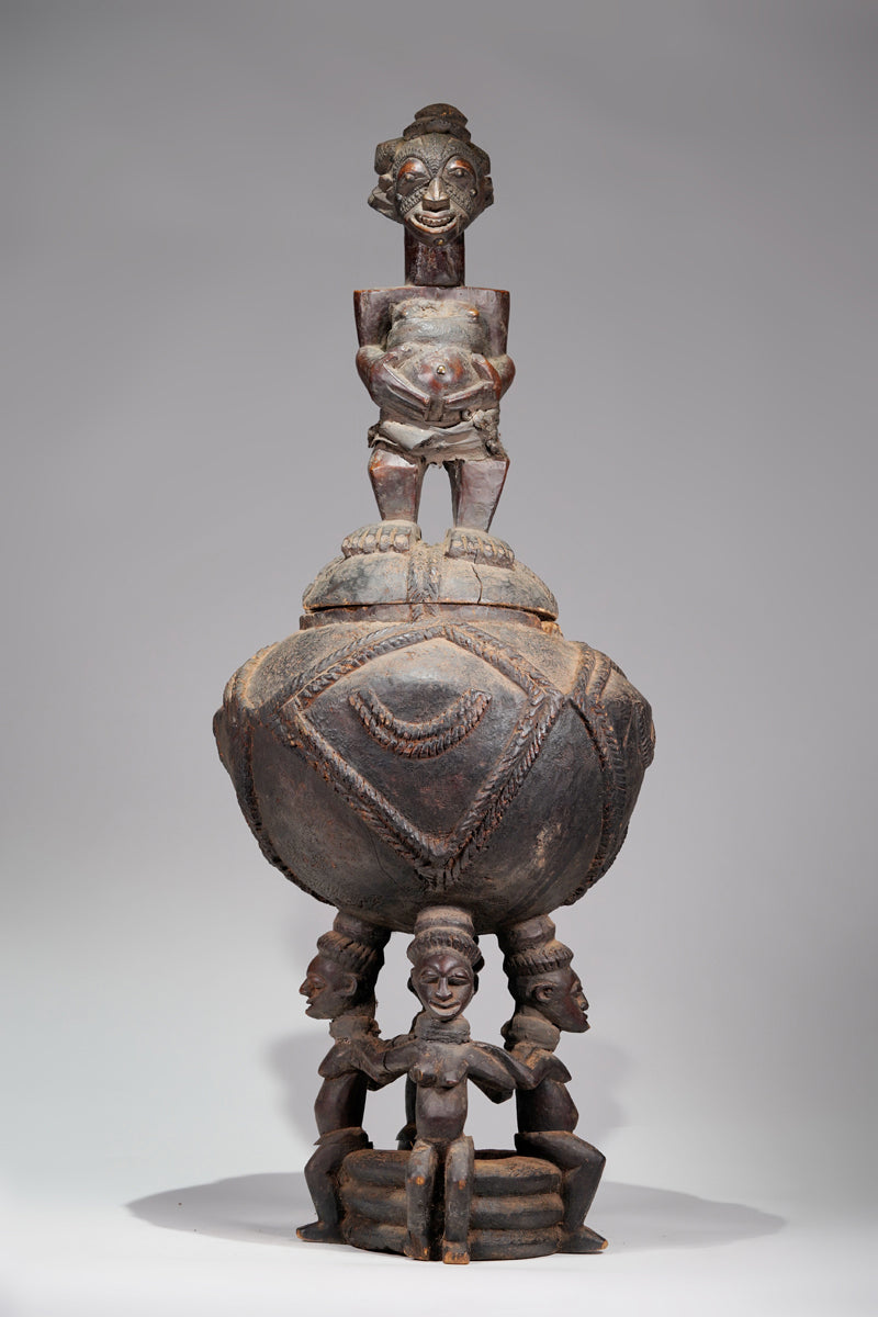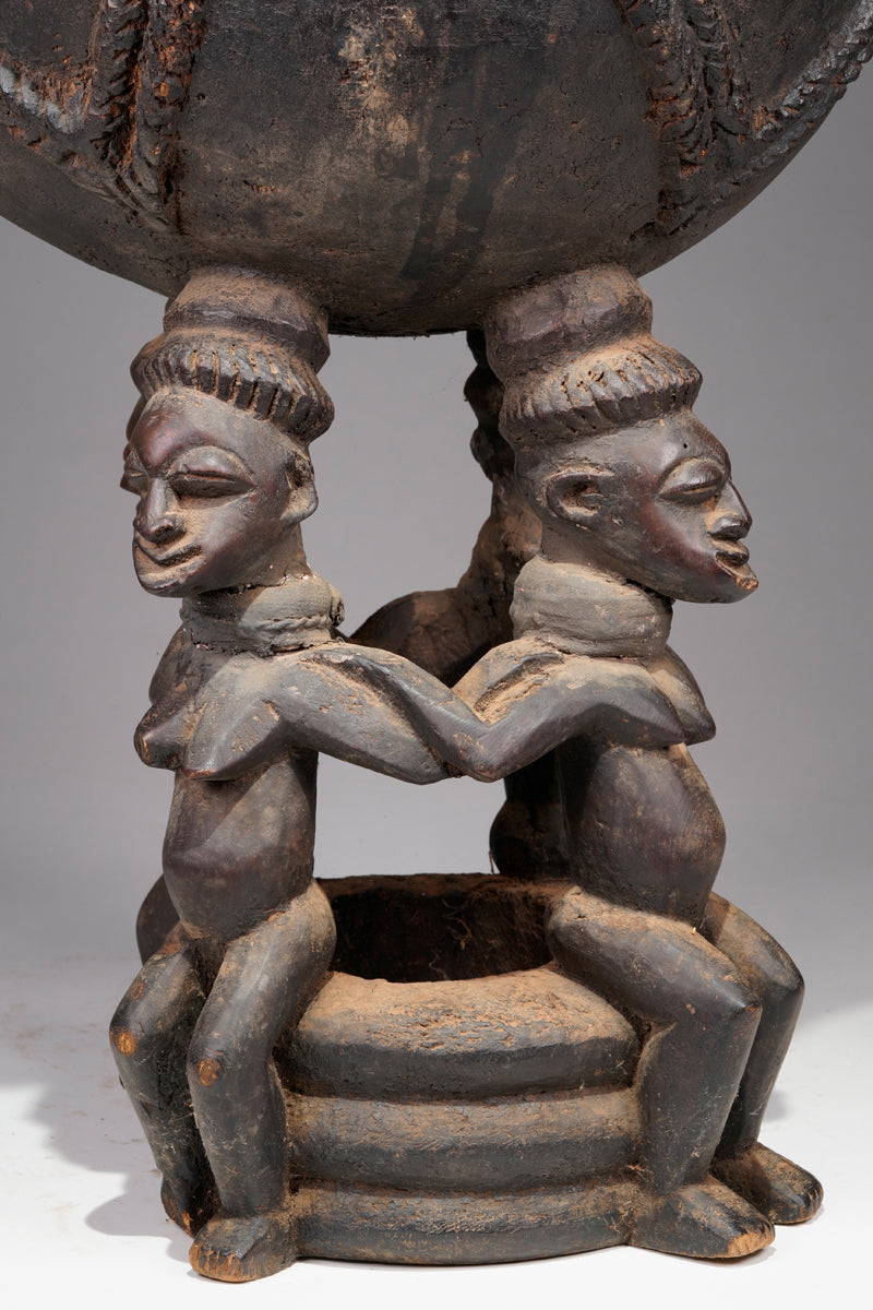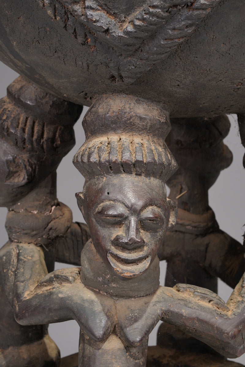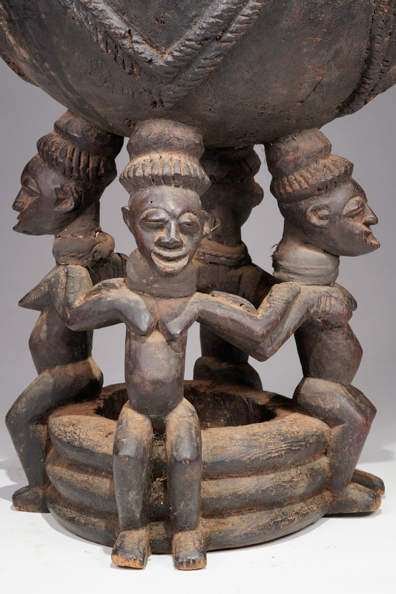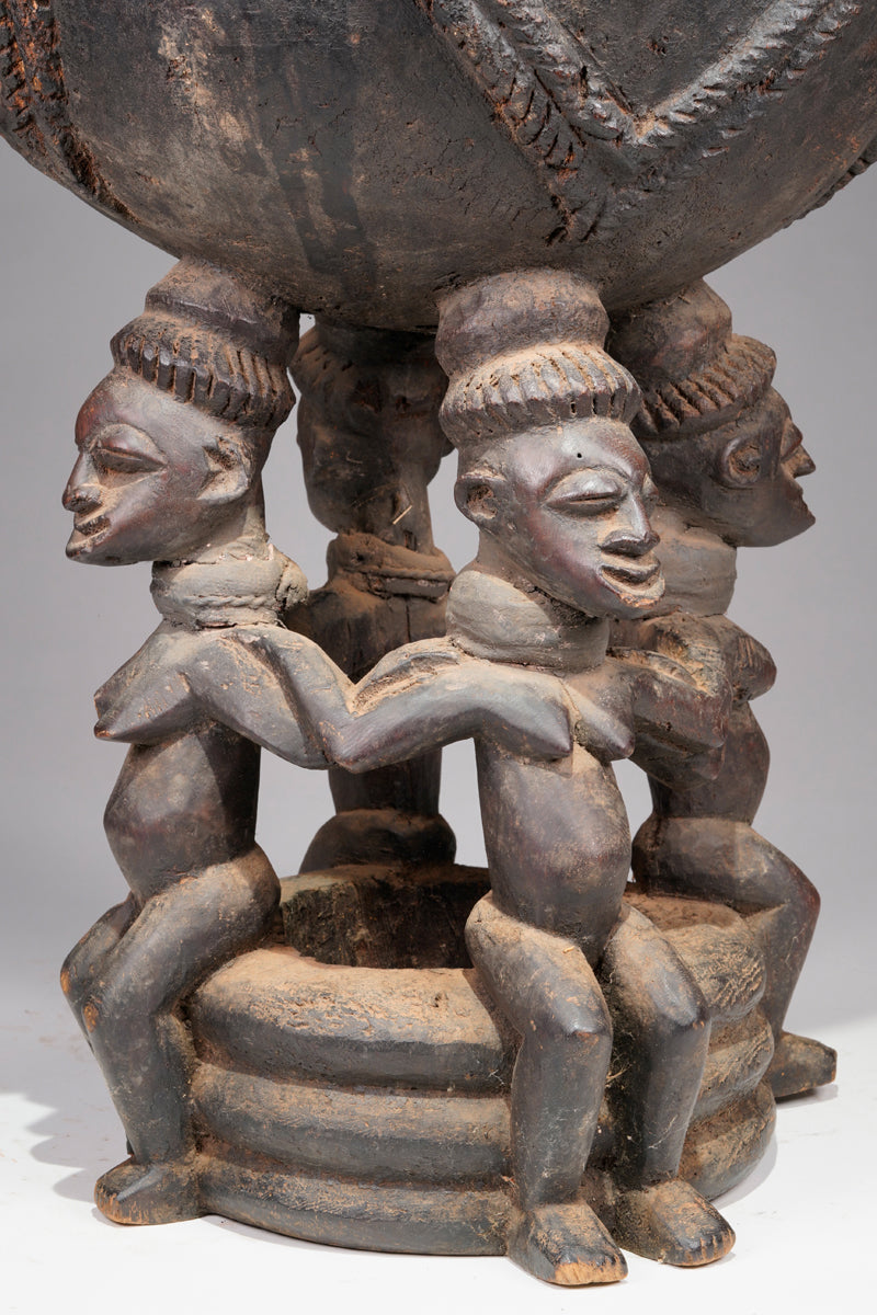 A Songy container, Zaire, region Belande (?) supported by four female figures who are holding their arms in a braided way, the large vessel decorated with geometric patterns, on top a male figure holding his stomach, his features are quite energies by his smile from which ones sees his teeth showing, his large feet hold his up straight, the vessel is well decorated with diamond shaped carvings. Unknown in Lit.: But it should be borne in mind that such vessels exist throughout West Africa, which were mostly in possession of the ethnic elites of the aristocracy or prominent chiefs to store their regalia. An outstanding example of Songye art.