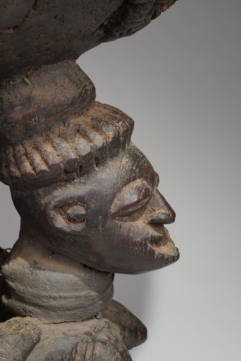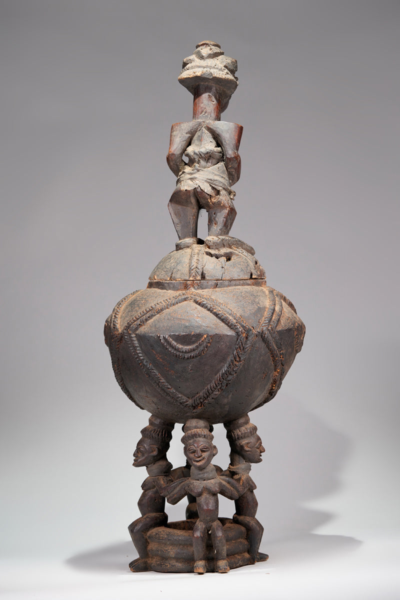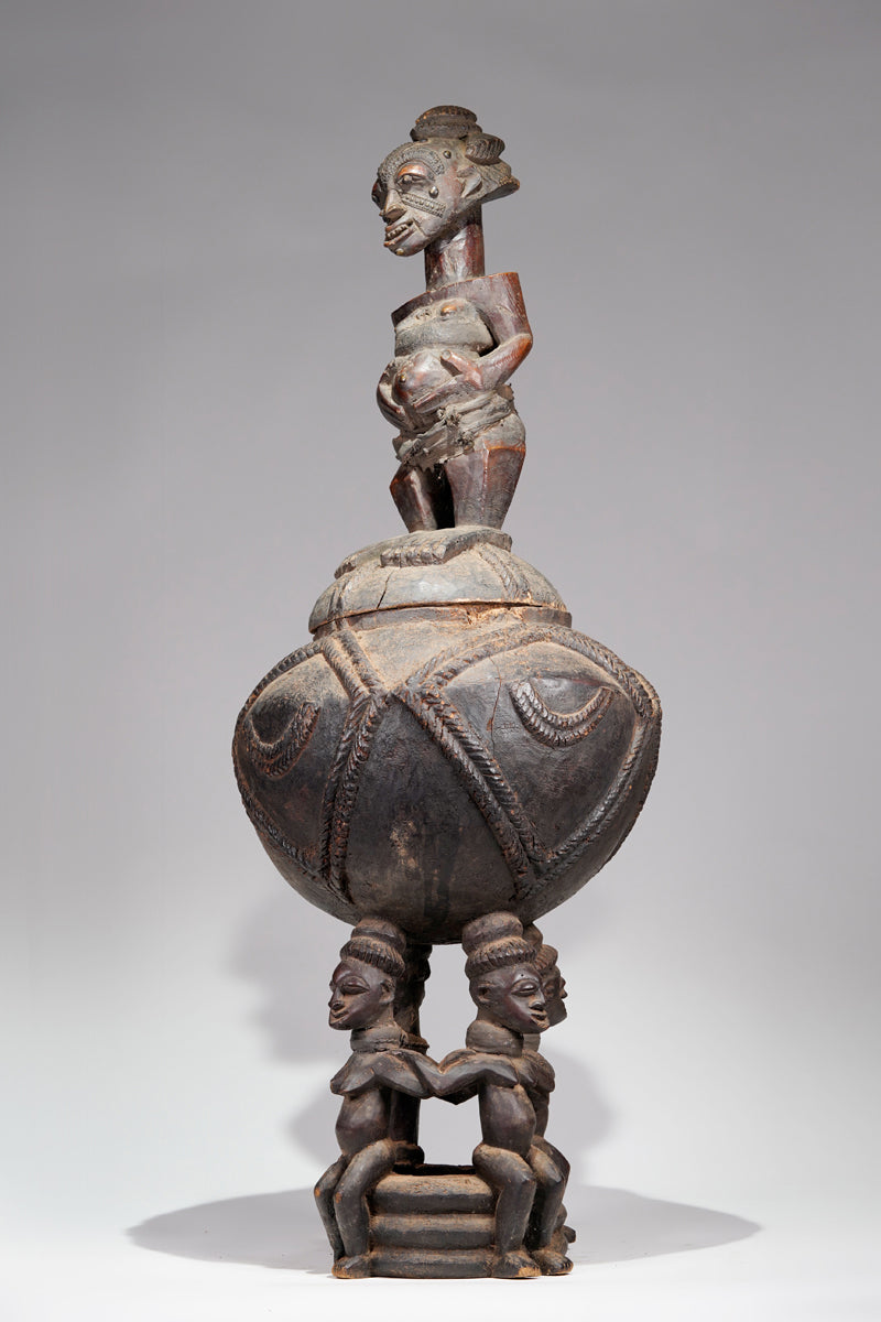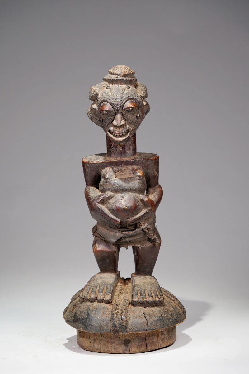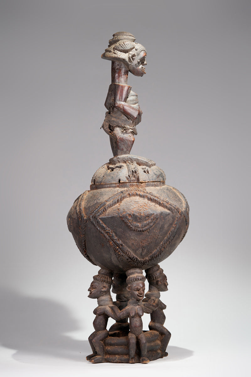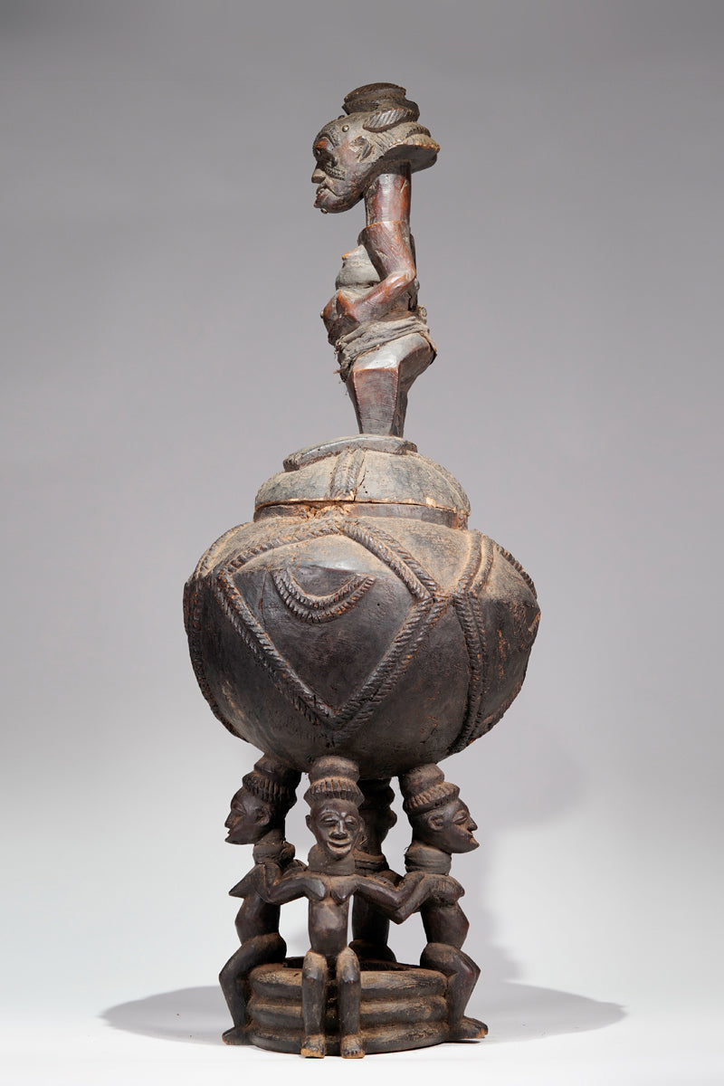 A Songy container, Zaire, region Belande (?) supported by four female figures who are holding their arms in a braided way, the large vessel decorated with geometric patterns, on top a male figure holding his stomach, his features are quite energies by his smile from which ones sees his teeth showing, his large feet hold his up straight, the vessel is well decorated with diamond shaped carvings. Unknown in Lit.: But it should be borne in mind that such vessels exist throughout West Africa, which were mostly in possession of the ethnic elites of the aristocracy or prominent chiefs to store their regalia. An outstanding example of Songye art.