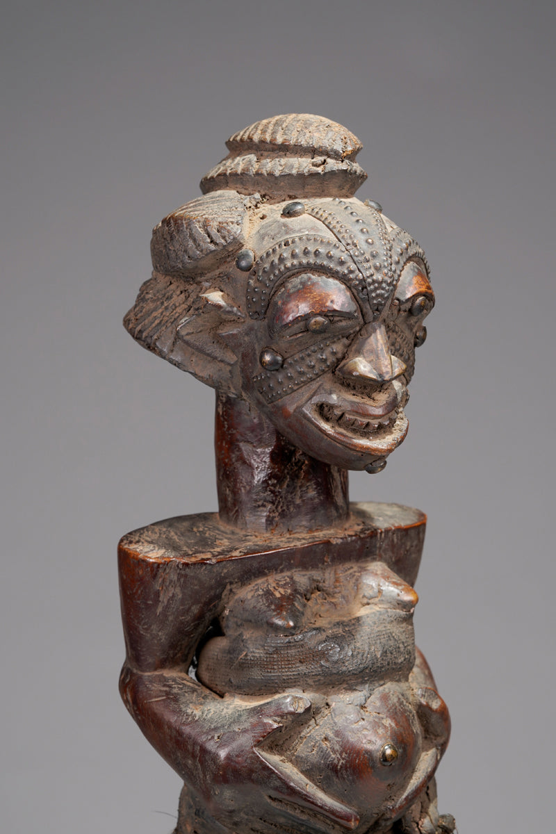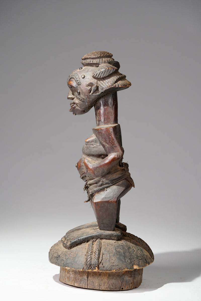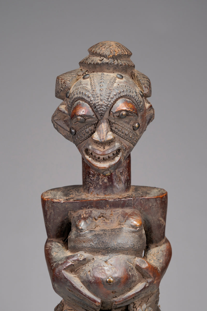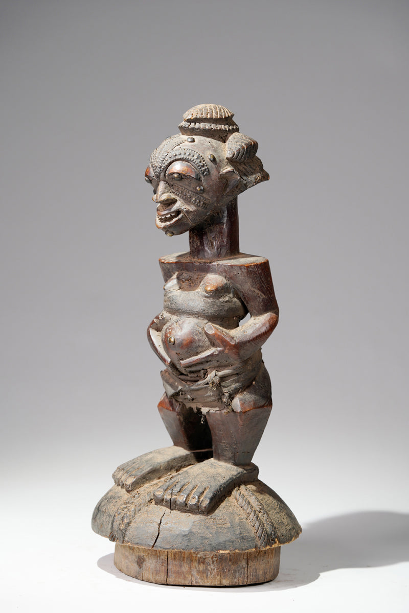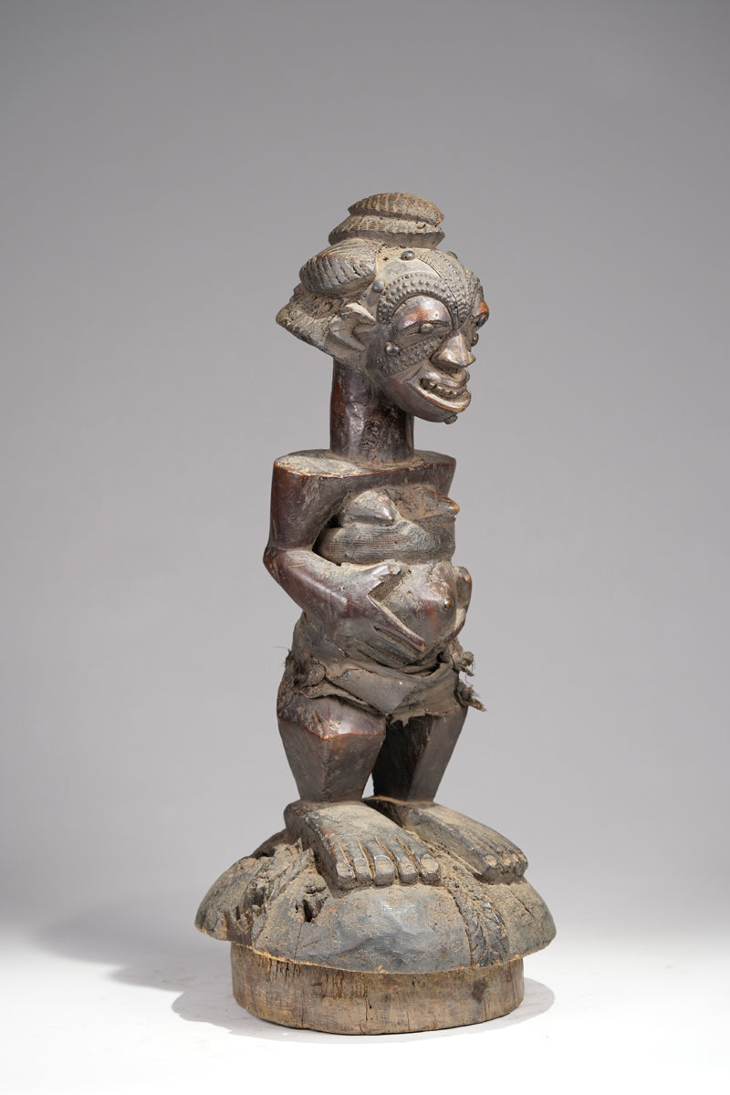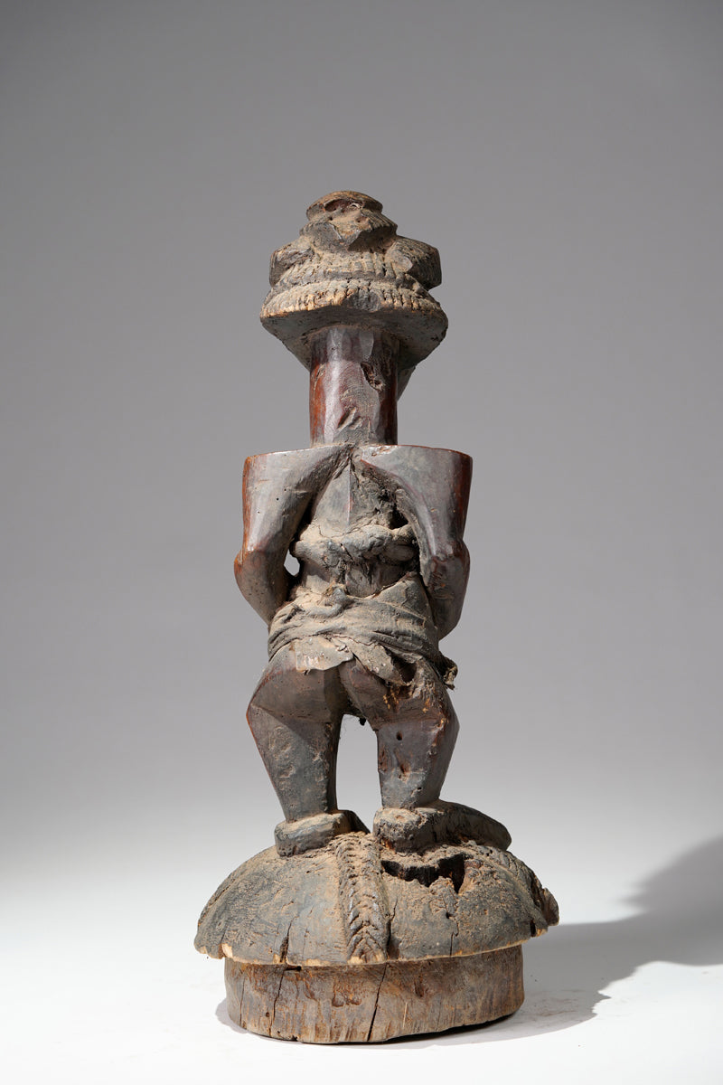 A Songy container, Zaire, region Belande (?) supported by four female figures who are holding their arms in a braided way, the large vessel decorated with geometric patterns, on top a male figure holding his stomach, his features are quite energies by his smile from which ones sees his teeth showing, his large feet hold his up straight, the vessel is well decorated with diamond shaped carvings. Unknown in Lit.: But it should be borne in mind that such vessels exist throughout West Africa, which were mostly in possession of the ethnic elites of the aristocracy or prominent chiefs to store their regalia. An outstanding example of Songye art.