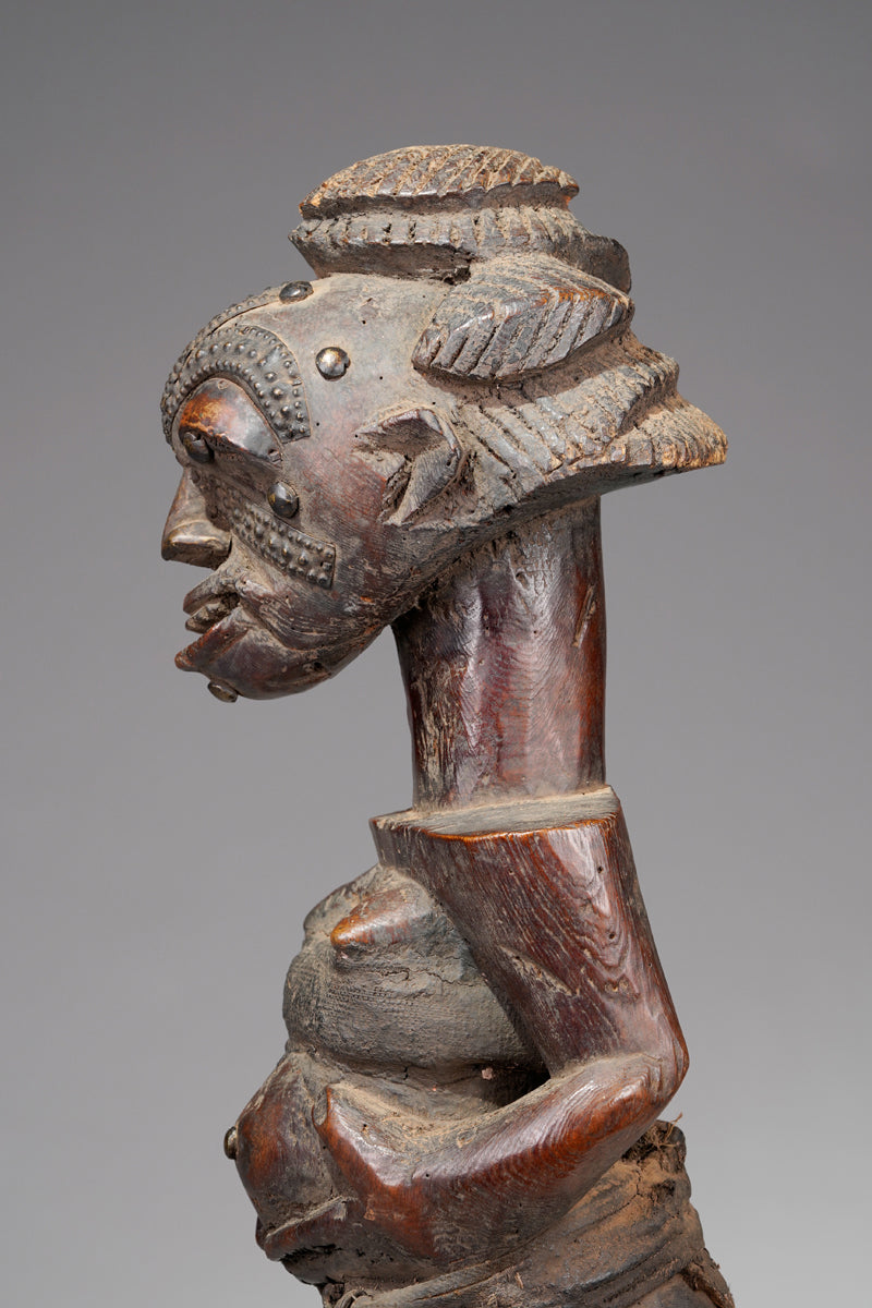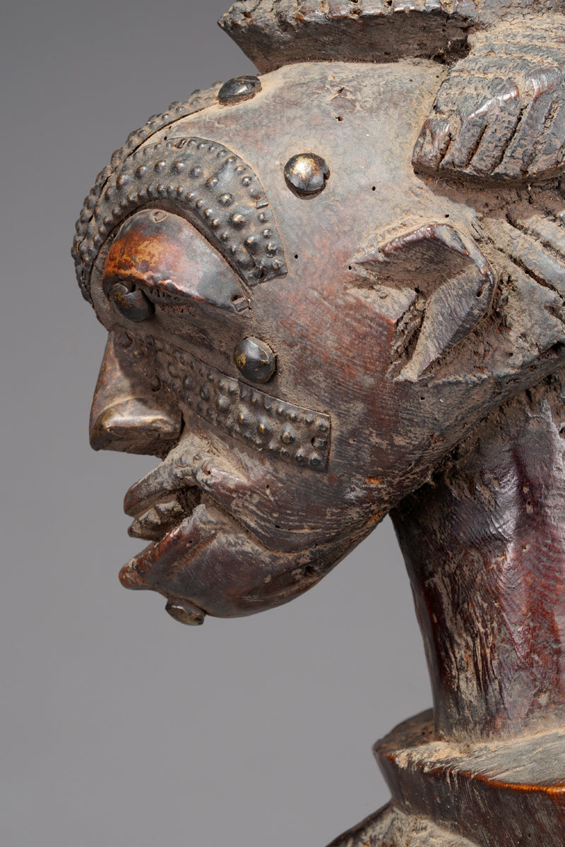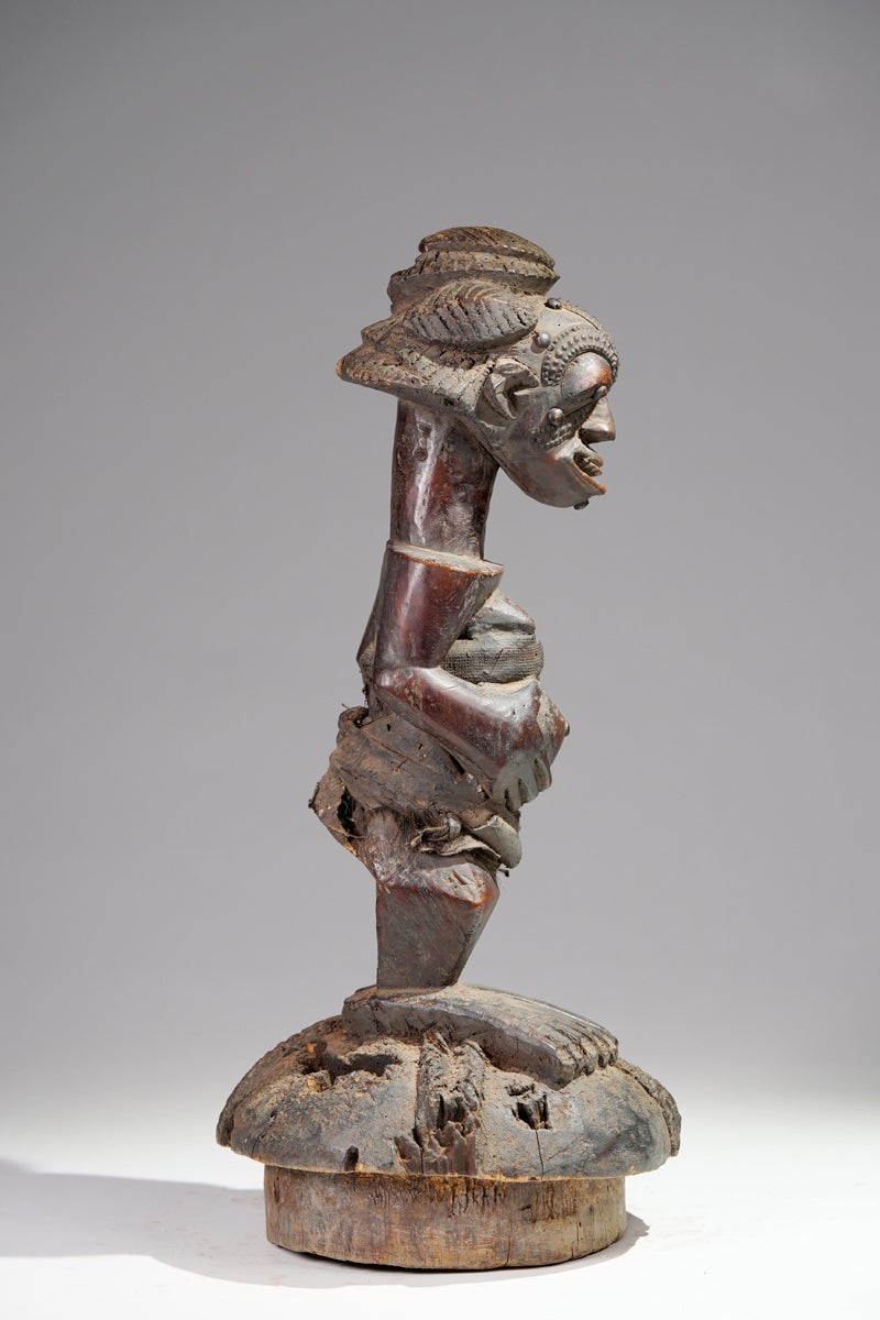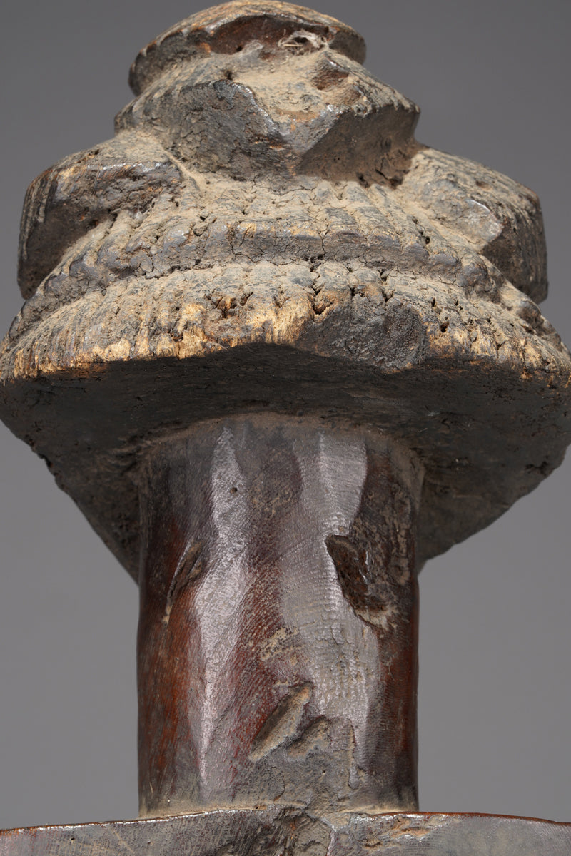 “During the 16th century, the Songye migrated from the Shaba area, which is now the Democratic Republic of Congo (formerly Zaire), and settled on the left bank of the Lualaba River, on a savannah and forest-covered plateau. Divided into numerous sub-groups, the 150,000 Songye people are governed by a central chief, the Yakitenge, whose role demands that he obey special restrictive laws such as not showing grief, not drinking in public and not shaking hands with men. In addition, local rulers, the Sultani Ya Muti, distribute plots of land to their villagers and an influential secret society, Bwadi Bwa Kifwebe, counterbalances their power. Unlike their neighbors, the Luba, the Songye tribe is a patriarchal society in which agriculture is central to the economy.”Source: Baquart, Jean-Baptiste. The Tribal Arts of Africa. New York: Thames and Hudson Inc. 1998. Print, Francois Neyt, Songye, page 36 ff.