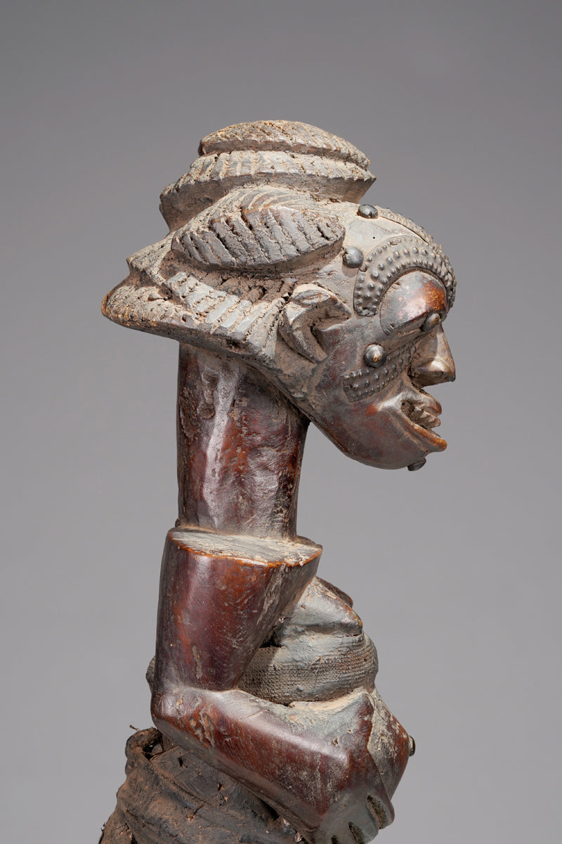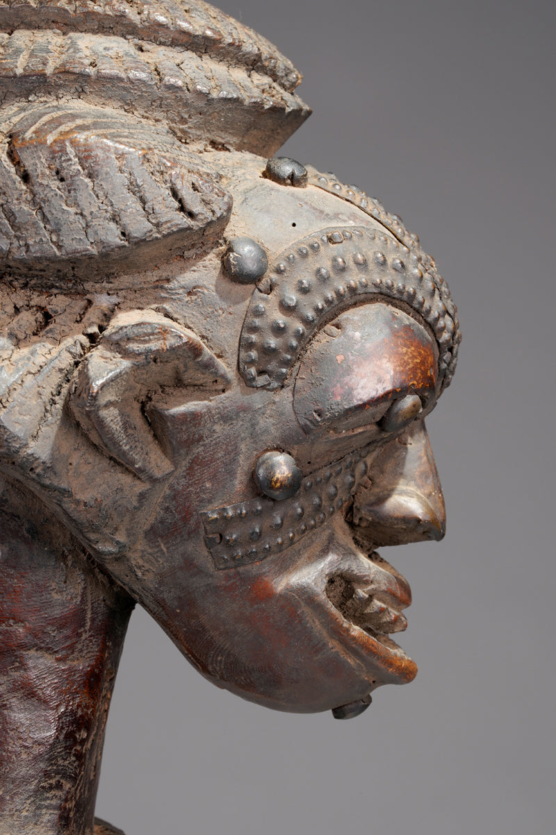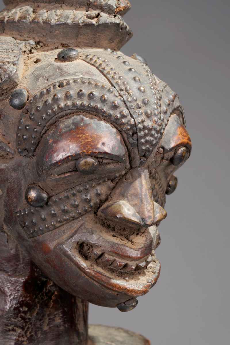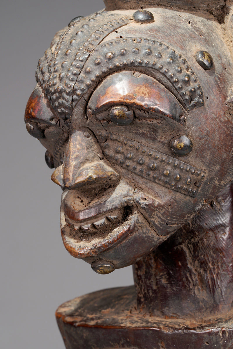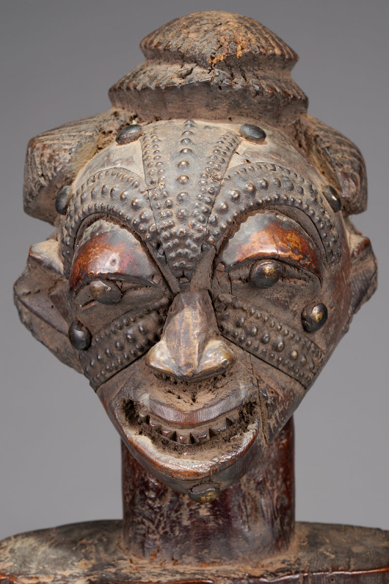 “During the 16th century, the Songye migrated from the Shaba area, which is now the Democratic Republic of Congo (formerly Zaire), and settled on the left bank of the Lualaba River, on a savannah and forest-covered plateau. Divided into numerous sub-groups, the 150,000 Songye people are governed by a central chief, the Yakitenge, whose role demands that he obey special restrictive laws such as not showing grief, not drinking in public and not shaking hands with men. In addition, local rulers, the Sultani Ya Muti, distribute plots of land to their villagers and an influential secret society, Bwadi Bwa Kifwebe, counterbalances their power. Unlike their neighbors, the Luba, the Songye tribe is a patriarchal society in which agriculture is central to the economy.”Source: Baquart, Jean-Baptiste. The Tribal Arts of Africa. New York: Thames and Hudson Inc. 1998. Print, Francois Neyt, Songye, page 36 ff.