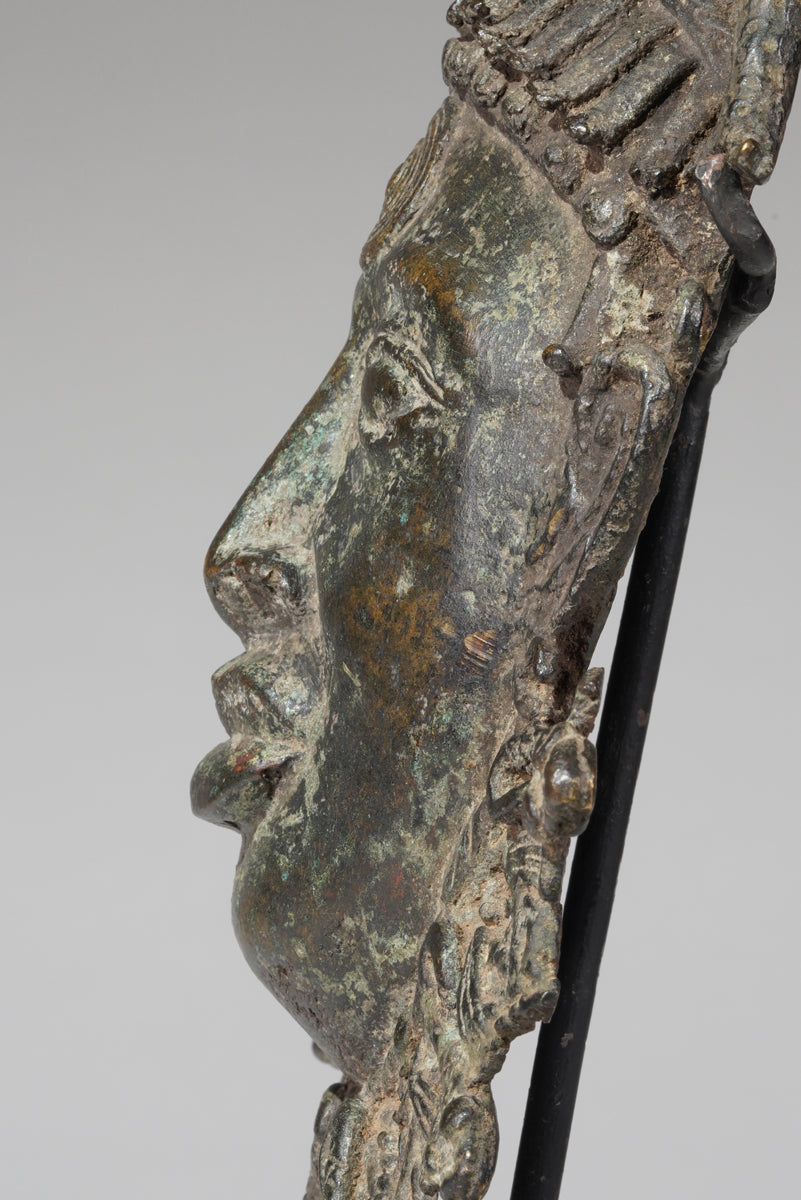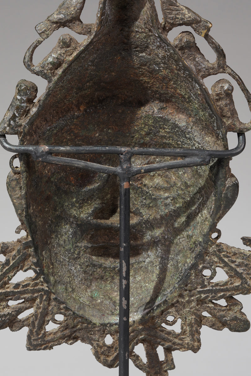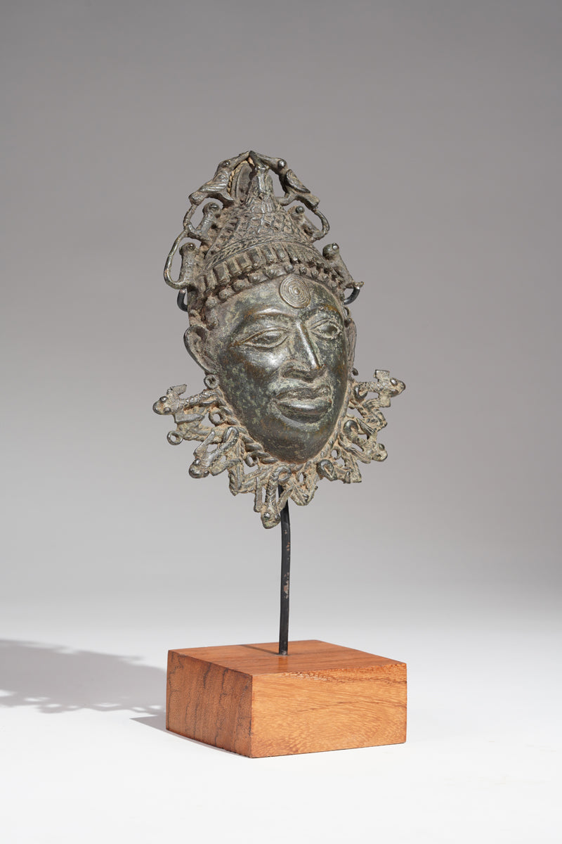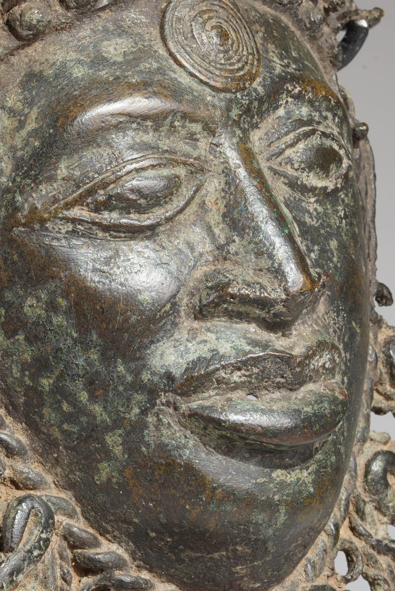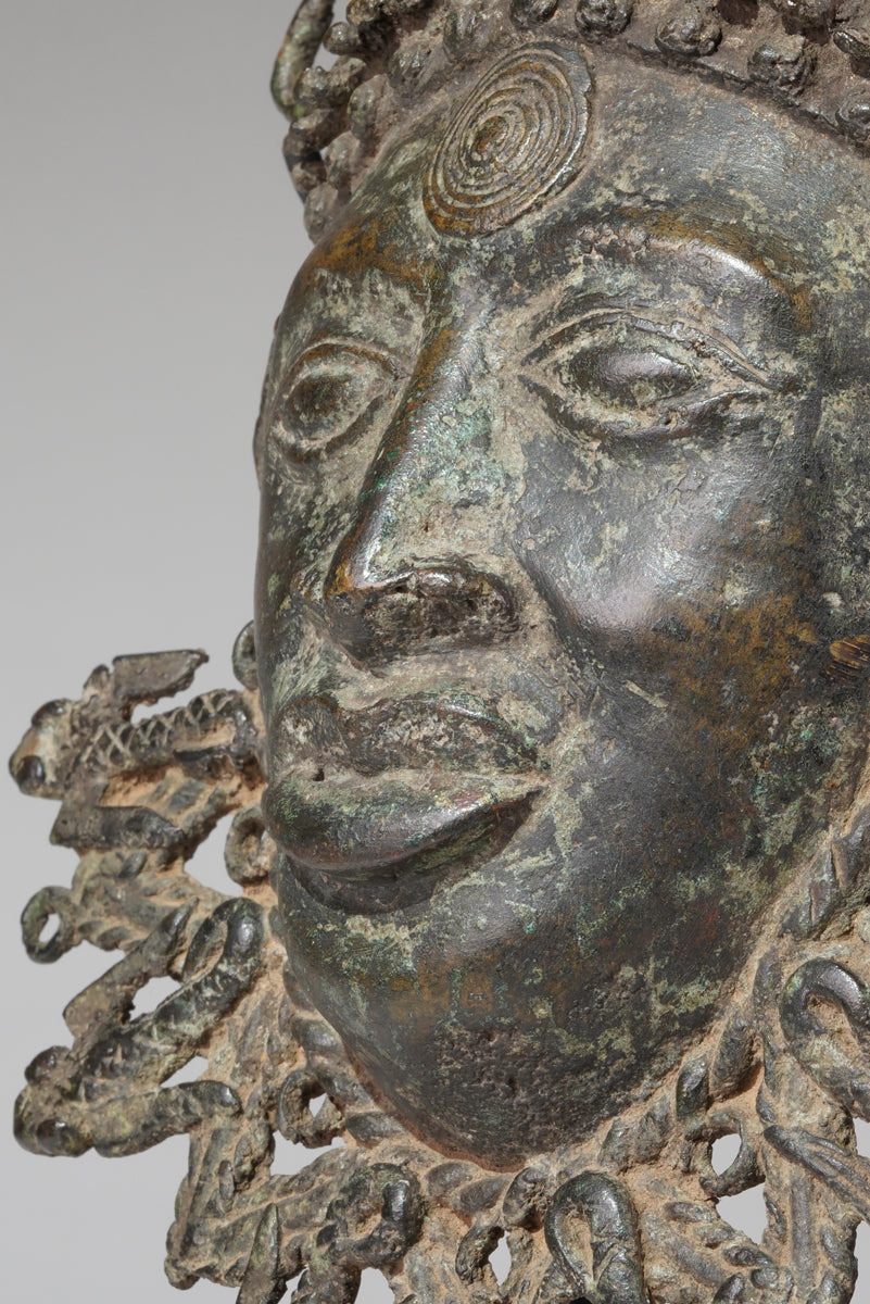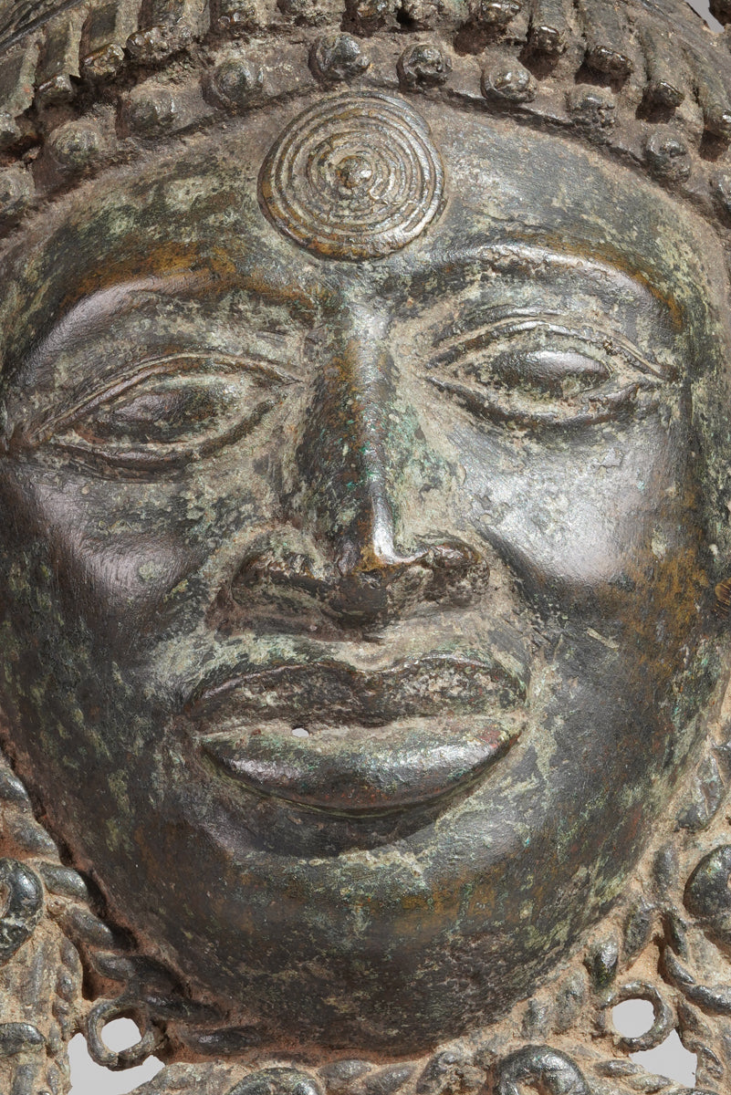 Uhunmwu-Ẹkuẹ are one of the best-known categories of Benin artworks. A range of human and animal heads are depicted, hence the term ‘mask’, although they were not used to cover the face. Sometimes known as ‘hip masks’, they may be worn on the belt or hung at the hip as seen cast on relief plaques and in the carved motifs on altar tusks. Many pendant masks have a series of eyelets around the edge of the lower portion, to which small crotal bells were attached, and as the wearer moved they would have chimed.