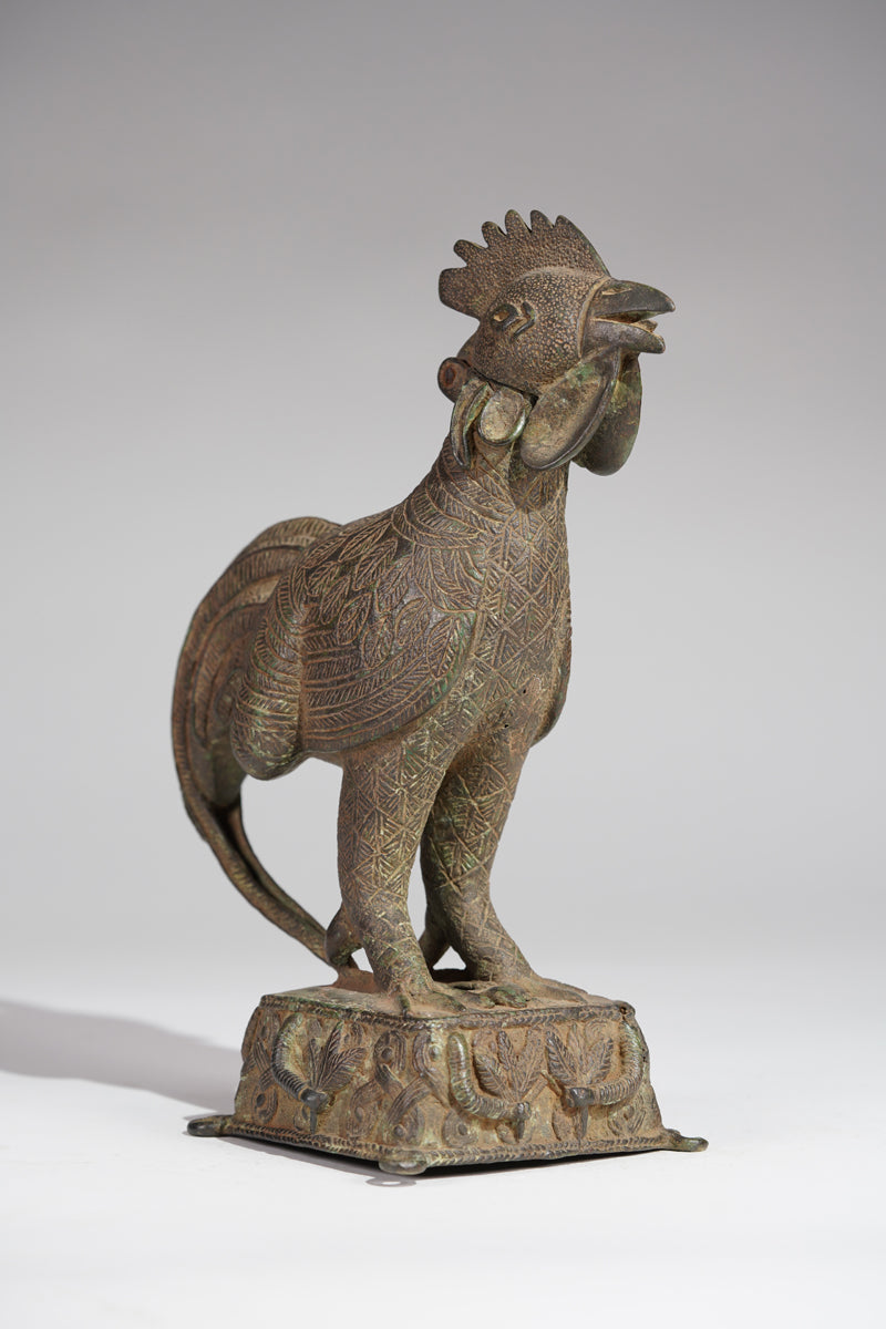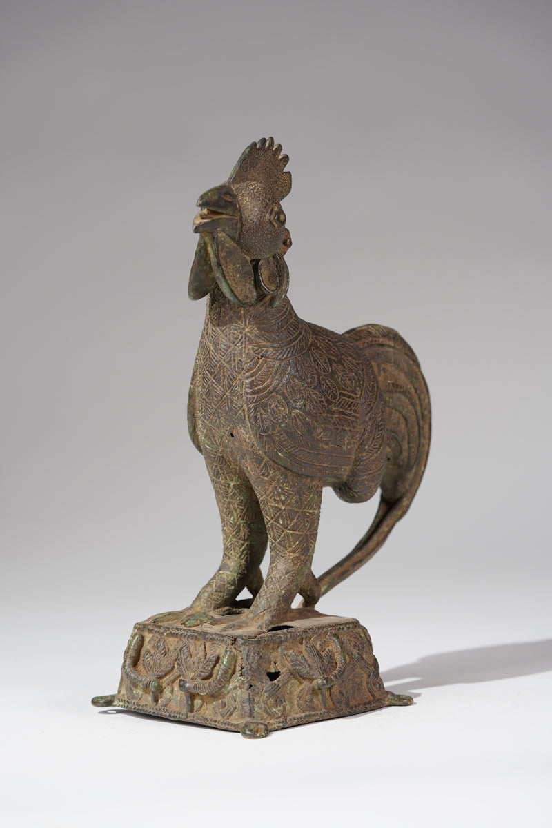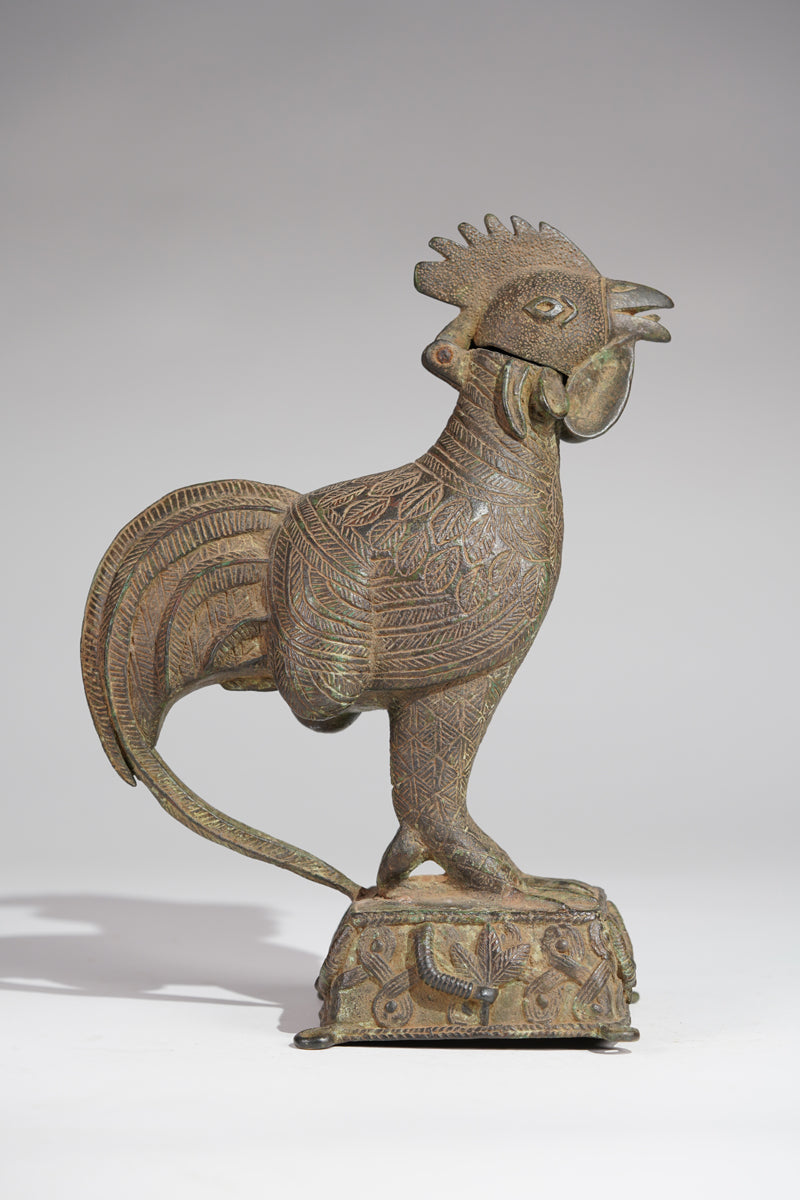 A unique brass rooster in the style of Benin, Ọkpa being a shortened version of Ọkporhu, minor damages in the form of dents, with a head that opens.