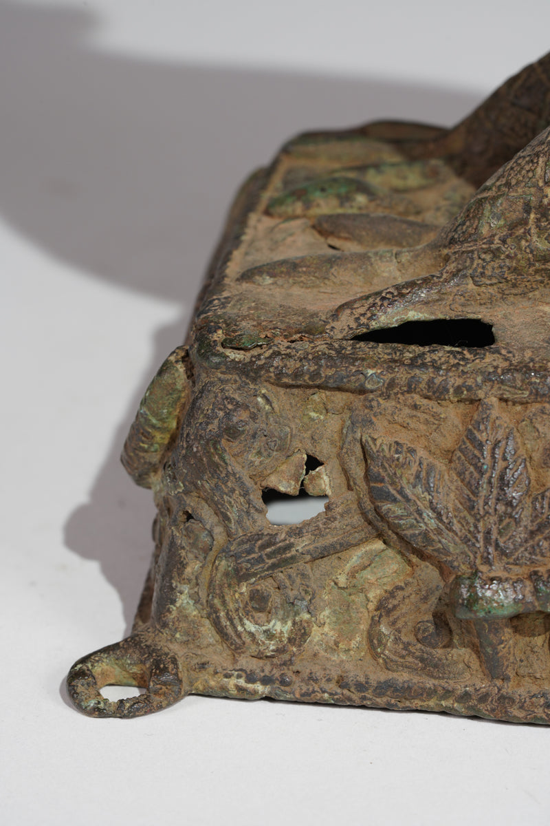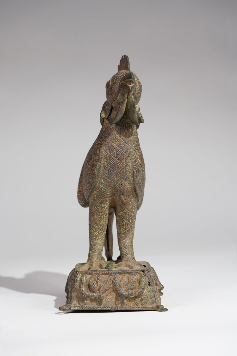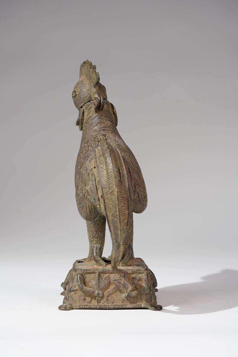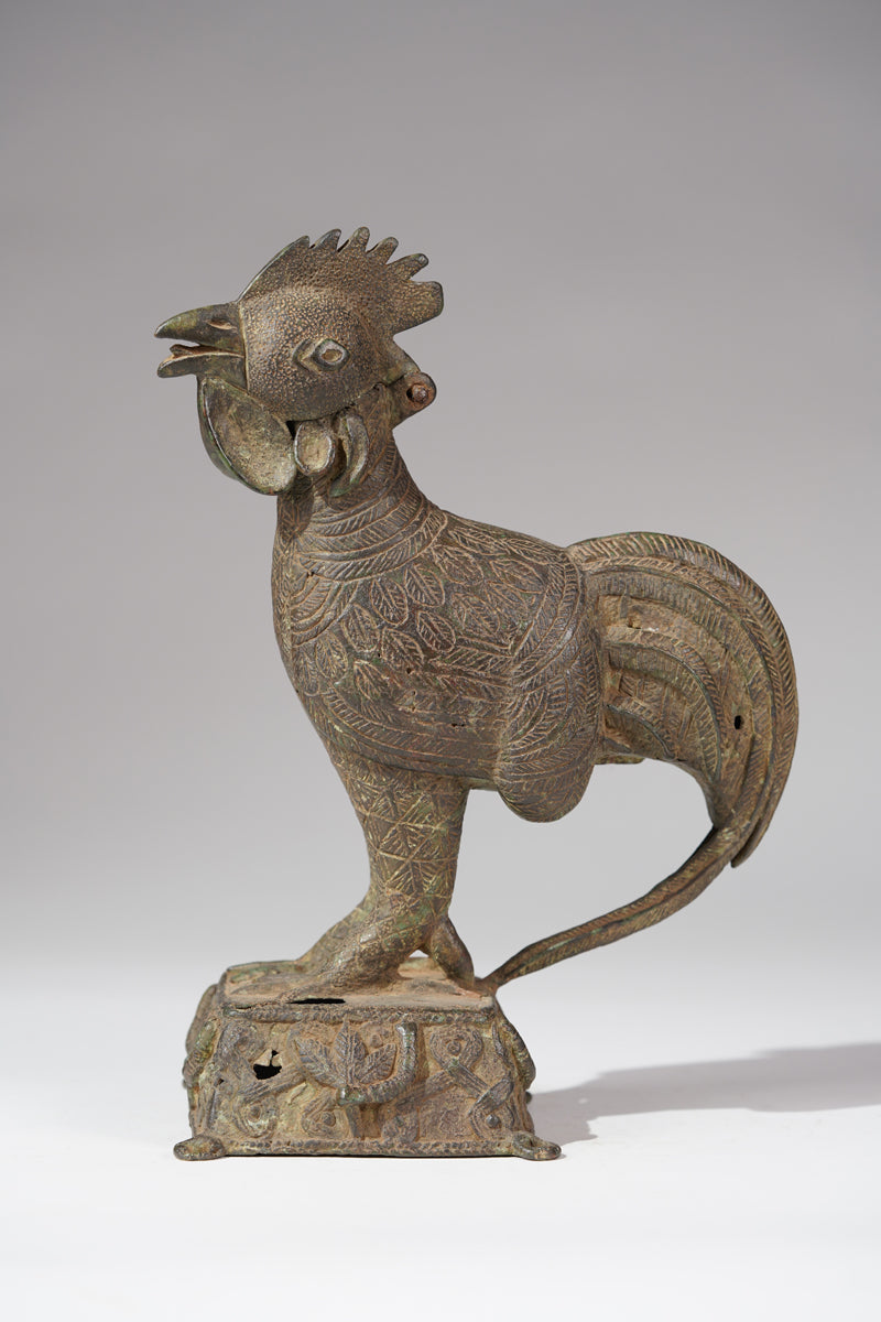 A unique brass rooster in the style of Benin, Ọkpa being a shortened version of Ọkporhu, minor damages in the form of dents, with a head that opens.