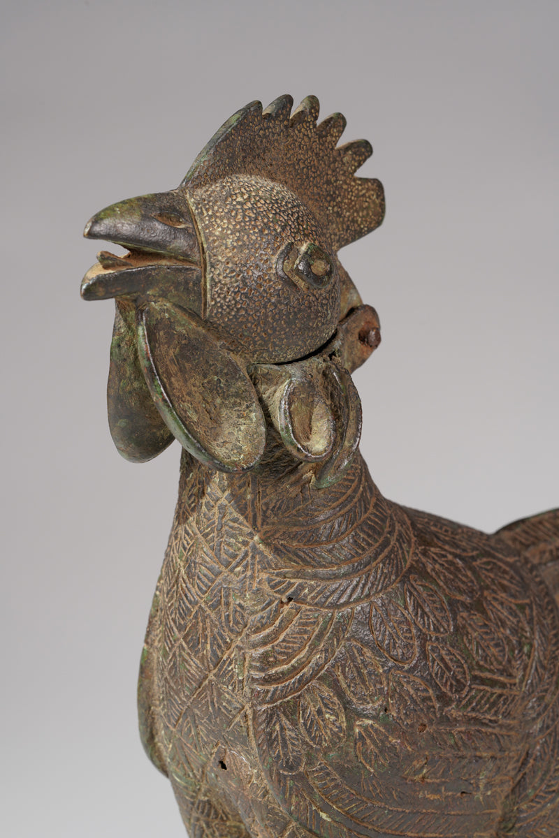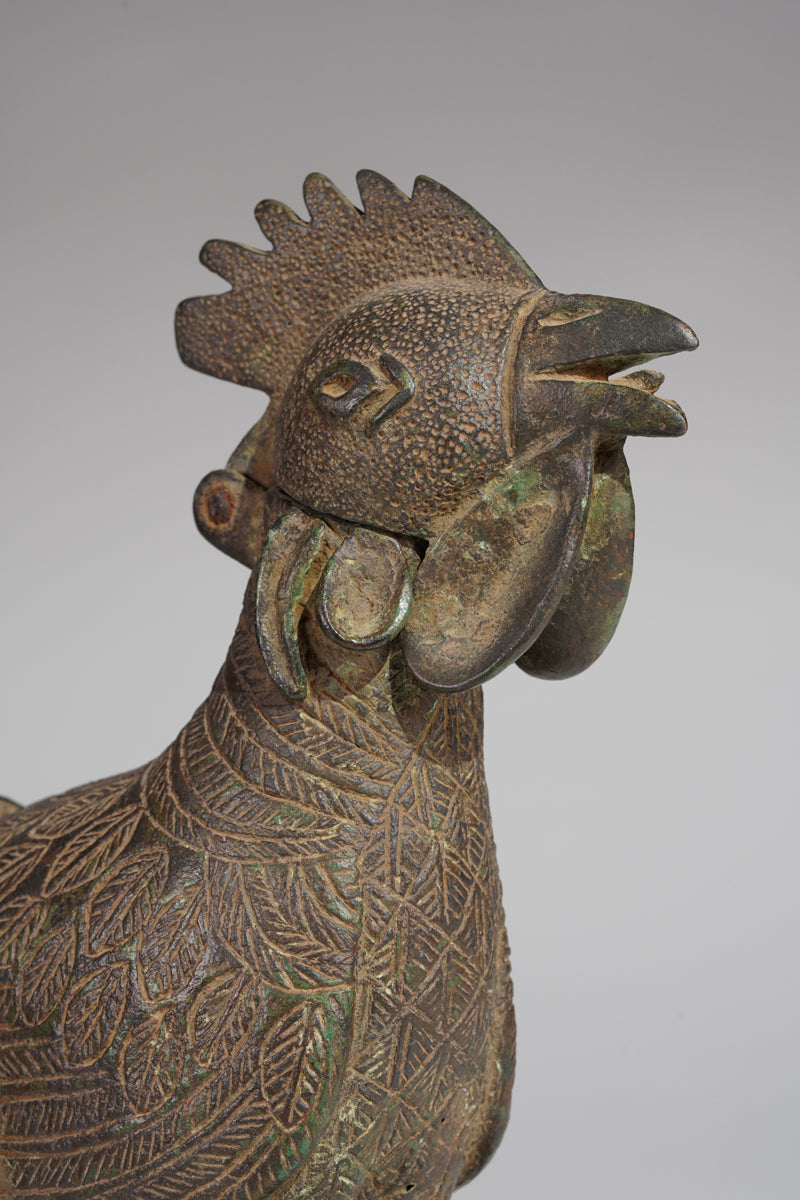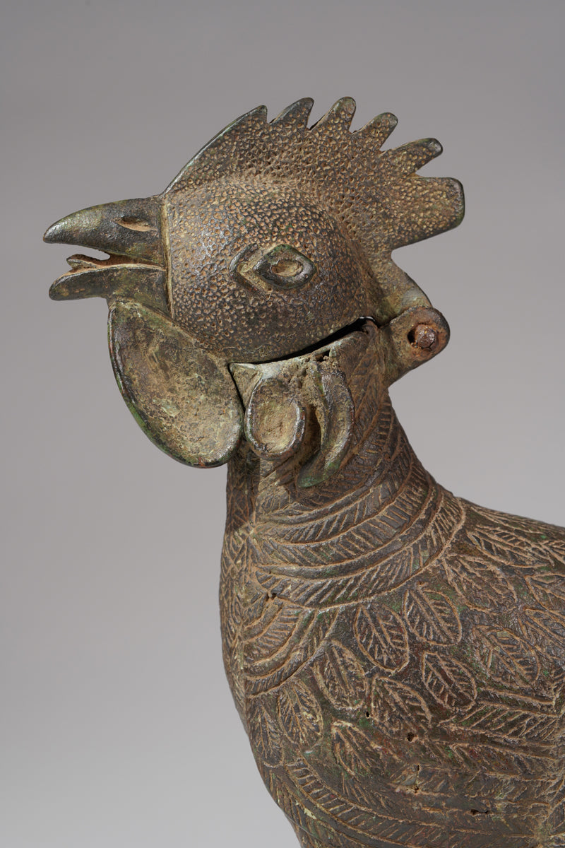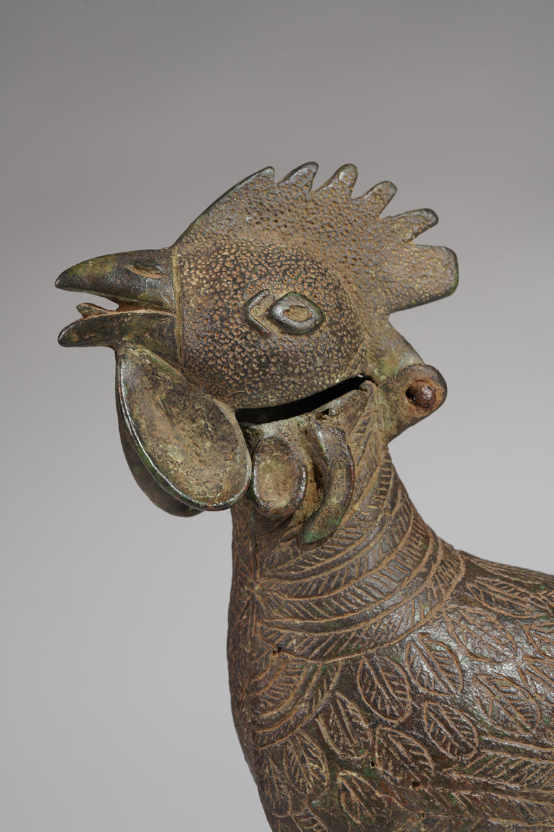 Bronze cock which did not come into existence until after the introduction of the Iy’ọba title by Ọba Esigie. The first Iy’Ọba was Idia, and the Iy’ọba title is considered to be the greatest achievement of a Benin woman. It has spiritual significance and is placed at the altar of the Iy’ọba after her death. The Iy’ọba is referred to Ọkpa n’ Uselu. Source Digital Benin.