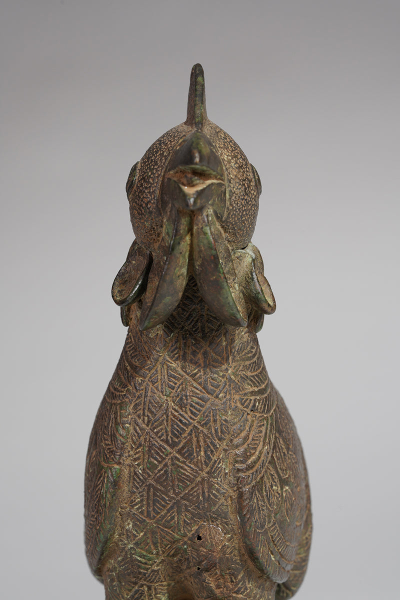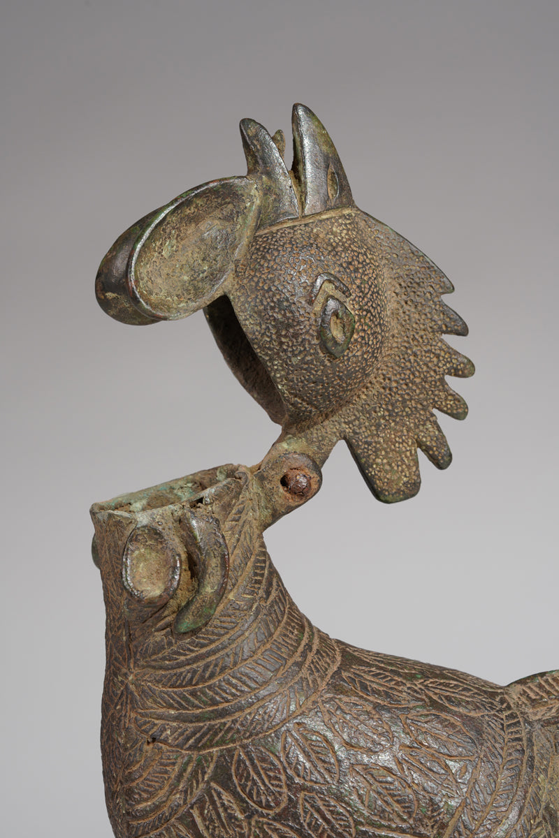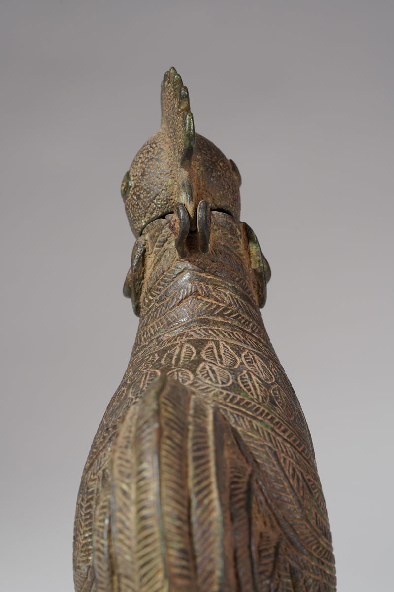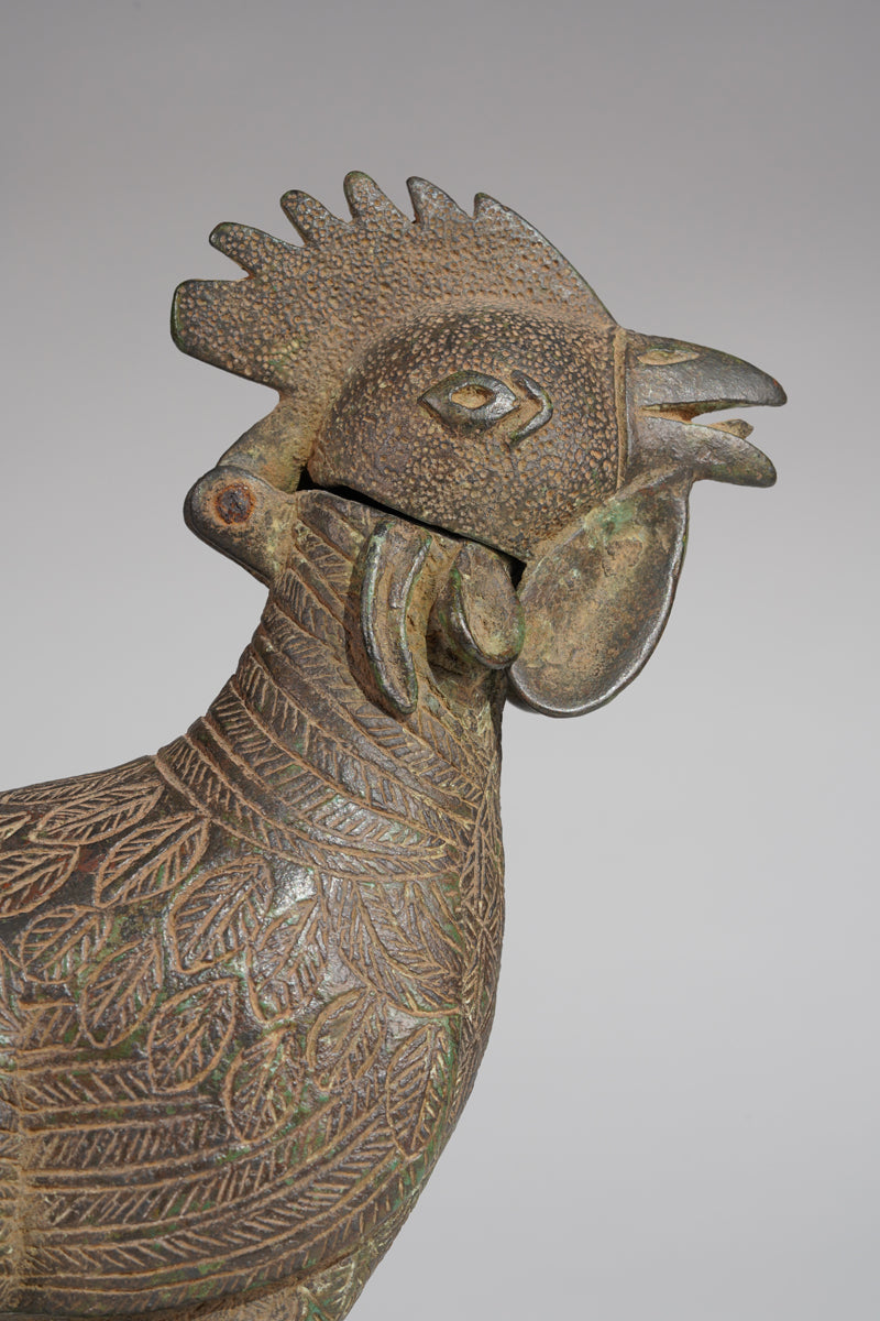 Bronze cock which did not come into existence until after the introduction of the Iy’ọba title by Ọba Esigie. The first Iy’Ọba was Idia, and the Iy’ọba title is considered to be the greatest achievement of a Benin woman. It has spiritual significance and is placed at the altar of the Iy’ọba after her death. The Iy’ọba is referred to Ọkpa n’ Uselu. Source Digital Benin.